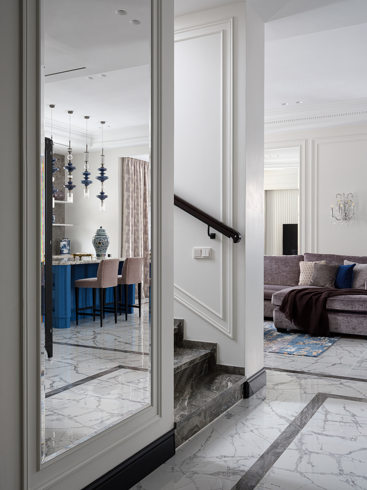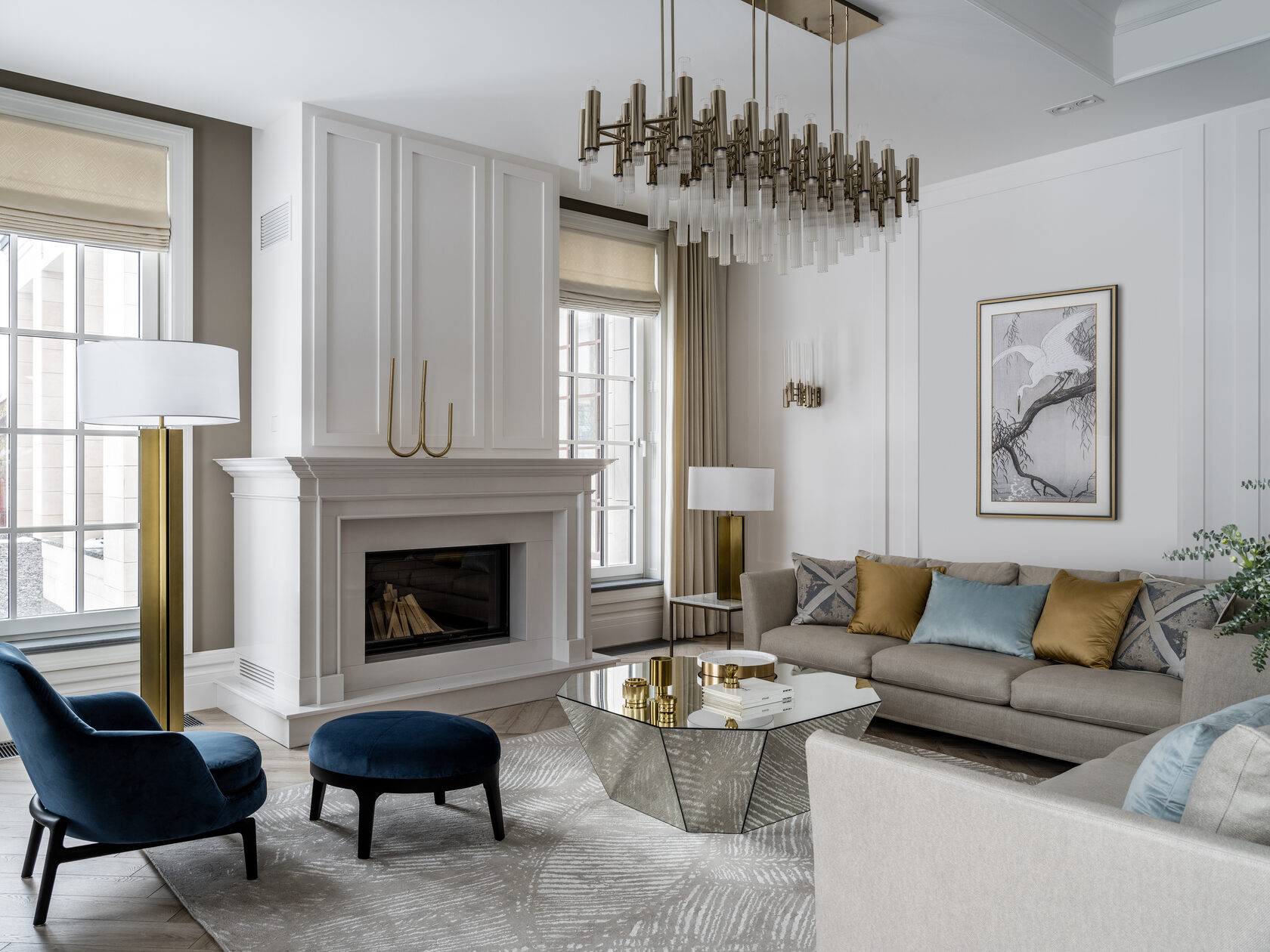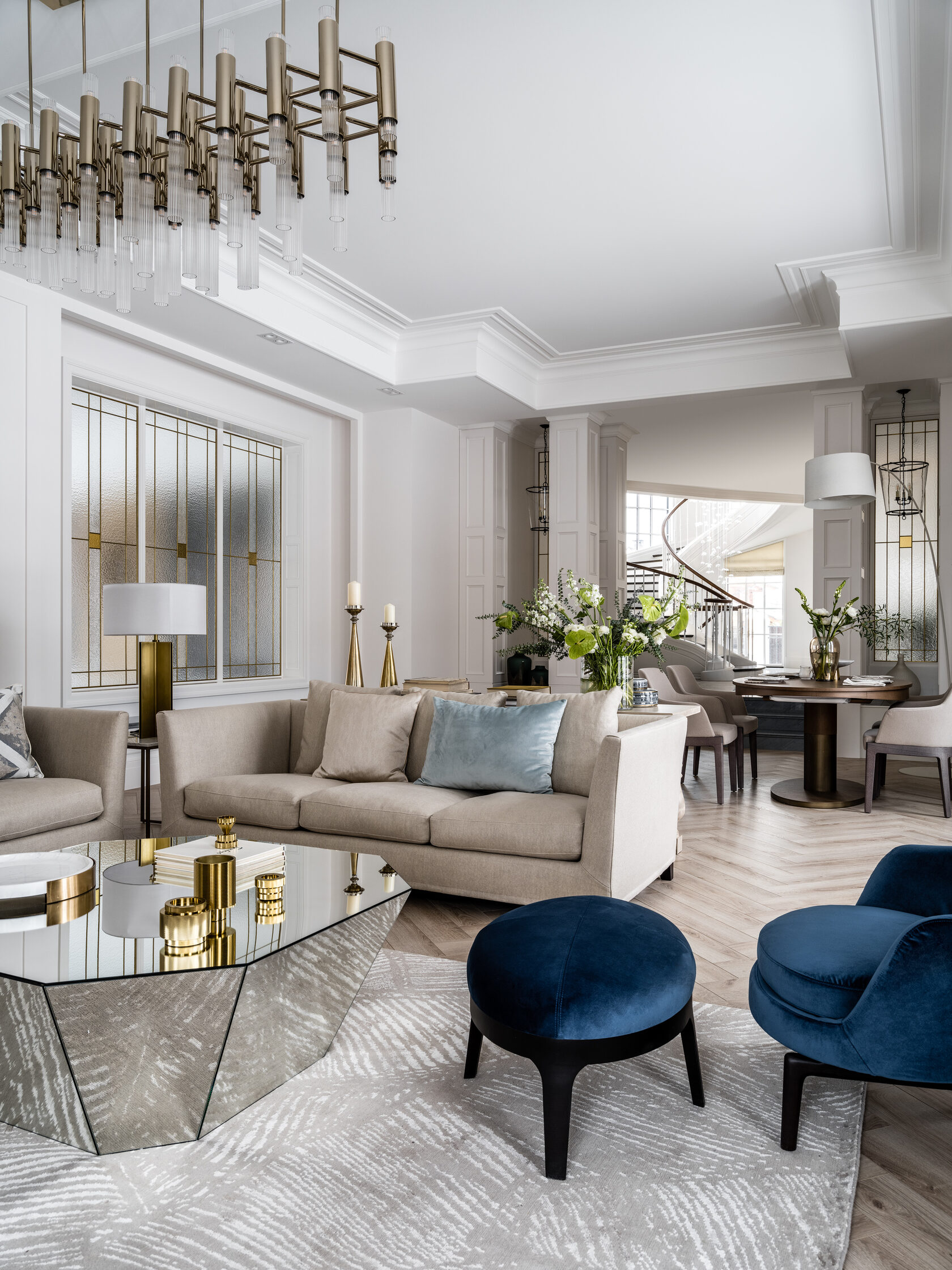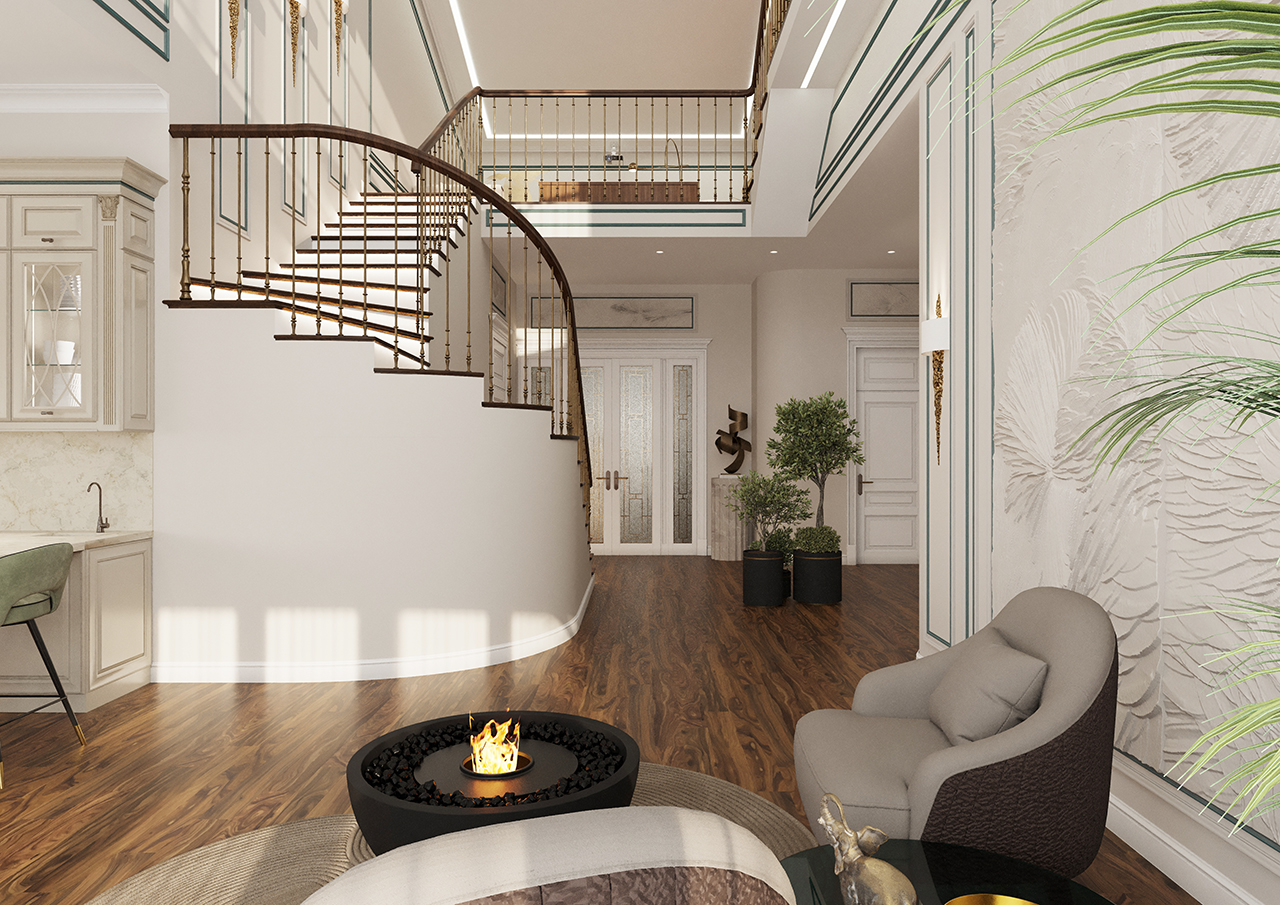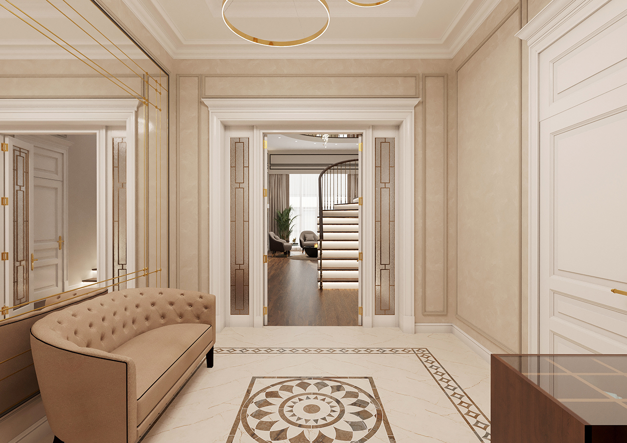 Концепция: Основная идея проекта заключалась в мастерском сочетании неоклассического стиля с элементами ар-деко для формирования гармоничного пространства, способного отразить предпочтения всех обитателей. Важнейшей задачей было создание интерьера, одновременно торжественного и уютного, максимально наполненного светом и объемом. Акцент сделан на изысканных деталях и благородных материалах, подчеркивающих статус и вкус владельцев, сохраняя при этом функциональность и комфорт.