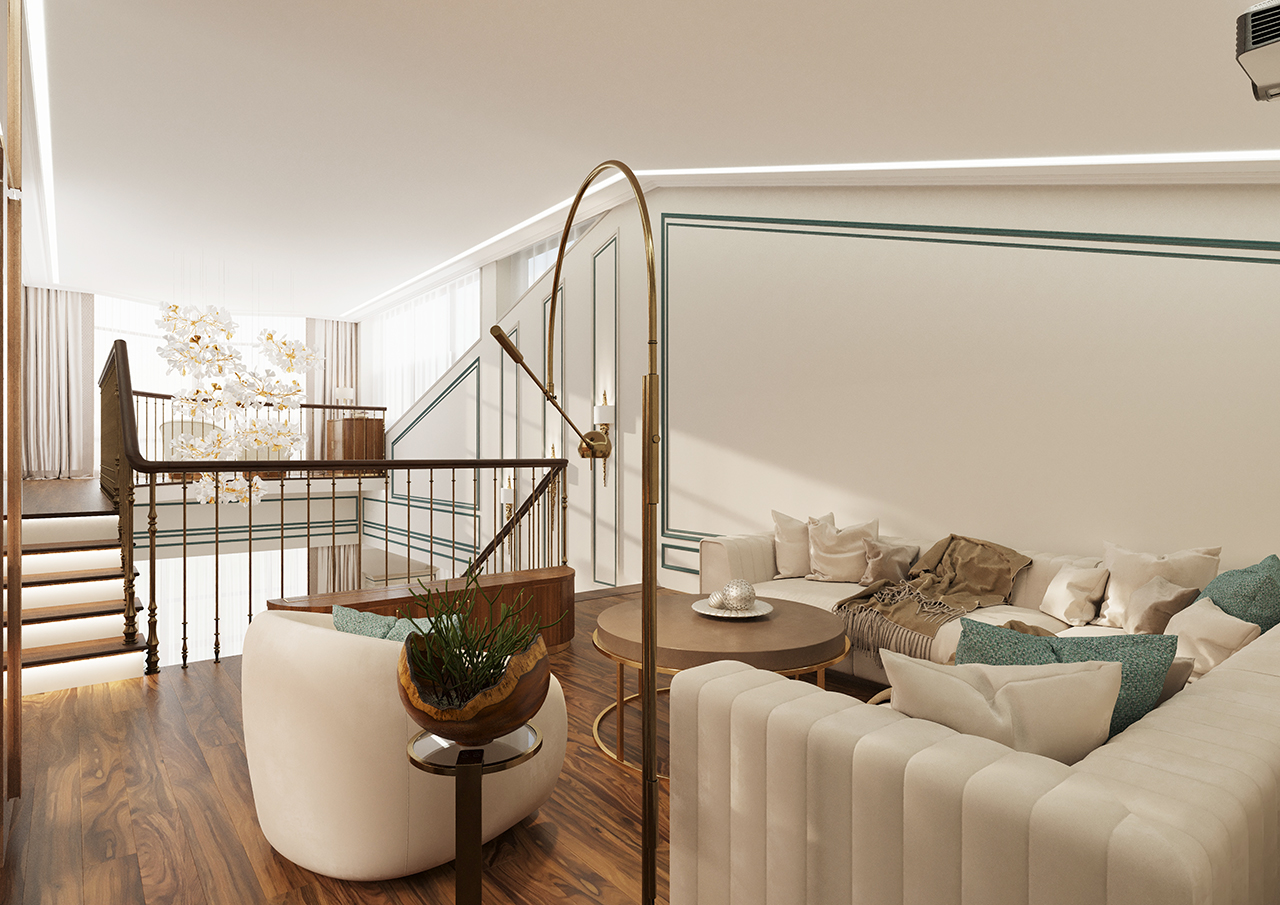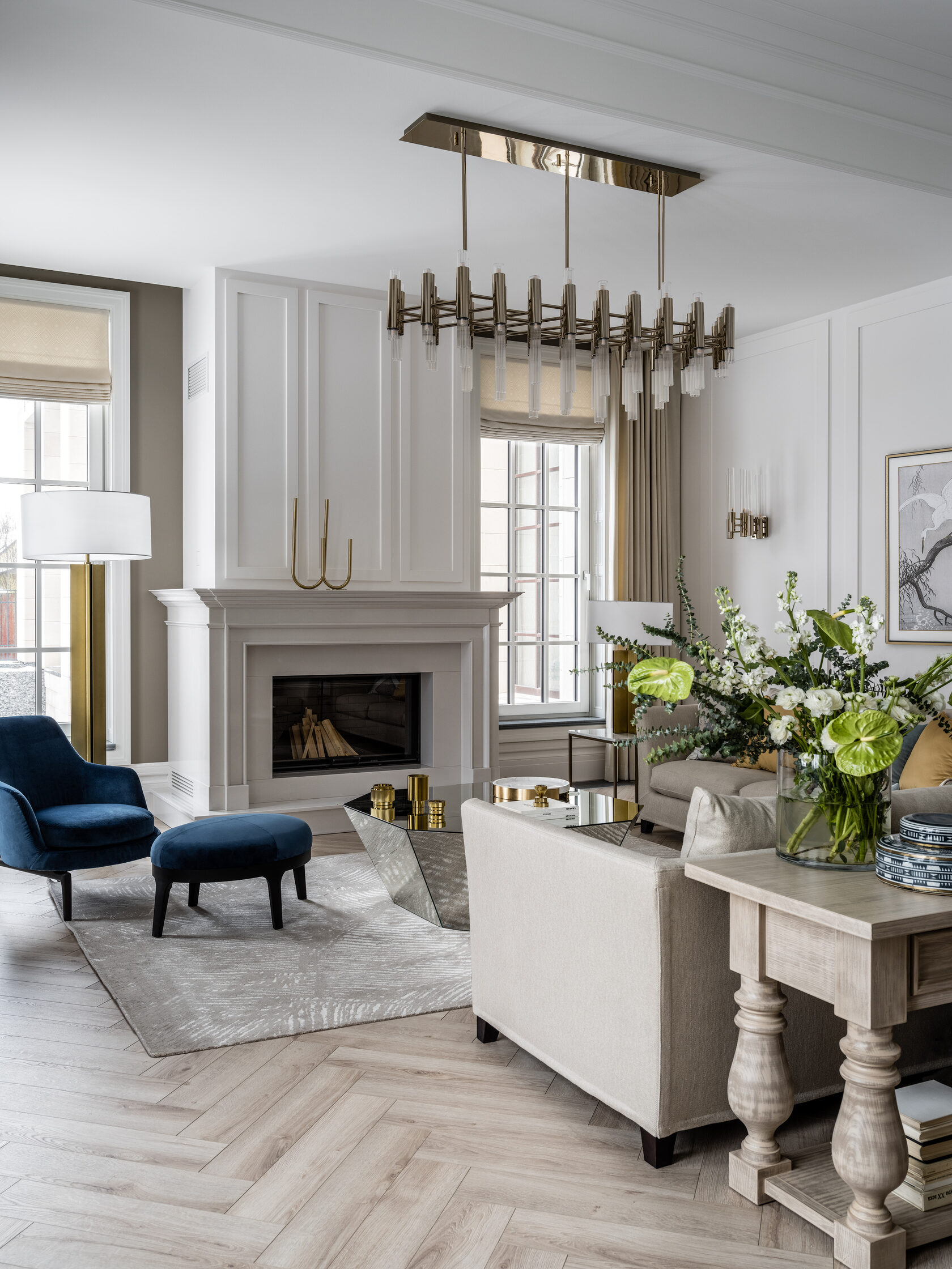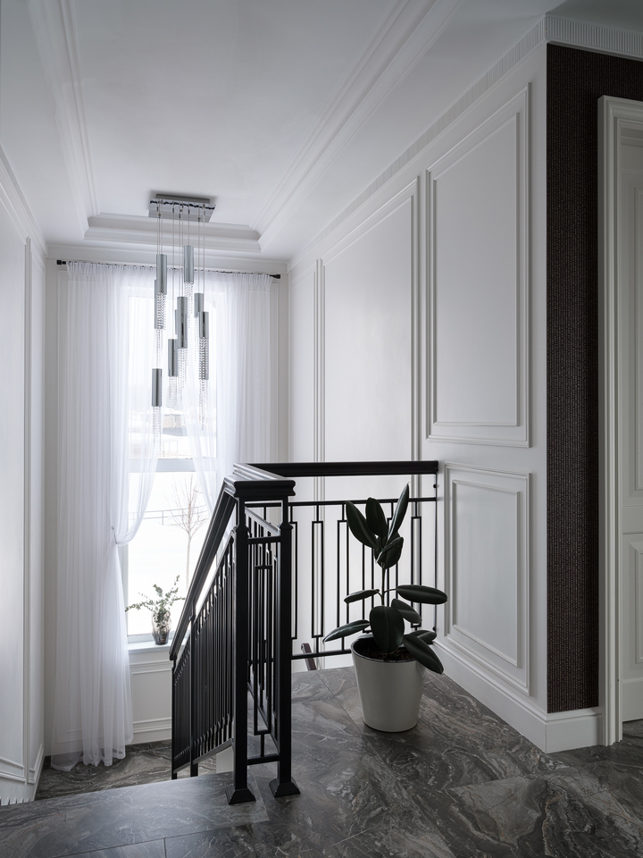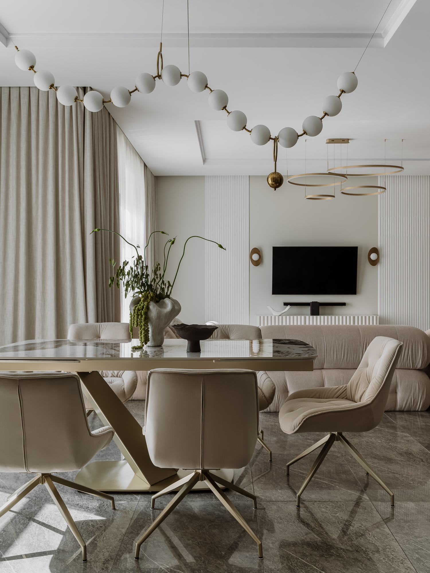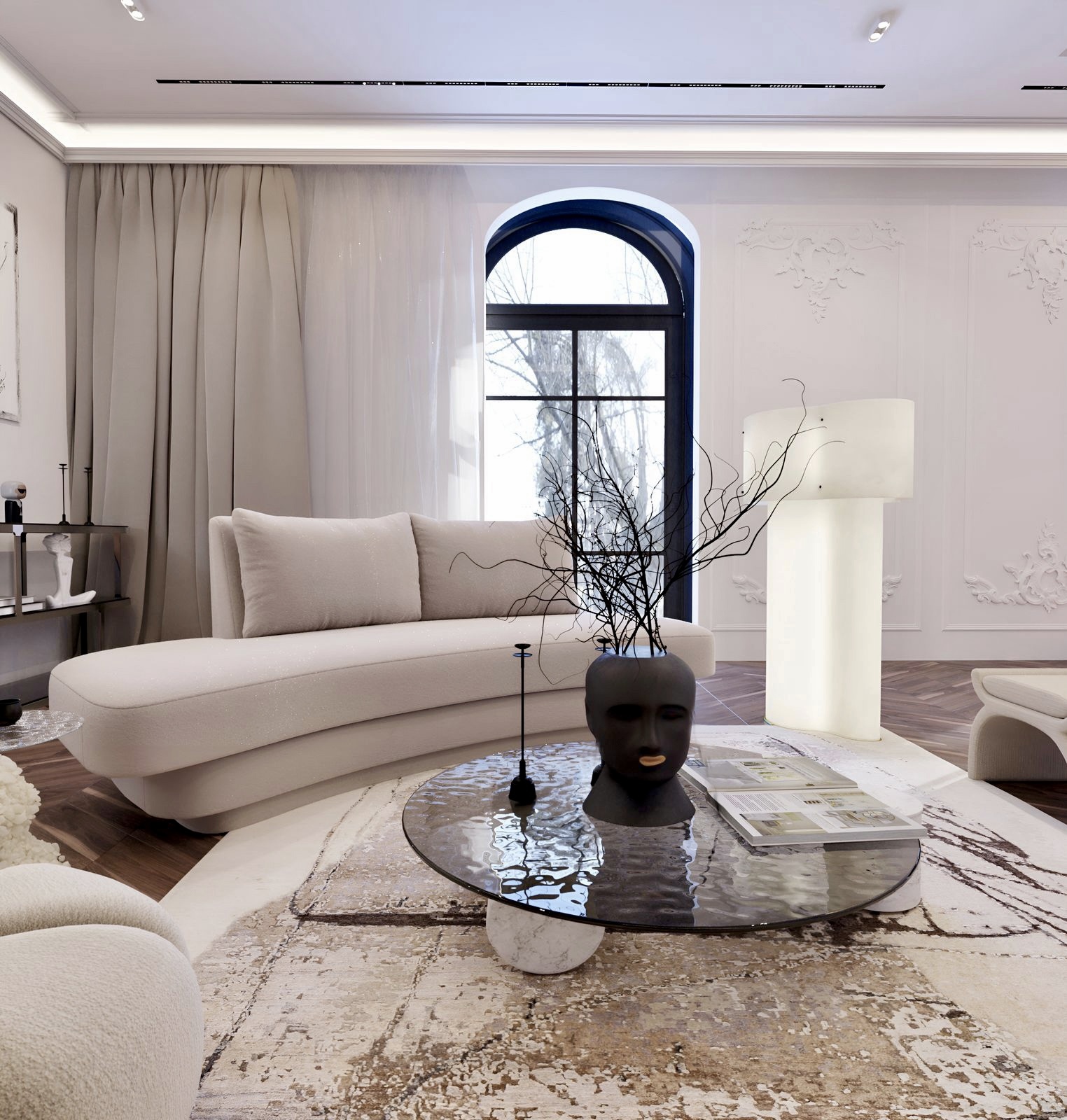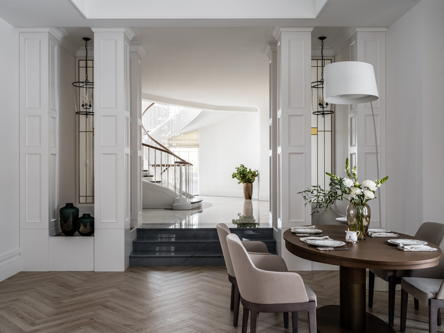 Концепция: Основная идея проекта заключалась в мастерском сочетании неоклассического стиля с элементами ар-деко для формирования гармоничного пространства, способного отразить предпочтения всех обитателей. Важнейшей задачей было создание интерьера, одновременно торжественного и уютного, максимально наполненного светом и объемом. Акцент сделан на изысканных деталях и благородных материалах, подчеркивающих статус и вкус владельцев, сохраняя при этом функциональность и комфорт.