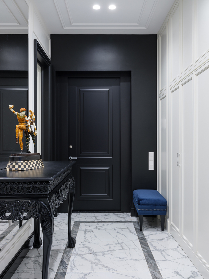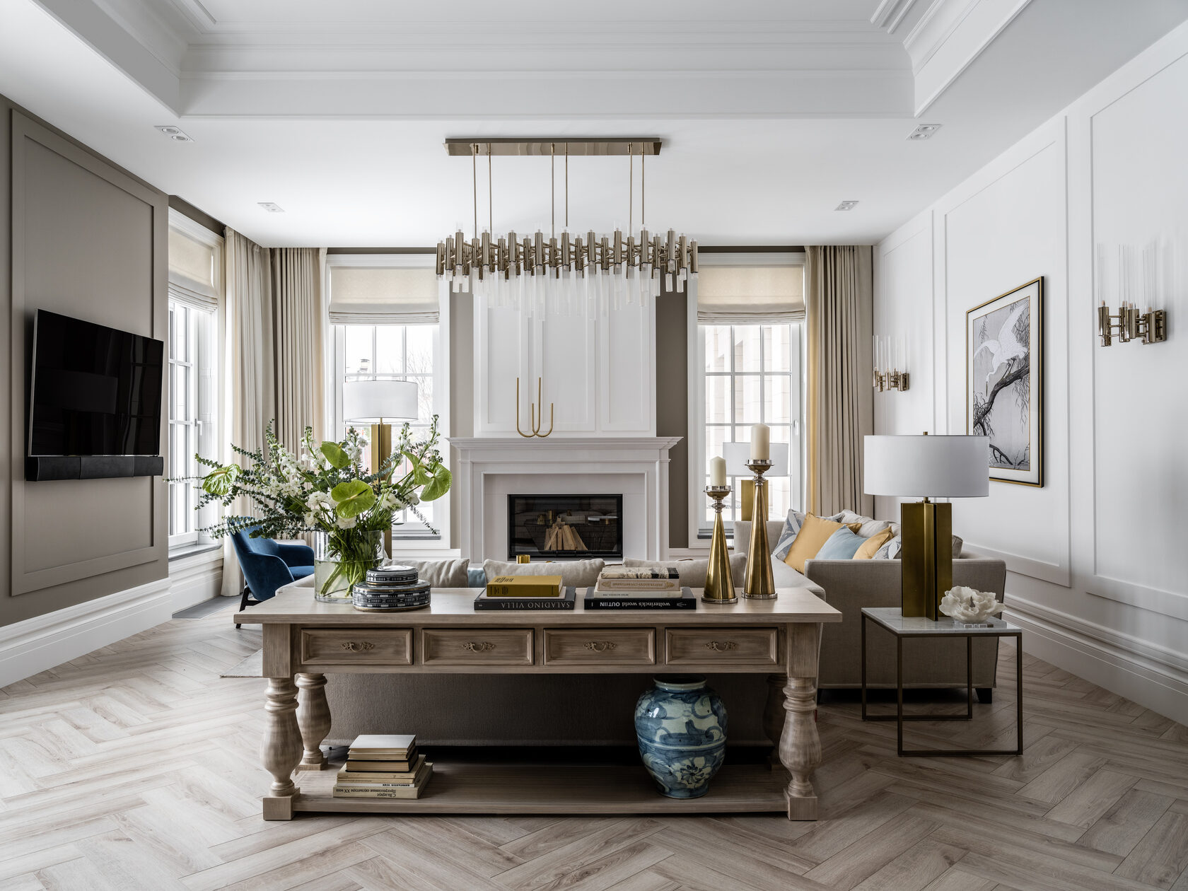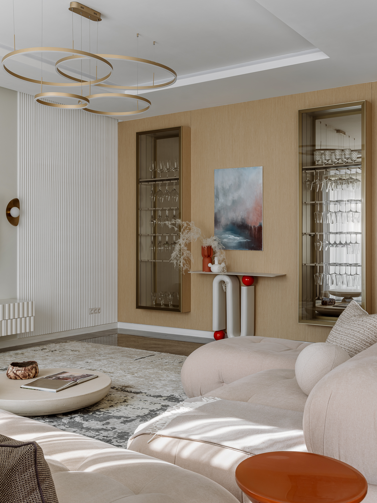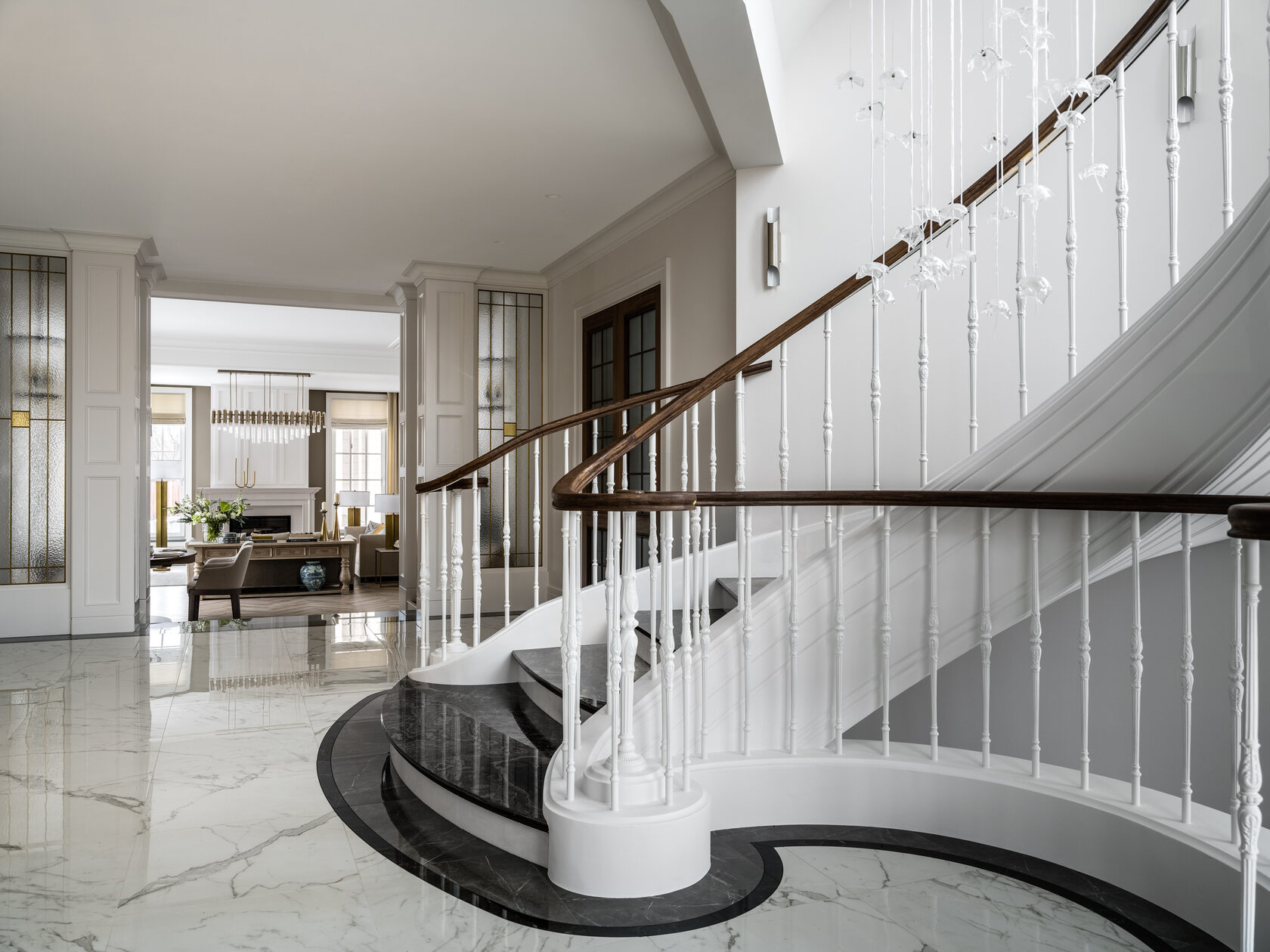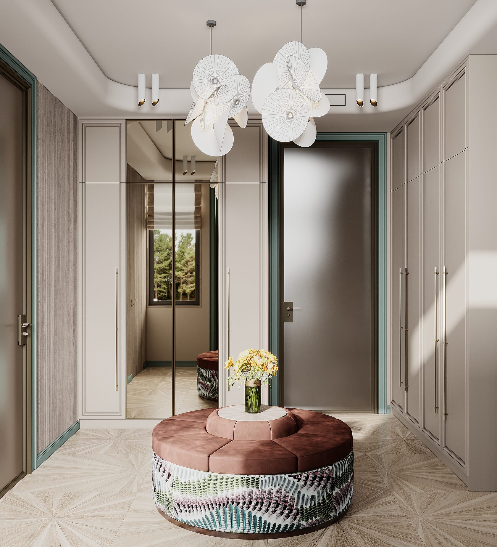 Концепция: Основная идея проекта заключалась в мастерском сочетании неоклассического стиля с элементами ар-деко для формирования гармоничного пространства, способного отразить предпочтения всех обитателей. Важнейшей задачей было создание интерьера, одновременно торжественного и уютного, максимально наполненного светом и объемом. Акцент сделан на изысканных деталях и благородных материалах, подчеркивающих статус и вкус владельцев, сохраняя при этом функциональность и комфорт.