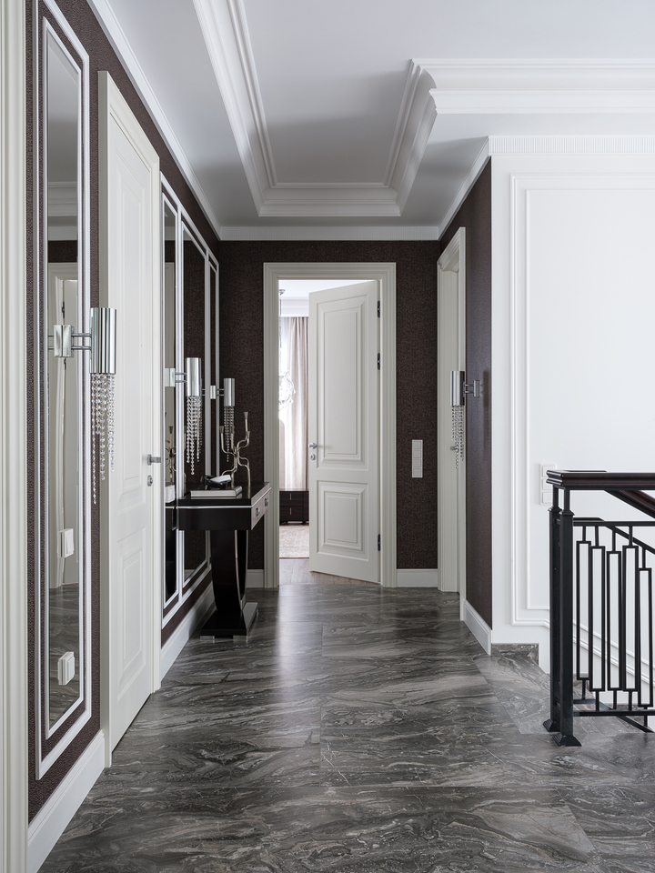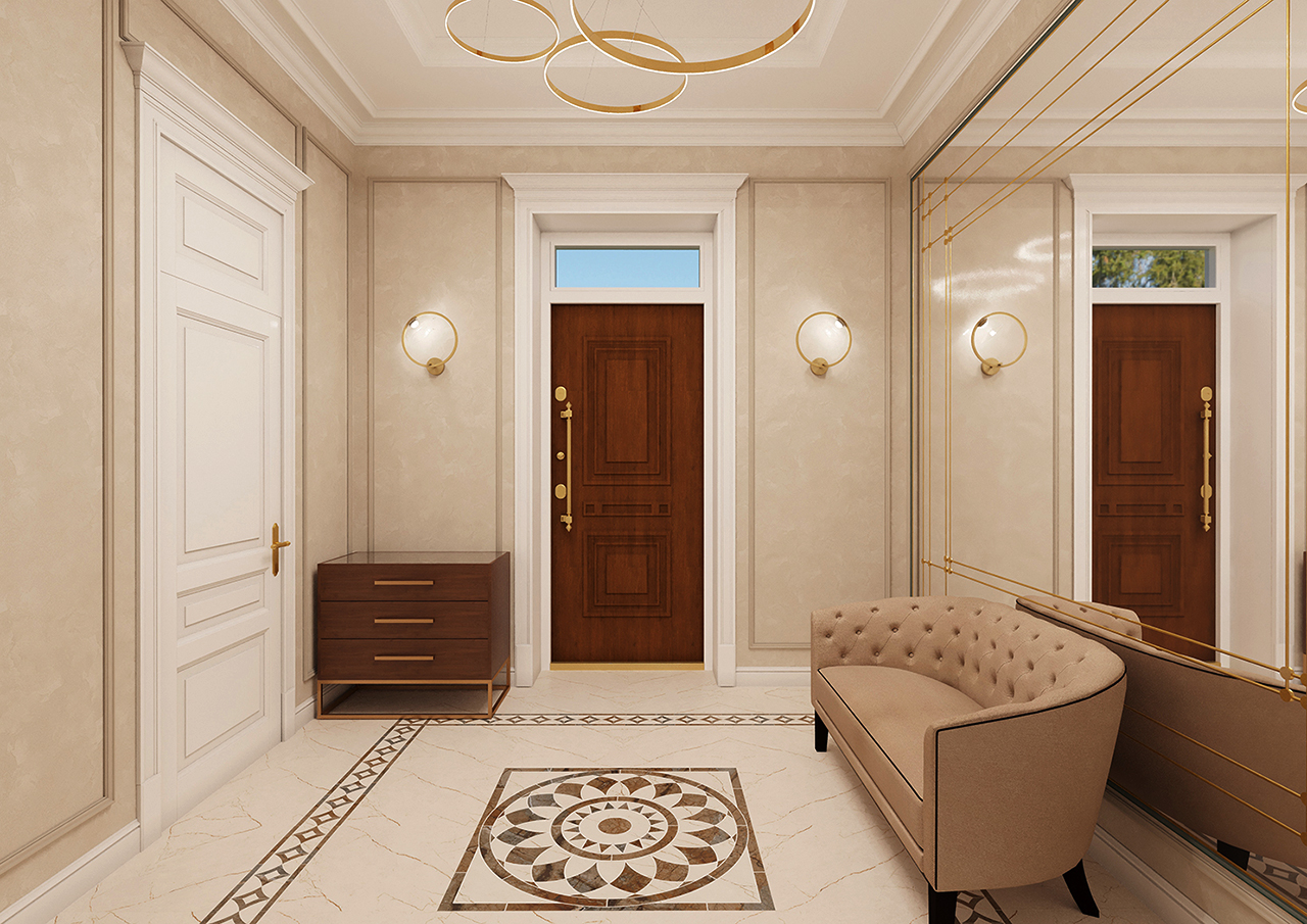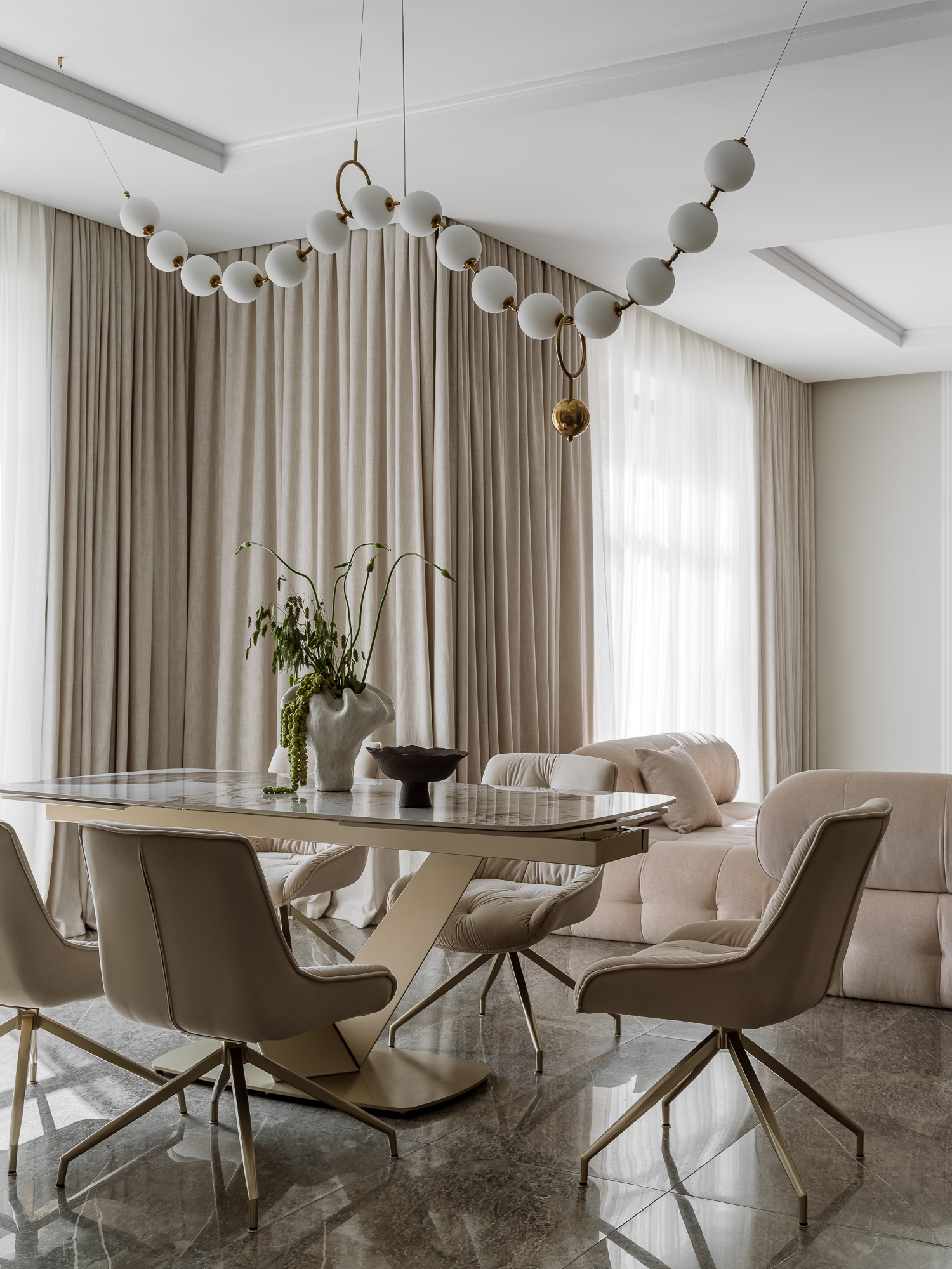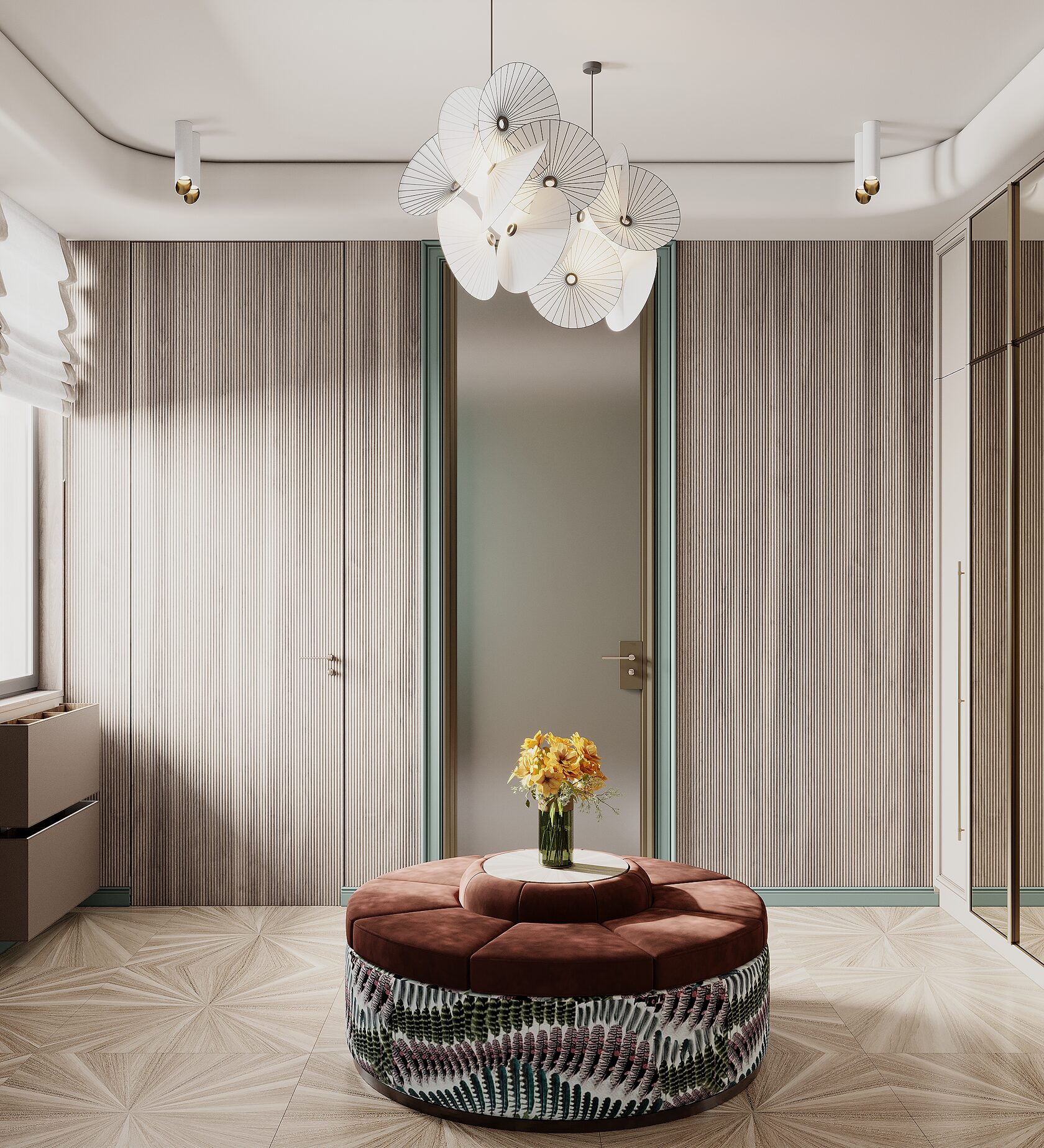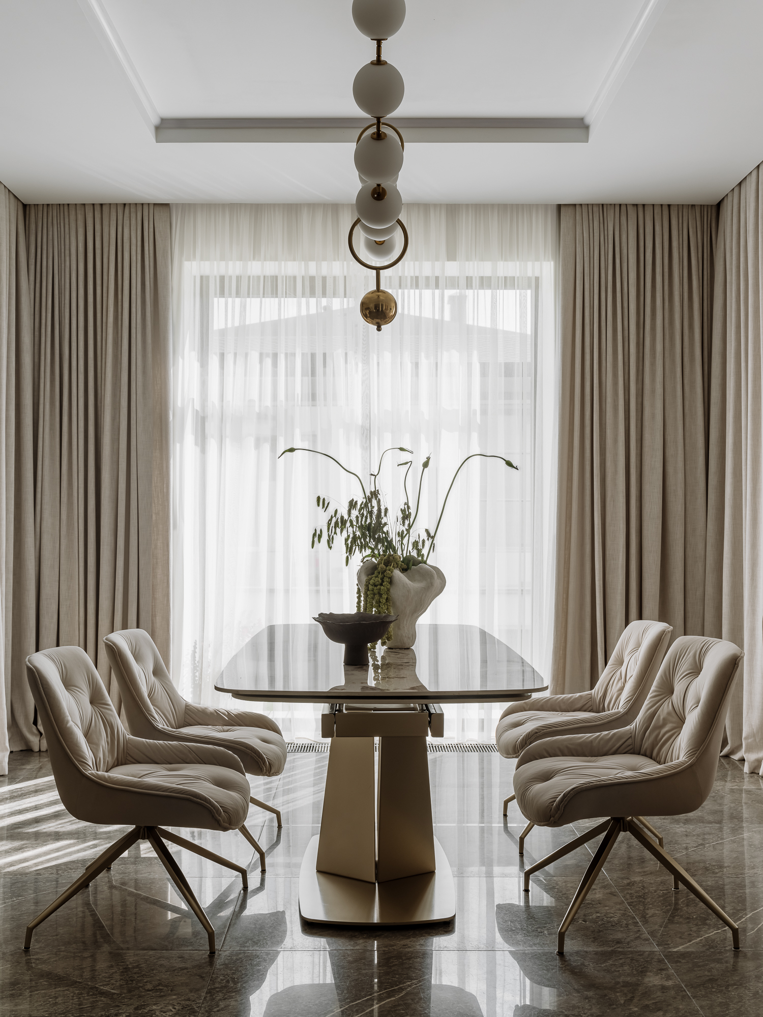 Концепция: Основная идея проекта заключалась в мастерском сочетании неоклассического стиля с элементами ар-деко для формирования гармоничного пространства, способного отразить предпочтения всех обитателей. Важнейшей задачей было создание интерьера, одновременно торжественного и уютного, максимально наполненного светом и объемом. Акцент сделан на изысканных деталях и благородных материалах, подчеркивающих статус и вкус владельцев, сохраняя при этом функциональность и комфорт.