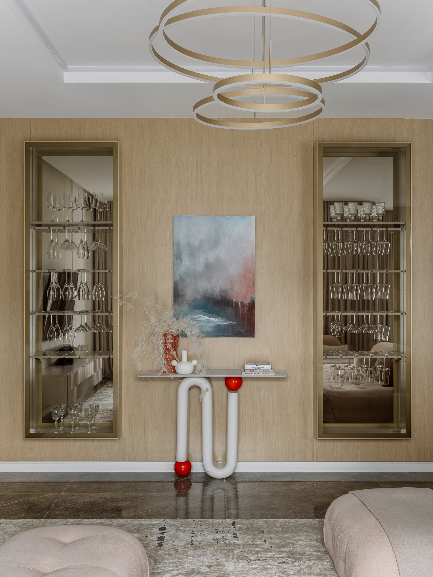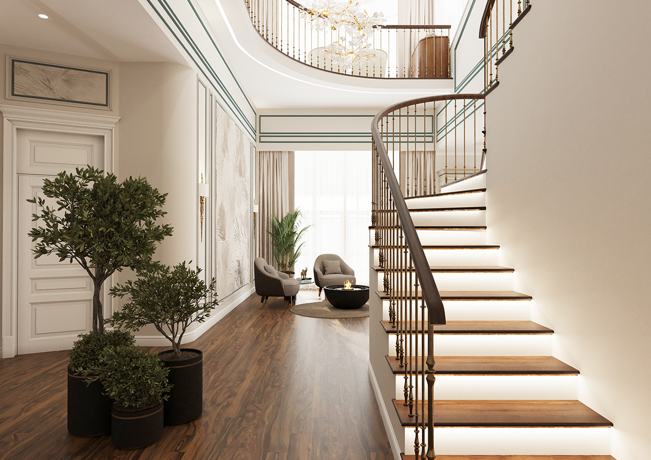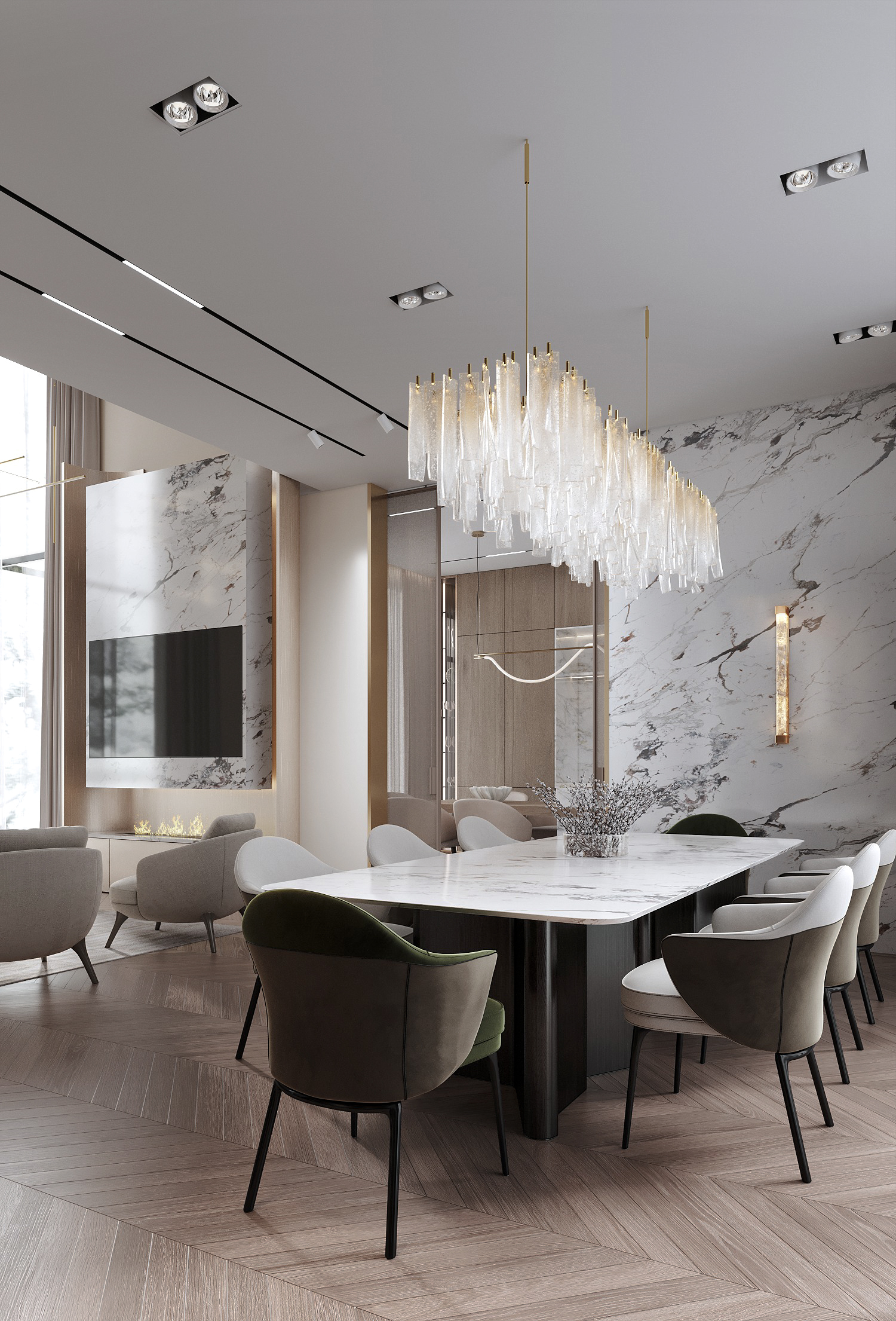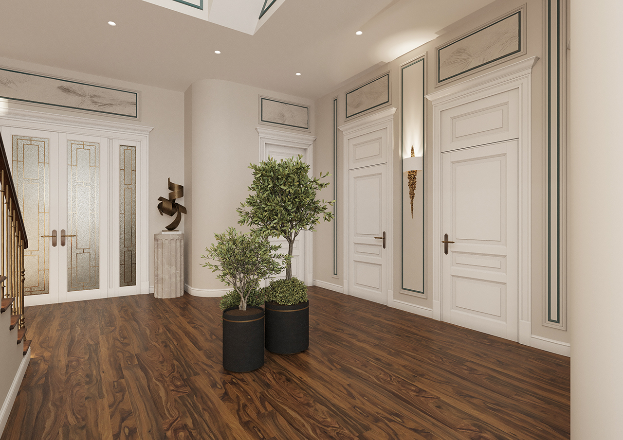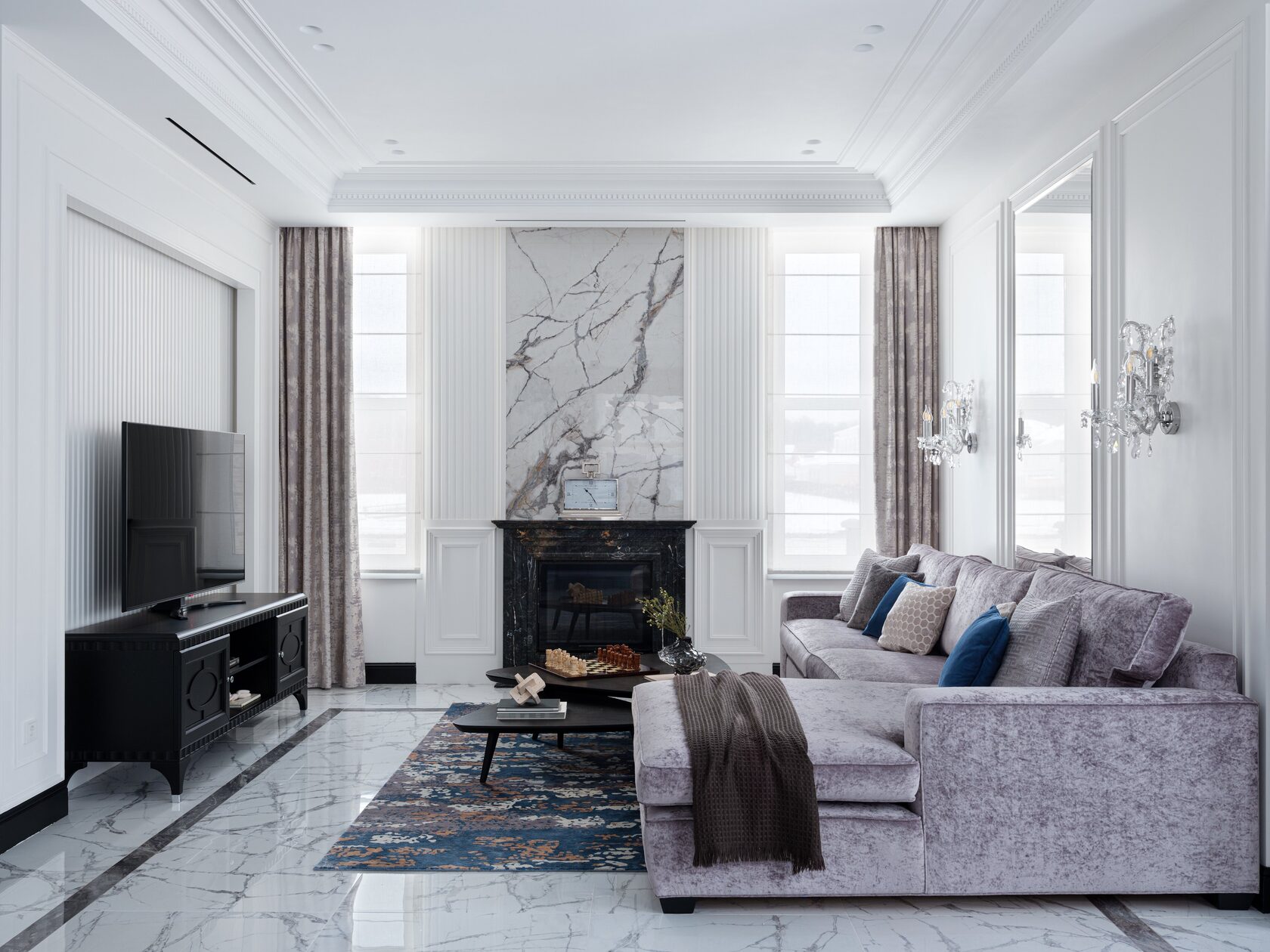 Концепция: Основная идея проекта заключалась в мастерском сочетании неоклассического стиля с элементами ар-деко для формирования гармоничного пространства, способного отразить предпочтения всех обитателей. Важнейшей задачей было создание интерьера, одновременно торжественного и уютного, максимально наполненного светом и объемом. Акцент сделан на изысканных деталях и благородных материалах, подчеркивающих статус и вкус владельцев, сохраняя при этом функциональность и комфорт.
