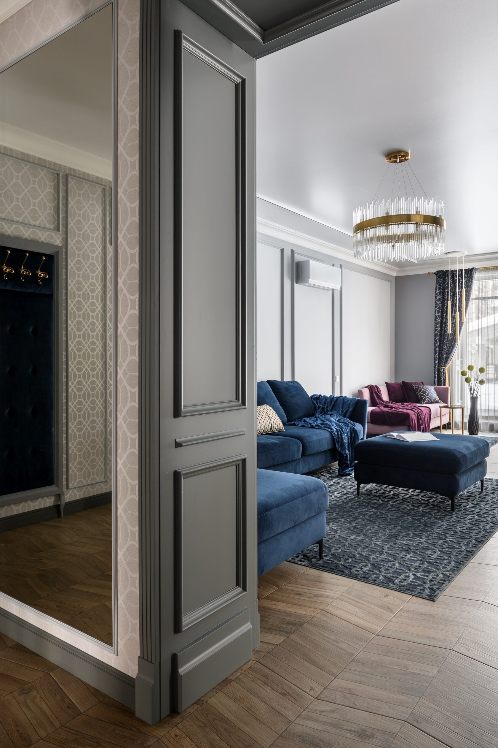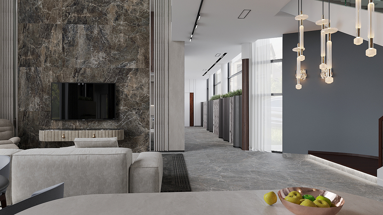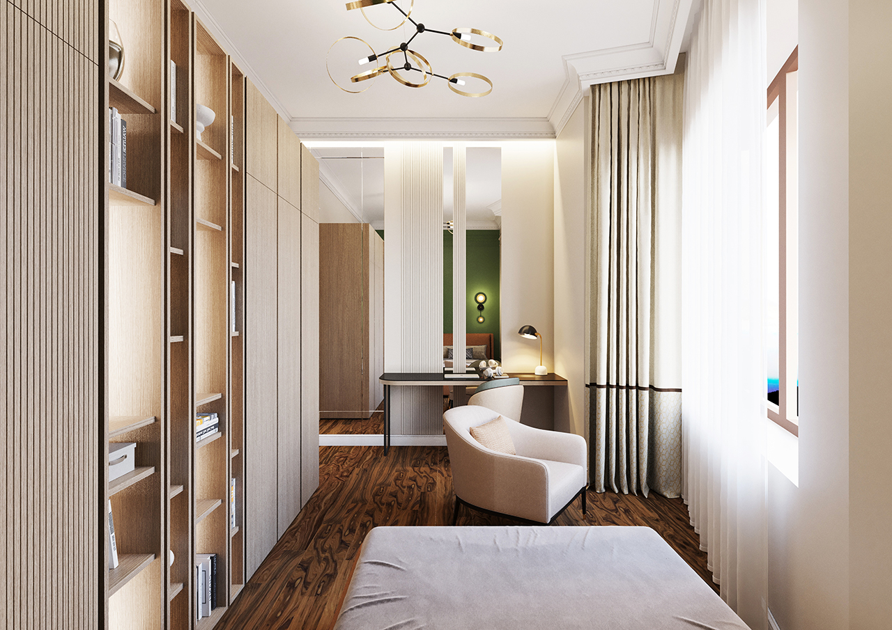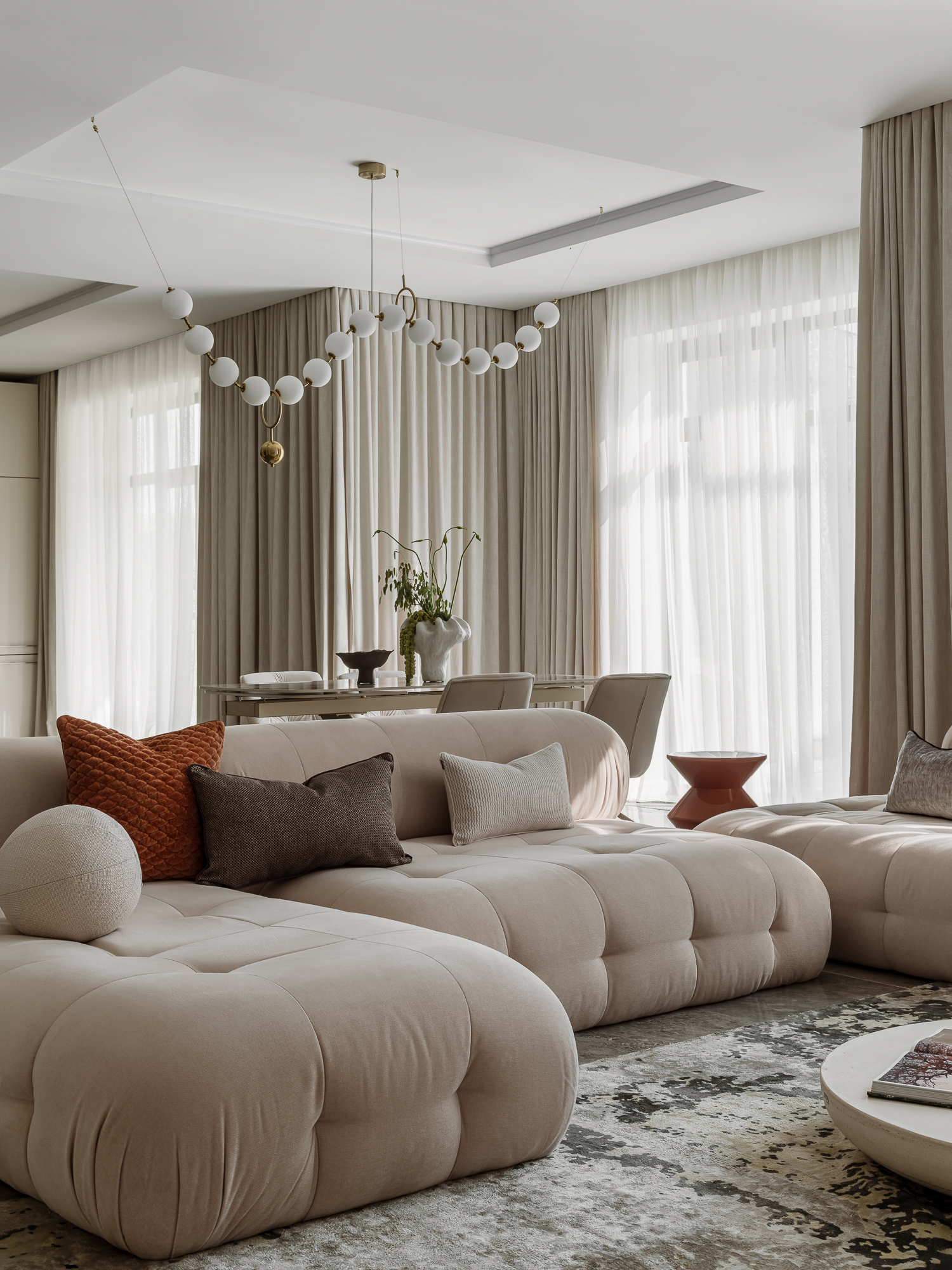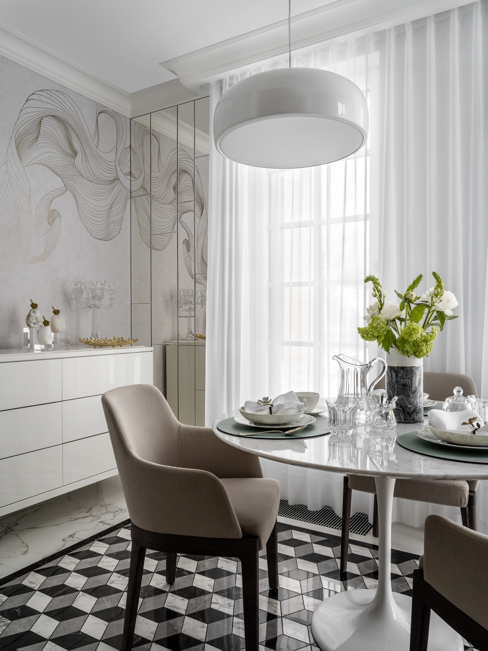 Концепция: Основная идея проекта заключалась в мастерском сочетании неоклассического стиля с элементами ар-деко для формирования гармоничного пространства, способного отразить предпочтения всех обитателей. Важнейшей задачей было создание интерьера, одновременно торжественного и уютного, максимально наполненного светом и объемом. Акцент сделан на изысканных деталях и благородных материалах, подчеркивающих статус и вкус владельцев, сохраняя при этом функциональность и комфорт.