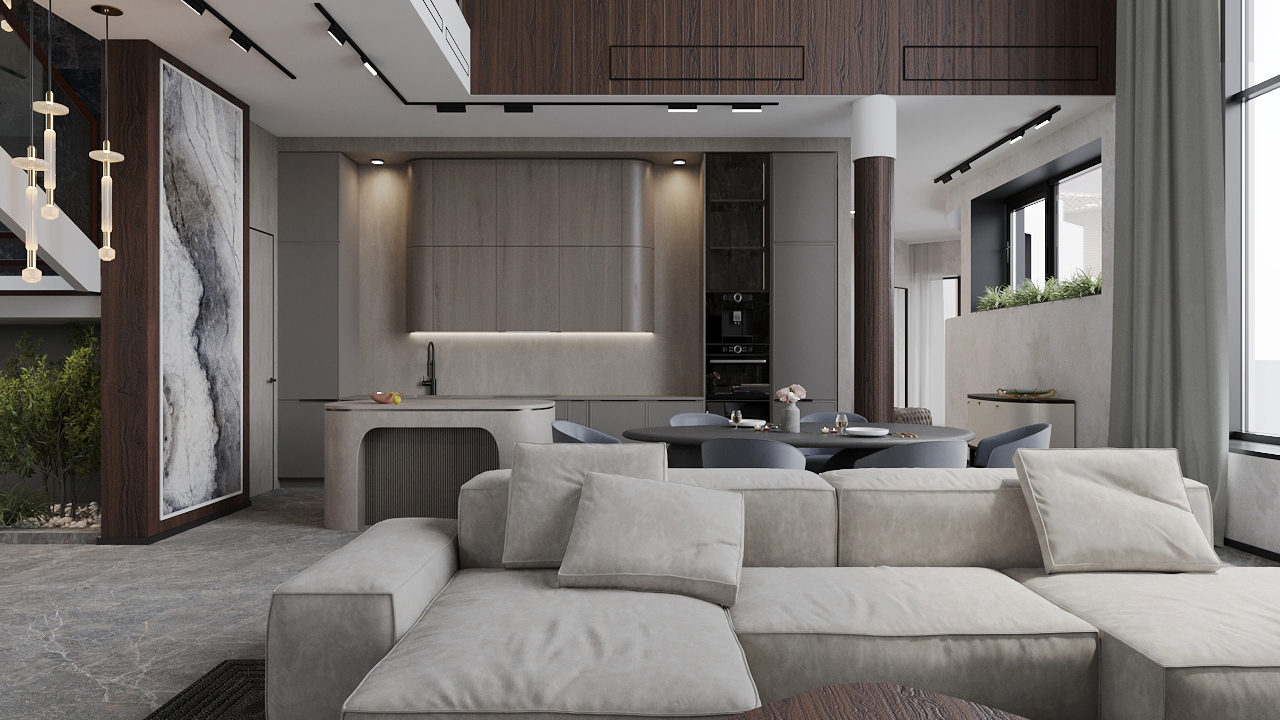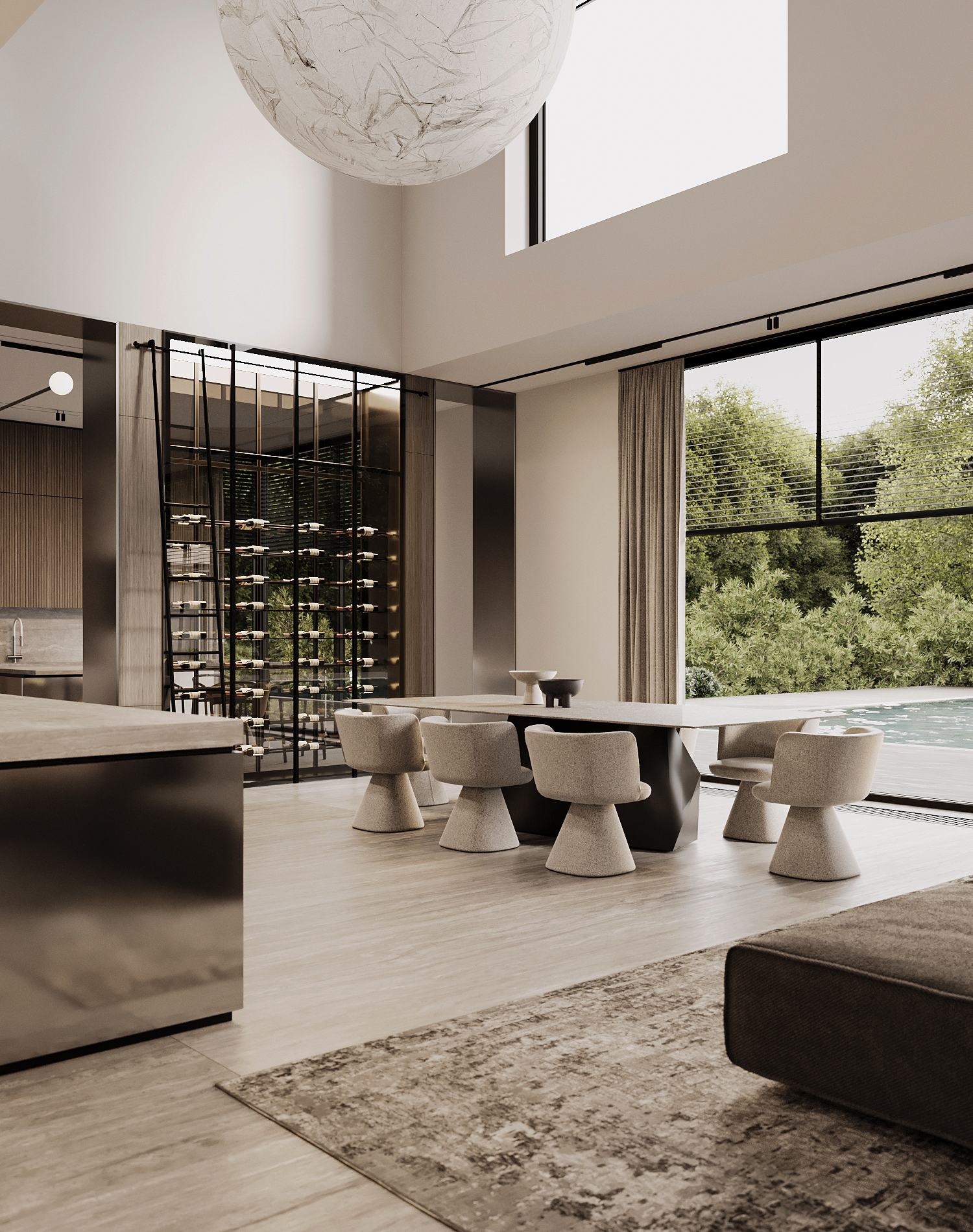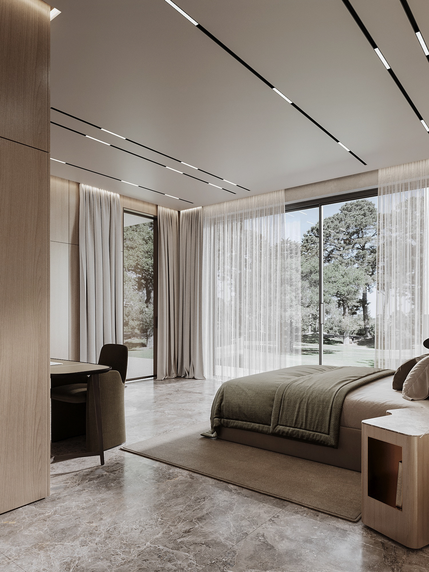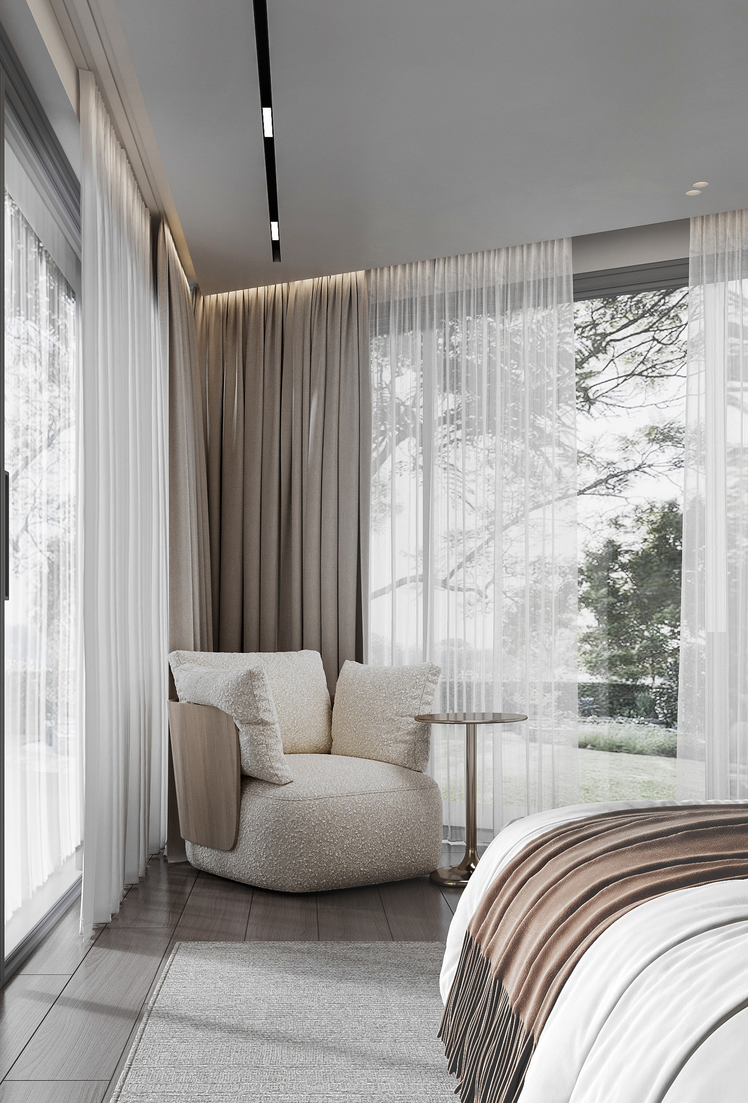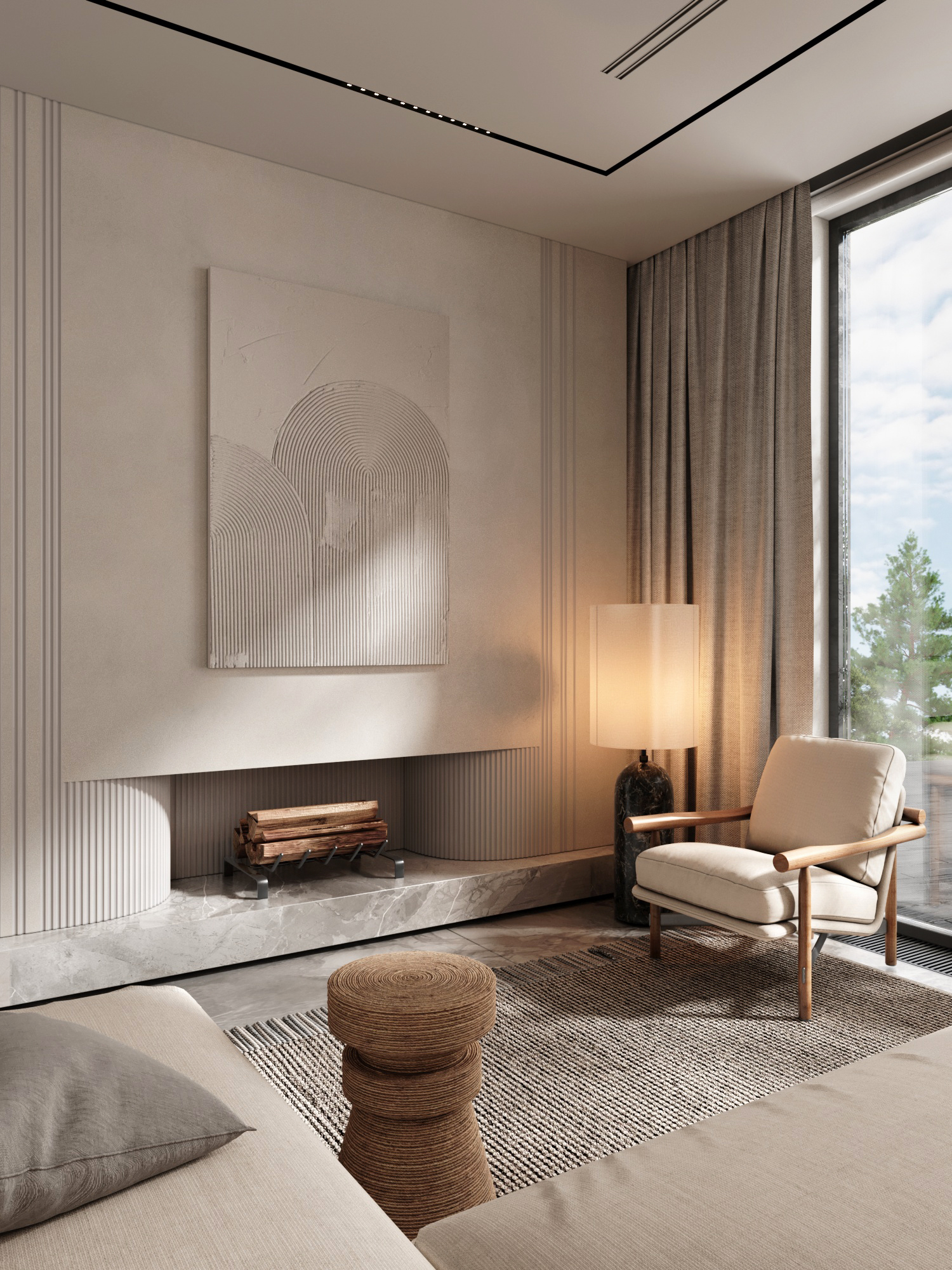 Этот интерьер воплощает современное понимание роскоши — не через избыток декора, а благодаря безупречным пропорциям, качеству материалов и продуманному пространству. Нейтральная палитра в оттенках белого, бежевого и серого создает ощущение чистоты и простора, а теплые древесные акценты добавляют интерьеру глубины и тактильного тепла. Большие окна наполняют помещения естественным светом, стирая границы между внутренним пространством и окружающей природой.