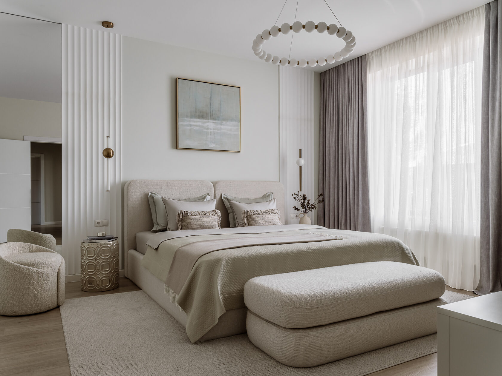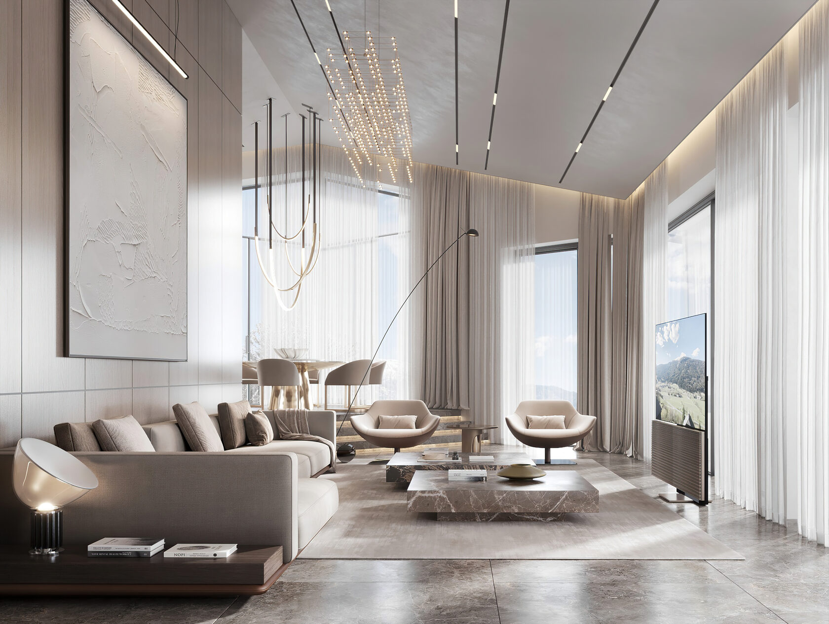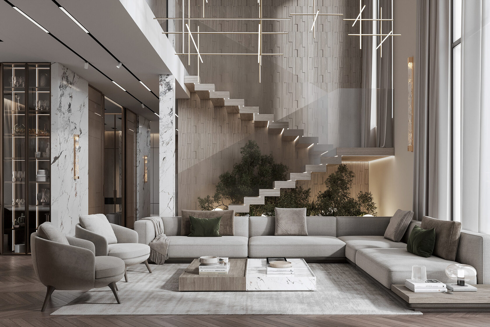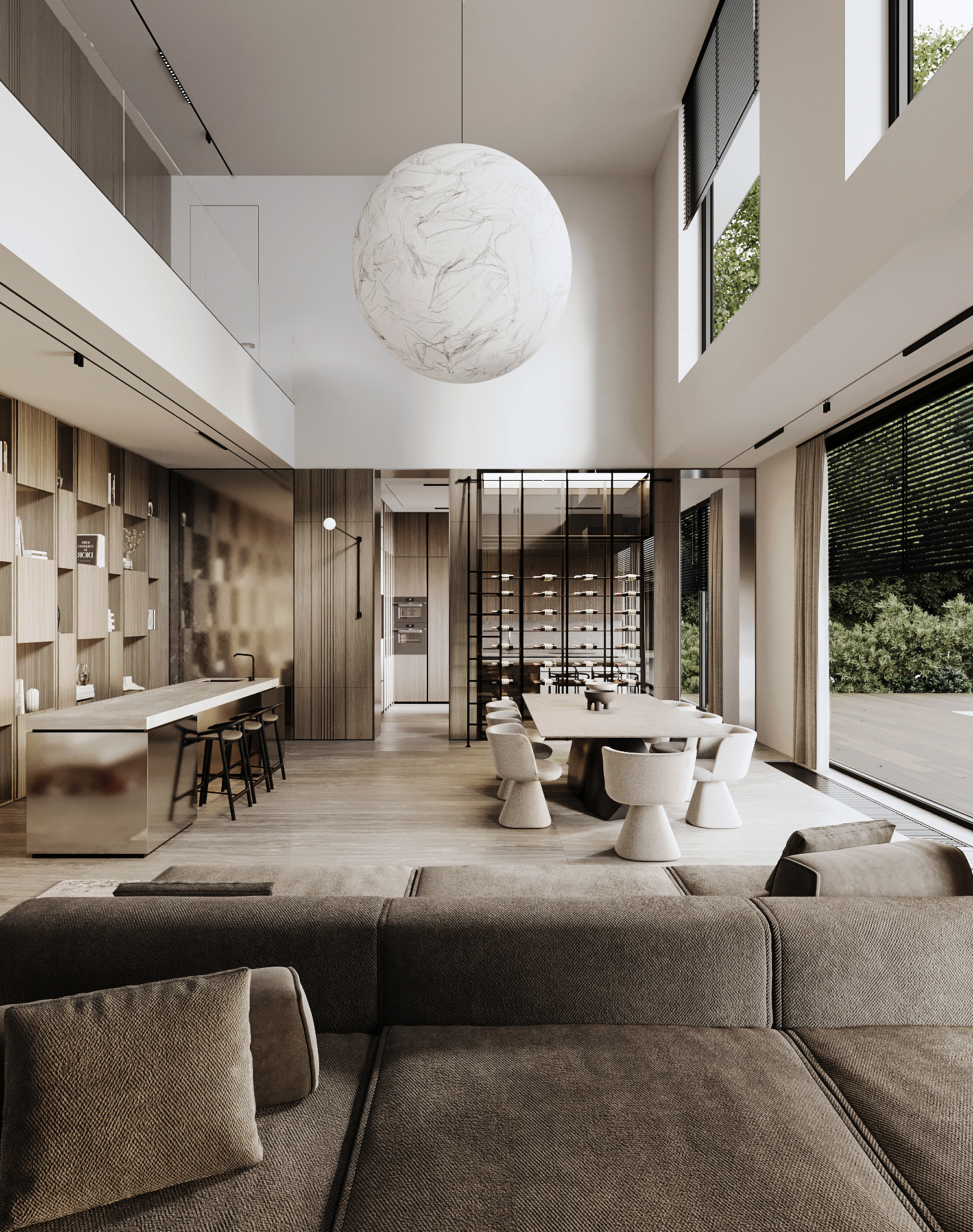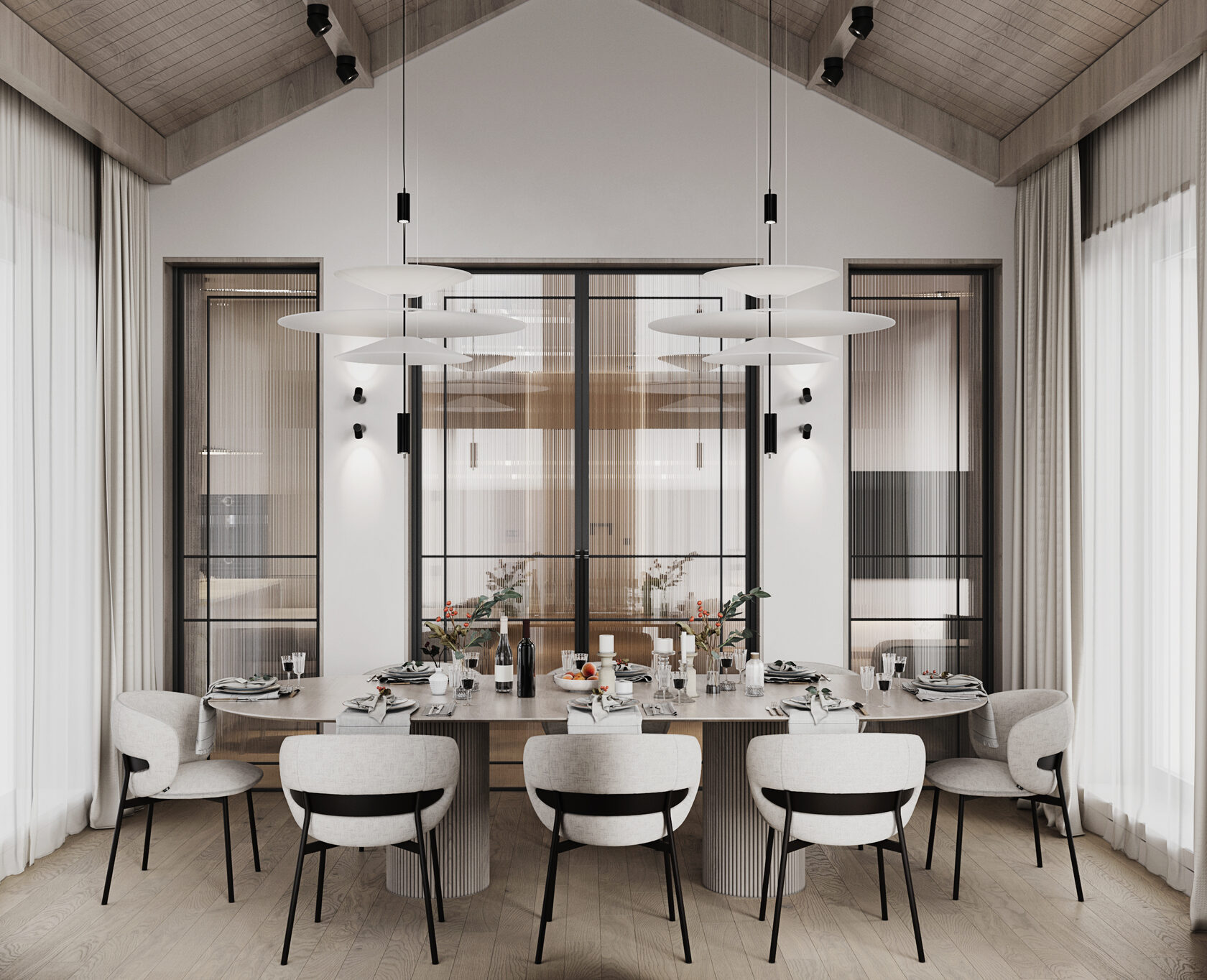 Этот интерьер воплощает современное понимание роскоши — не через избыток декора, а благодаря безупречным пропорциям, качеству материалов и продуманному пространству. Нейтральная палитра в оттенках белого, бежевого и серого создает ощущение чистоты и простора, а теплые древесные акценты добавляют интерьеру глубины и тактильного тепла. Большие окна наполняют помещения естественным светом, стирая границы между внутренним пространством и окружающей природой.
