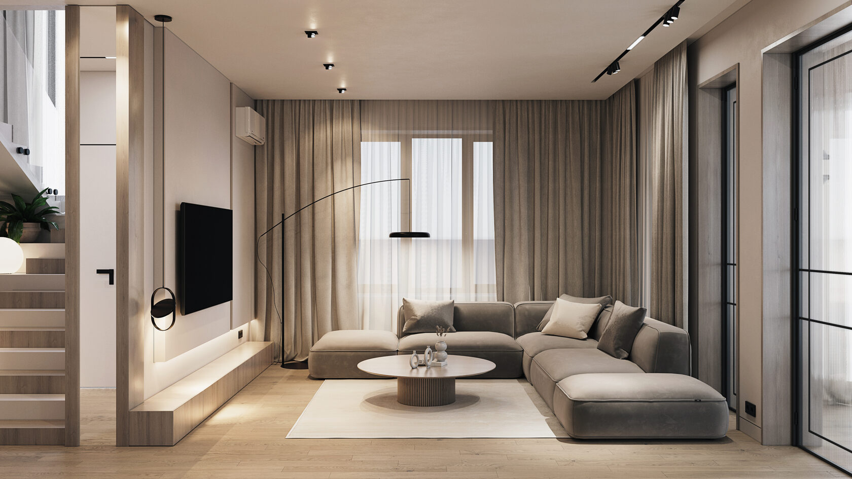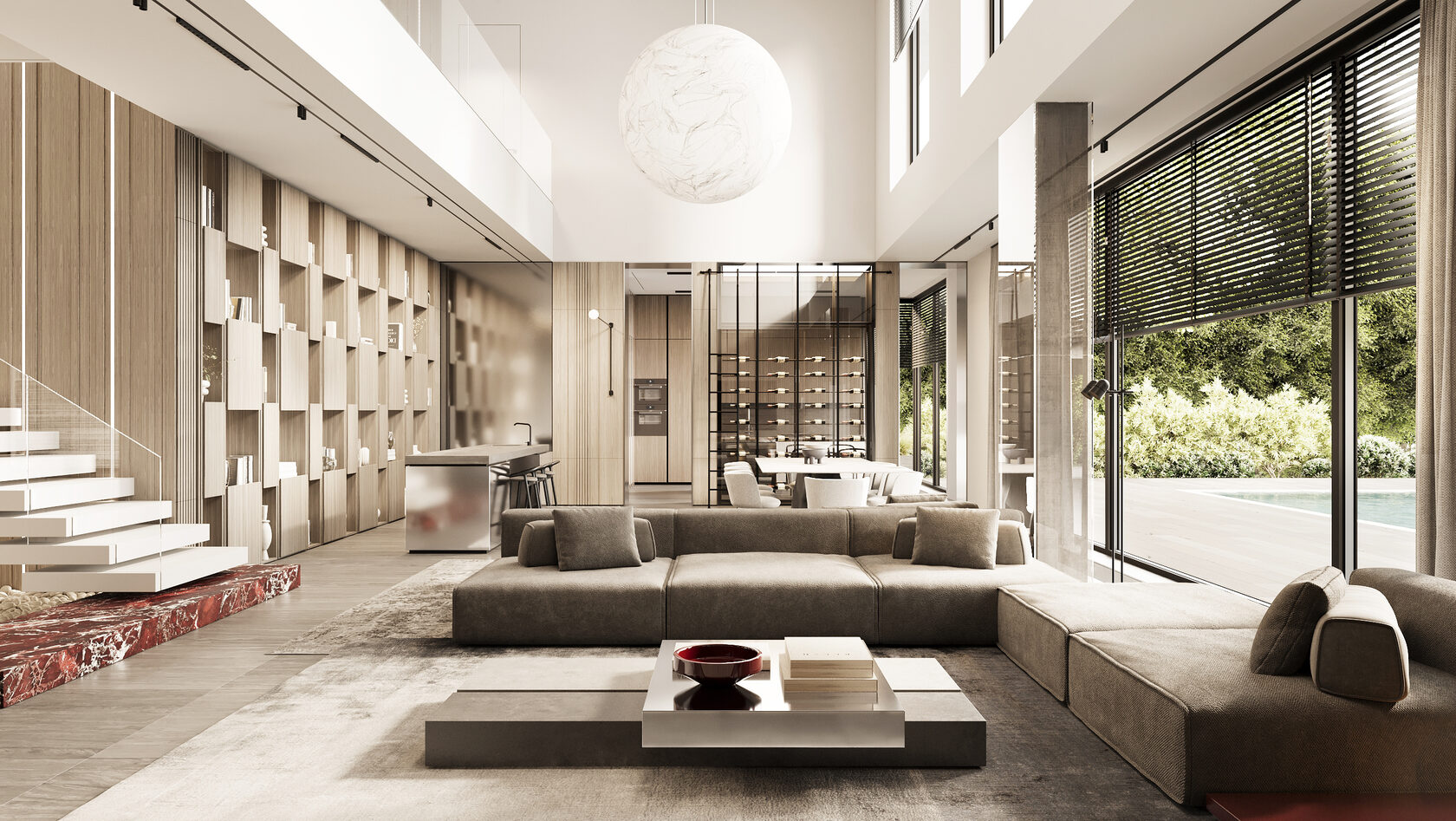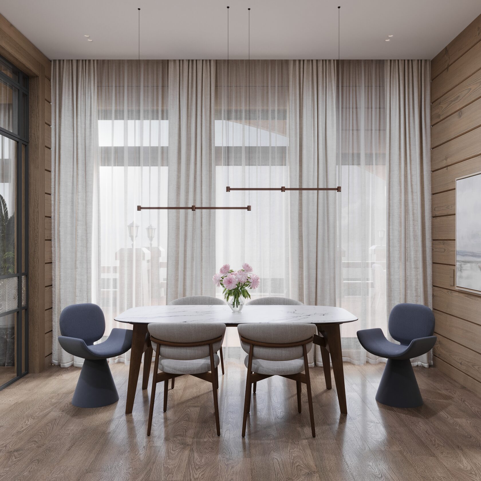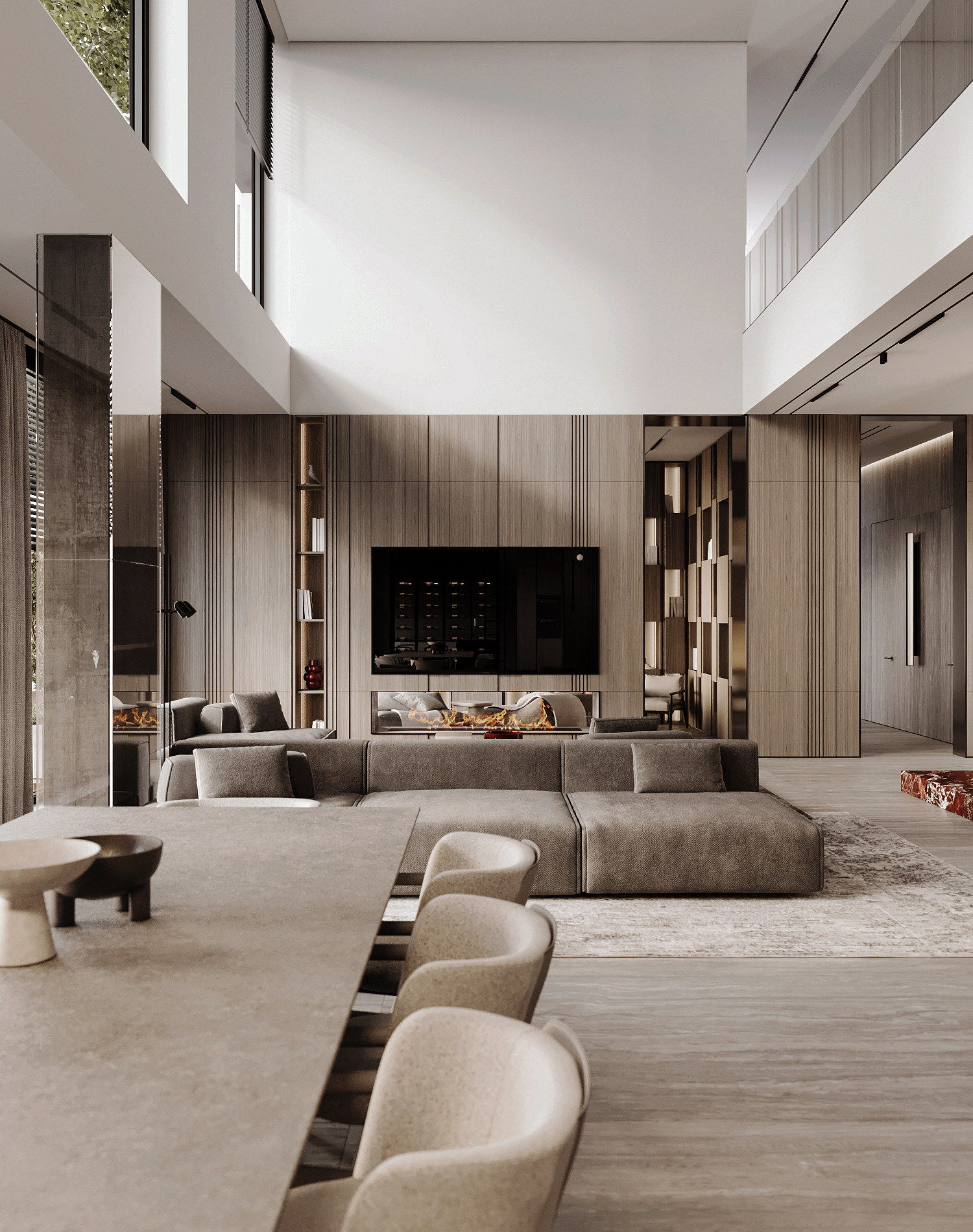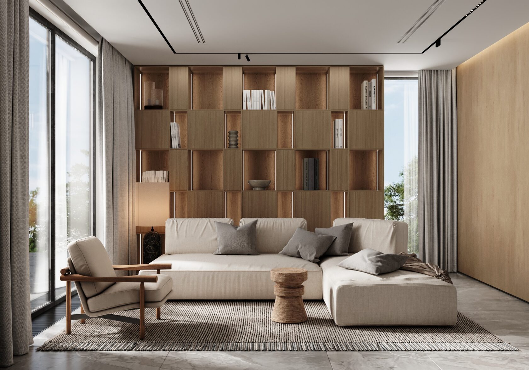 Этот интерьер воплощает современное понимание роскоши — не через избыток декора, а благодаря безупречным пропорциям, качеству материалов и продуманному пространству. Нейтральная палитра в оттенках белого, бежевого и серого создает ощущение чистоты и простора, а теплые древесные акценты добавляют интерьеру глубины и тактильного тепла. Большие окна наполняют помещения естественным светом, стирая границы между внутренним пространством и окружающей природой.