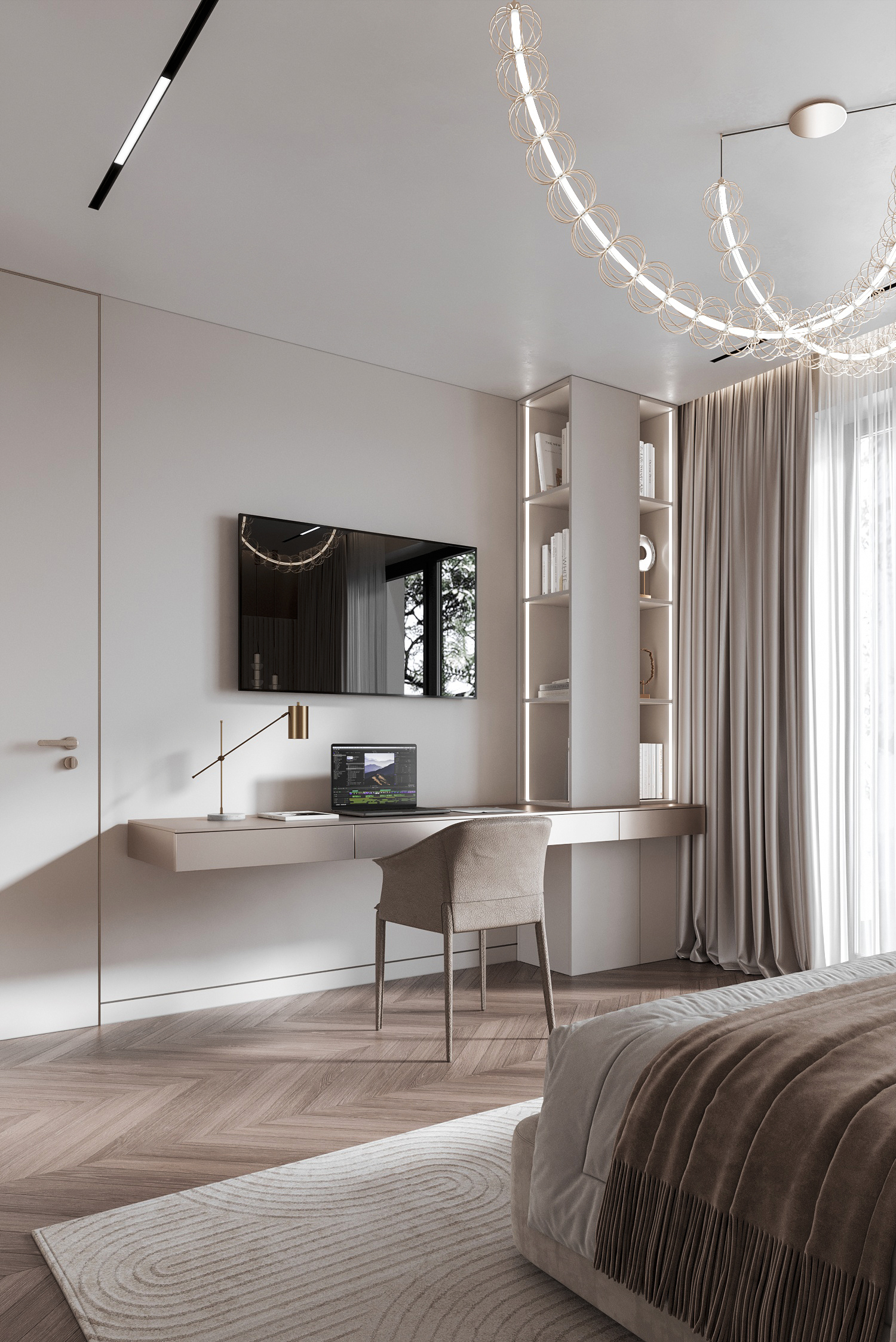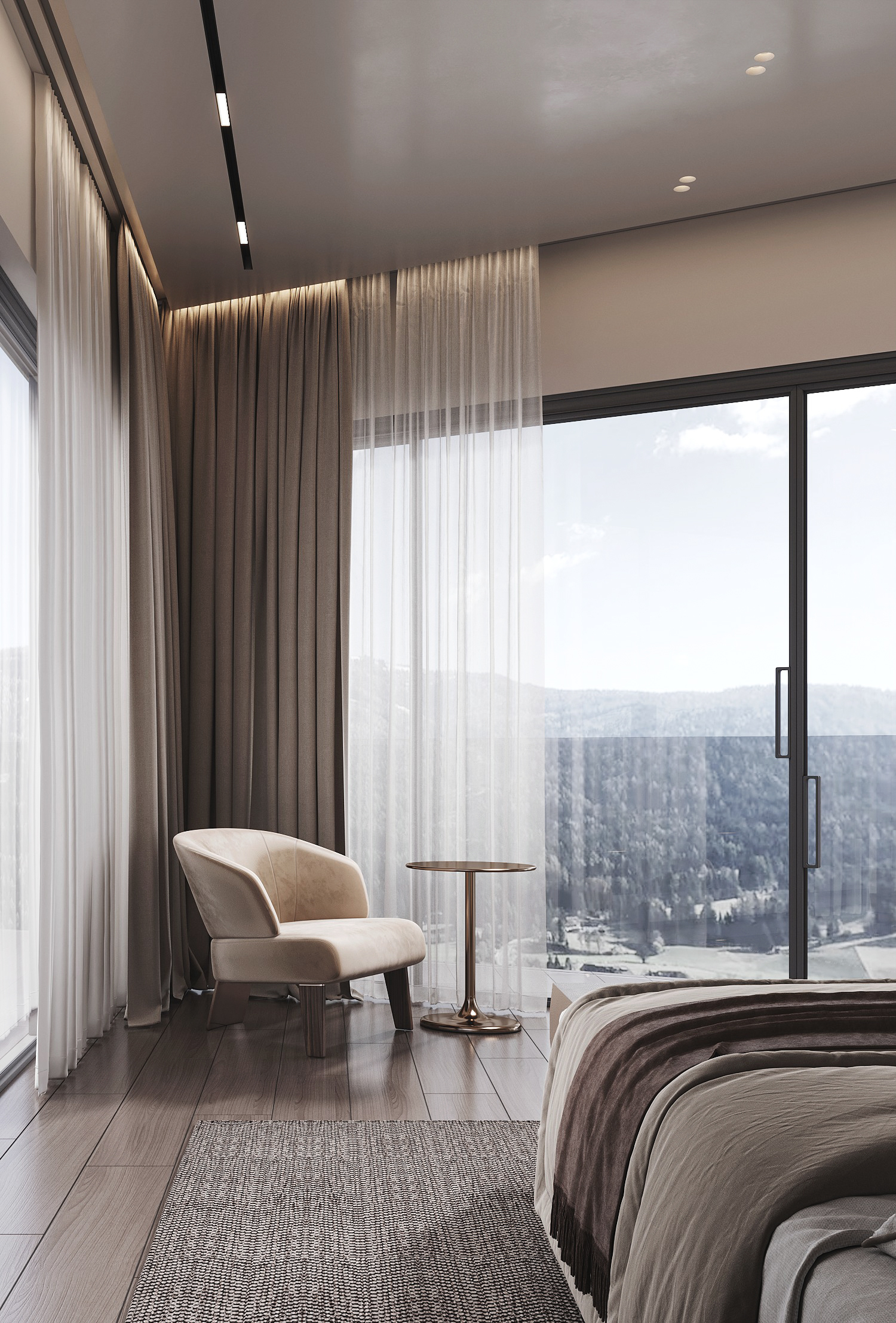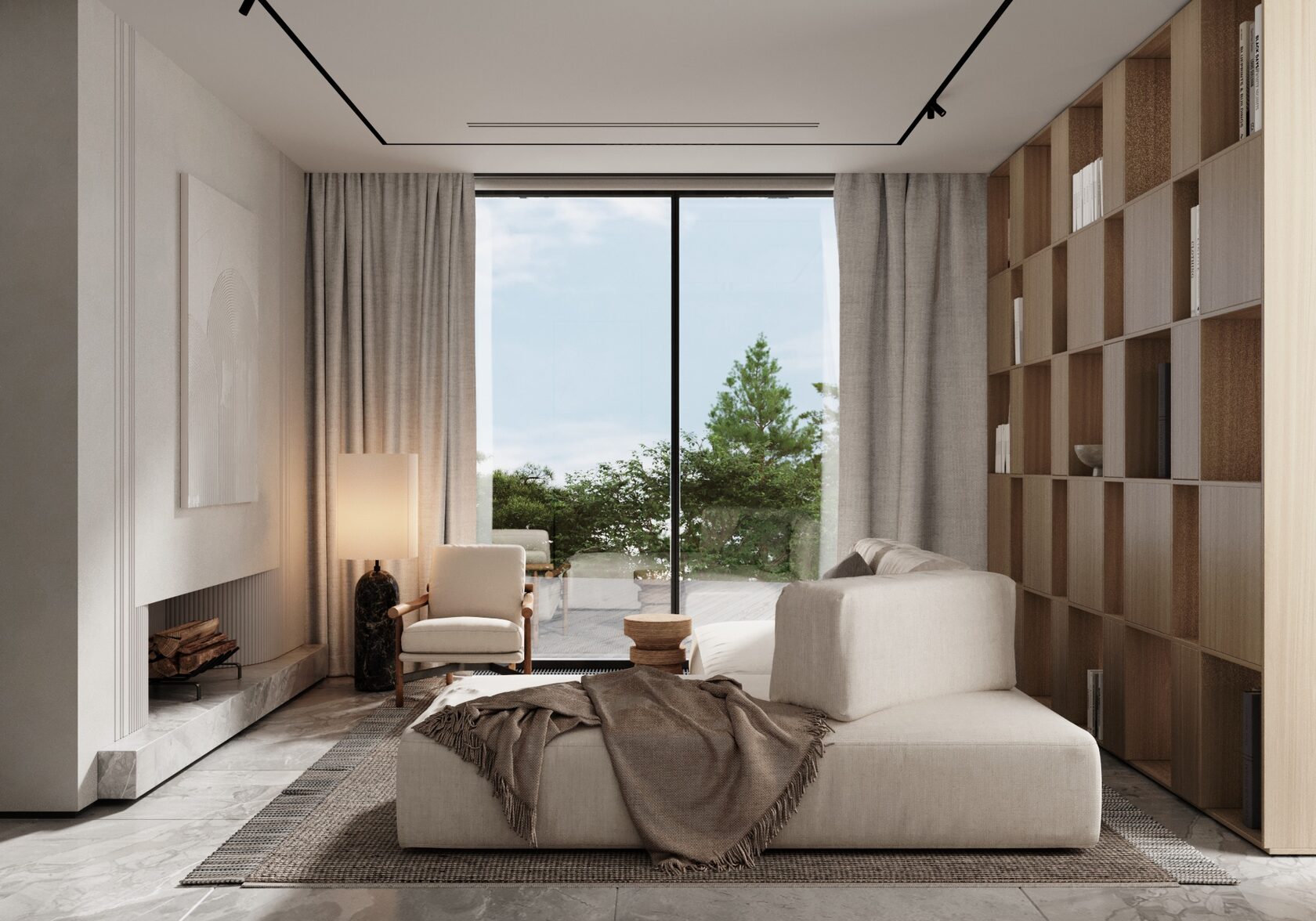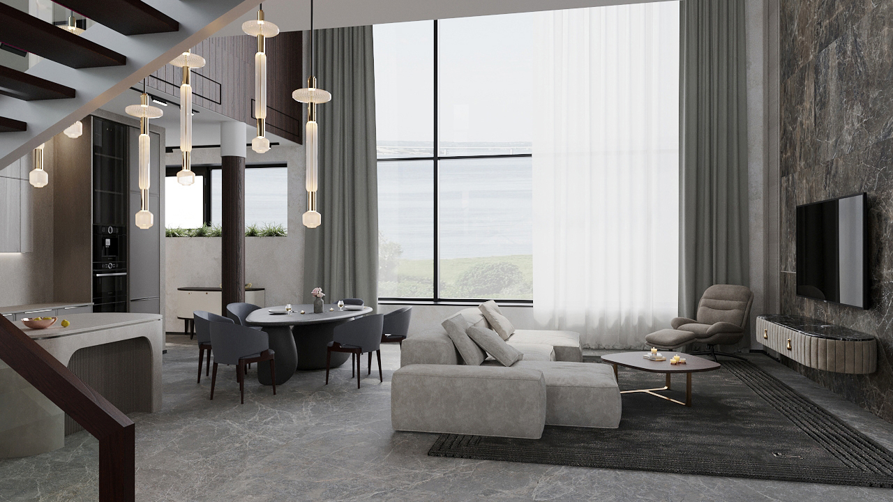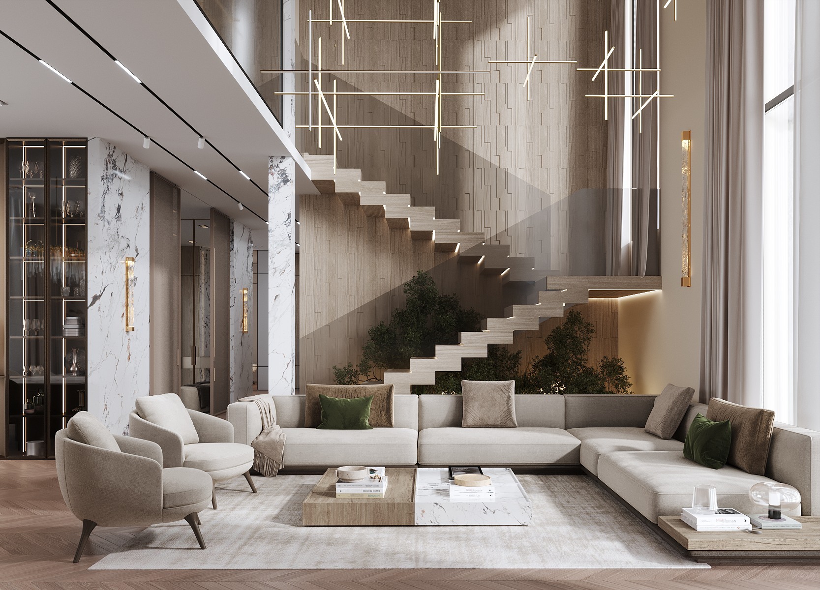 Этот интерьер воплощает современное понимание роскоши — не через избыток декора, а благодаря безупречным пропорциям, качеству материалов и продуманному пространству. Нейтральная палитра в оттенках белого, бежевого и серого создает ощущение чистоты и простора, а теплые древесные акценты добавляют интерьеру глубины и тактильного тепла. Большие окна наполняют помещения естественным светом, стирая границы между внутренним пространством и окружающей природой.