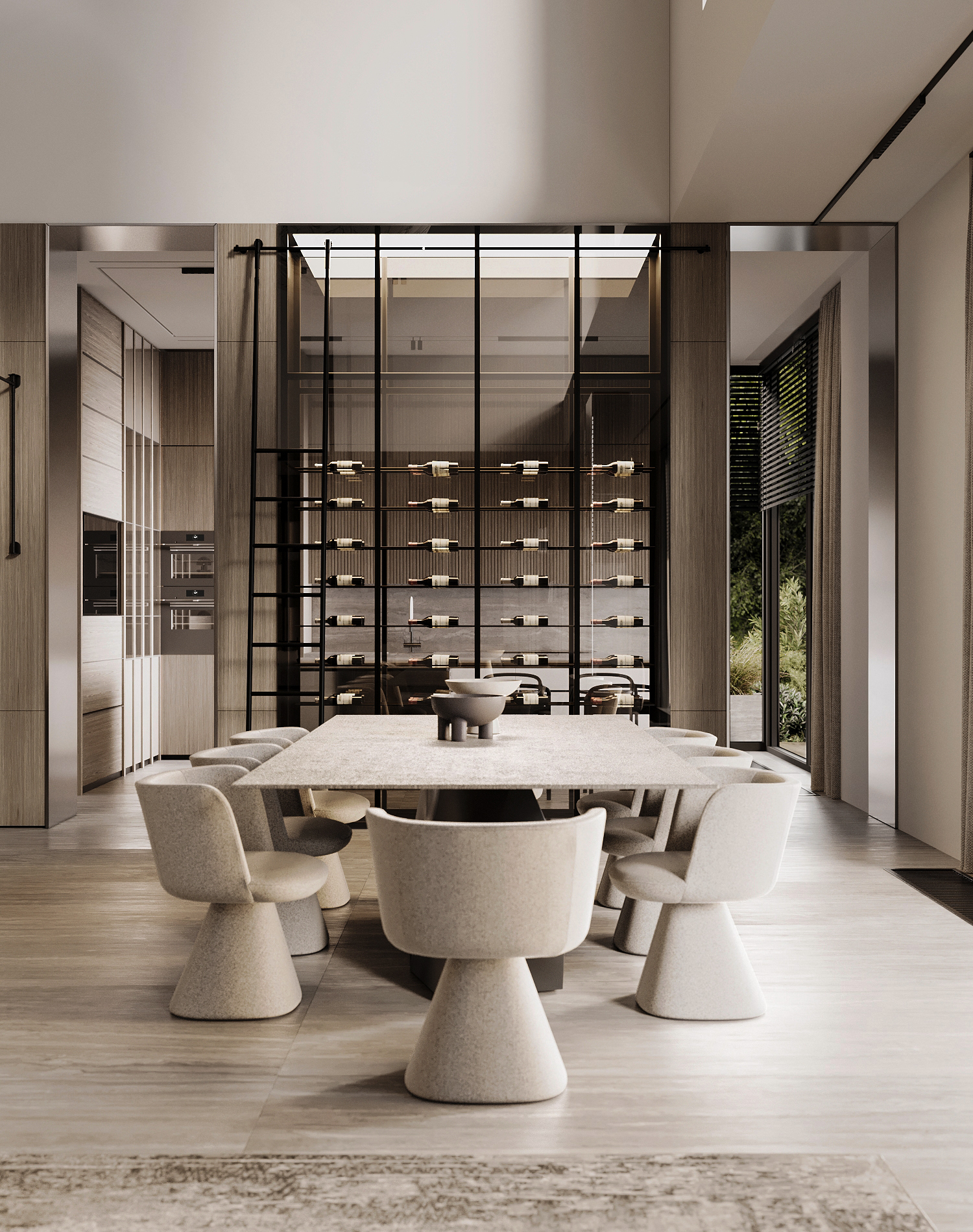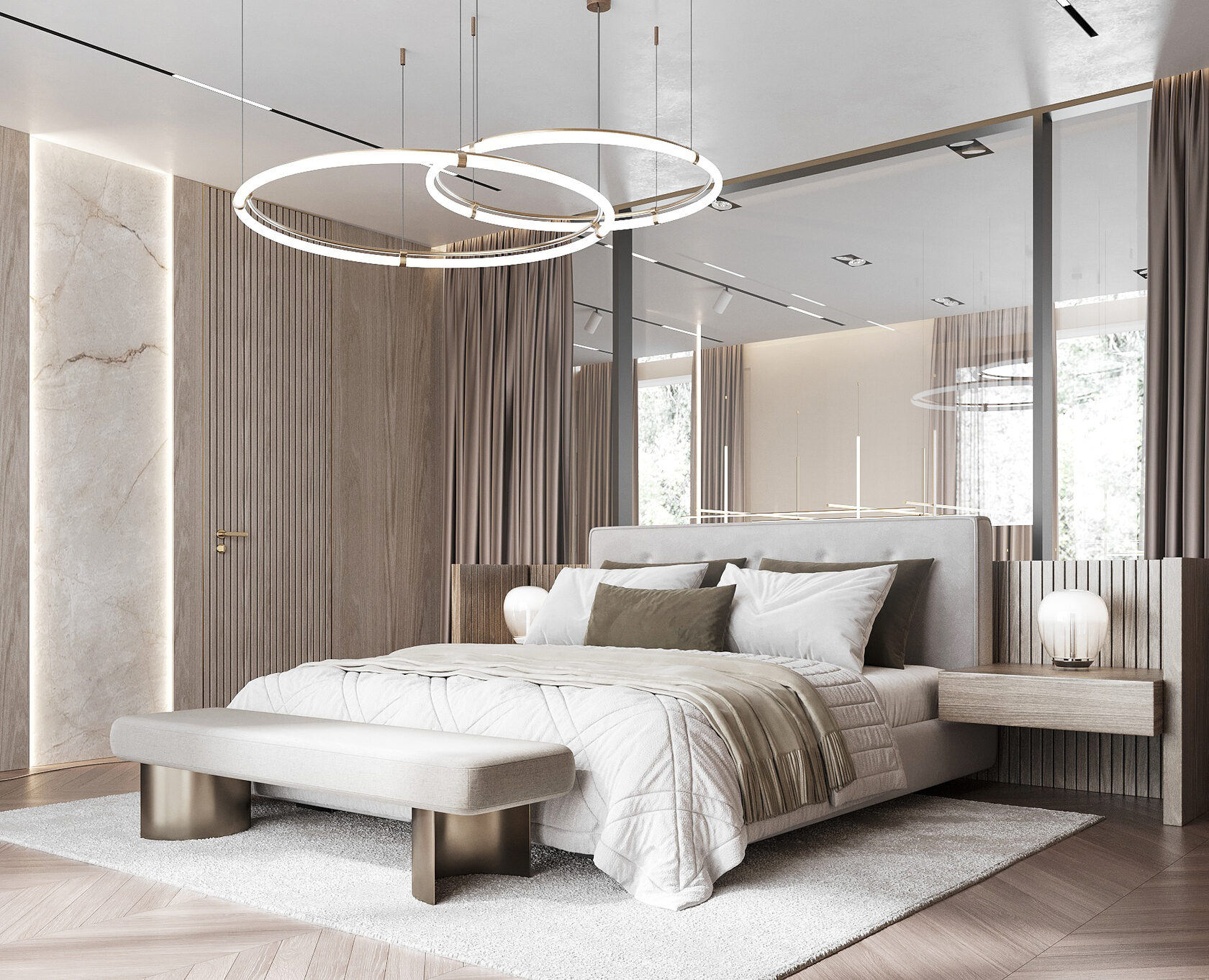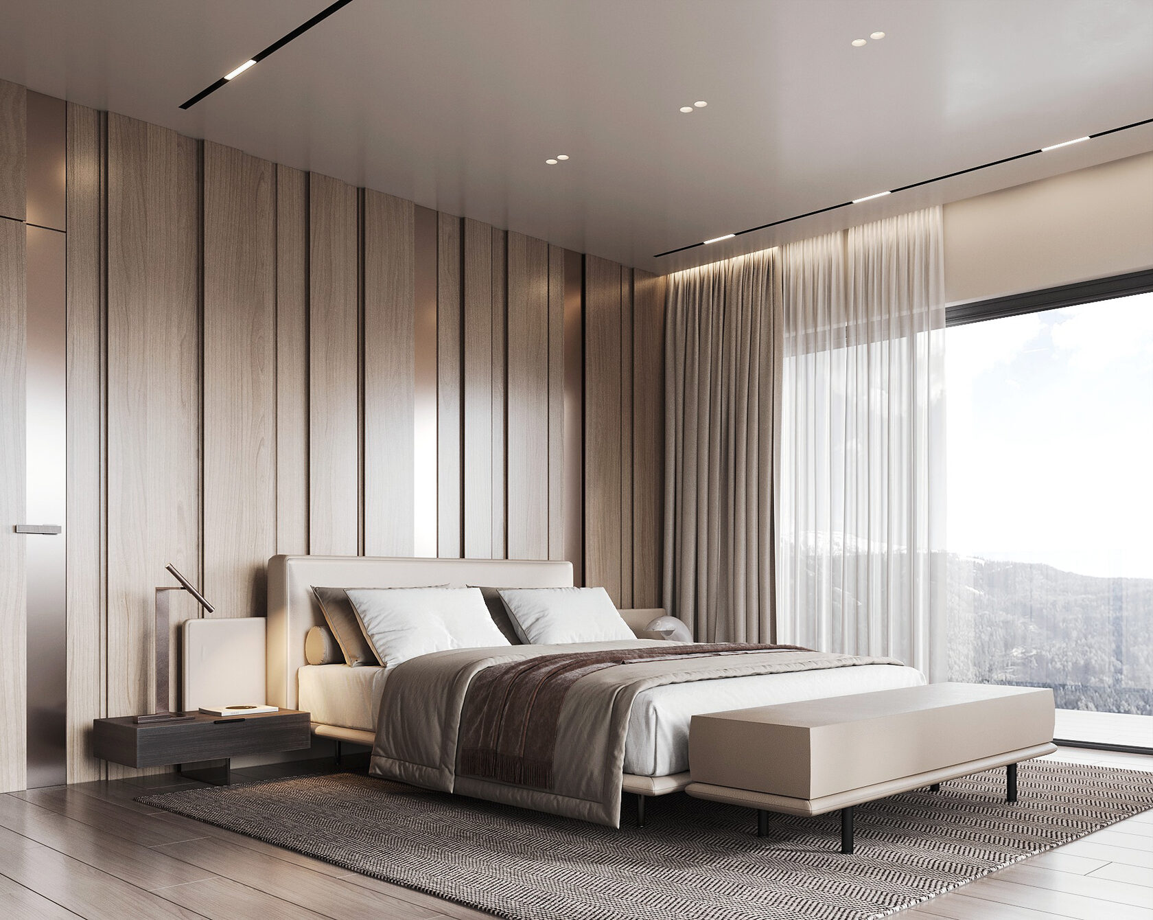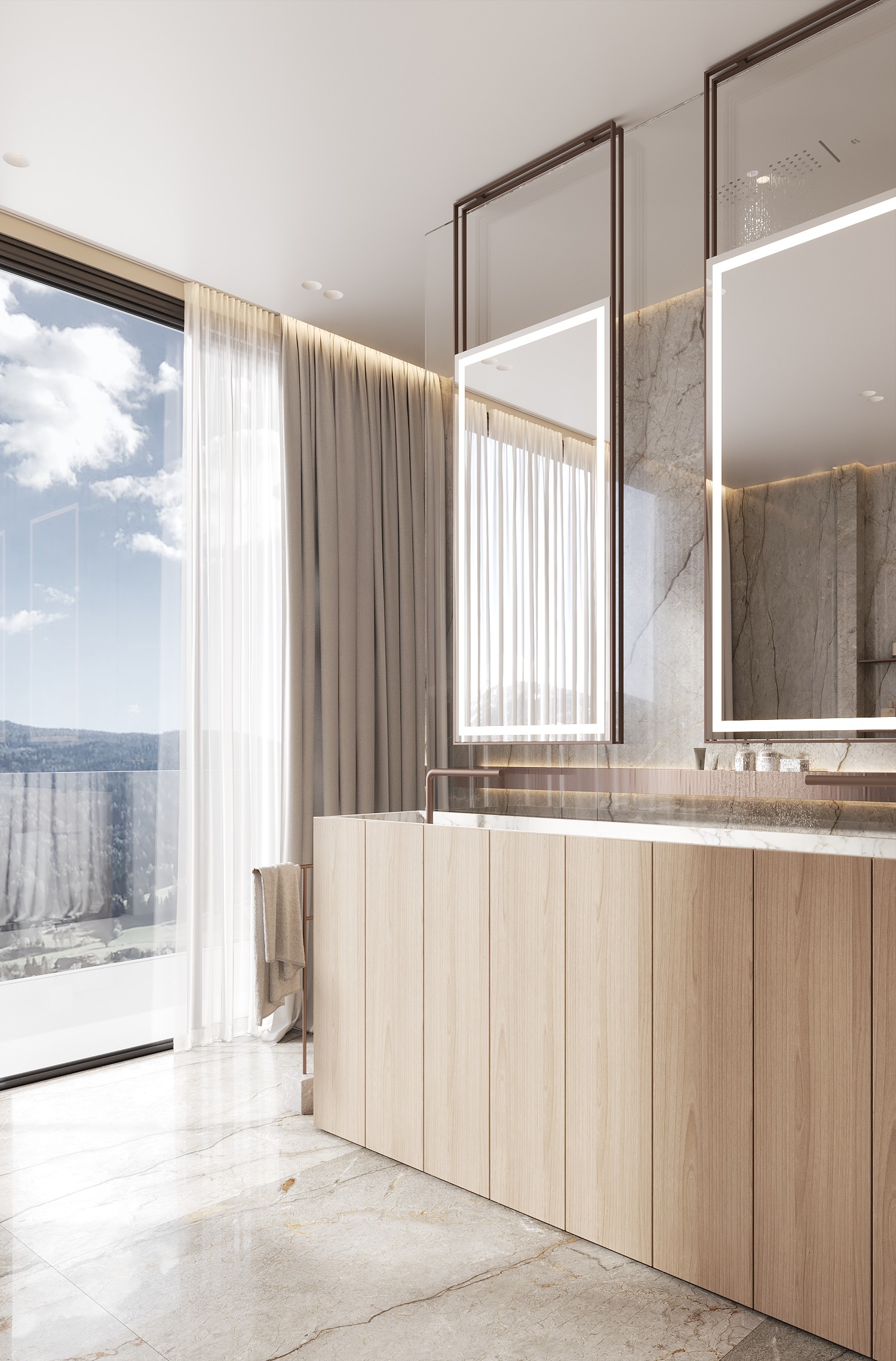 Этот интерьер воплощает современное понимание роскоши — не через избыток декора, а благодаря безупречным пропорциям, качеству материалов и продуманному пространству. Нейтральная палитра в оттенках белого, бежевого и серого создает ощущение чистоты и простора, а теплые древесные акценты добавляют интерьеру глубины и тактильного тепла. Большие окна наполняют помещения естественным светом, стирая границы между внутренним пространством и окружающей природой.