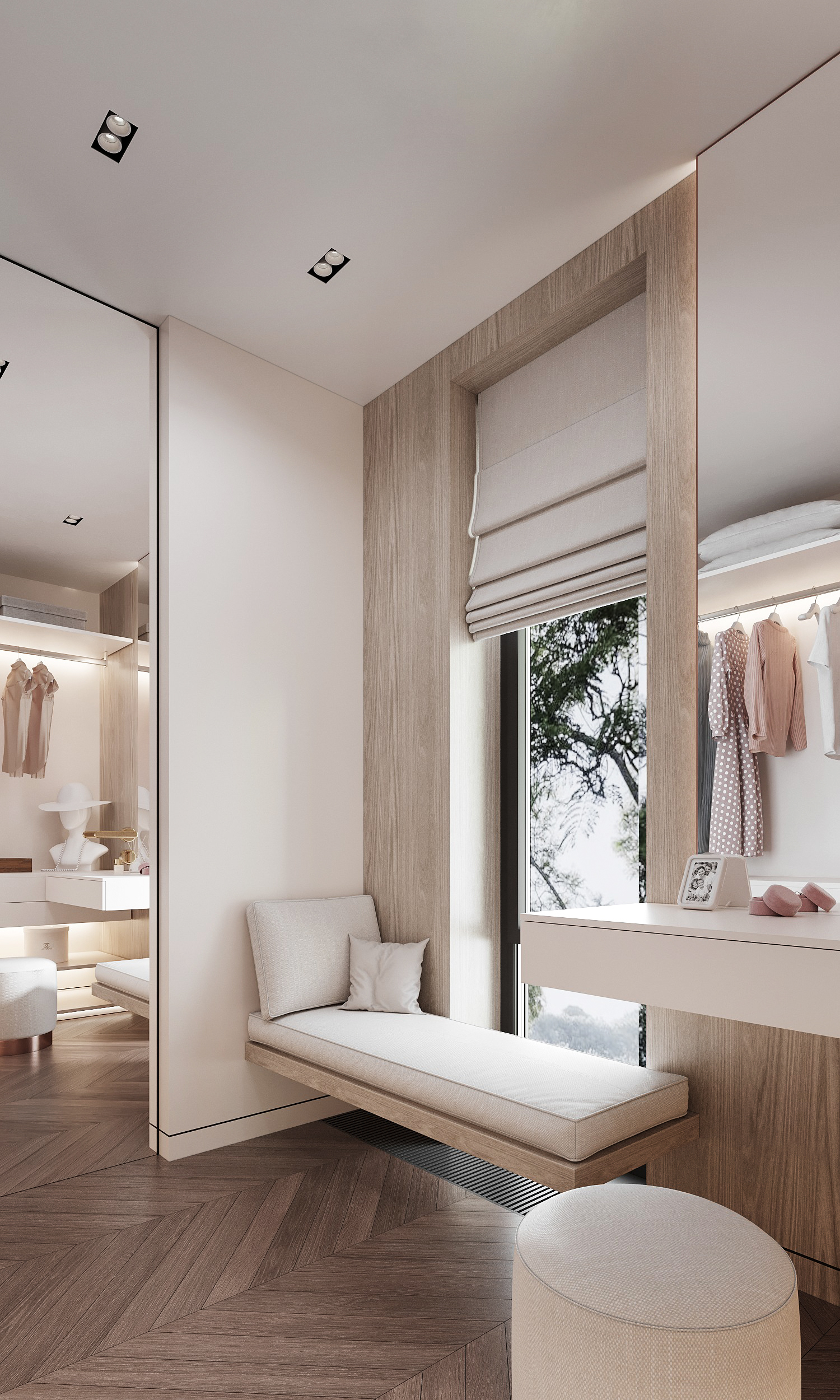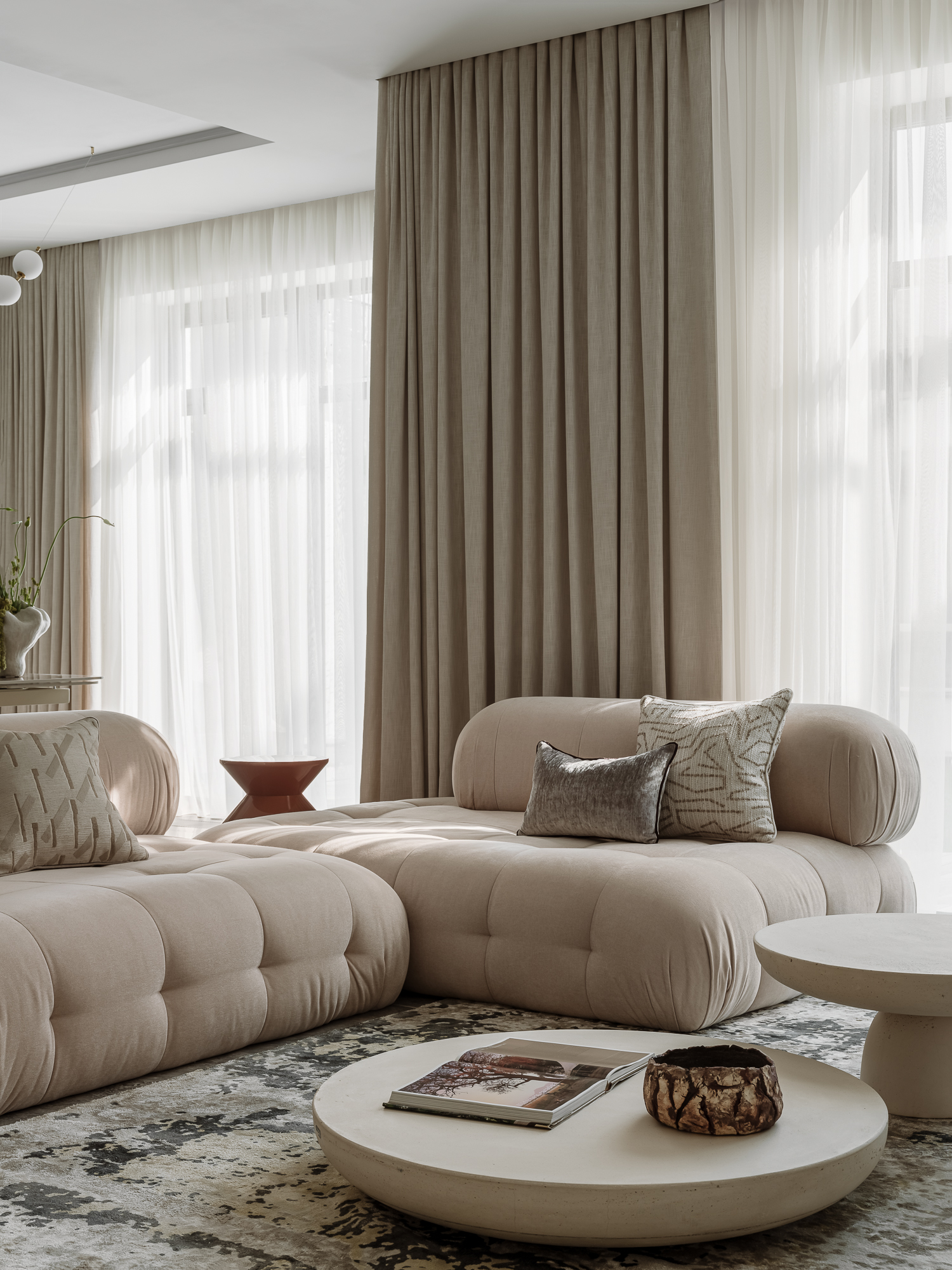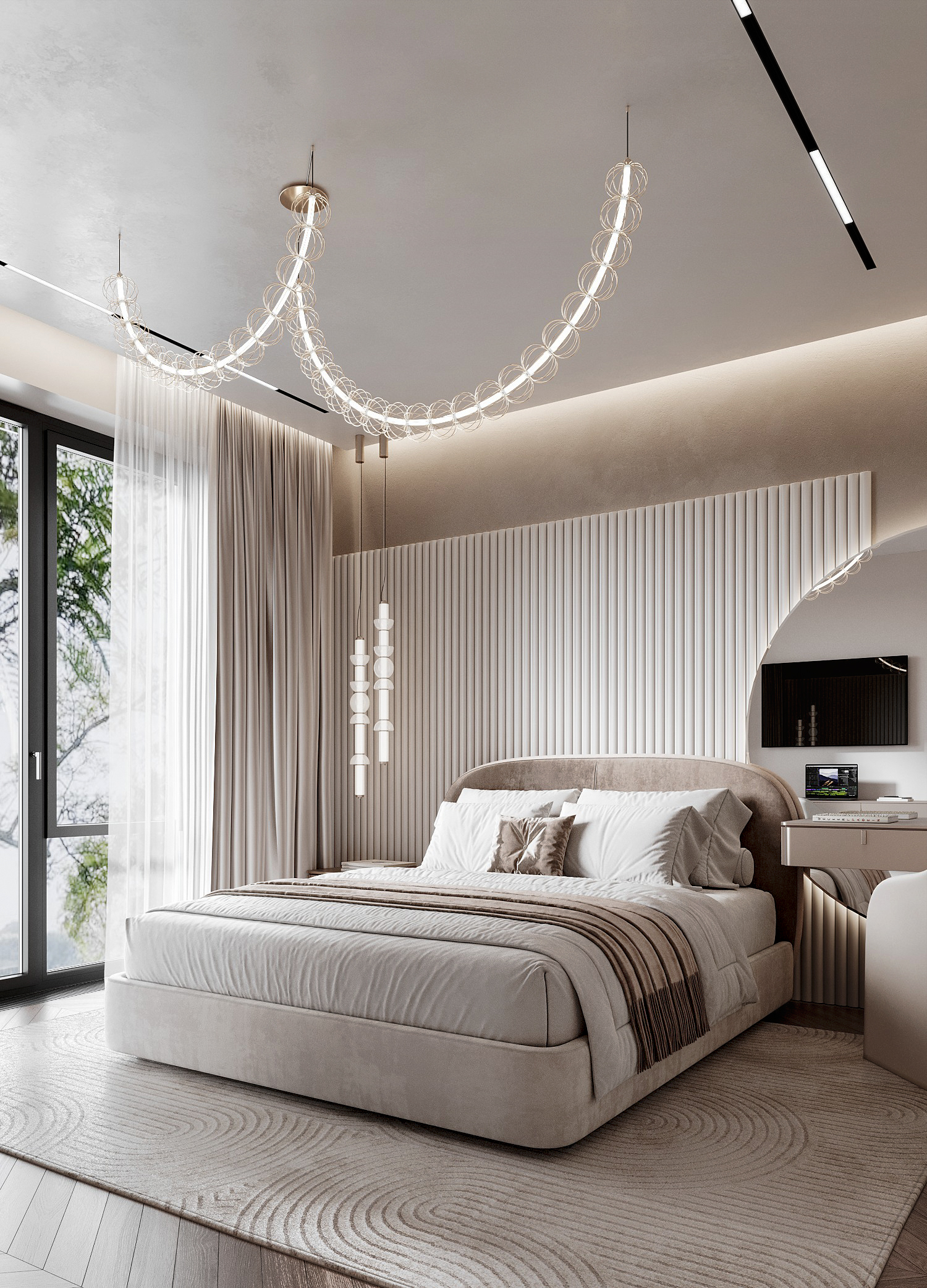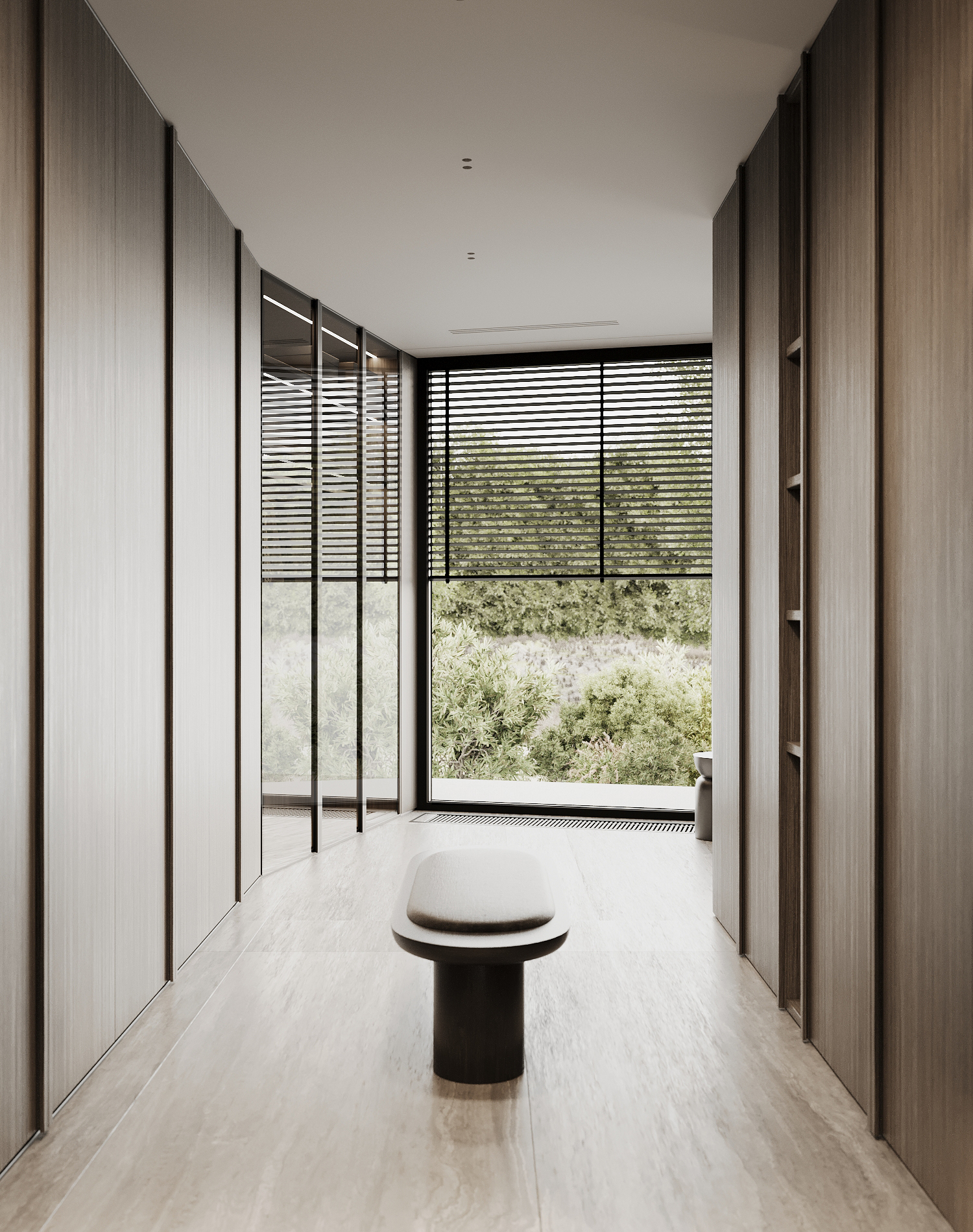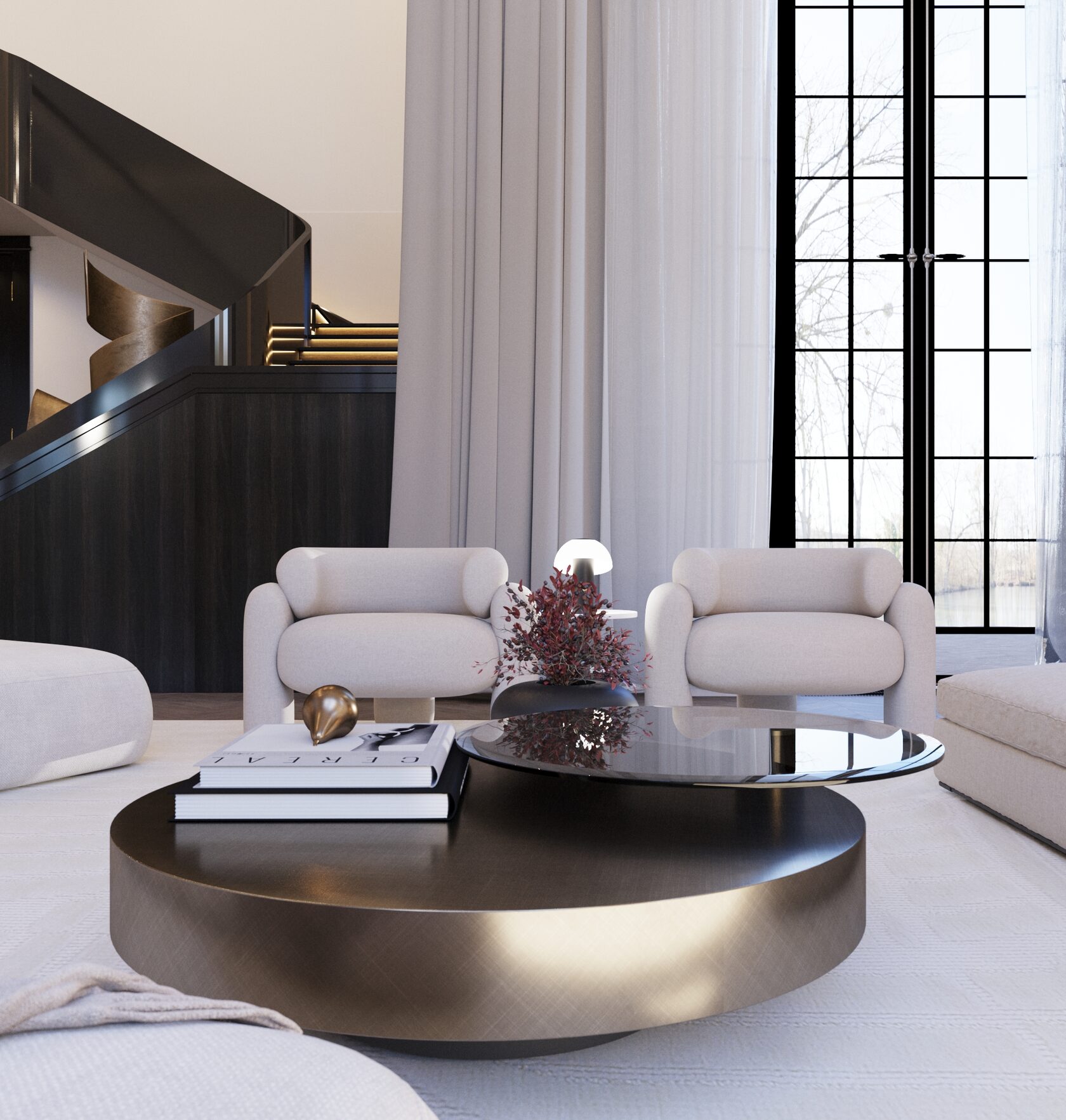 Этот интерьер воплощает современное понимание роскоши — не через избыток декора, а благодаря безупречным пропорциям, качеству материалов и продуманному пространству. Нейтральная палитра в оттенках белого, бежевого и серого создает ощущение чистоты и простора, а теплые древесные акценты добавляют интерьеру глубины и тактильного тепла. Большие окна наполняют помещения естественным светом, стирая границы между внутренним пространством и окружающей природой.