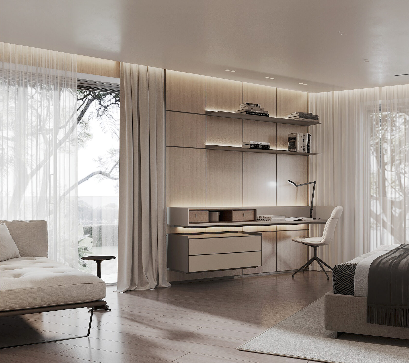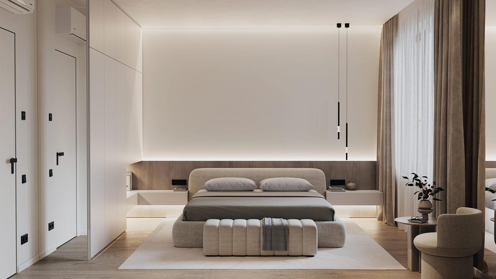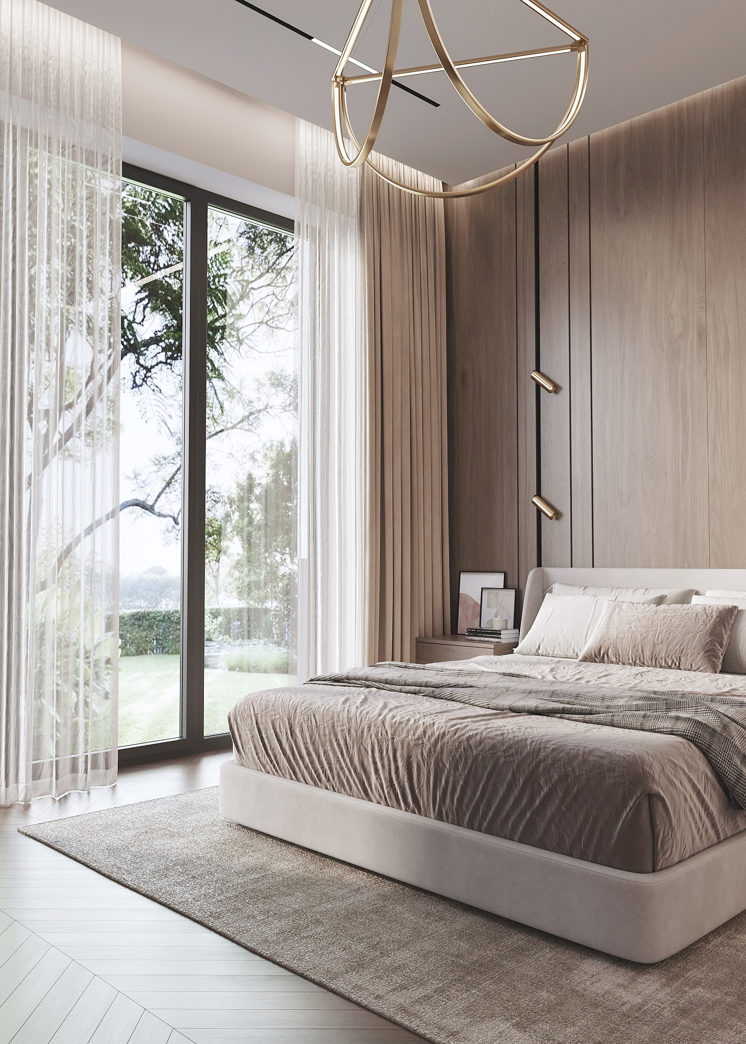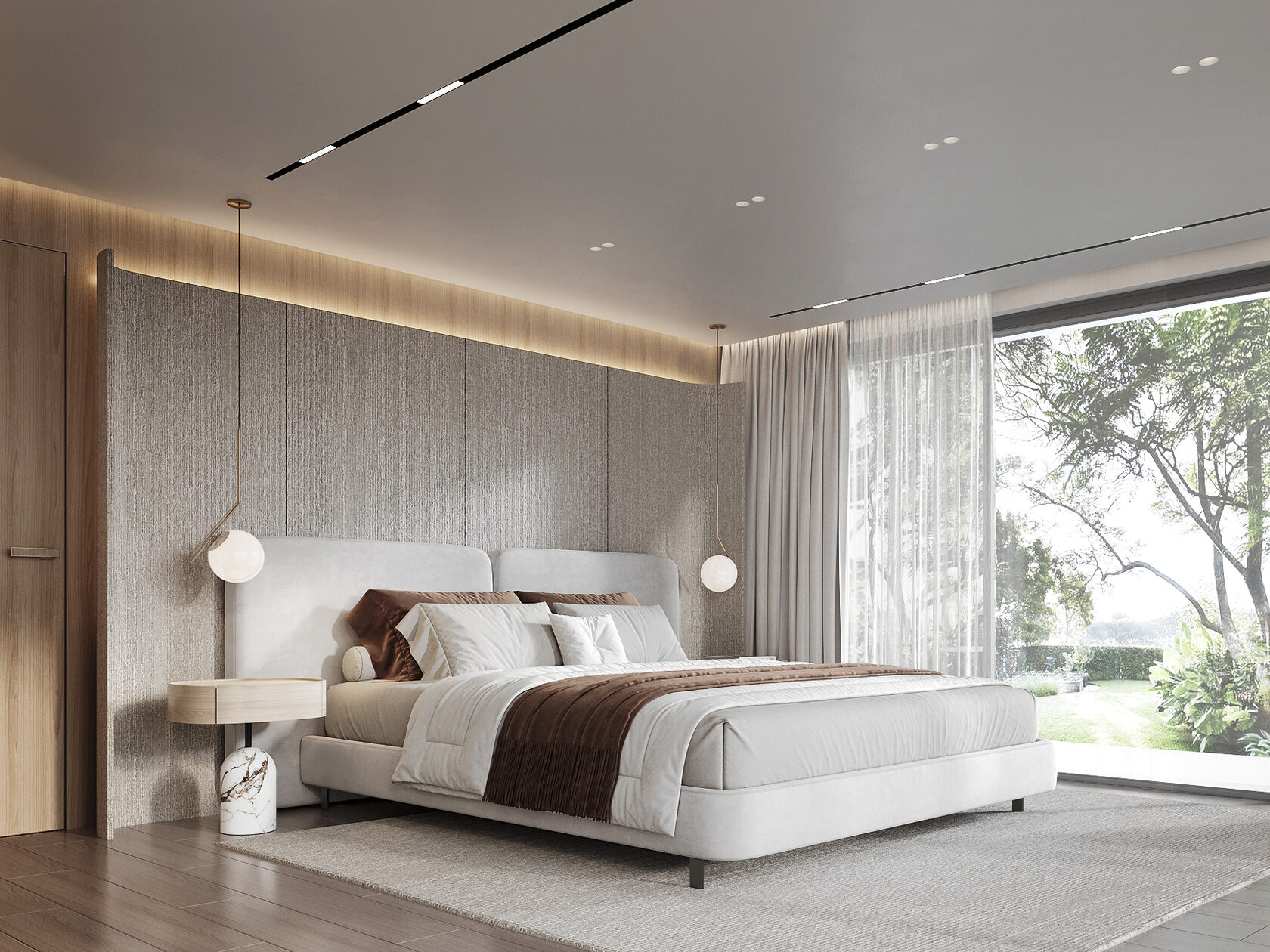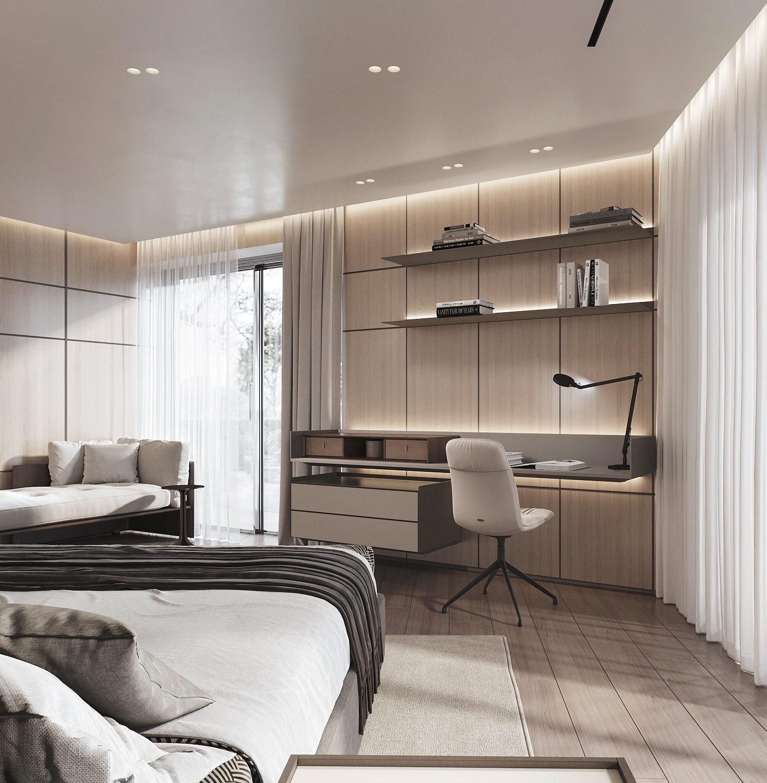 Этот интерьер воплощает современное понимание роскоши — не через избыток декора, а благодаря безупречным пропорциям, качеству материалов и продуманному пространству. Нейтральная палитра в оттенках белого, бежевого и серого создает ощущение чистоты и простора, а теплые древесные акценты добавляют интерьеру глубины и тактильного тепла. Большие окна наполняют помещения естественным светом, стирая границы между внутренним пространством и окружающей природой.