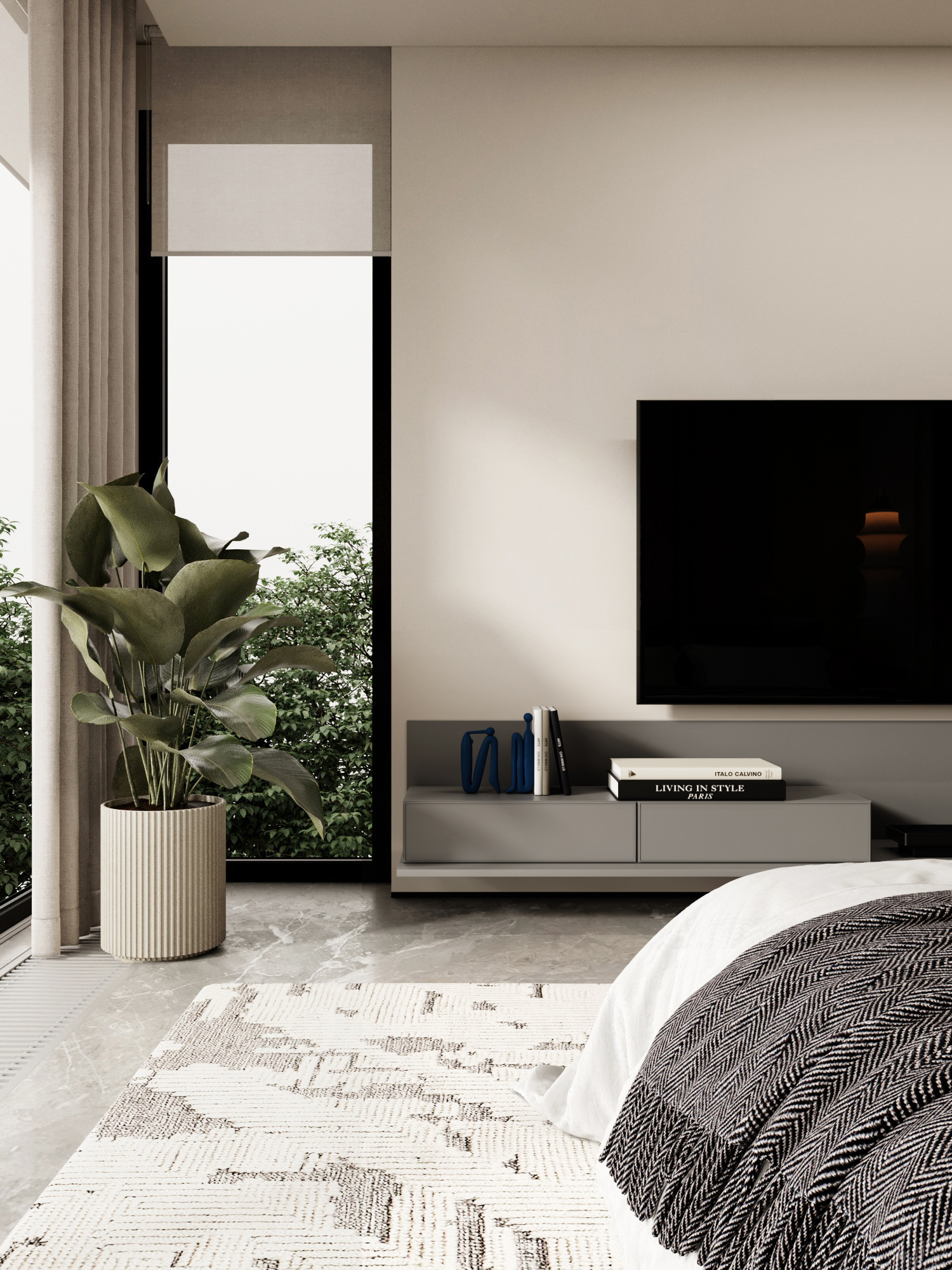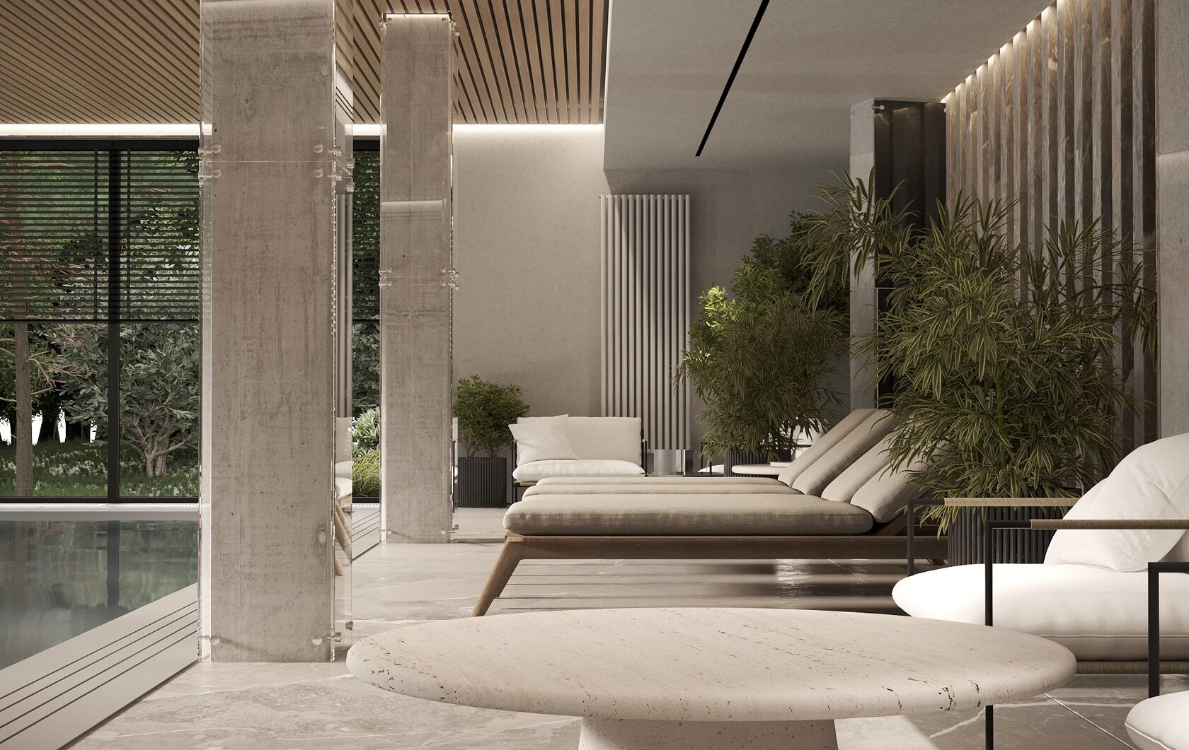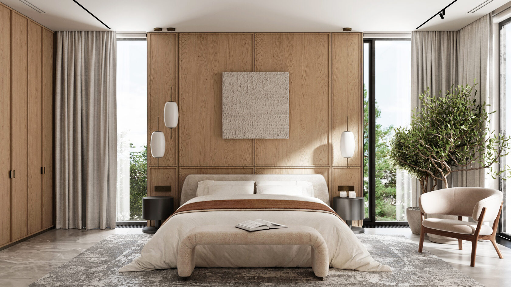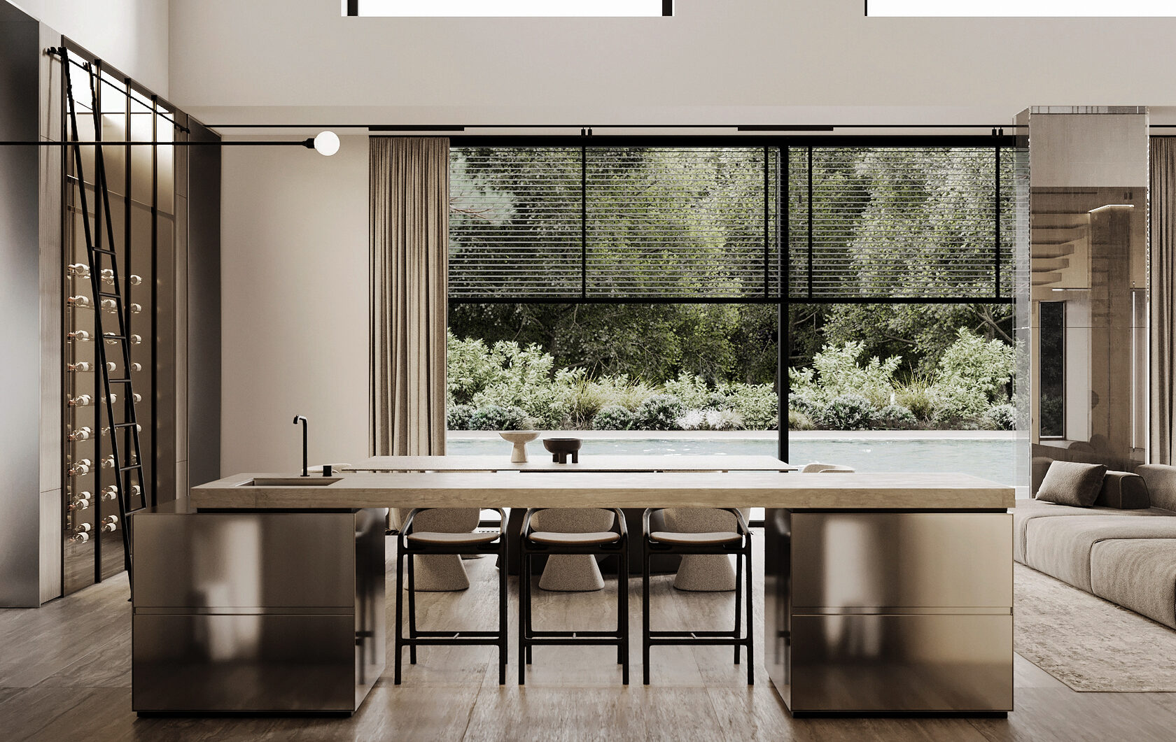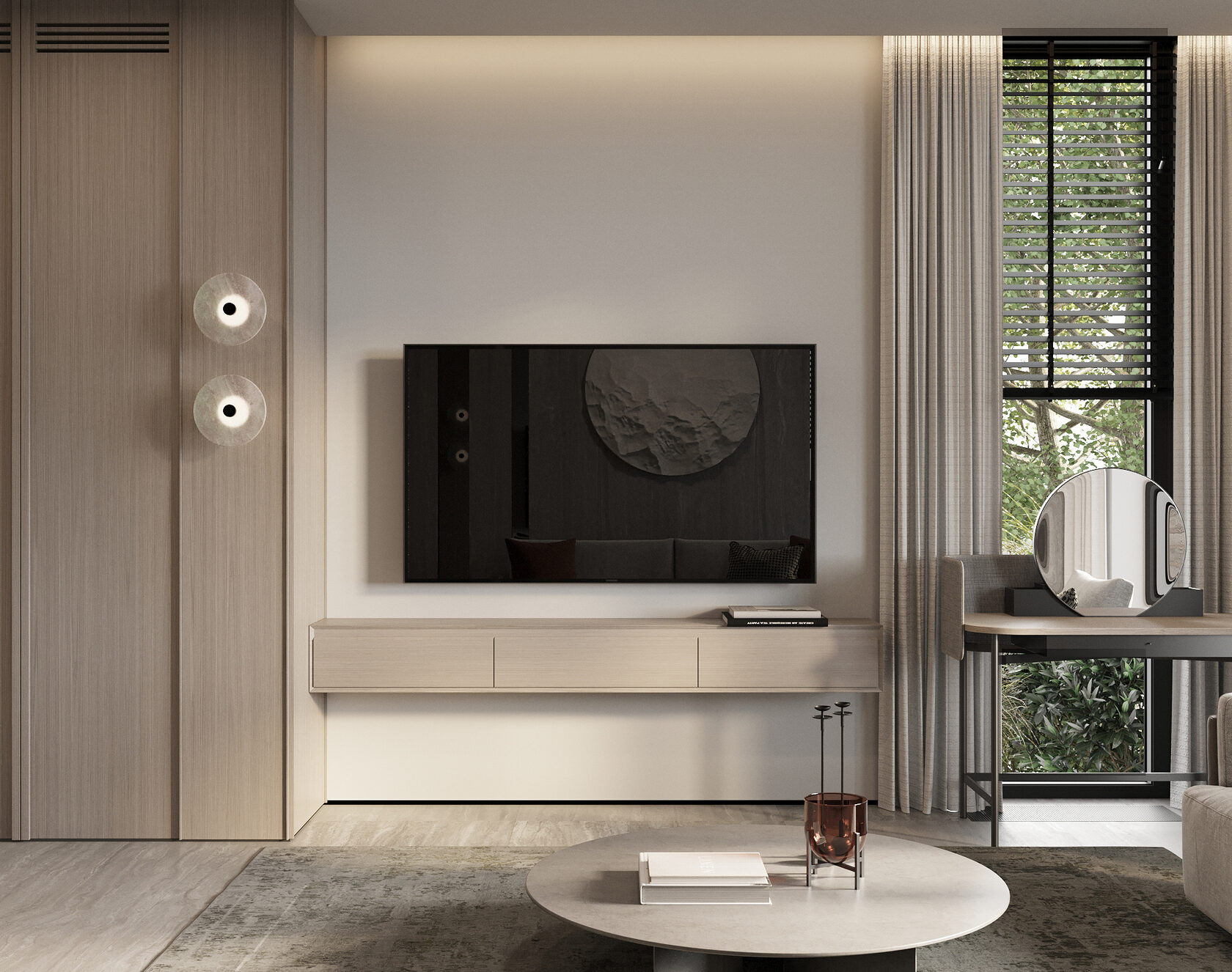 Этот интерьер воплощает современное понимание роскоши — не через избыток декора, а благодаря безупречным пропорциям, качеству материалов и продуманному пространству. Нейтральная палитра в оттенках белого, бежевого и серого создает ощущение чистоты и простора, а теплые древесные акценты добавляют интерьеру глубины и тактильного тепла. Большие окна наполняют помещения естественным светом, стирая границы между внутренним пространством и окружающей природой.