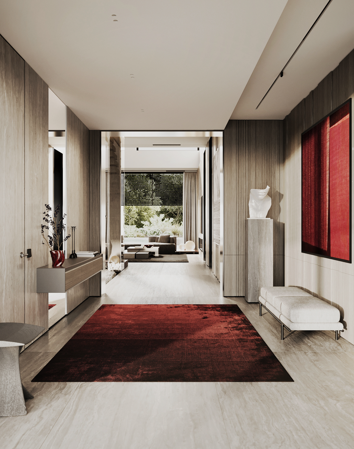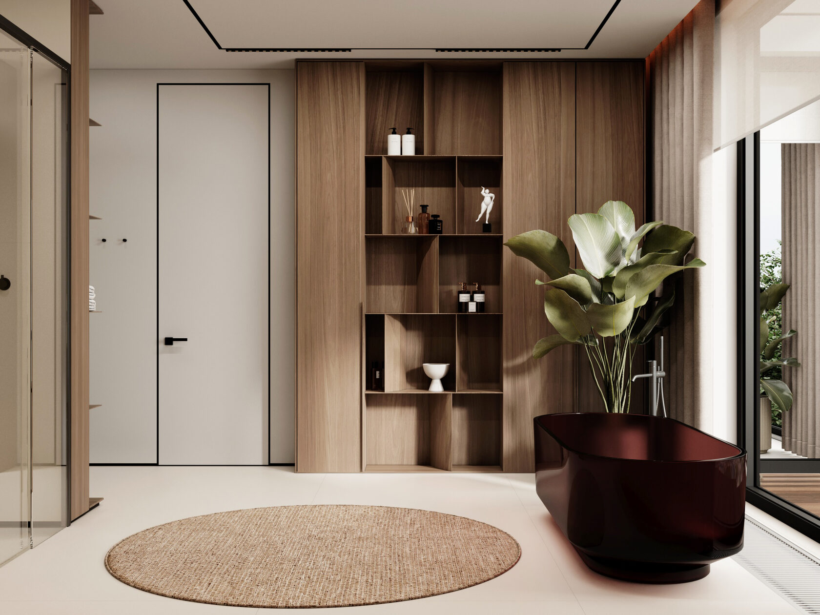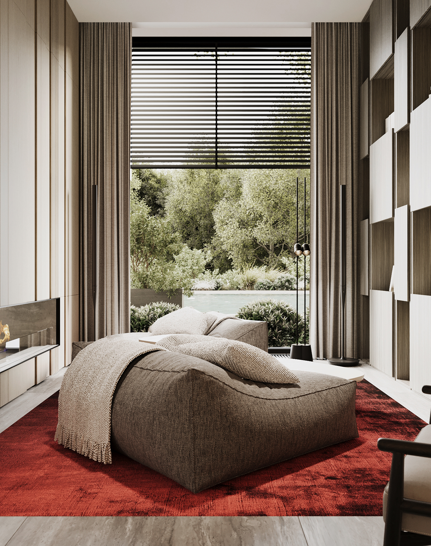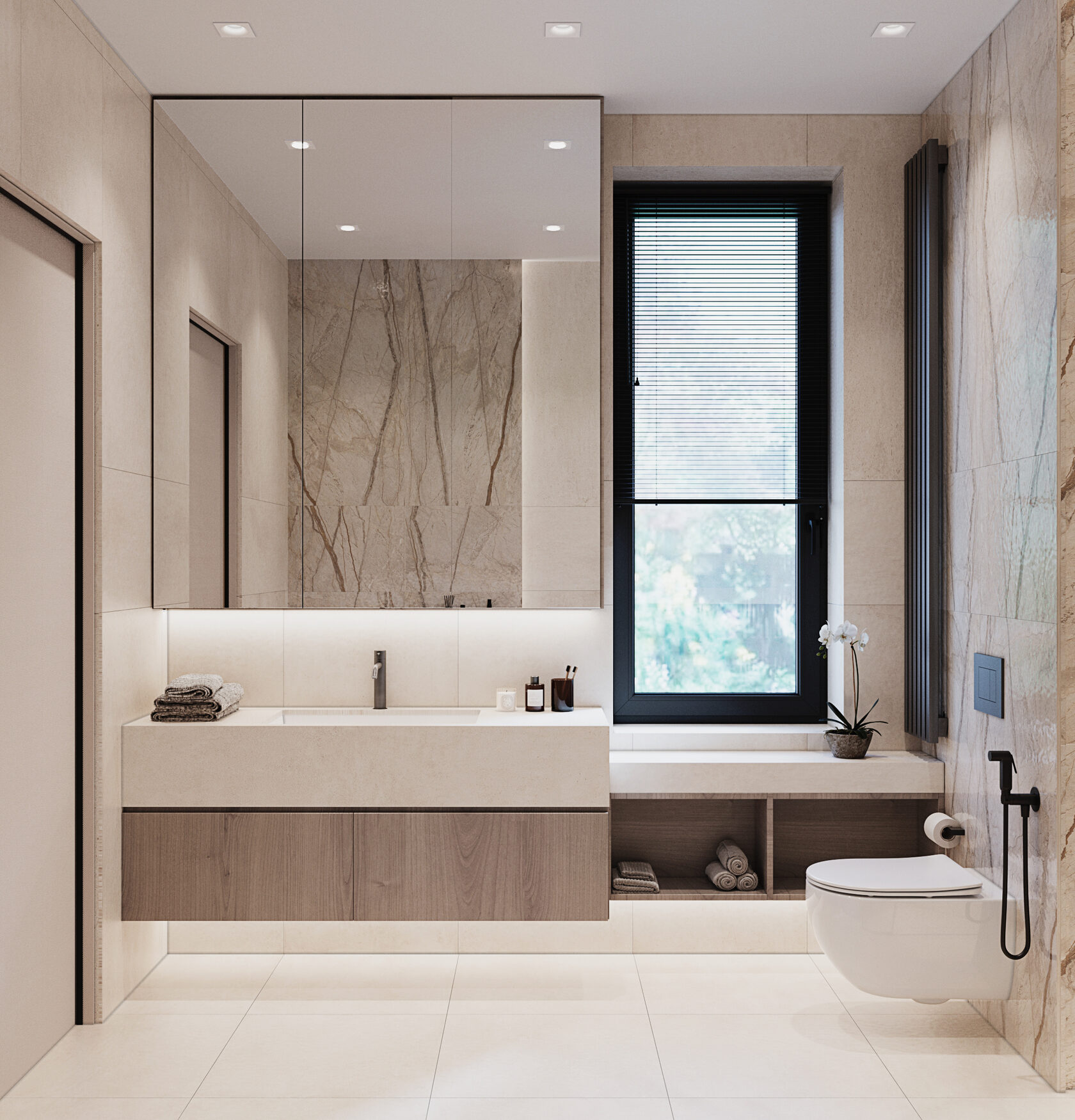 Этот интерьер воплощает современное понимание роскоши — не через избыток декора, а благодаря безупречным пропорциям, качеству материалов и продуманному пространству. Нейтральная палитра в оттенках белого, бежевого и серого создает ощущение чистоты и простора, а теплые древесные акценты добавляют интерьеру глубины и тактильного тепла. Большие окна наполняют помещения естественным светом, стирая границы между внутренним пространством и окружающей природой.