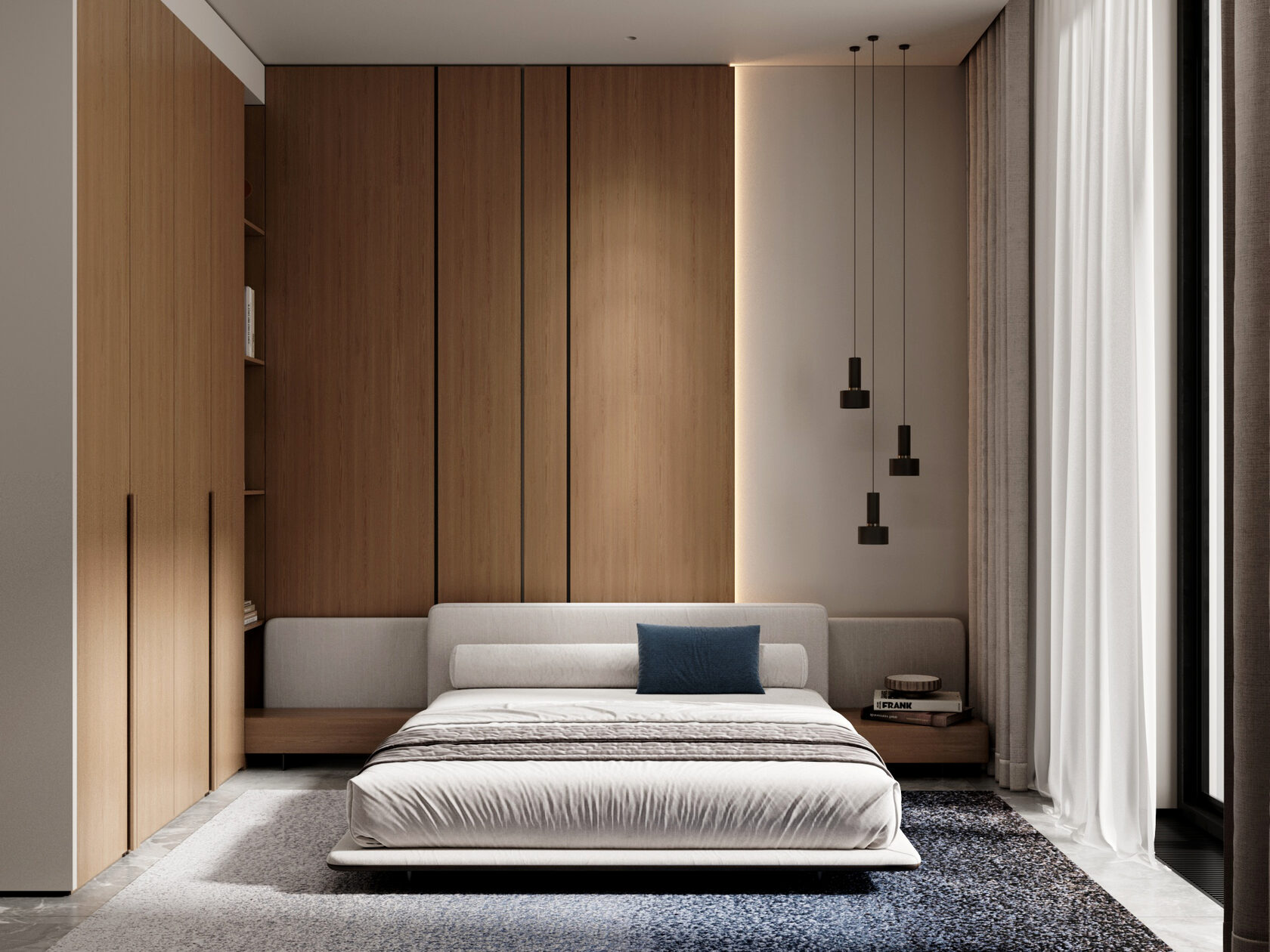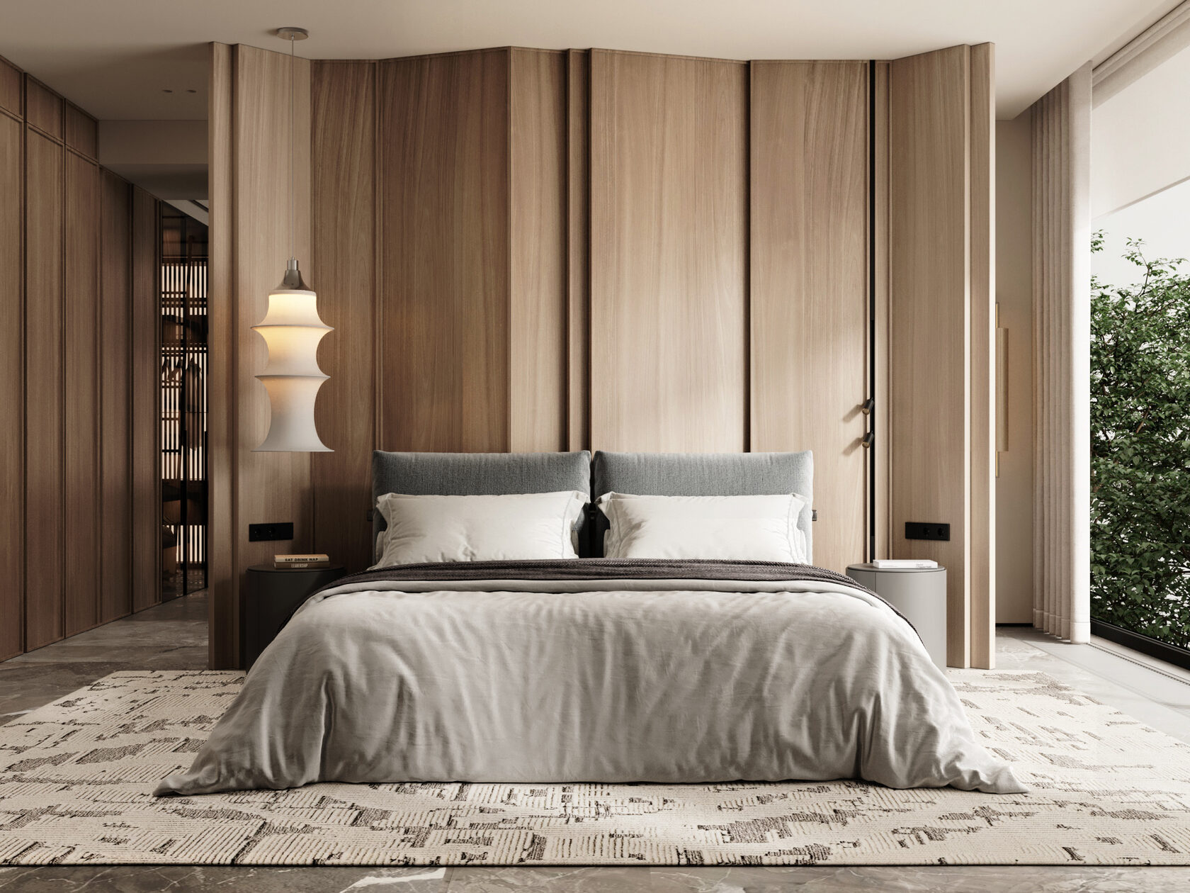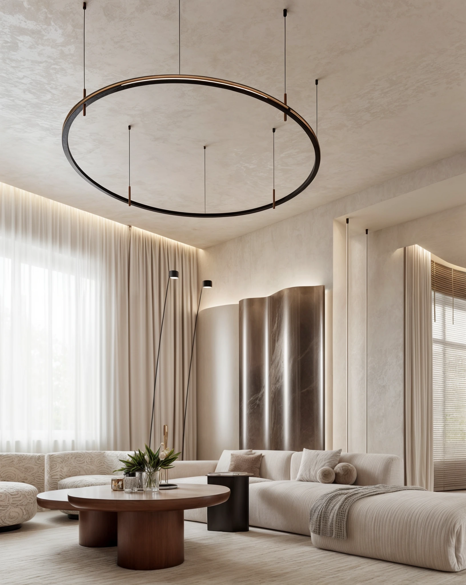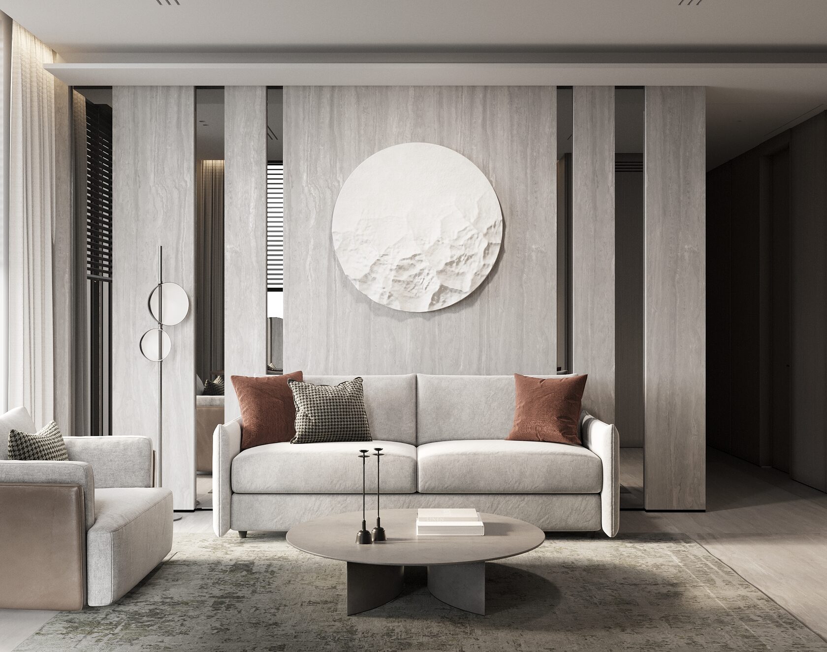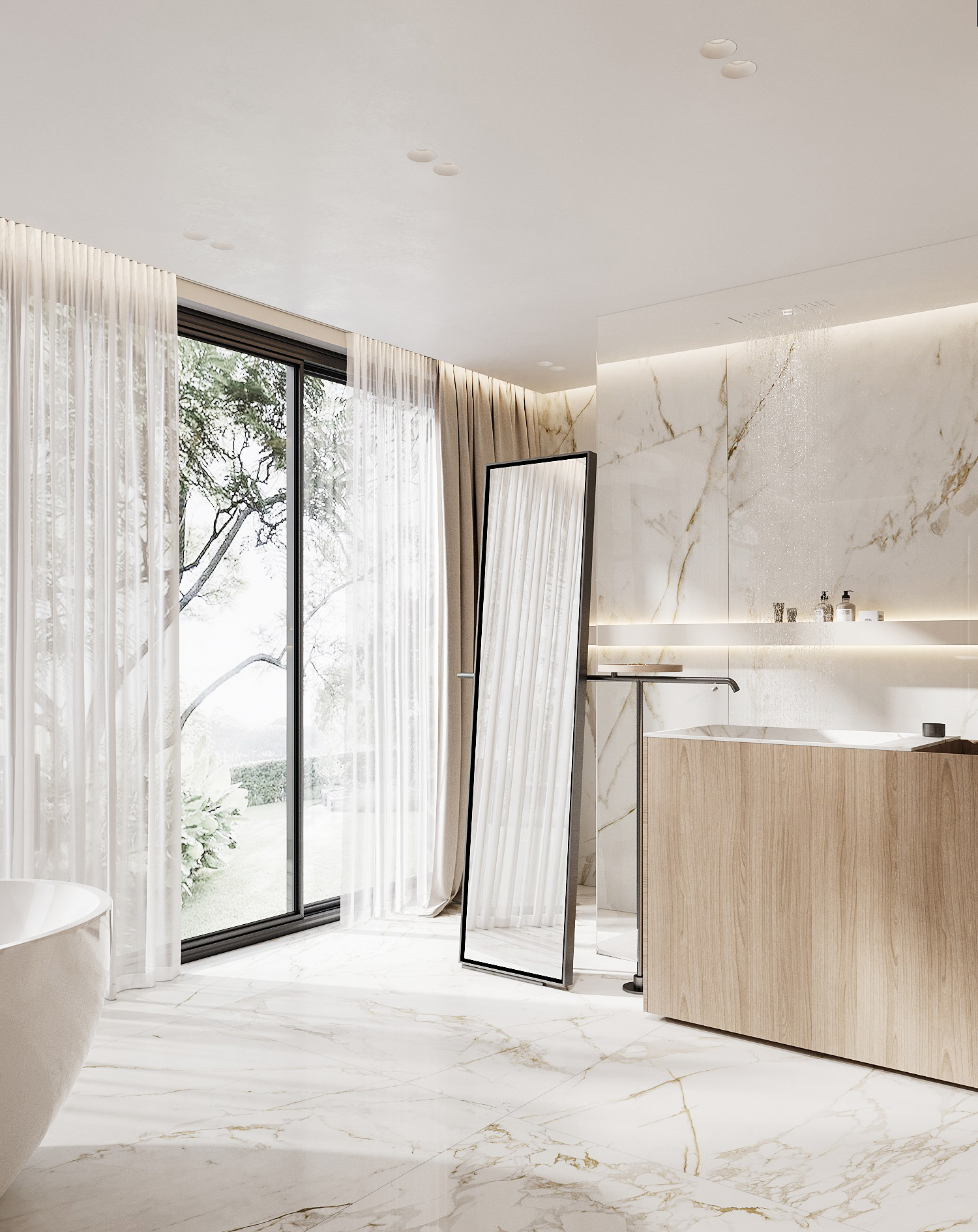 Этот интерьер воплощает современное понимание роскоши — не через избыток декора, а благодаря безупречным пропорциям, качеству материалов и продуманному пространству. Нейтральная палитра в оттенках белого, бежевого и серого создает ощущение чистоты и простора, а теплые древесные акценты добавляют интерьеру глубины и тактильного тепла. Большие окна наполняют помещения естественным светом, стирая границы между внутренним пространством и окружающей природой.