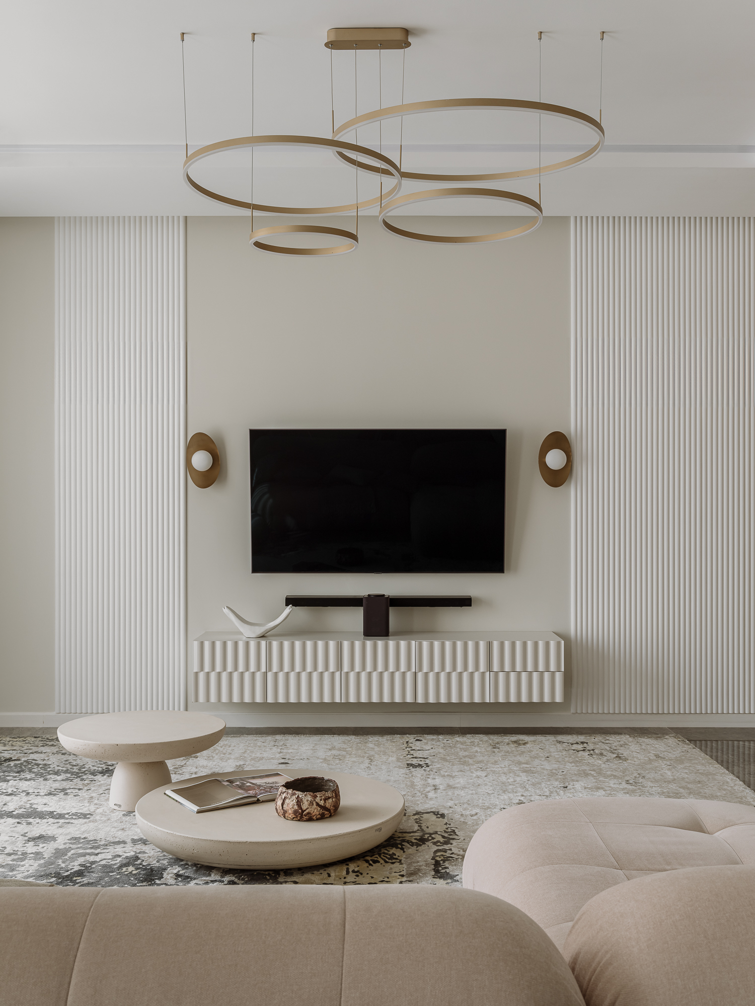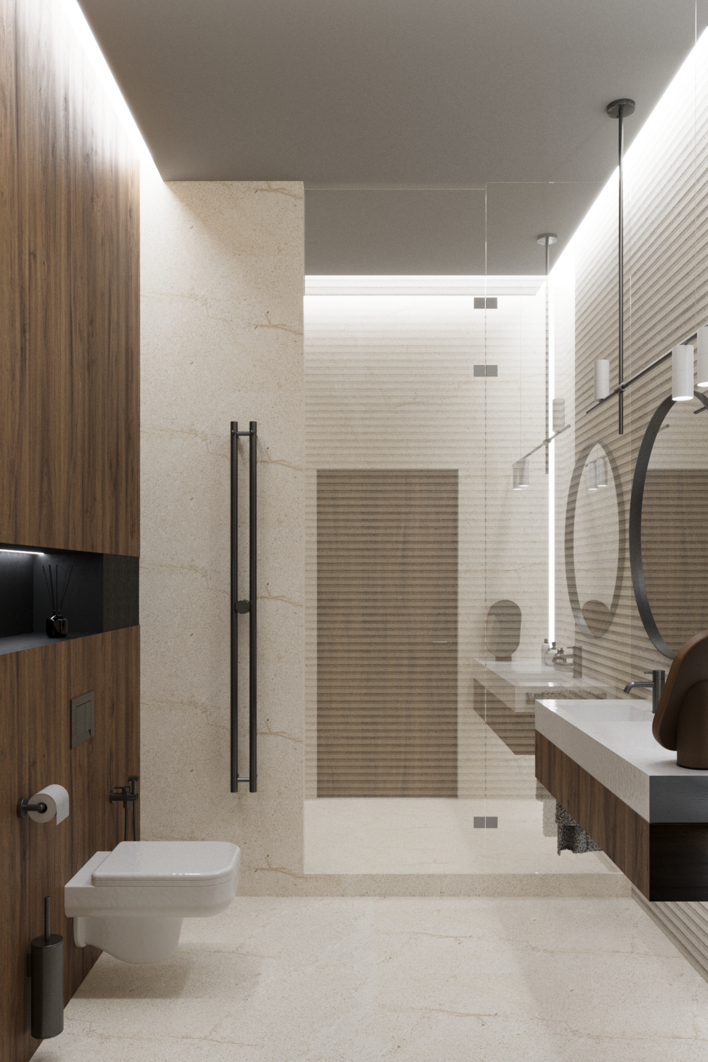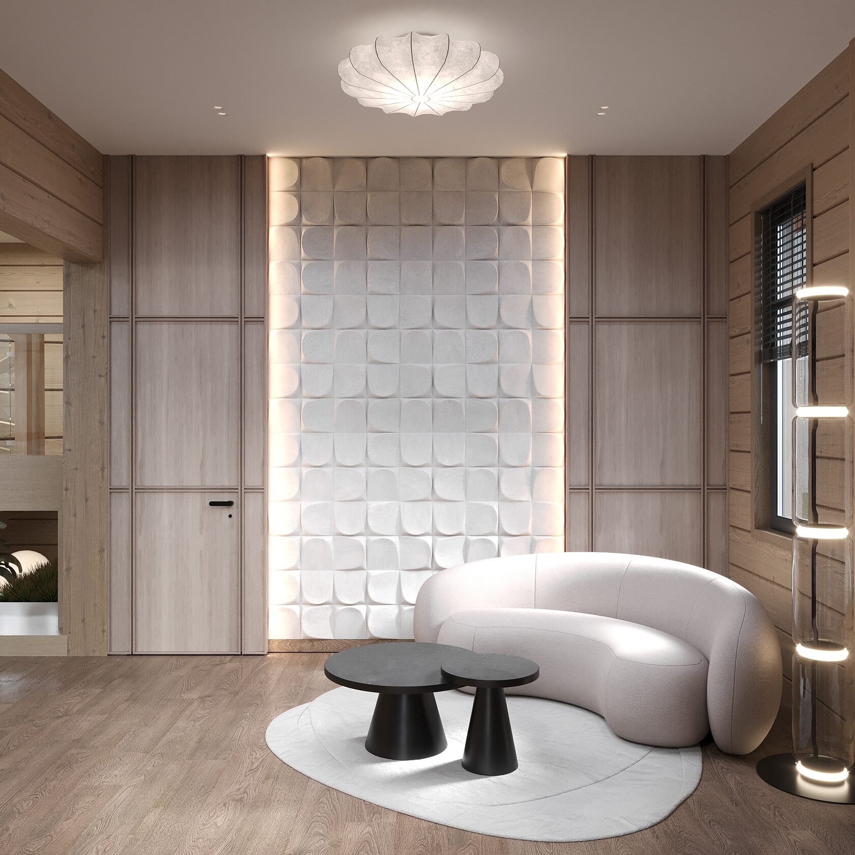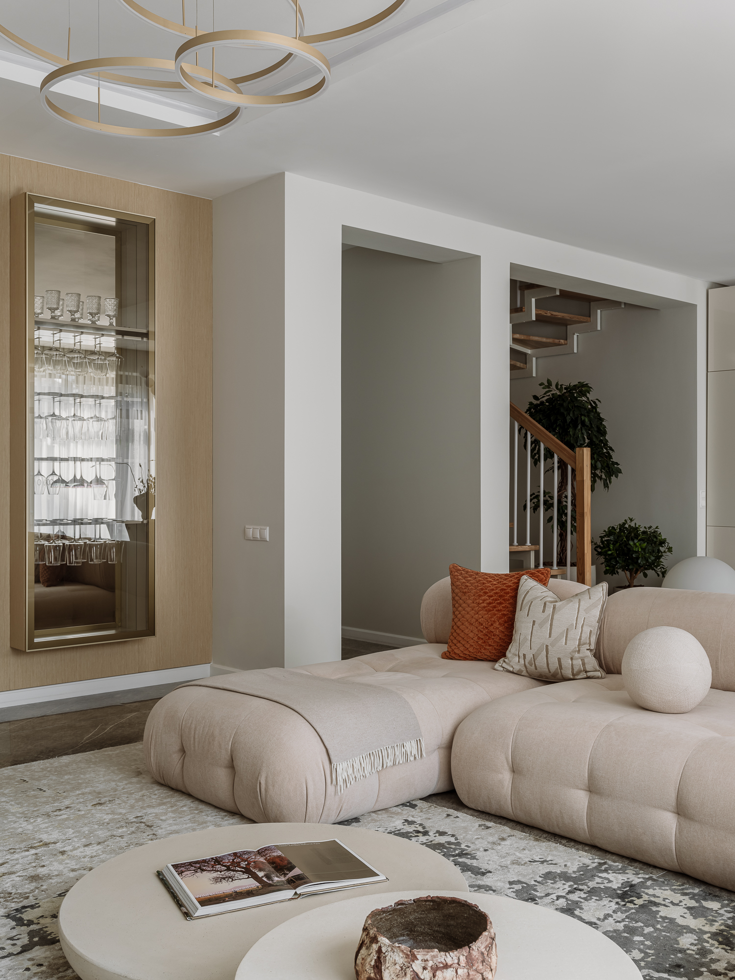 Концепция: В основе проекта лежит стремление создать интерьер, который был бы одновременно уютным, семейным, стильным и универсальным, что нашло свое воплощение в авторском стиле студии VPROEKTE – Nature. Дизайн базируется на принципах симметрии, применении натуральных материалов, таких как шпон дуба, карагача и анегри, многосценарном освещении и эксклюзивном декоре. Эти элементы не только визуально смягчили пространство, но и придали ему тактильную привлекательность и завершенность.