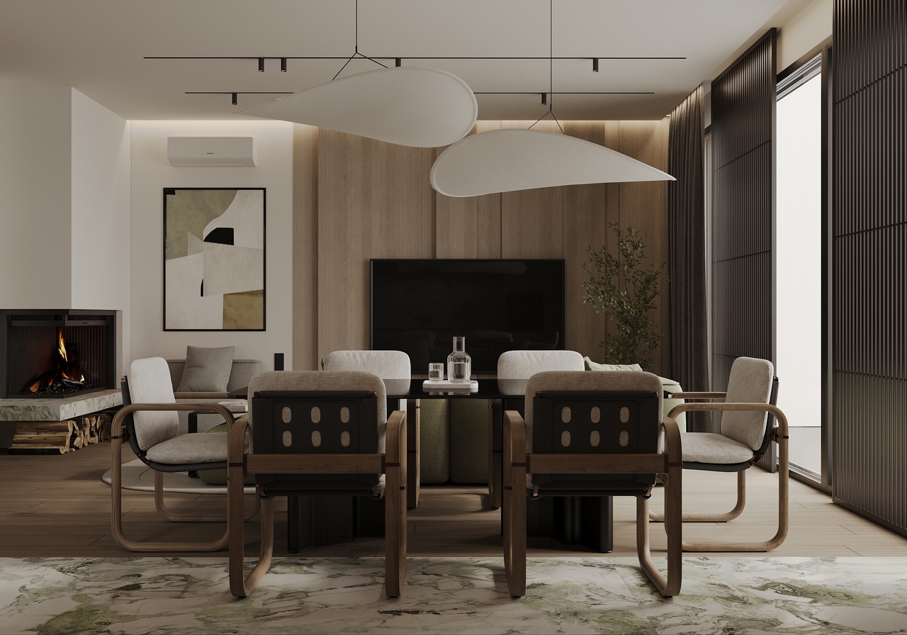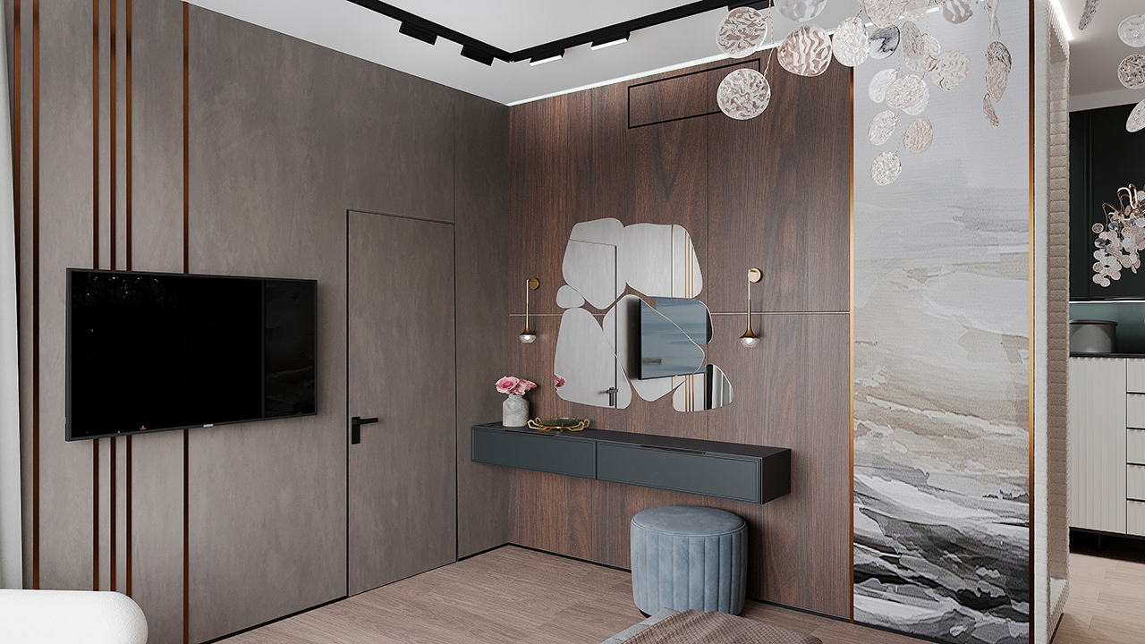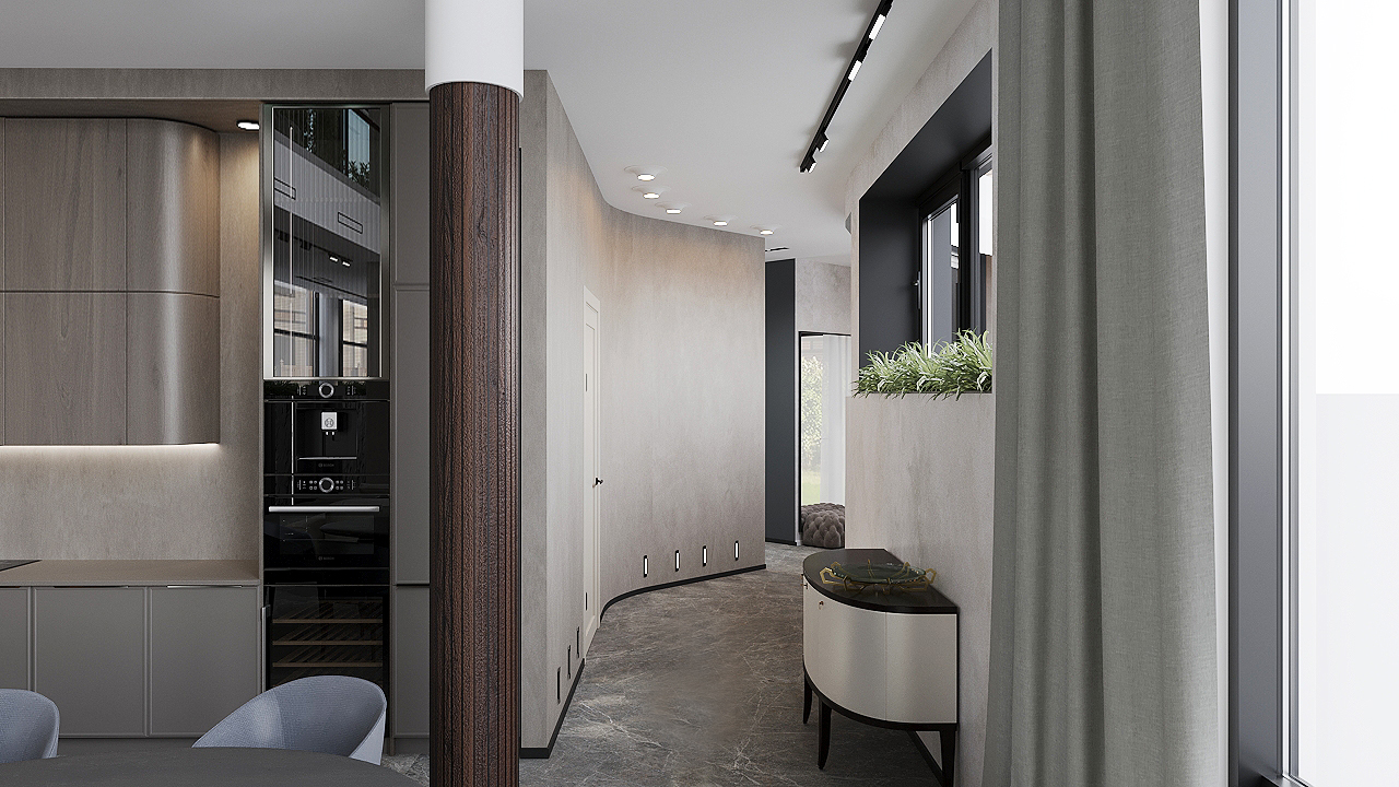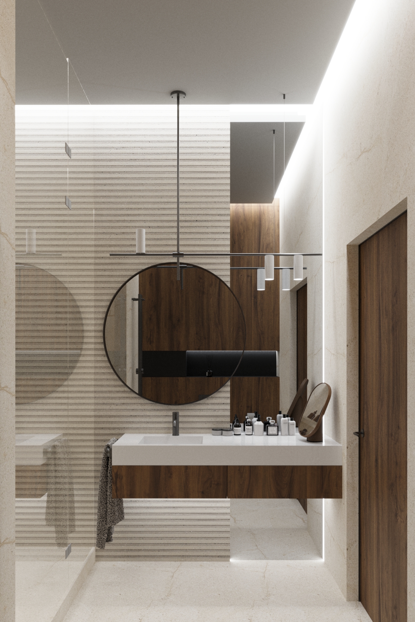 Концепция: В основе проекта лежит стремление создать интерьер, который был бы одновременно уютным, семейным, стильным и универсальным, что нашло свое воплощение в авторском стиле студии VPROEKTE – Nature. Дизайн базируется на принципах симметрии, применении натуральных материалов, таких как шпон дуба, карагача и анегри, многосценарном освещении и эксклюзивном декоре. Эти элементы не только визуально смягчили пространство, но и придали ему тактильную привлекательность и завершенность.