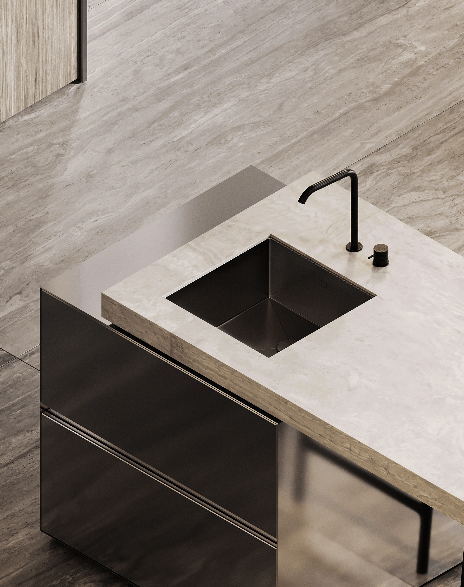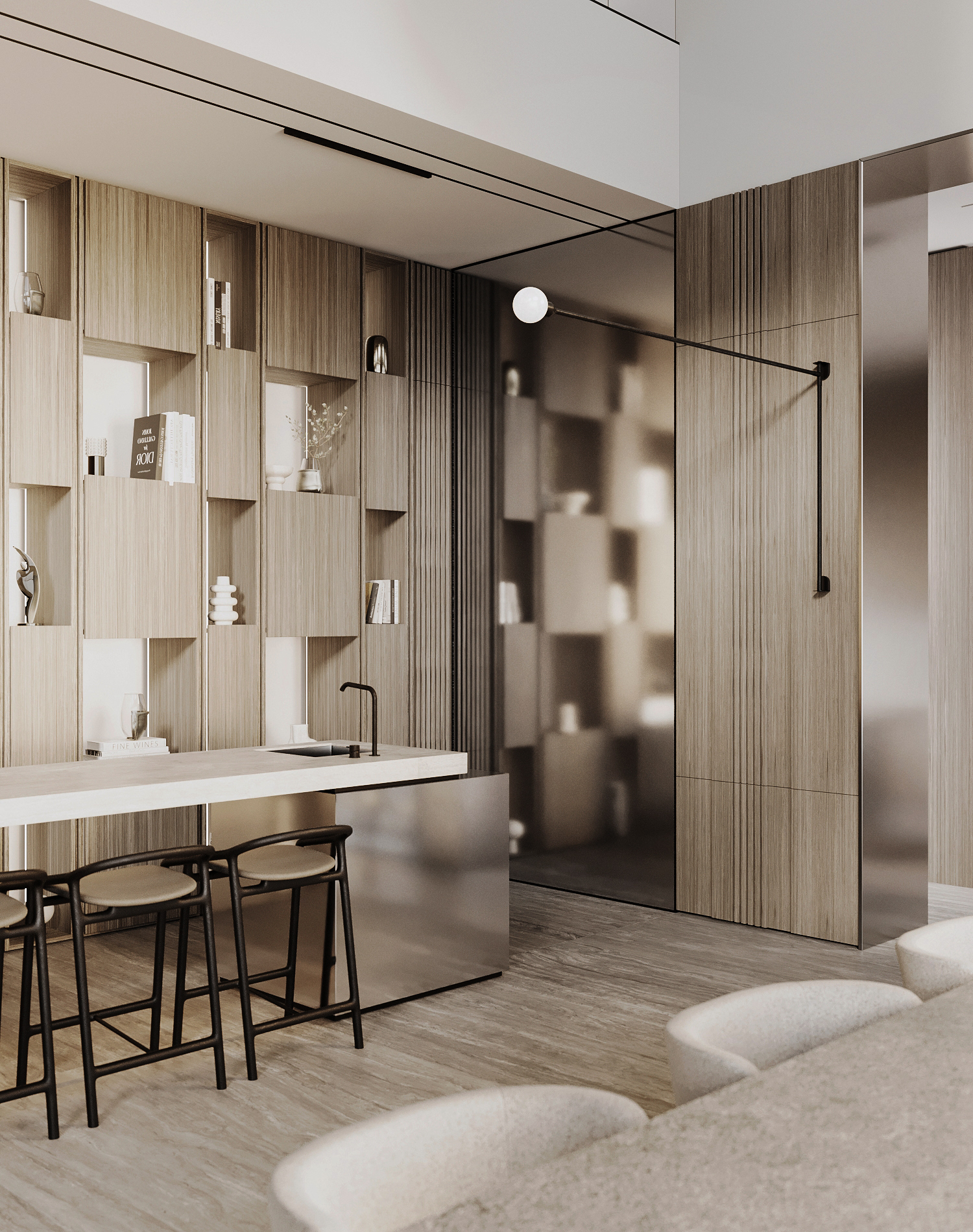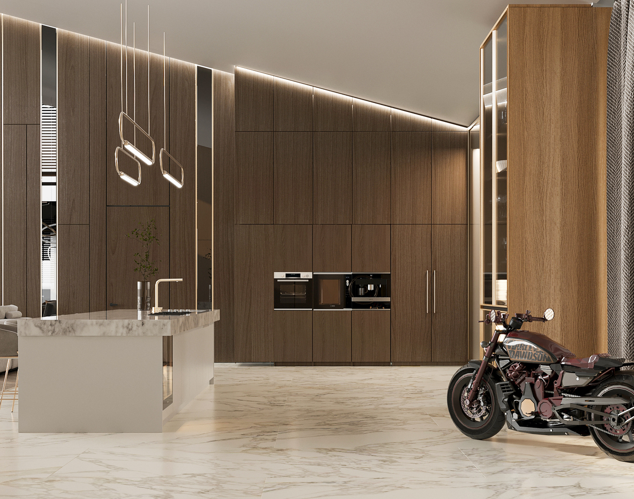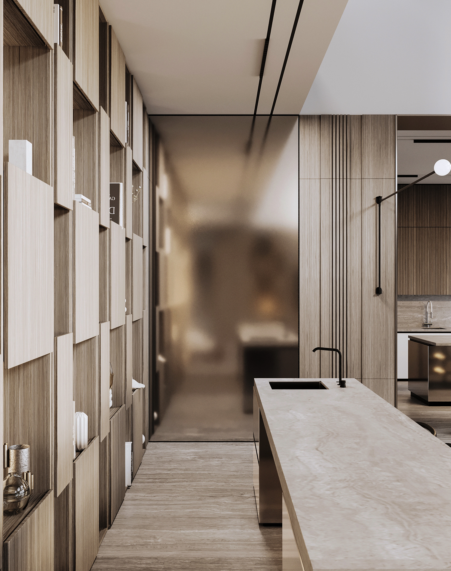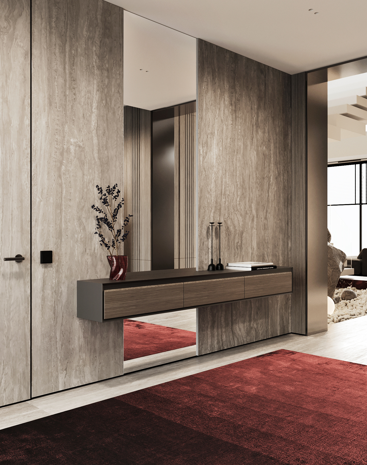 Особое внимание уделено деталям — незаметная на первый взгляд фурнитура, бесшовные соединения поверхностей и скрытые системы хранения доводят исполнение до совершенства.