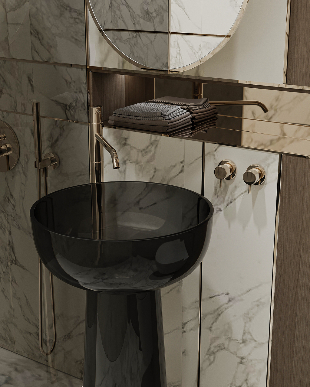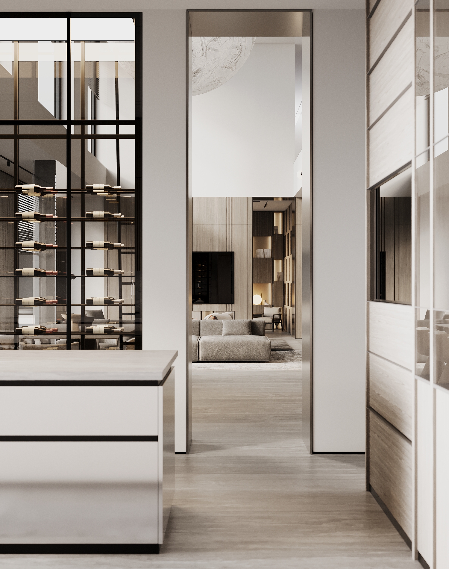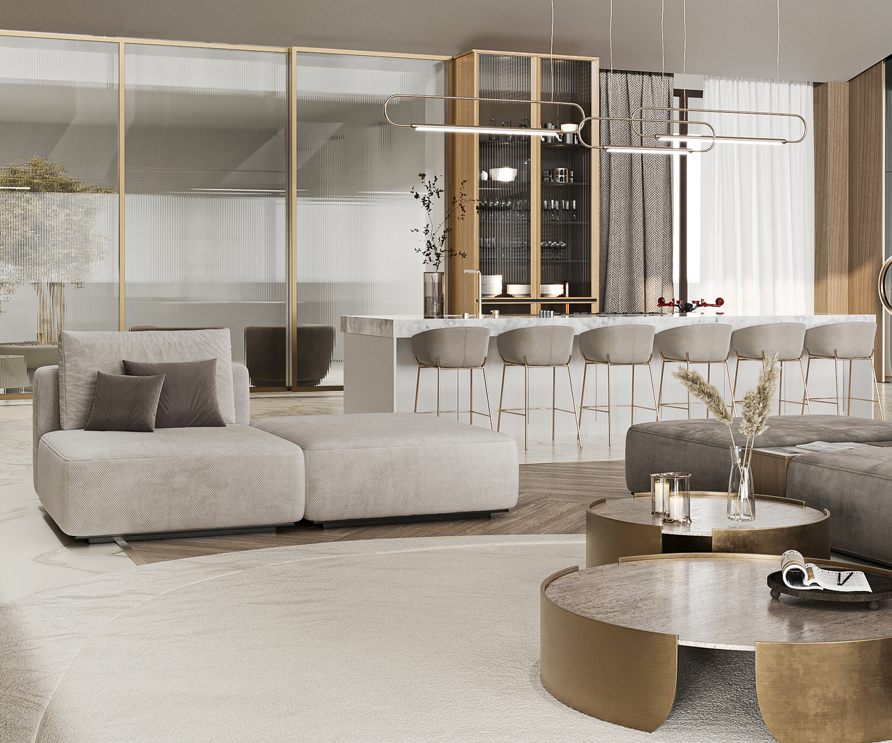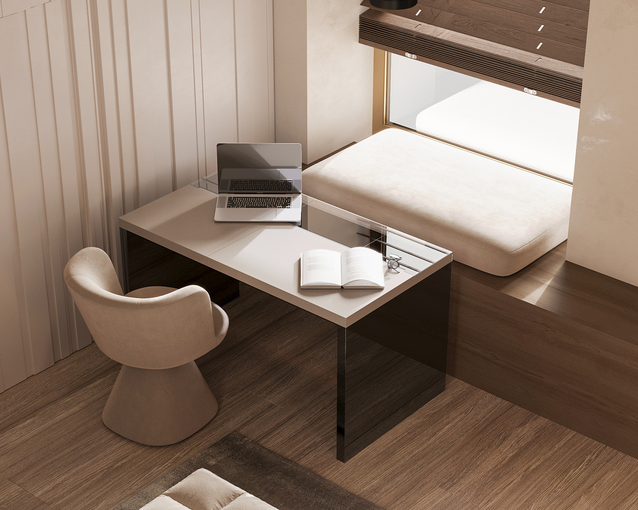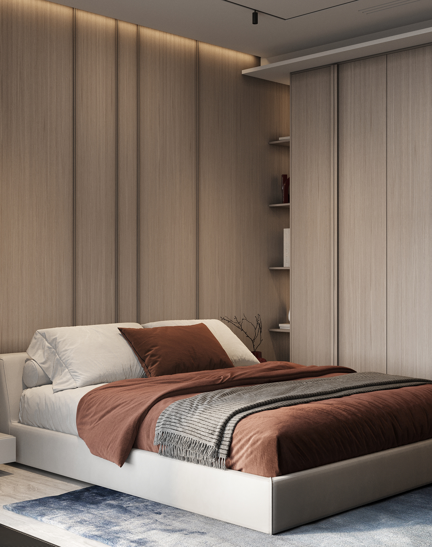 Особое внимание уделено деталям — незаметная на первый взгляд фурнитура, бесшовные соединения поверхностей и скрытые системы хранения доводят исполнение до совершенства.