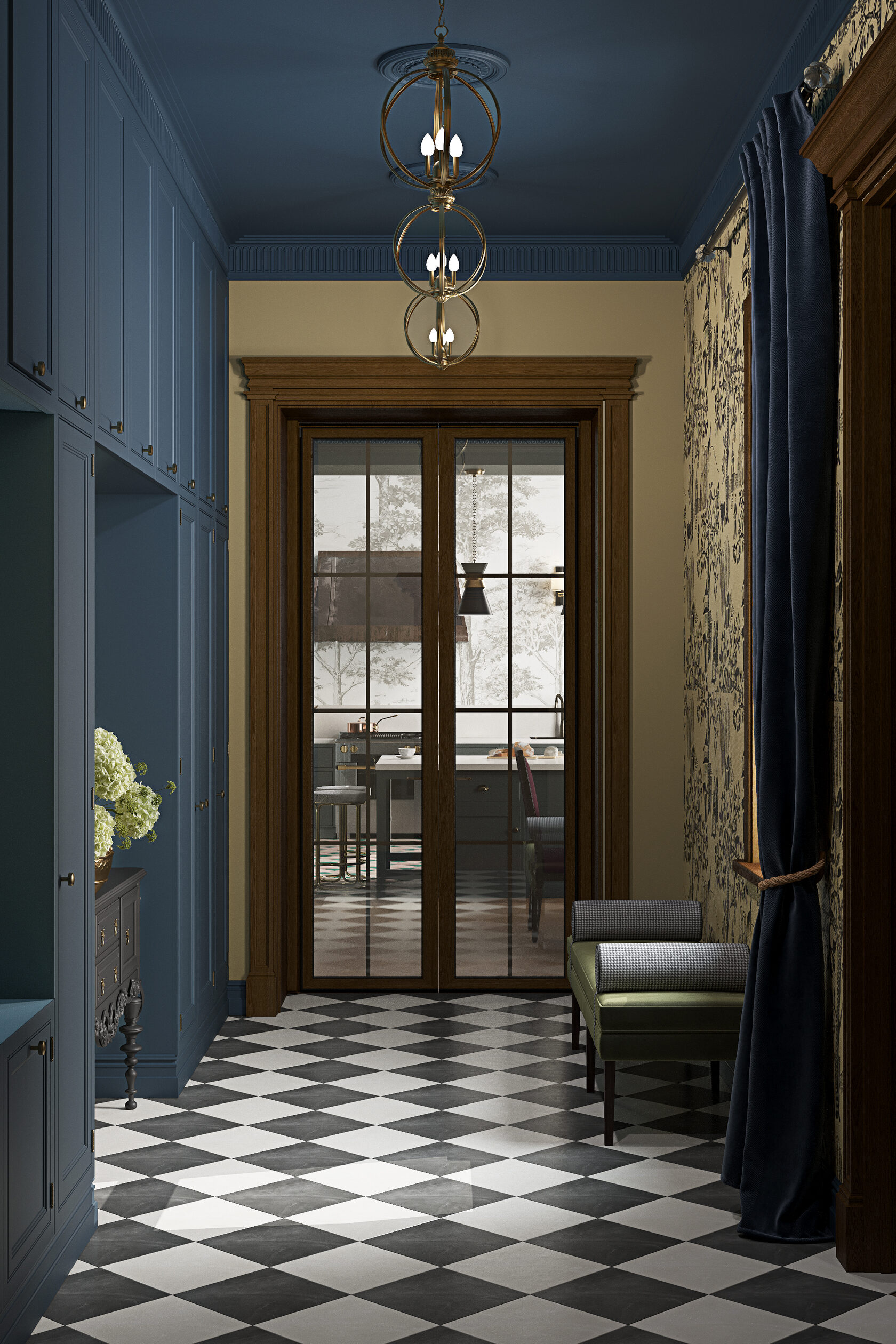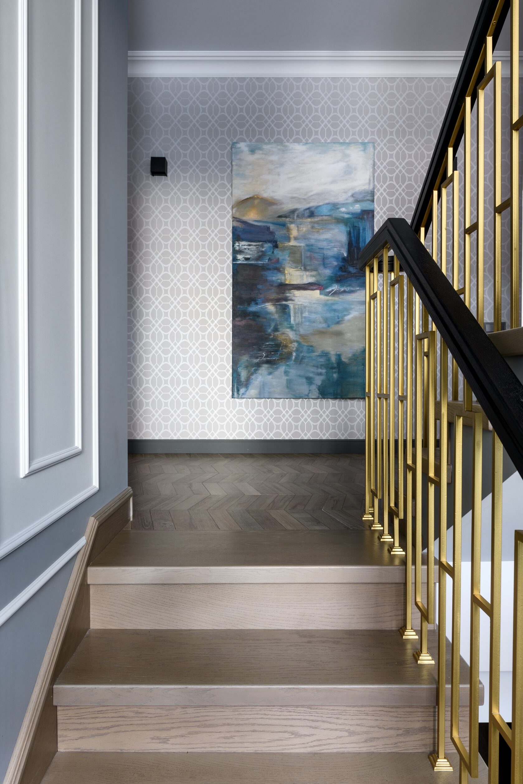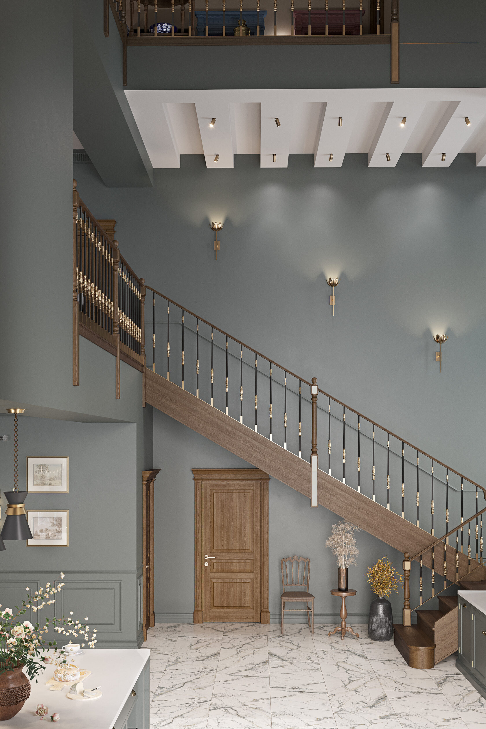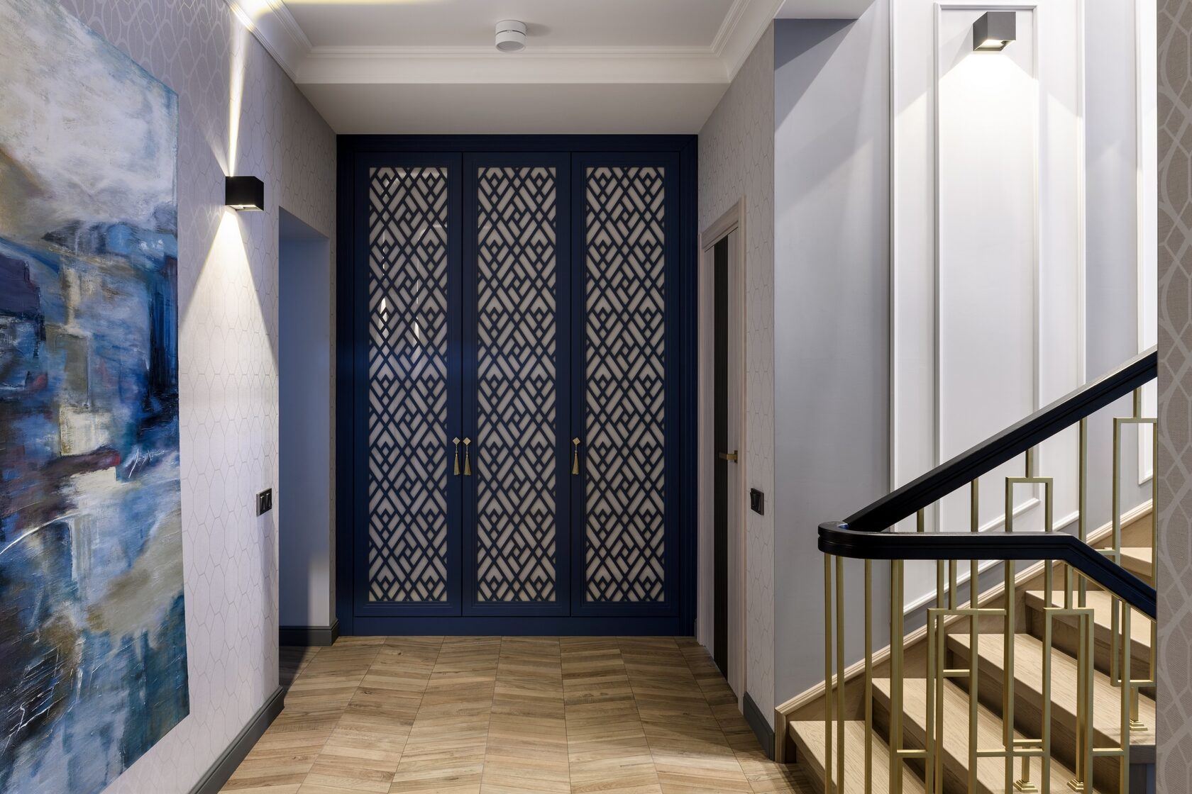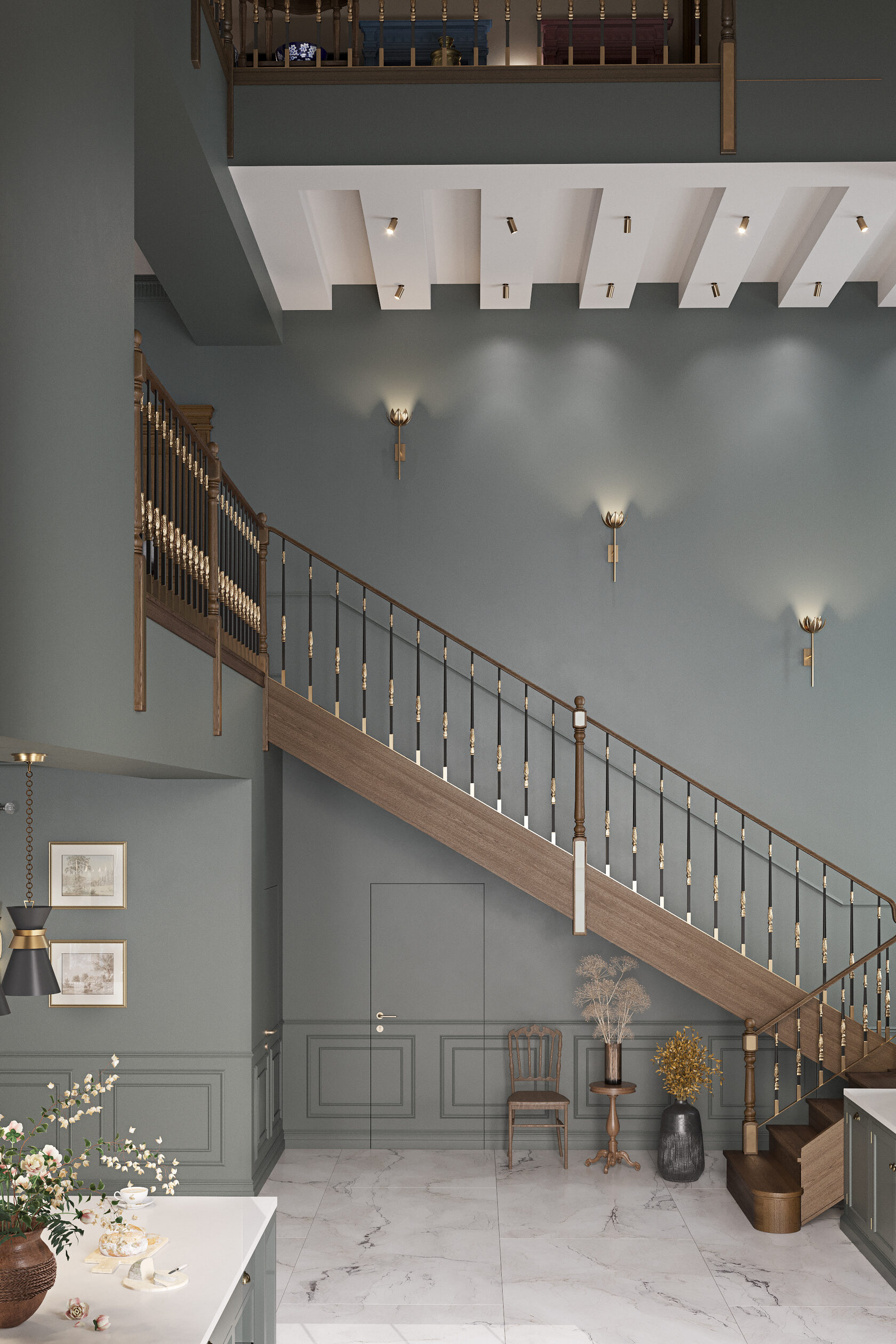 Концепция: Центральной идеей проекта является создание пространства, где классические традиции встречаются с современным комфортом и выраженной индивидуальностью владельцев. Масштабная перепланировка первого этажа превратила кухню в сердце дома, объединив ее с гостиной и кабинетом для многофункционального использования. Акцентные решения, такие как двусветная кухня с 9-метровым панно и глубокий синий в прихожей, подчеркивают уникальность интерьера. Третий этаж адаптирован под личную галерею, интегрируя искусство в повседневную жизнь дома.