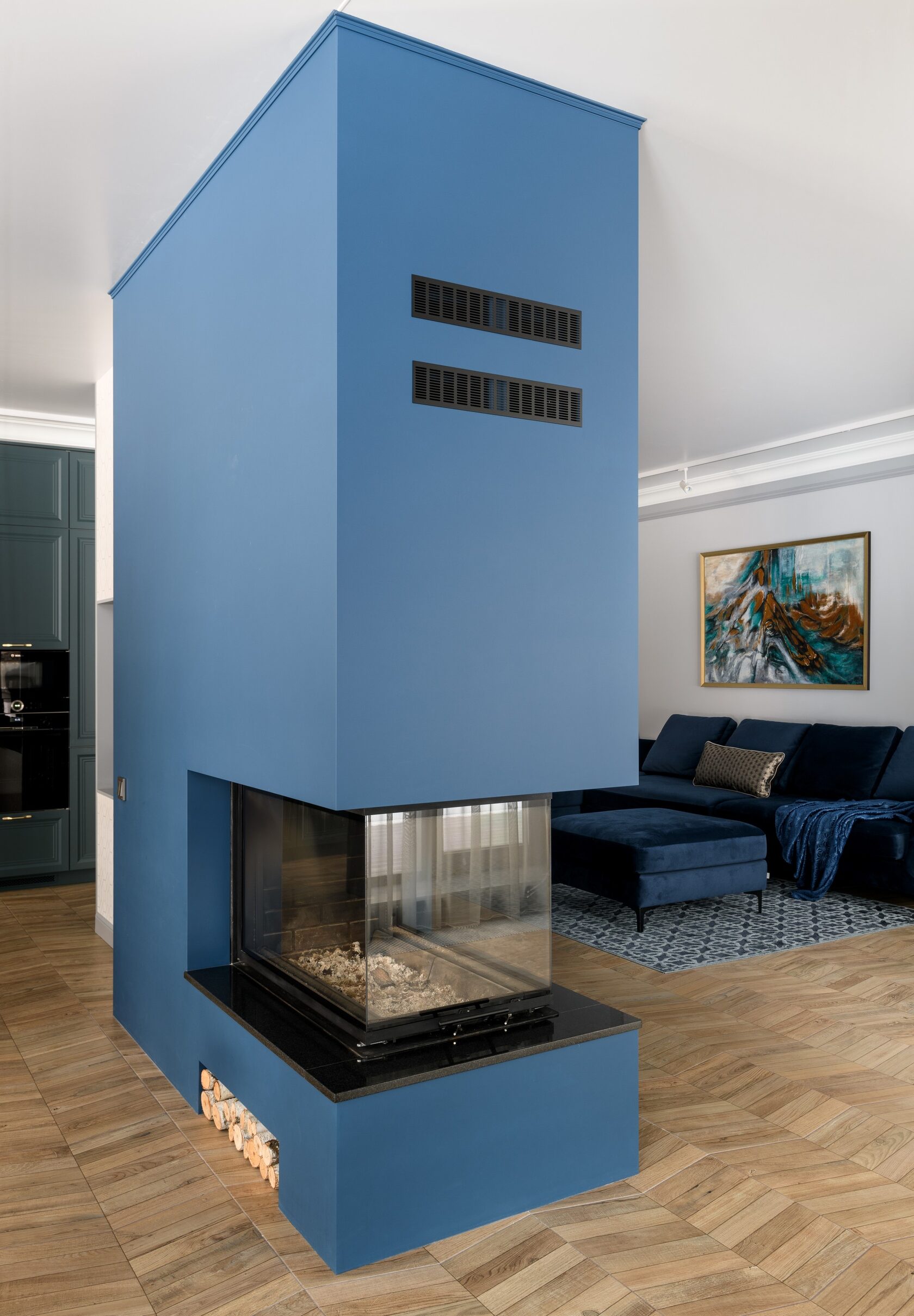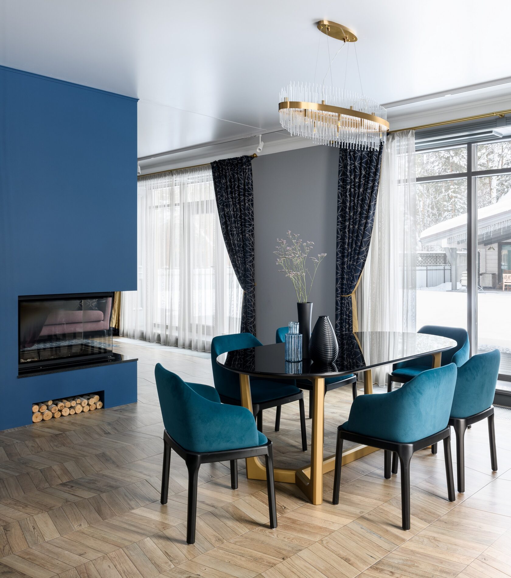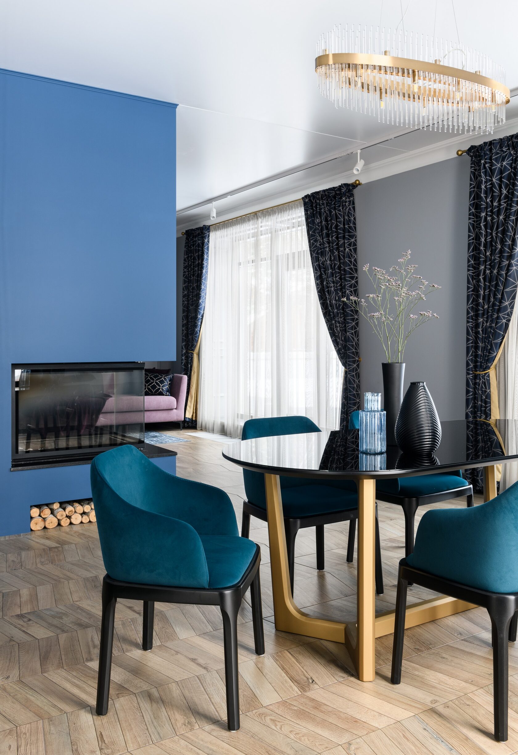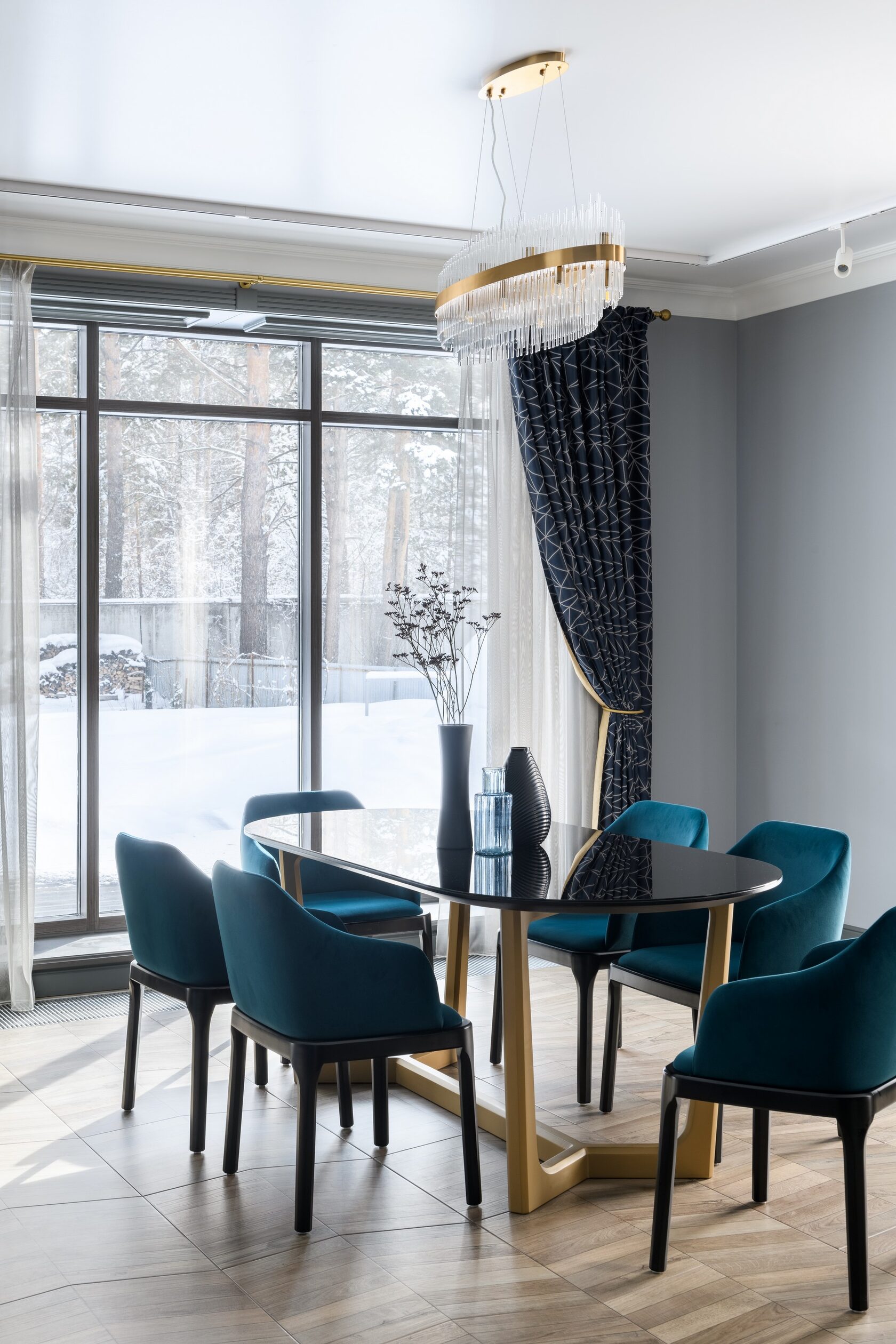 Концепция: Центральной идеей проекта является создание пространства, где классические традиции встречаются с современным комфортом и выраженной индивидуальностью владельцев. Масштабная перепланировка первого этажа превратила кухню в сердце дома, объединив ее с гостиной и кабинетом для многофункционального использования. Акцентные решения, такие как двусветная кухня с 9-метровым панно и глубокий синий в прихожей, подчеркивают уникальность интерьера. Третий этаж адаптирован под личную галерею, интегрируя искусство в повседневную жизнь дома.