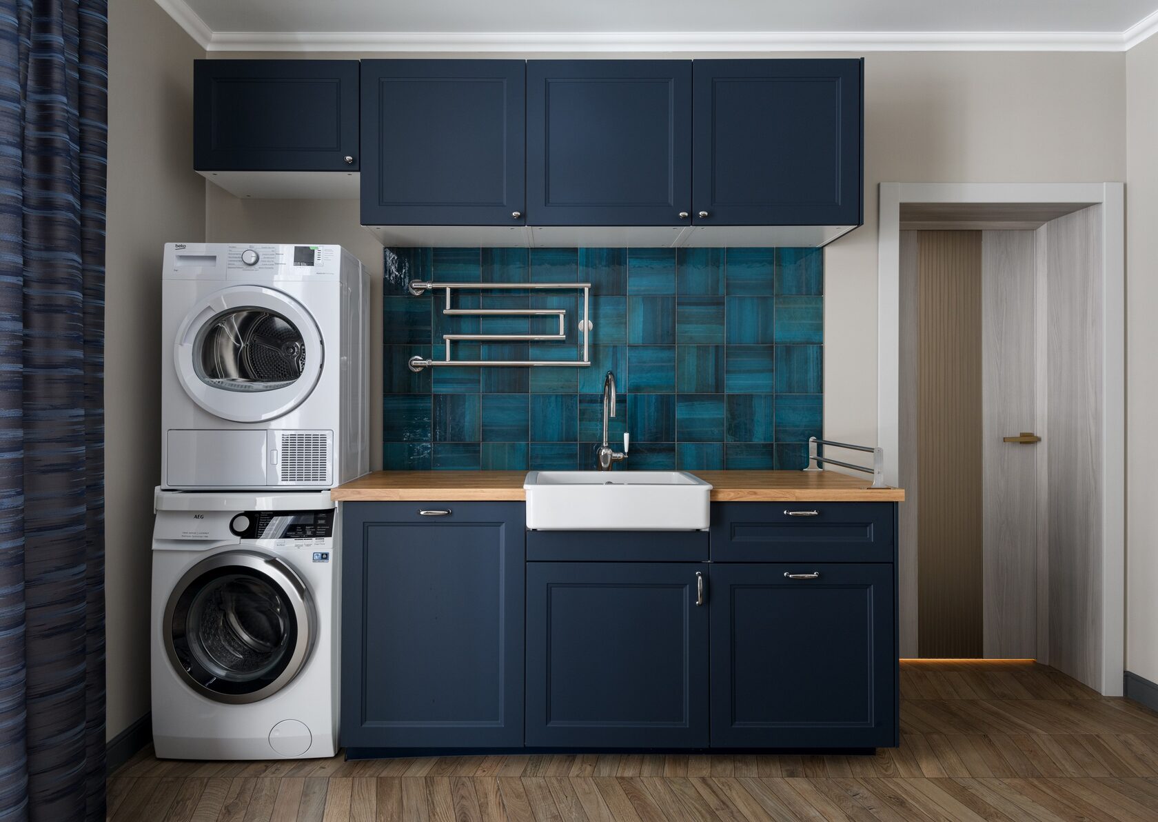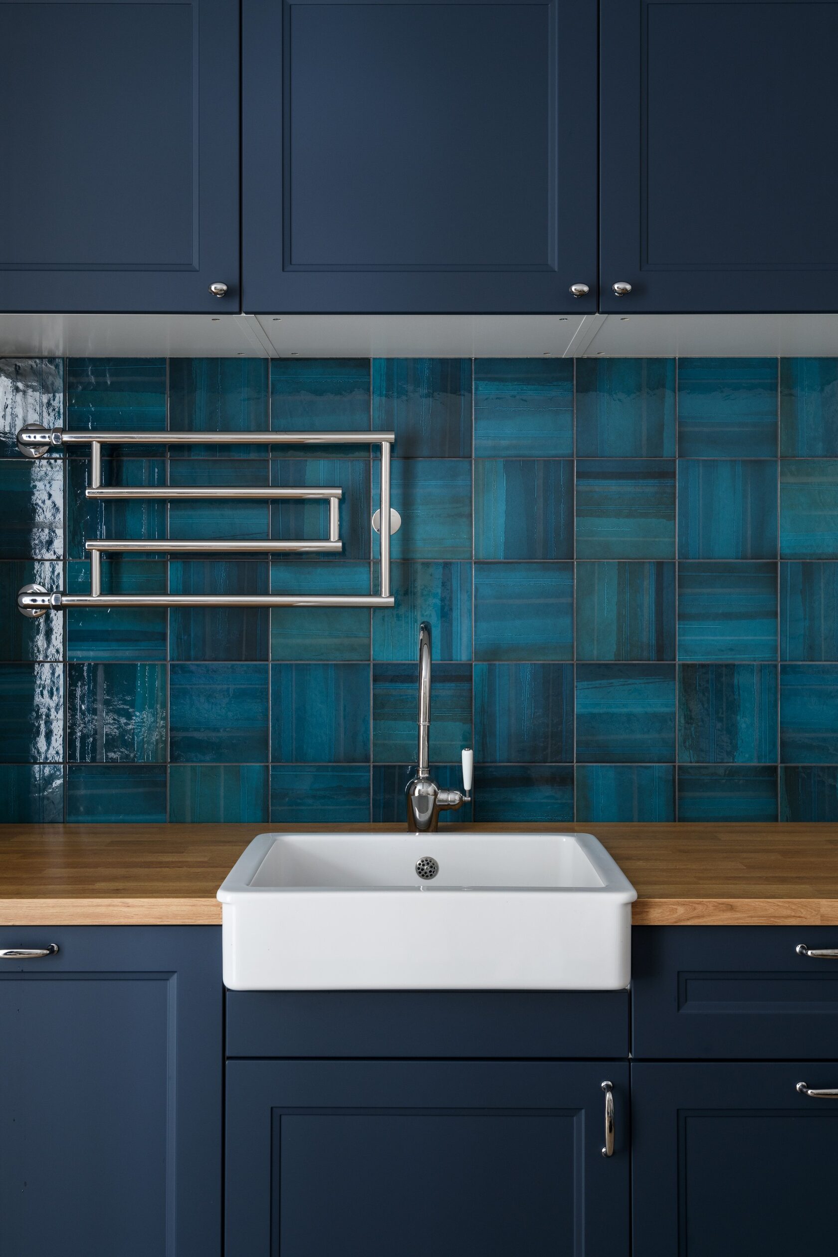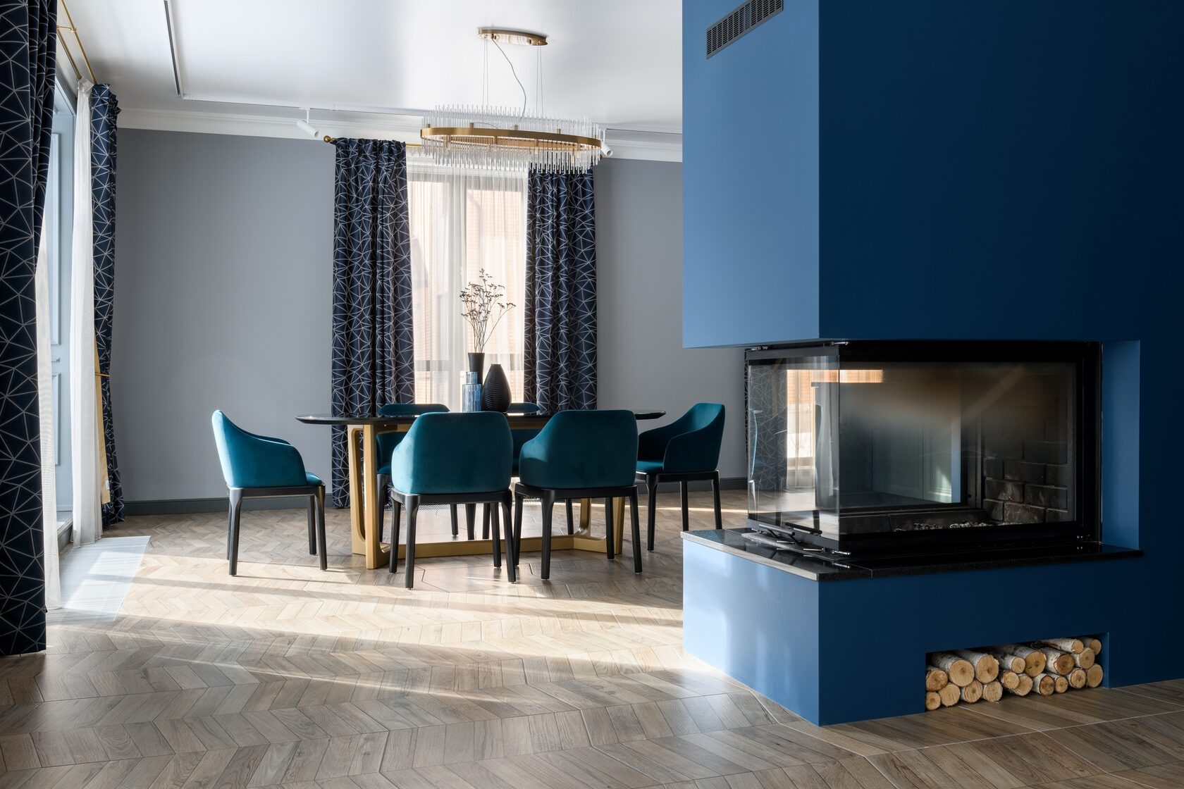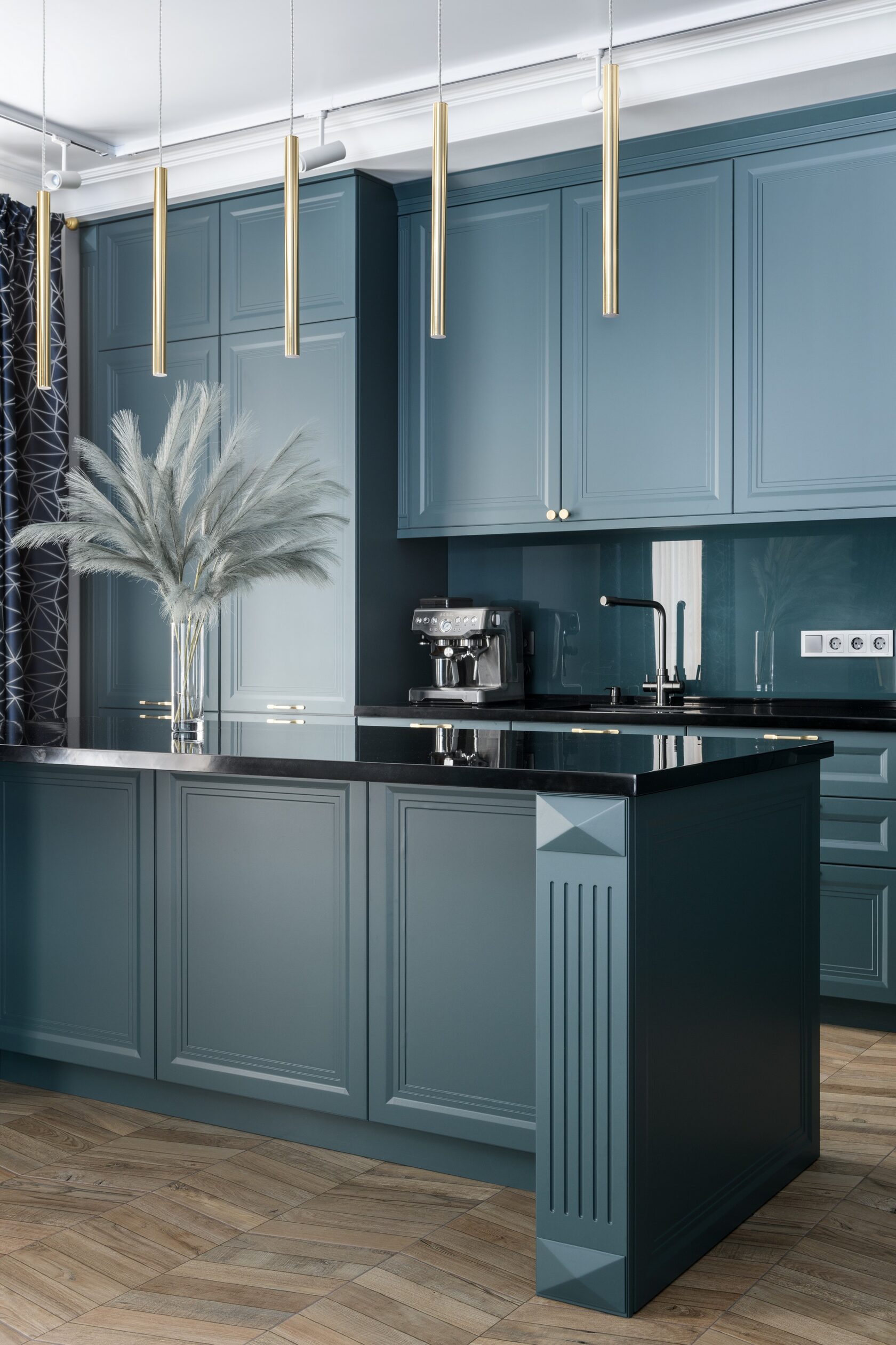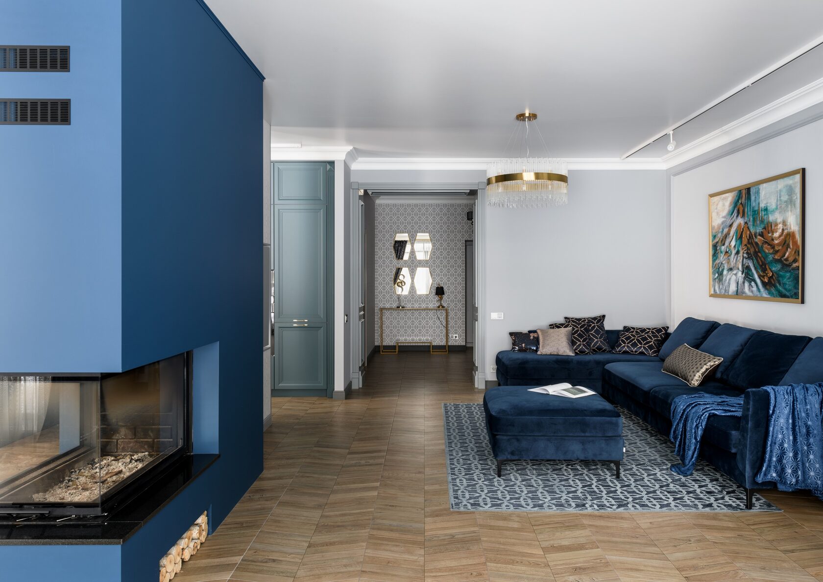 Концепция: Центральной идеей проекта является создание пространства, где классические традиции встречаются с современным комфортом и выраженной индивидуальностью владельцев. Масштабная перепланировка первого этажа превратила кухню в сердце дома, объединив ее с гостиной и кабинетом для многофункционального использования. Акцентные решения, такие как двусветная кухня с 9-метровым панно и глубокий синий в прихожей, подчеркивают уникальность интерьера. Третий этаж адаптирован под личную галерею, интегрируя искусство в повседневную жизнь дома.