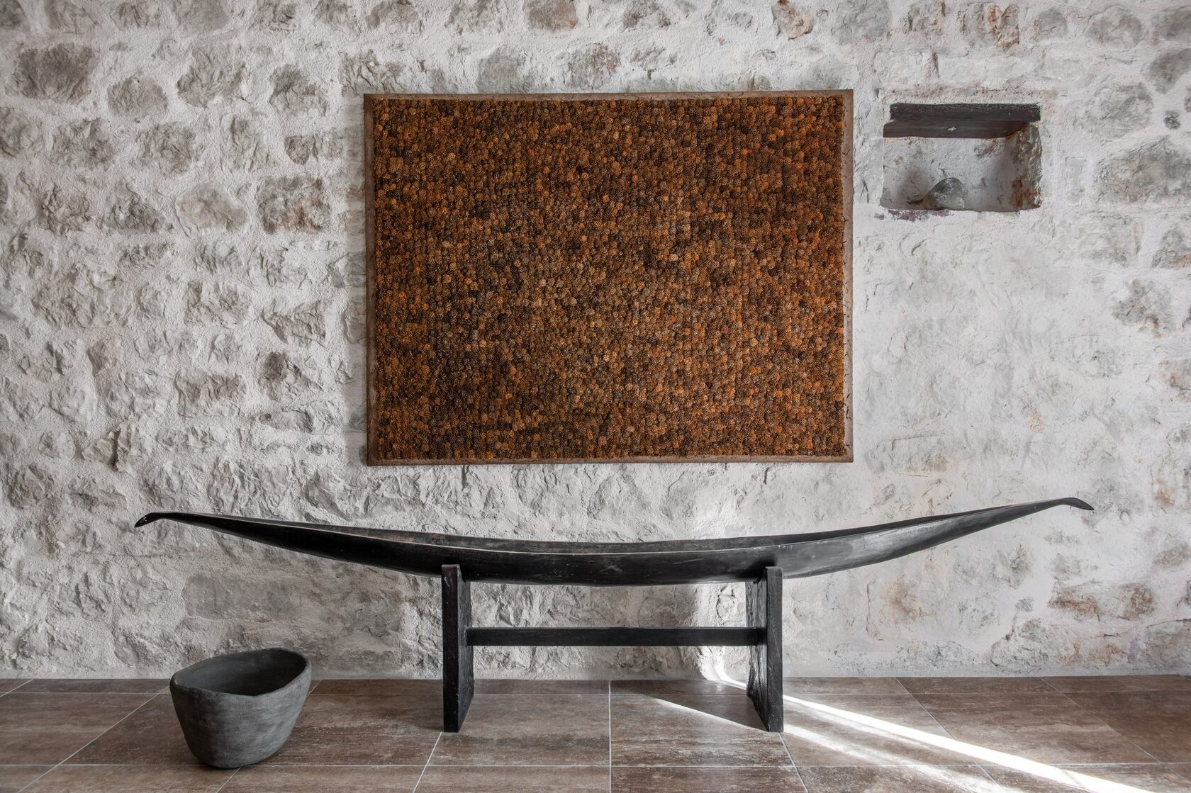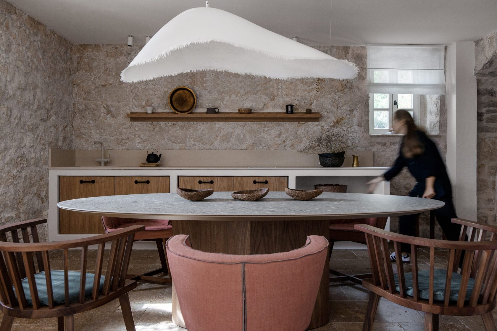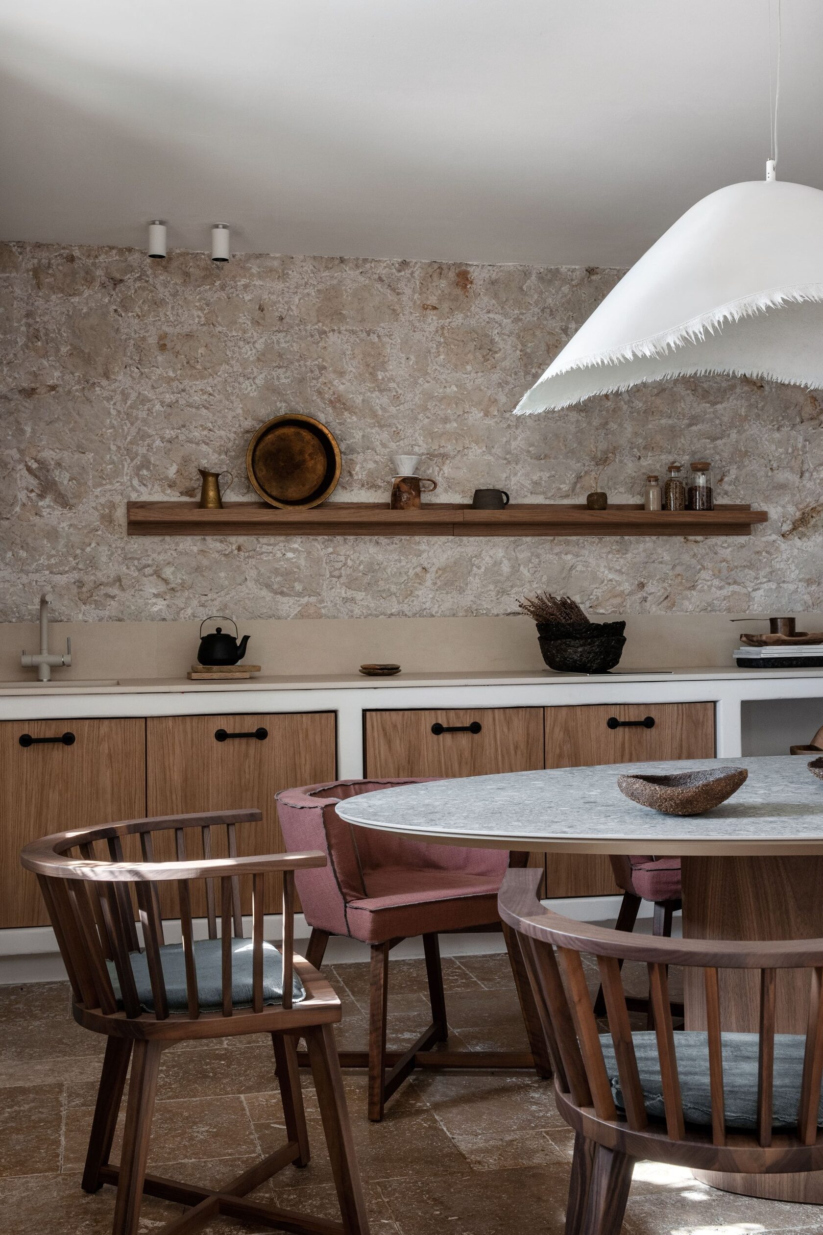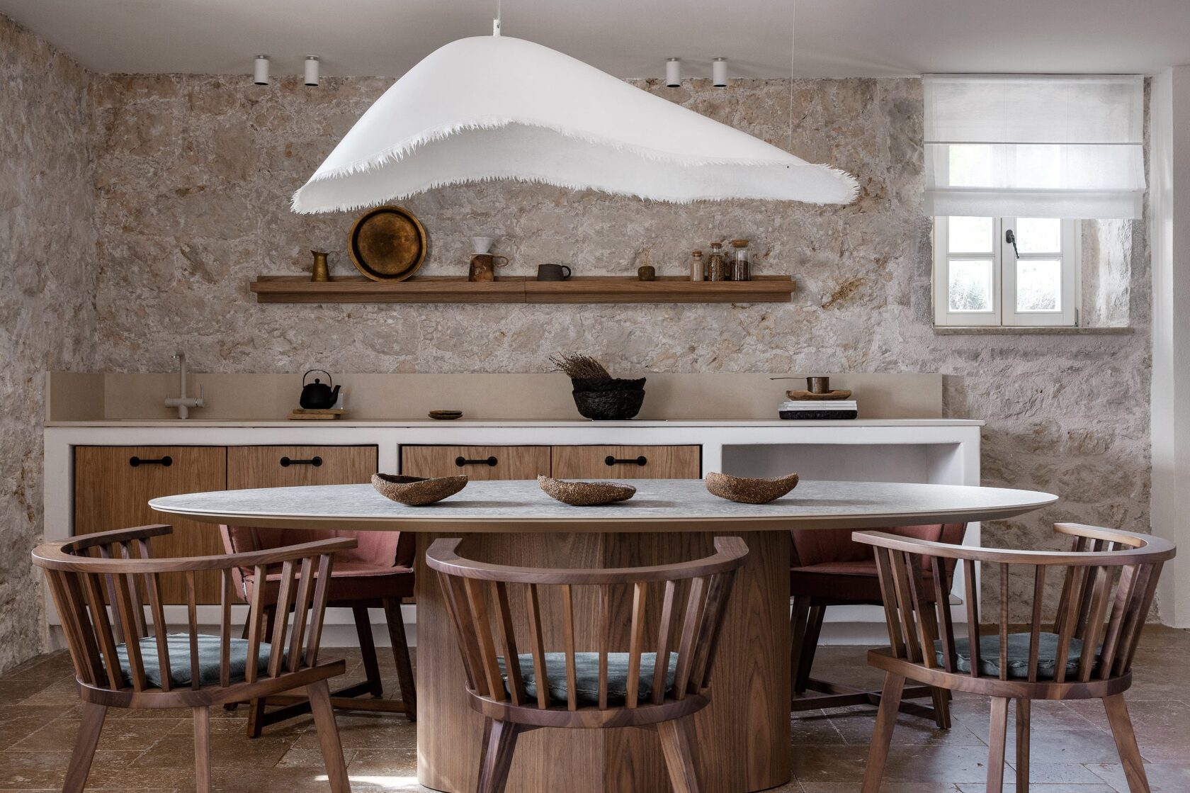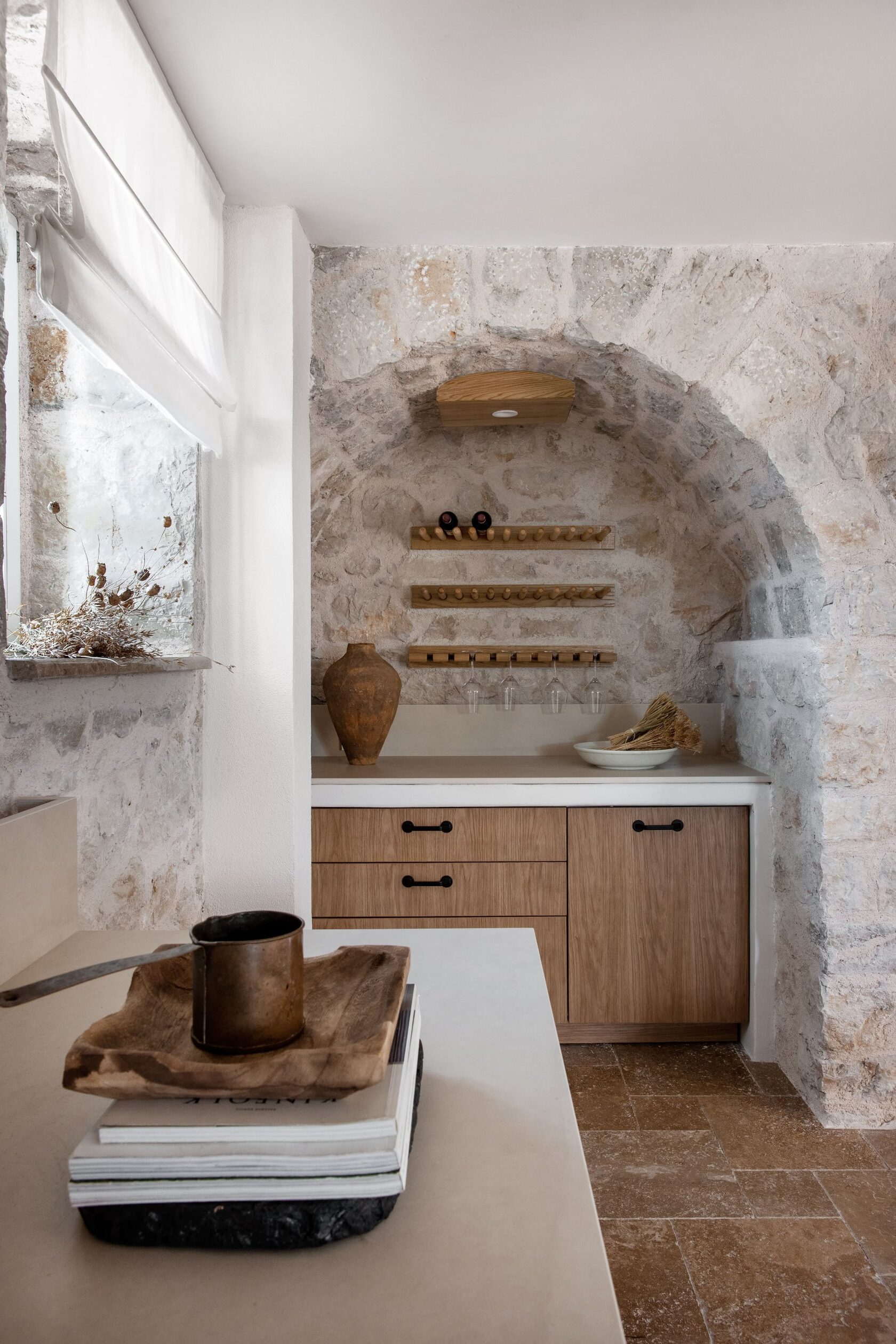 Концепция: Основная идея проекта — бережное сохранение исторического наследия, придание интерьеру ощущения 'всегдашности' и максимальная адаптация к современному комфортному отдыху. Планировка виллы была скорректирована минимально, сфокусировавшись на оптимизации функциональных зон. Первый этаж был полностью переосмыслен, включив новую ванную и массажную зоны. Центральным элементом стала кухня, изящно интегрированная в старинную нишу печи. В интерьере использованы исключительно натуральные материалы: льняные ткани, дуб для фасадов кухни, травертин на полу, дополненные уникальными арт-объектами из местных растений.
