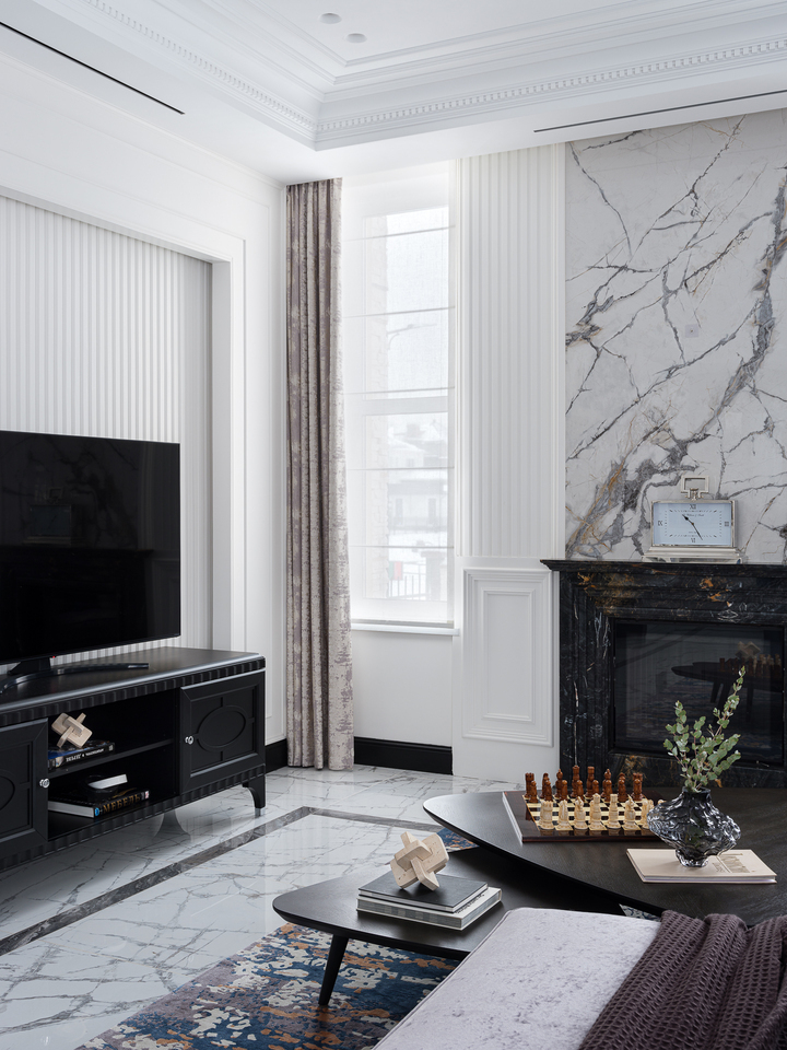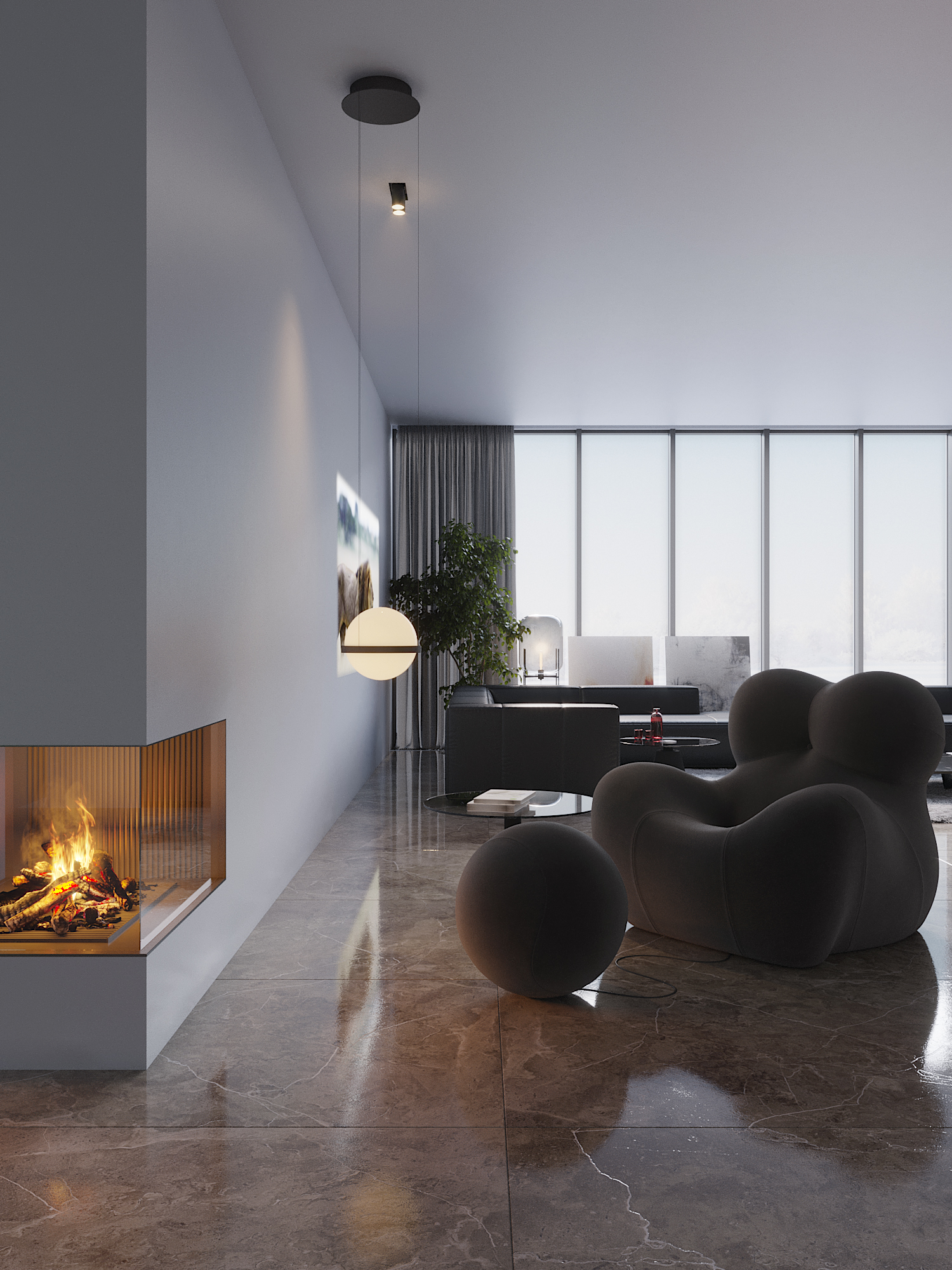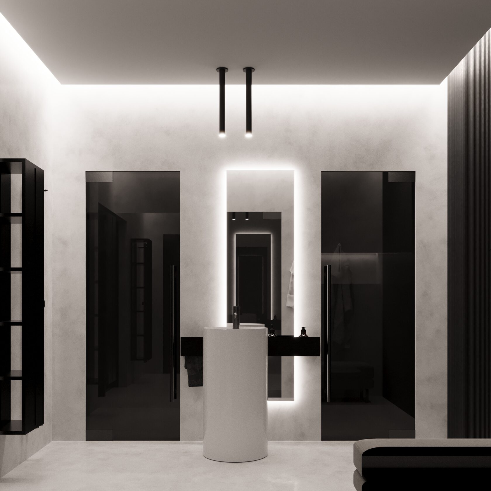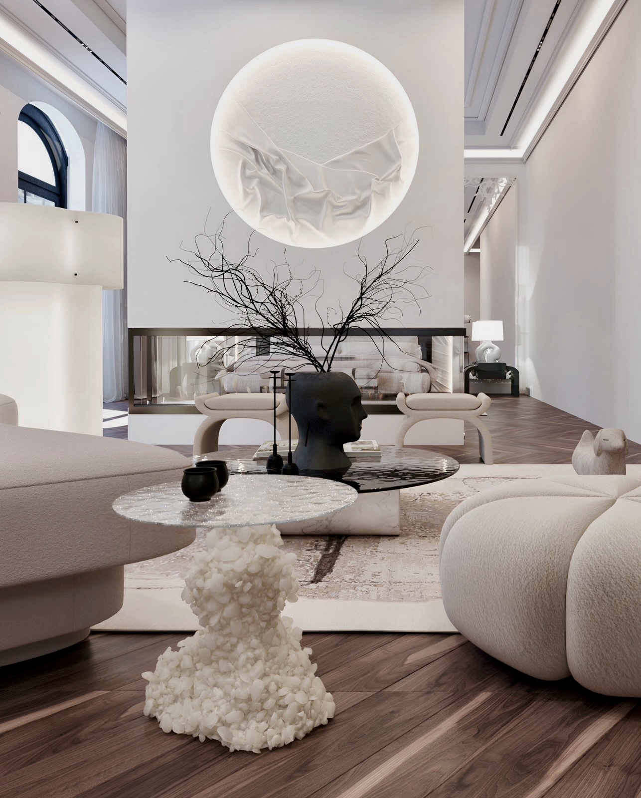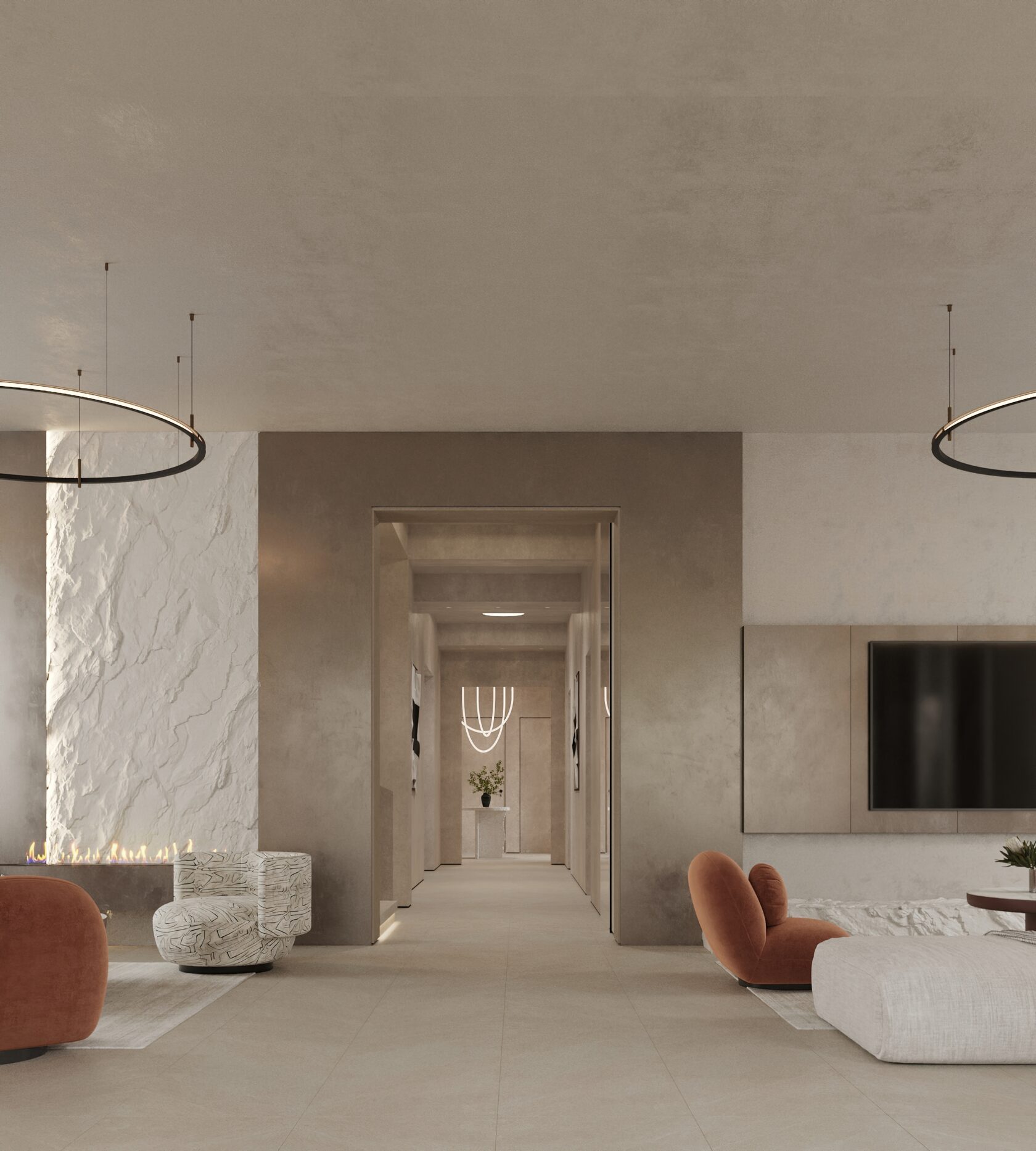 Концепция: Соединение контрастов: Дерзость форм (мраморная стена-артобъект, открытая ванная) и минимализм линий (чистые геометрические объемы) Театральность (игра света, круговой камин как центр композиции) и рациональность (эргономичное зонирование, скрытые системы хранения) Ручная работа (гипсовая лепнина, созданная на месте) и современные технологии (интегрированные инженерные решения)