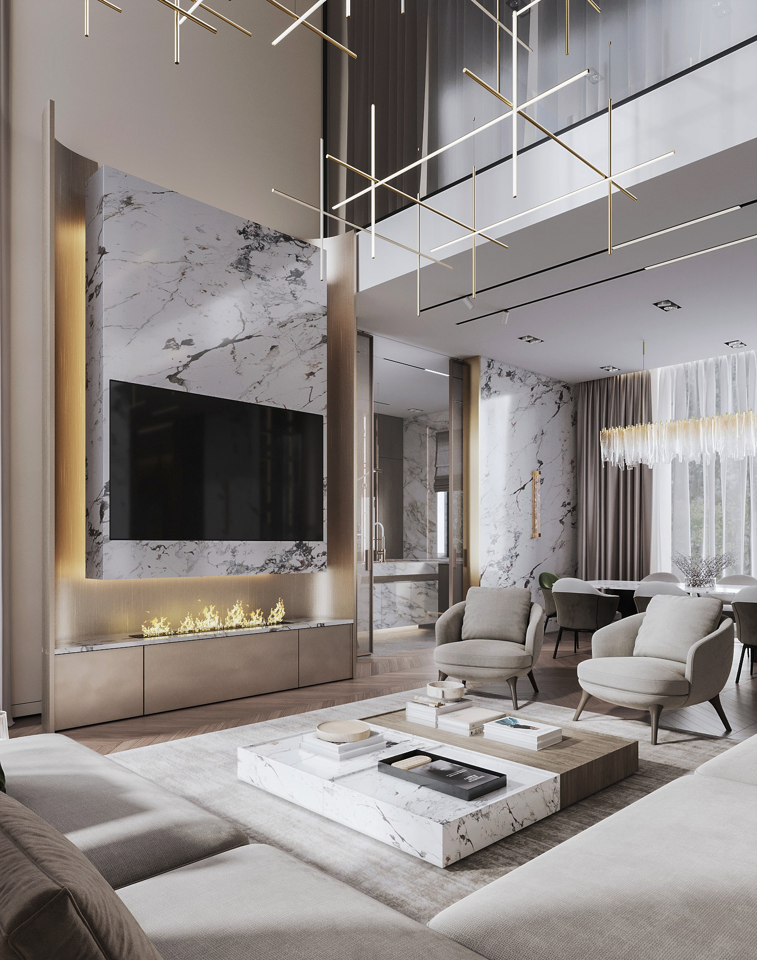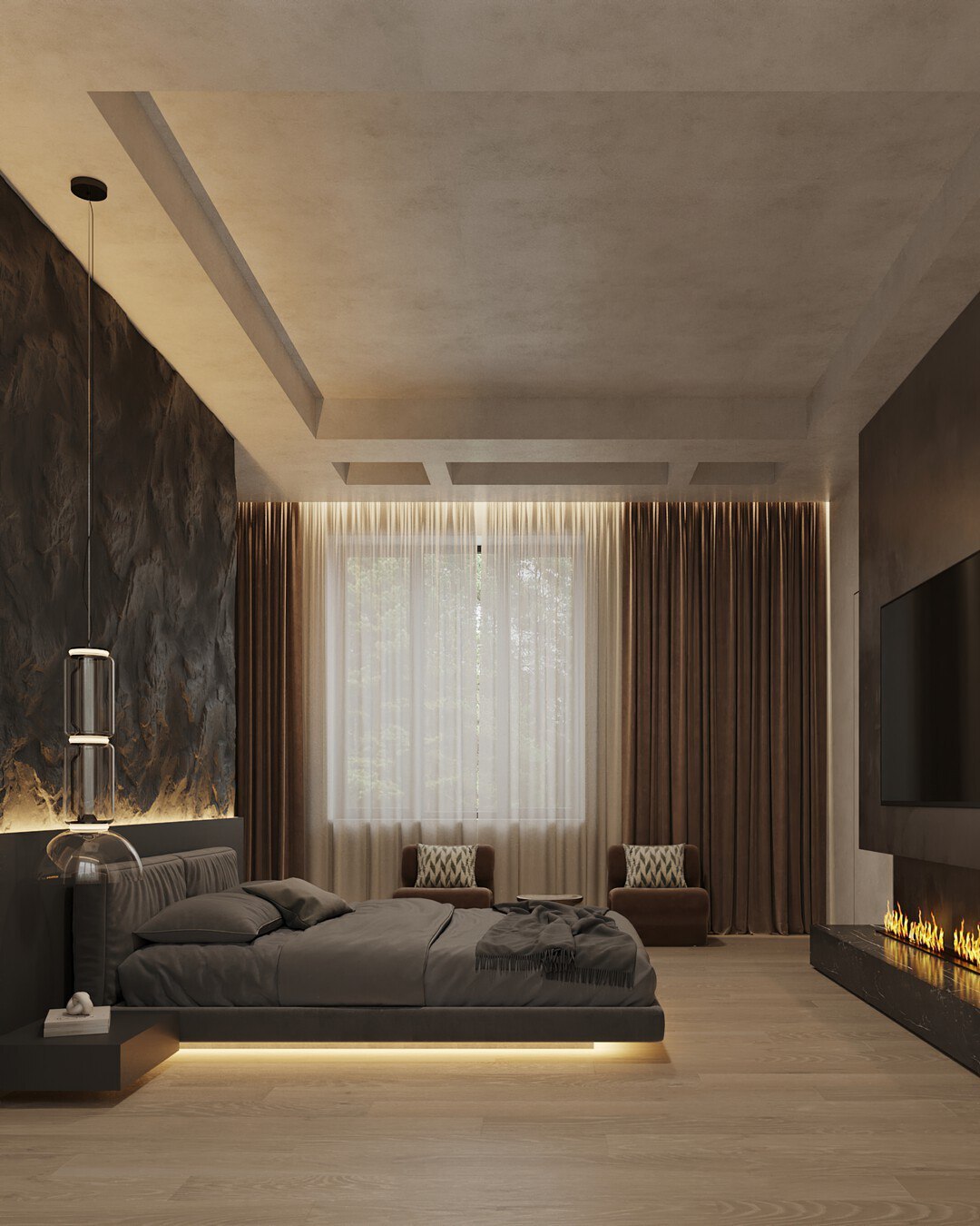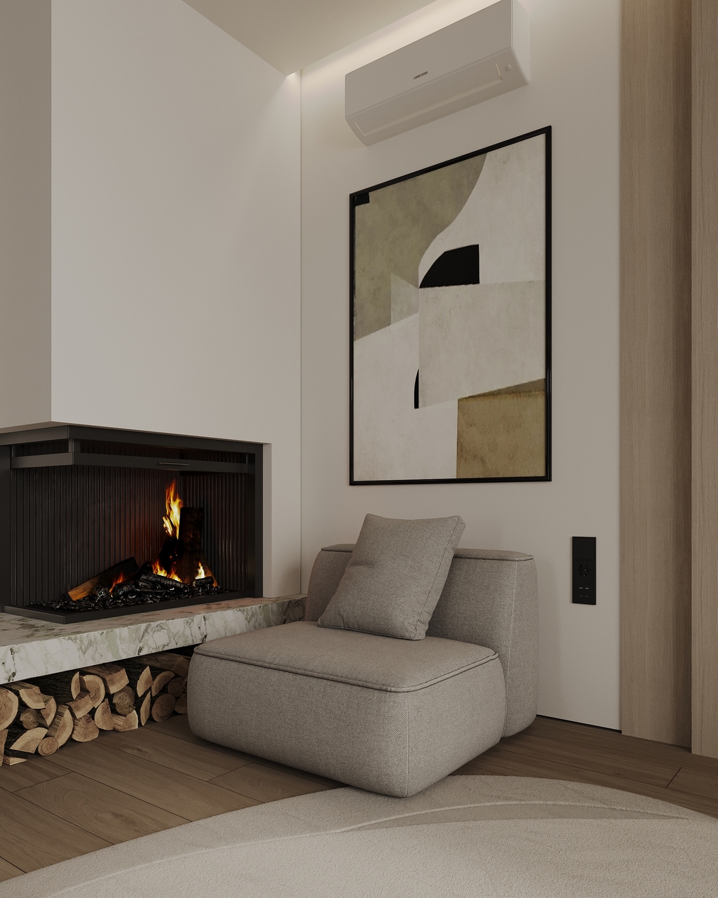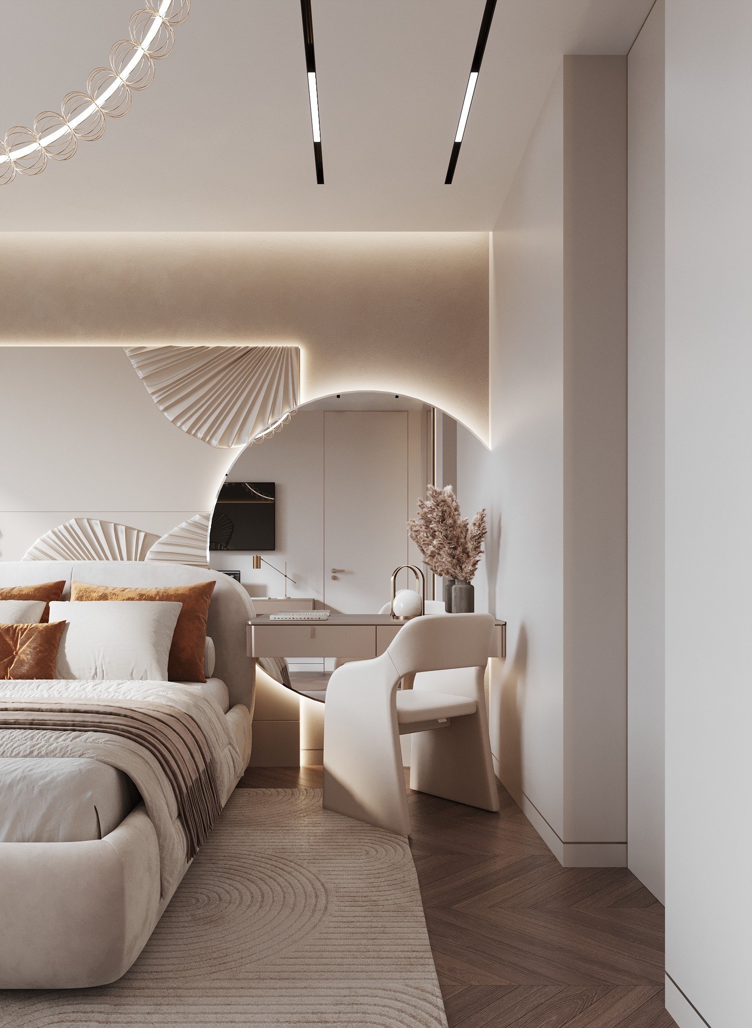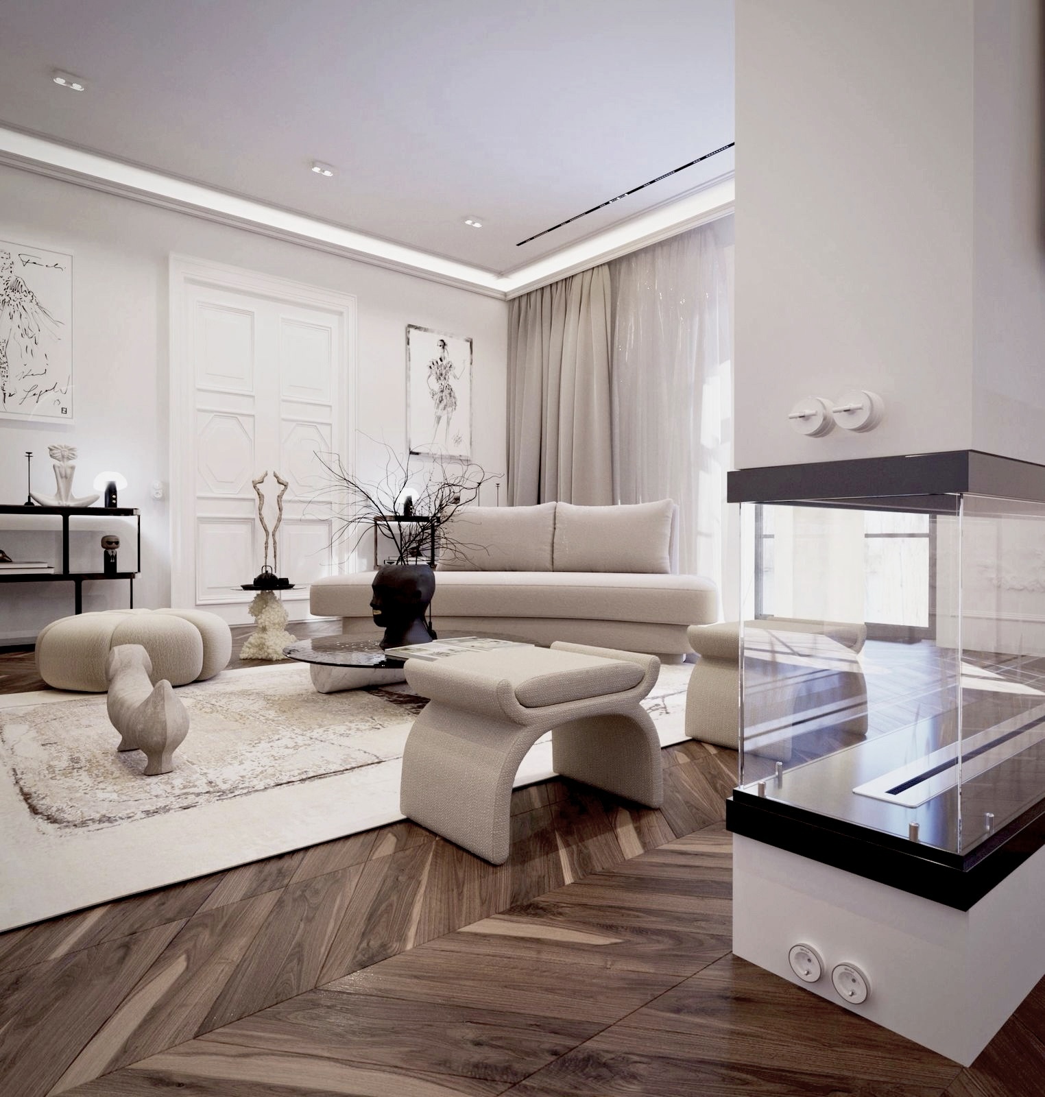 Концепция: Соединение контрастов: Дерзость форм (мраморная стена-артобъект, открытая ванная) и минимализм линий (чистые геометрические объемы) Театральность (игра света, круговой камин как центр композиции) и рациональность (эргономичное зонирование, скрытые системы хранения) Ручная работа (гипсовая лепнина, созданная на месте) и современные технологии (интегрированные инженерные решения)