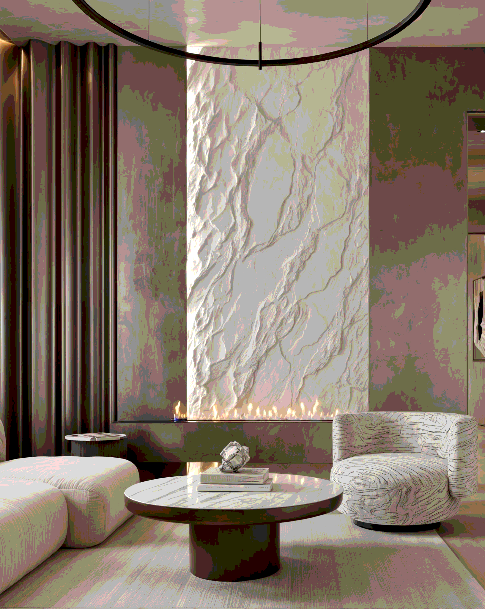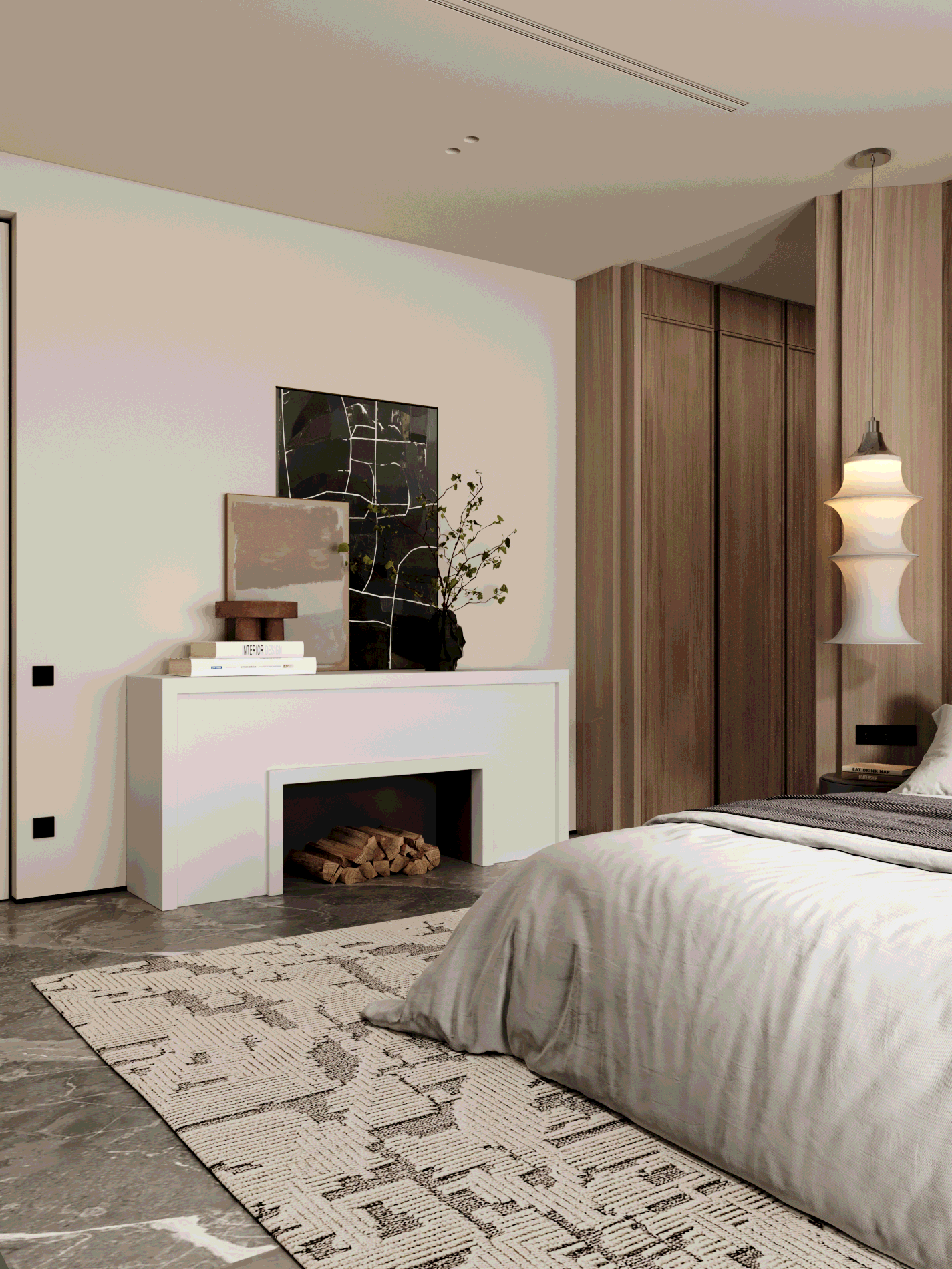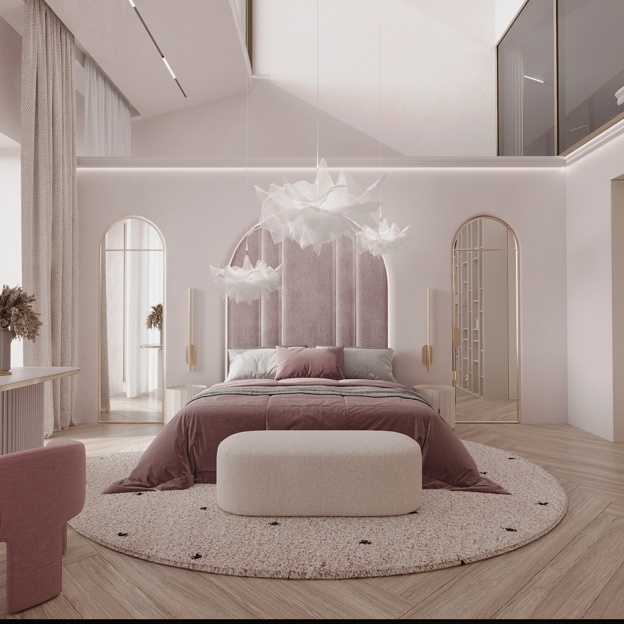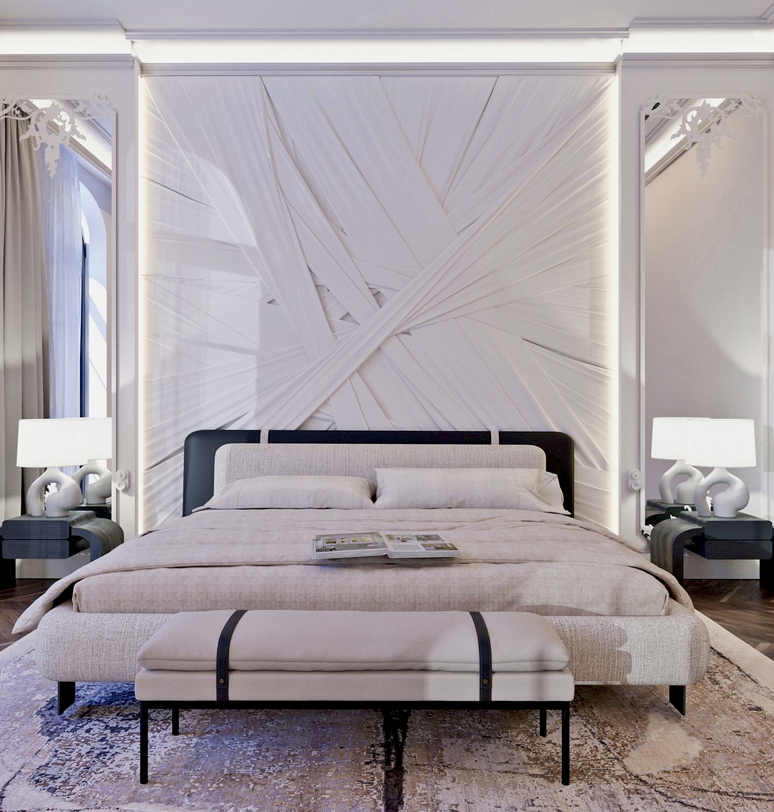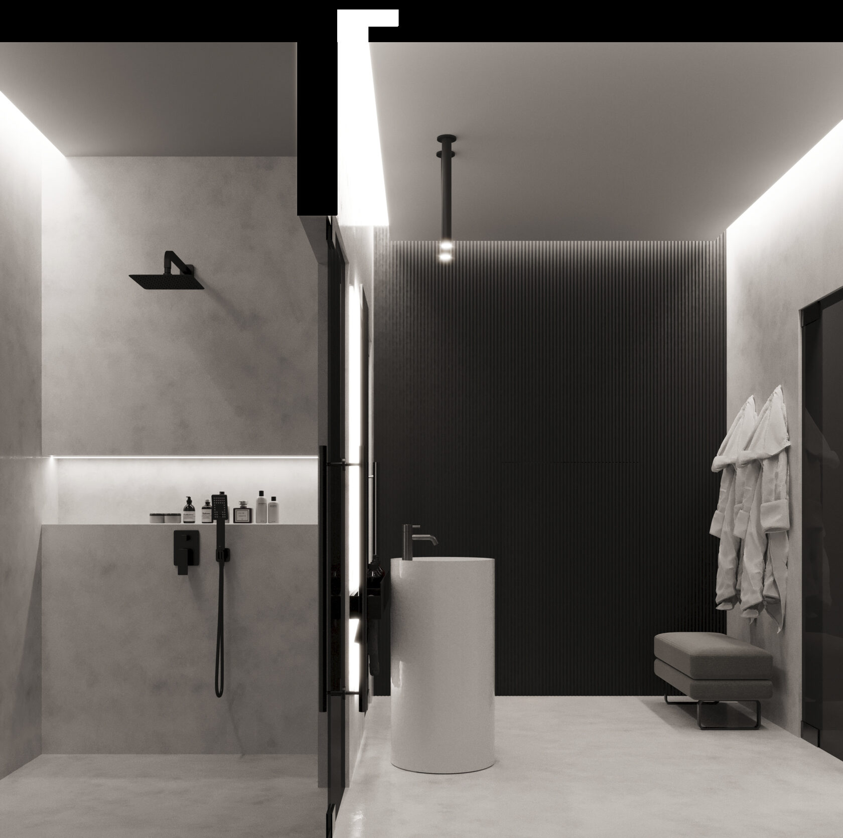 Концепция: Соединение контрастов: Дерзость форм (мраморная стена-артобъект, открытая ванная) и минимализм линий (чистые геометрические объемы) Театральность (игра света, круговой камин как центр композиции) и рациональность (эргономичное зонирование, скрытые системы хранения) Ручная работа (гипсовая лепнина, созданная на месте) и современные технологии (интегрированные инженерные решения)