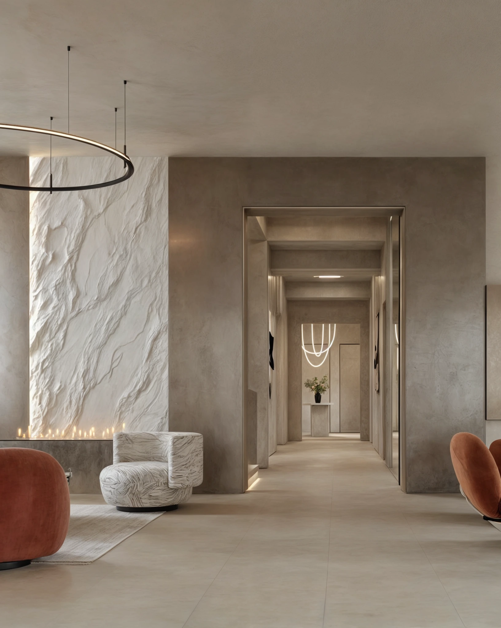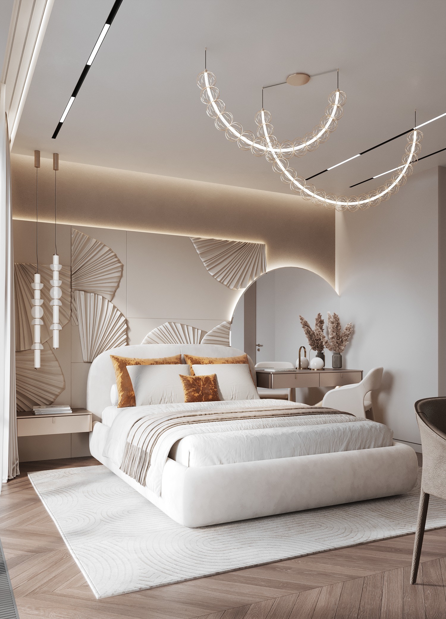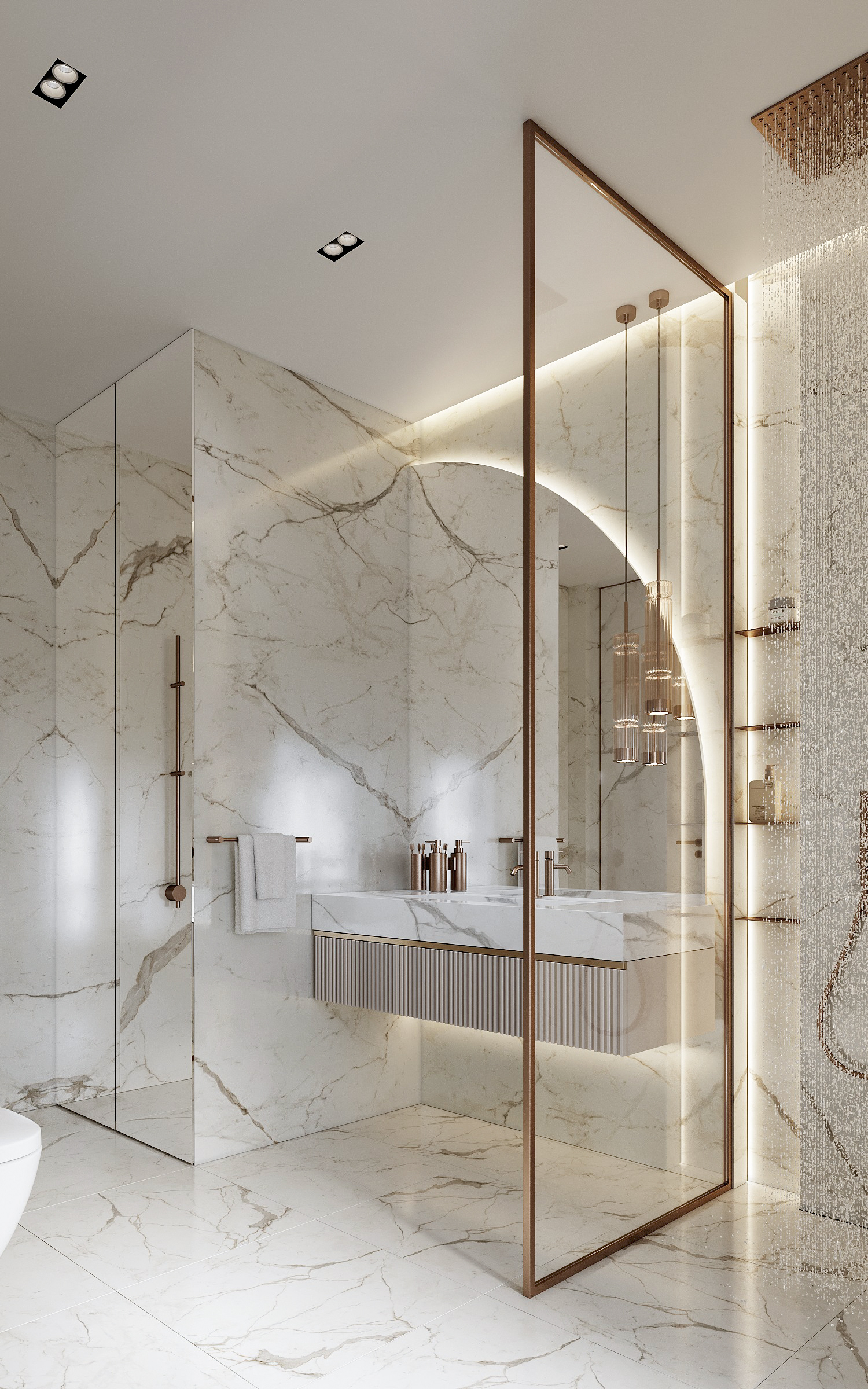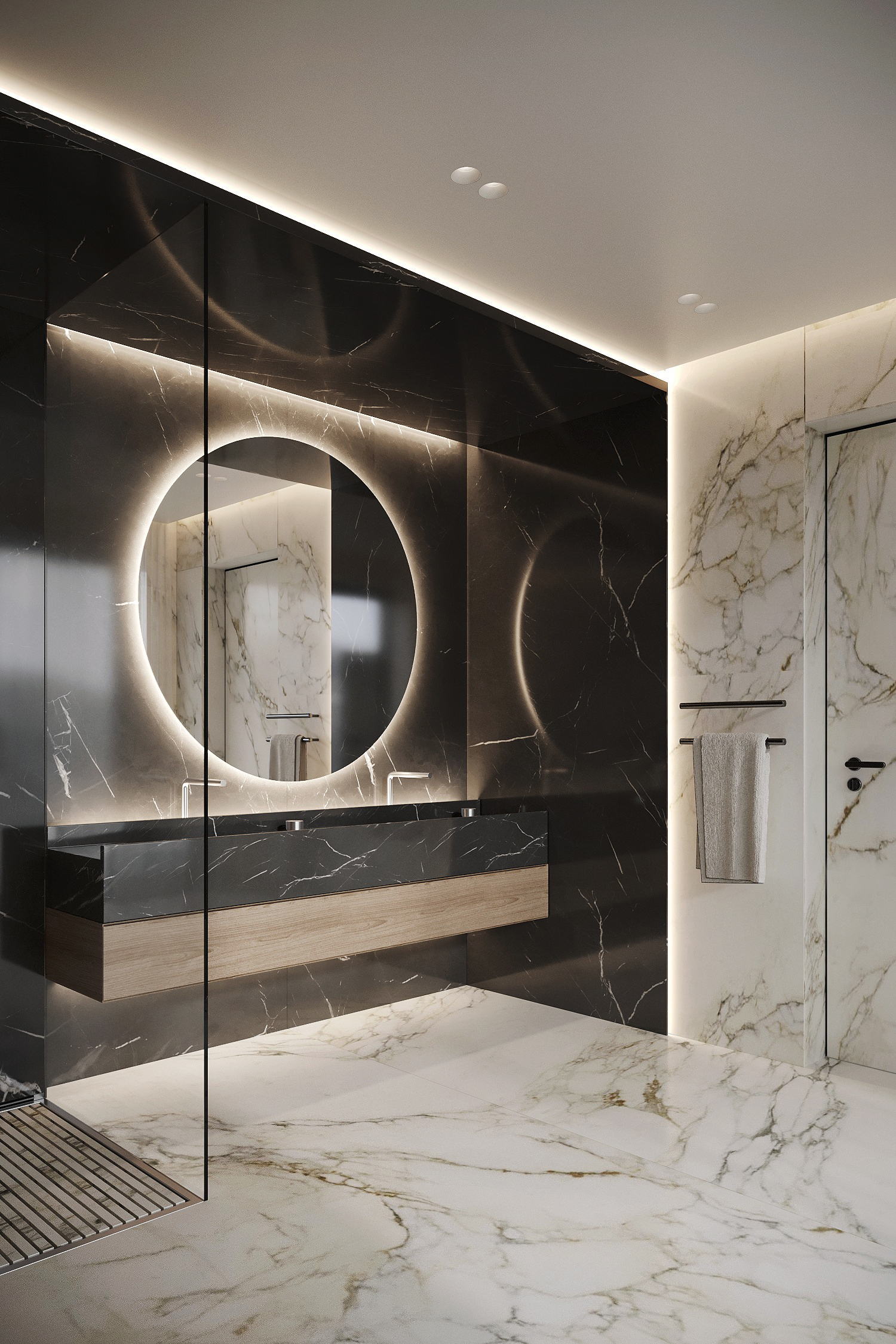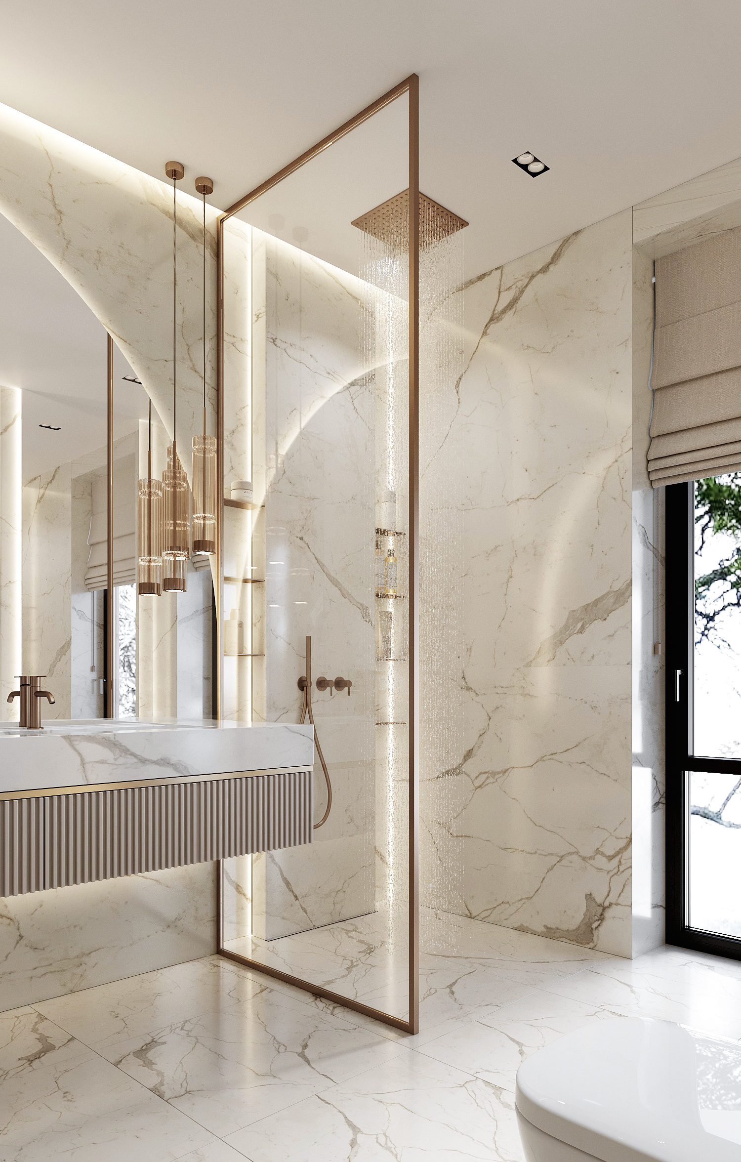 Концепция: Соединение контрастов: Дерзость форм (мраморная стена-артобъект, открытая ванная) и минимализм линий (чистые геометрические объемы) Театральность (игра света, круговой камин как центр композиции) и рациональность (эргономичное зонирование, скрытые системы хранения) Ручная работа (гипсовая лепнина, созданная на месте) и современные технологии (интегрированные инженерные решения)