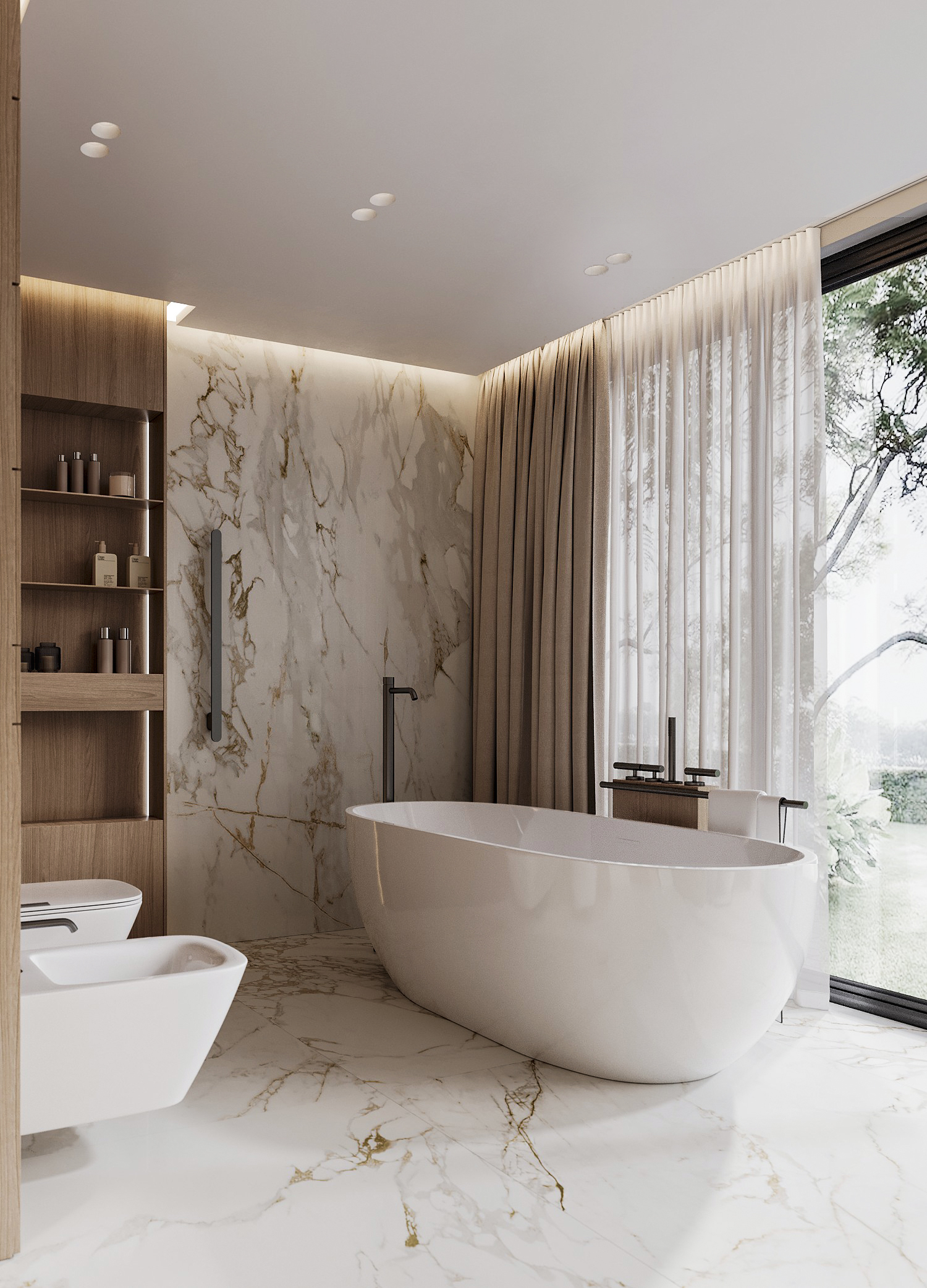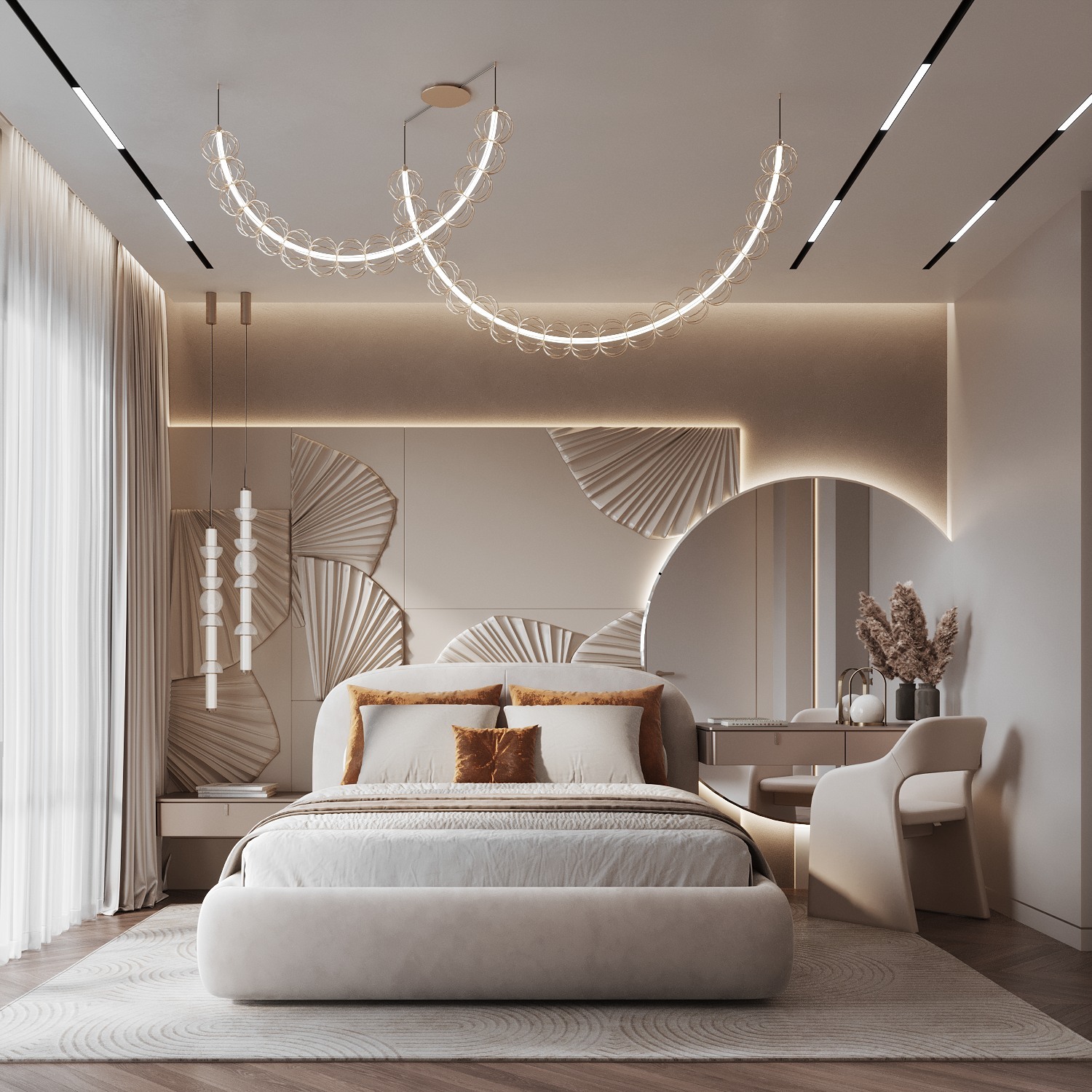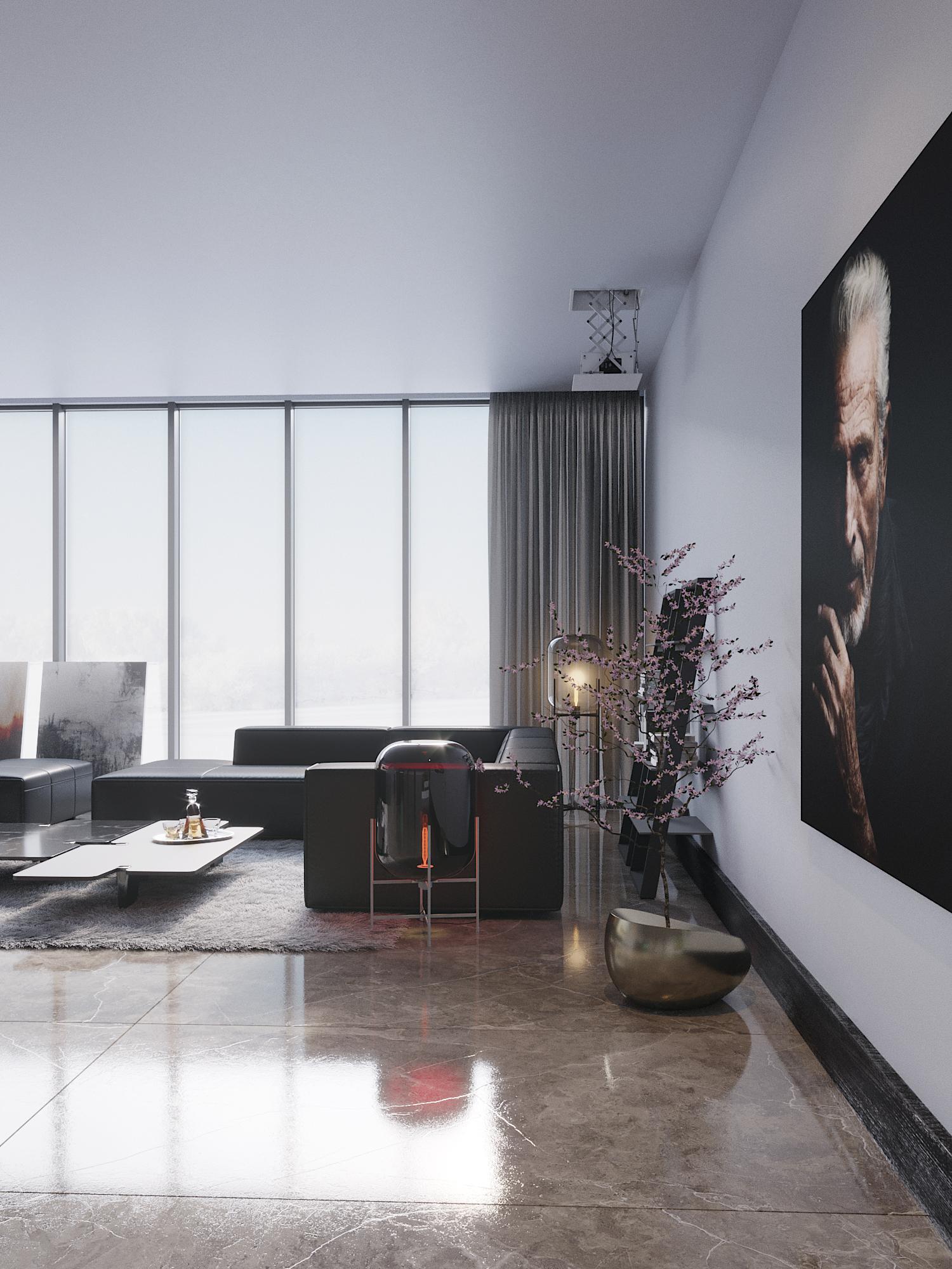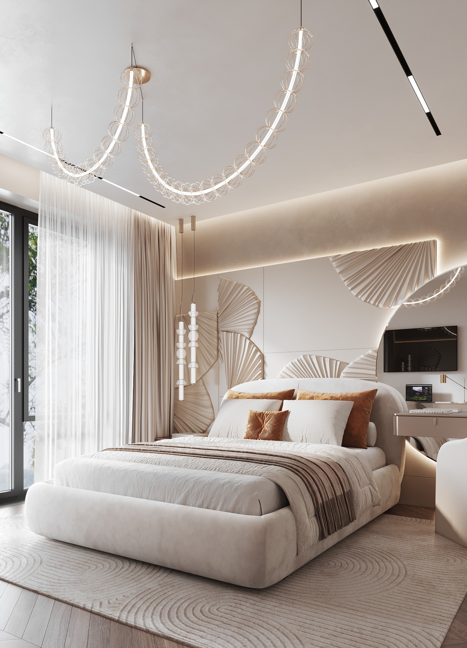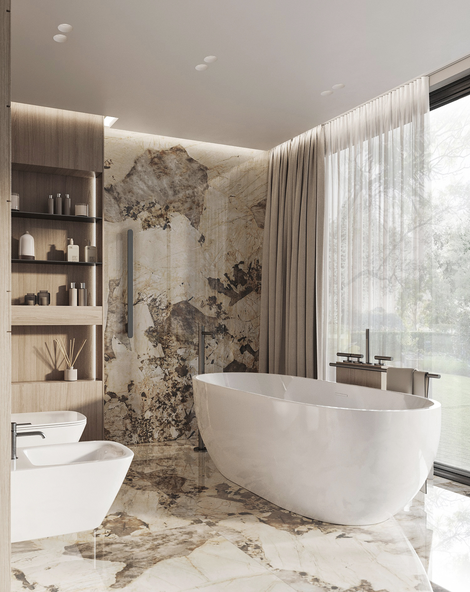 Концепция: Соединение контрастов: Дерзость форм (мраморная стена-артобъект, открытая ванная) и минимализм линий (чистые геометрические объемы) Театральность (игра света, круговой камин как центр композиции) и рациональность (эргономичное зонирование, скрытые системы хранения) Ручная работа (гипсовая лепнина, созданная на месте) и современные технологии (интегрированные инженерные решения)