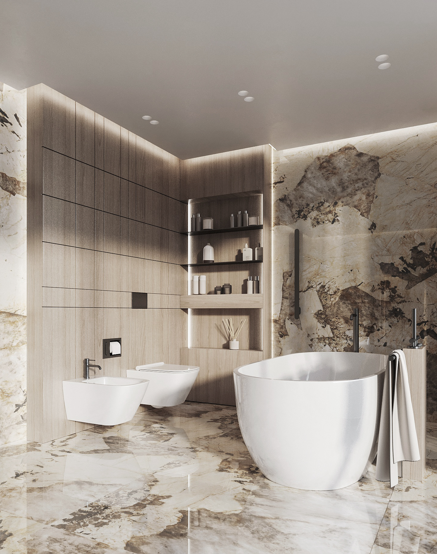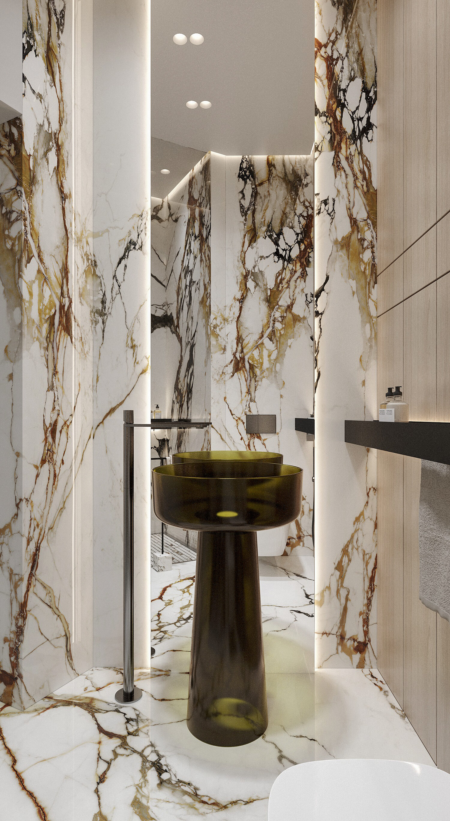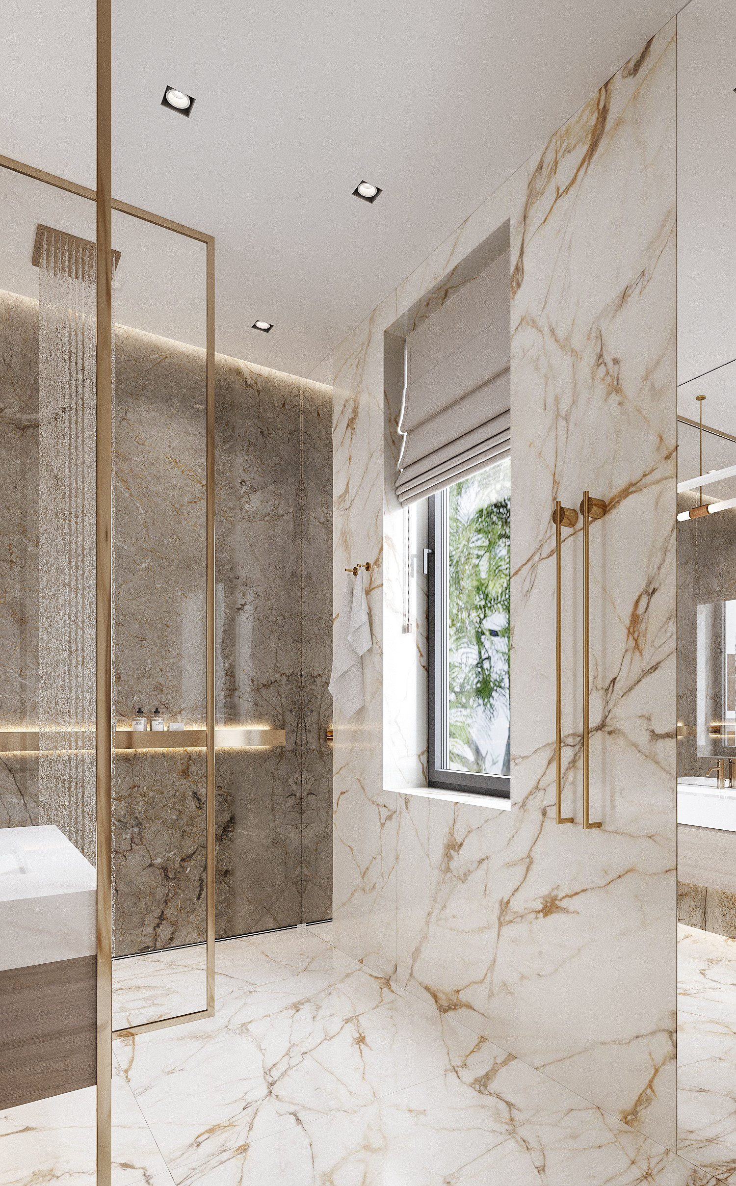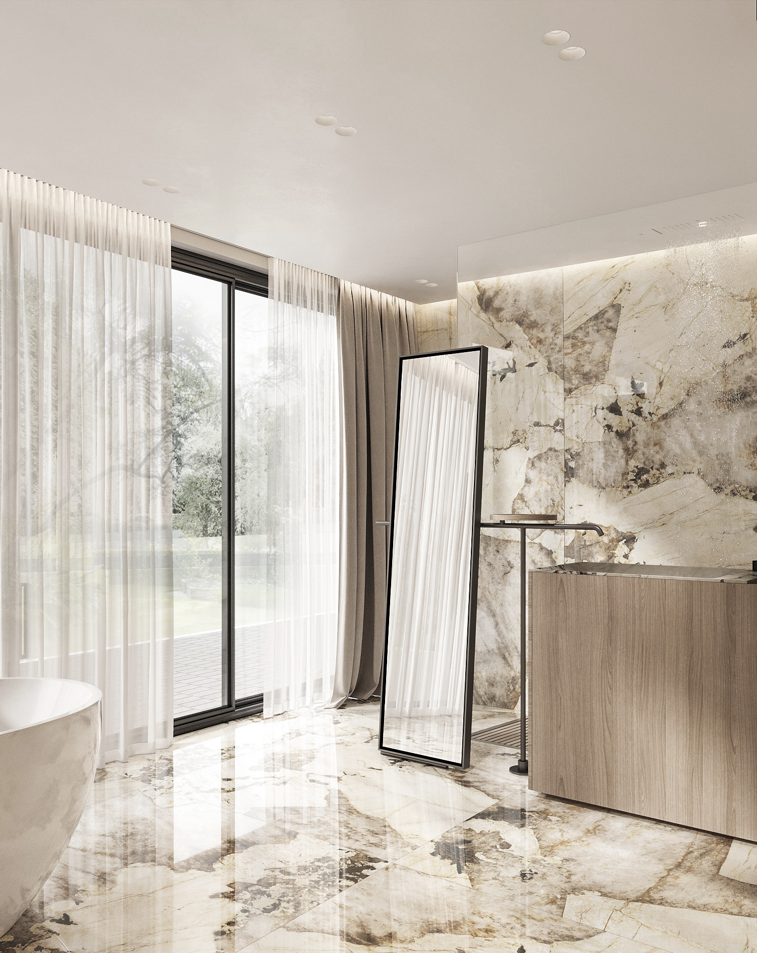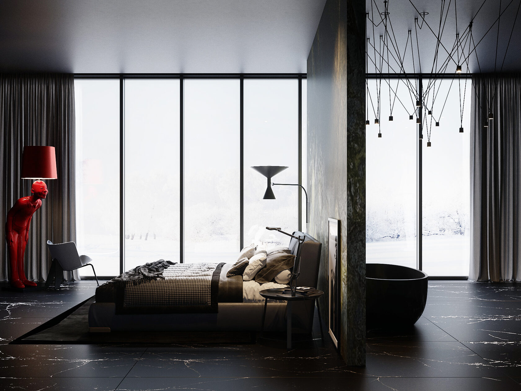 Концепция: Соединение контрастов: Дерзость форм (мраморная стена-артобъект, открытая ванная) и минимализм линий (чистые геометрические объемы) Театральность (игра света, круговой камин как центр композиции) и рациональность (эргономичное зонирование, скрытые системы хранения) Ручная работа (гипсовая лепнина, созданная на месте) и современные технологии (интегрированные инженерные решения)