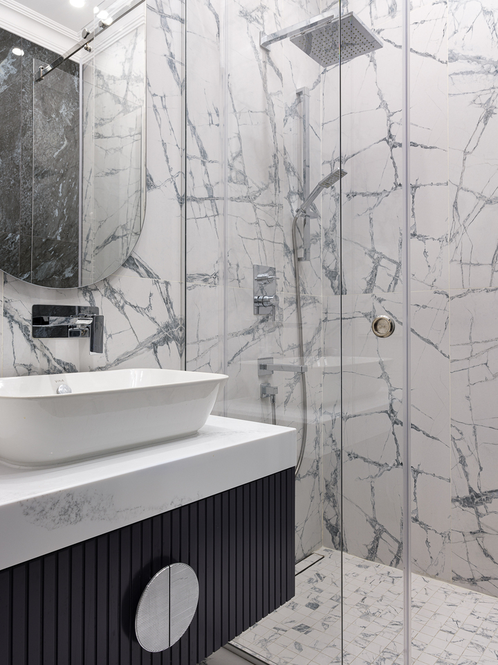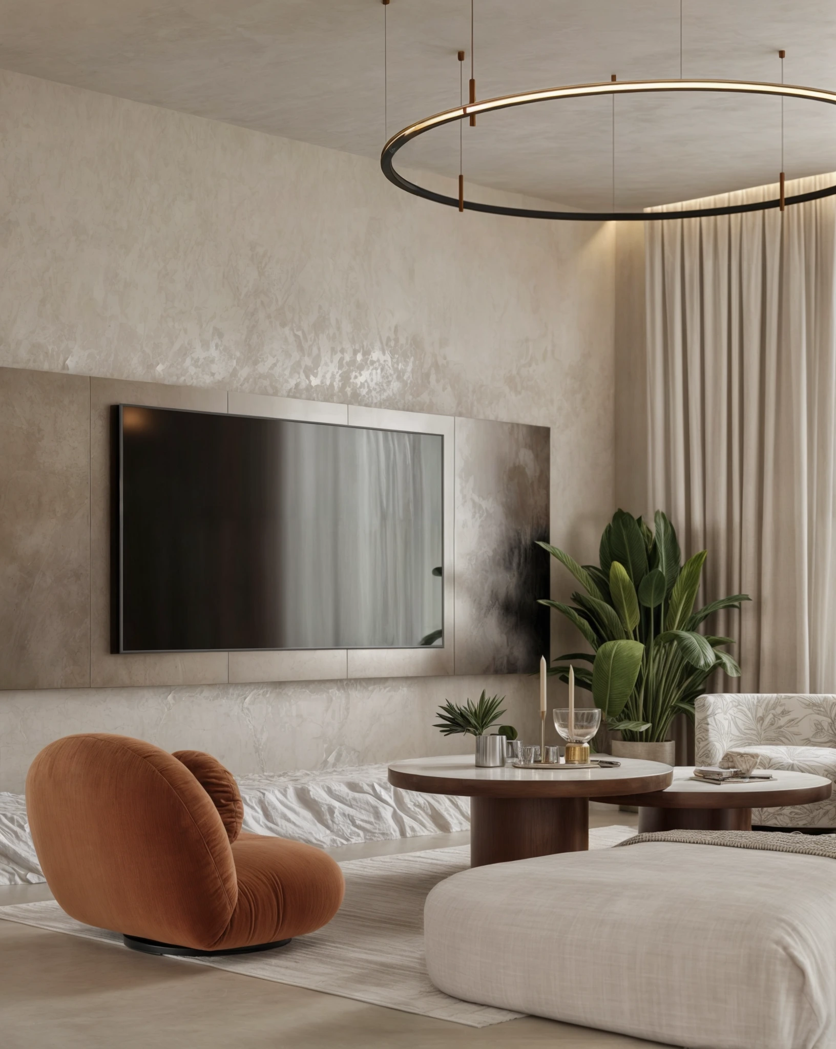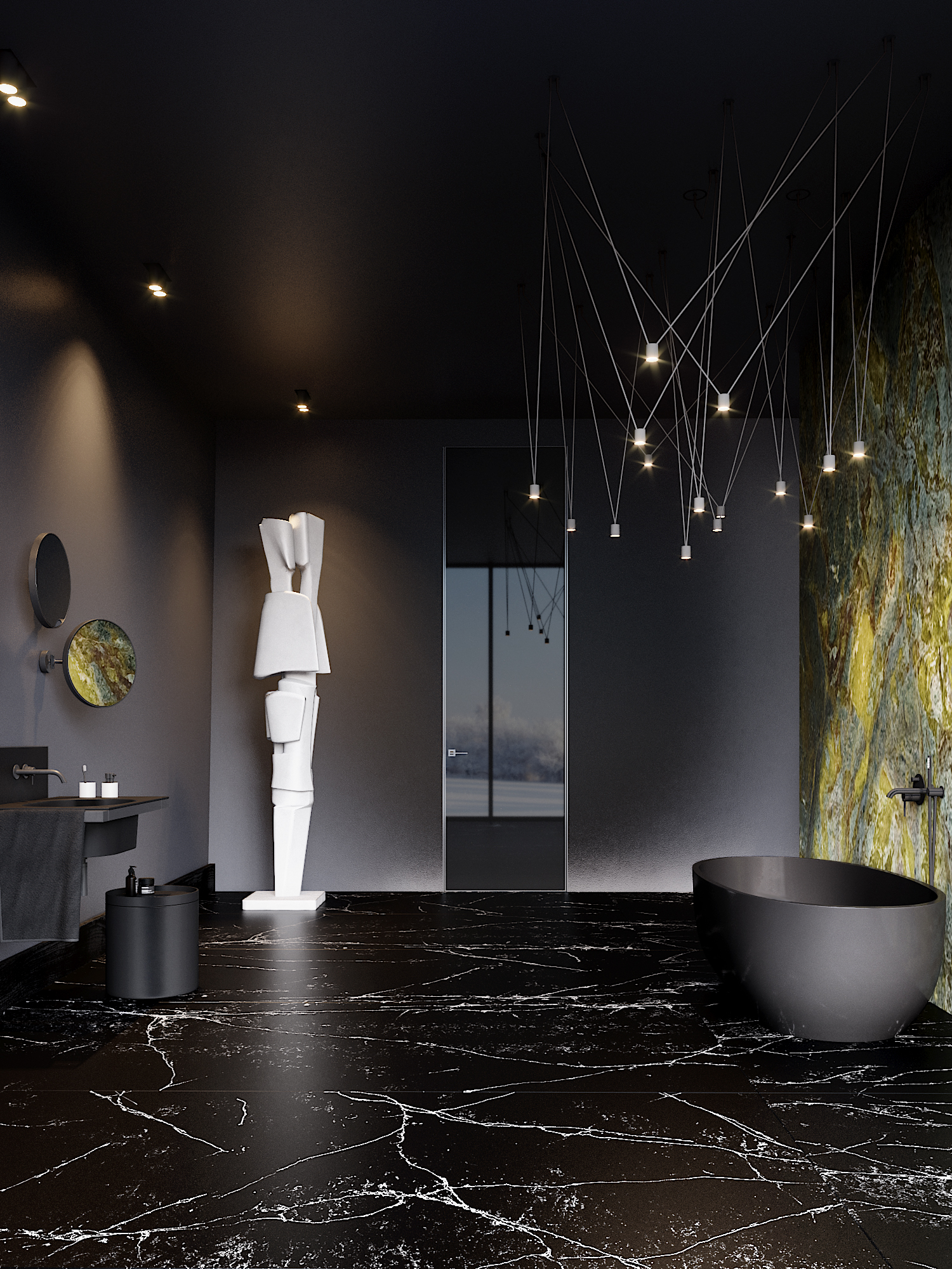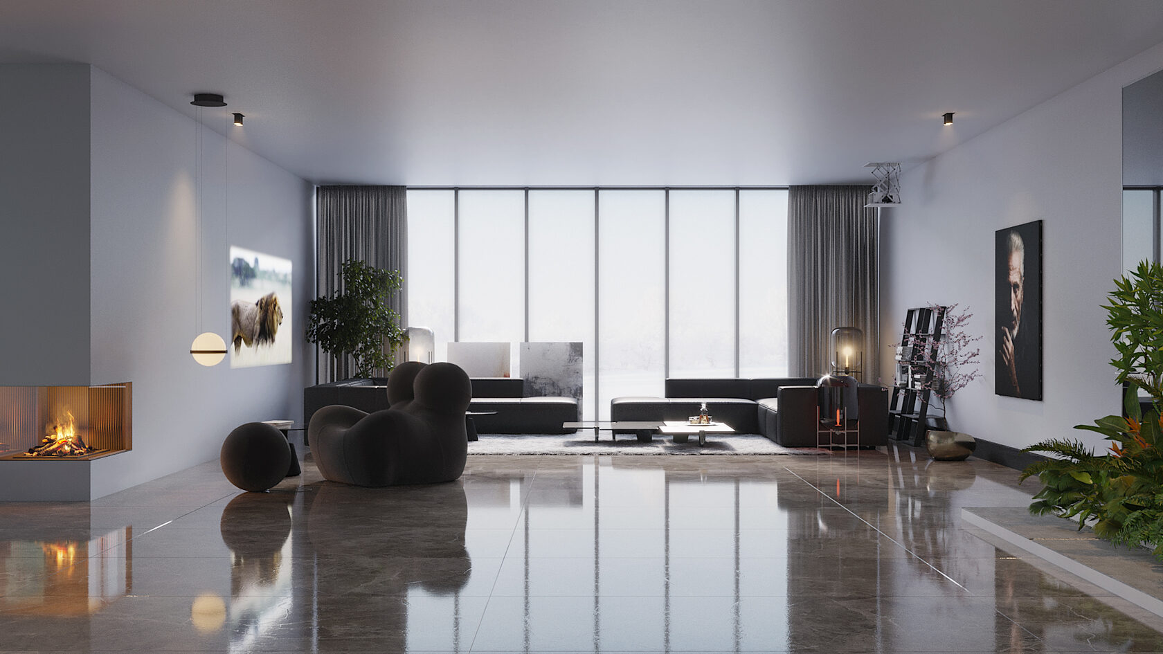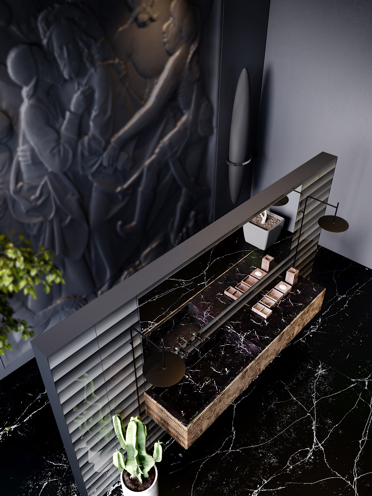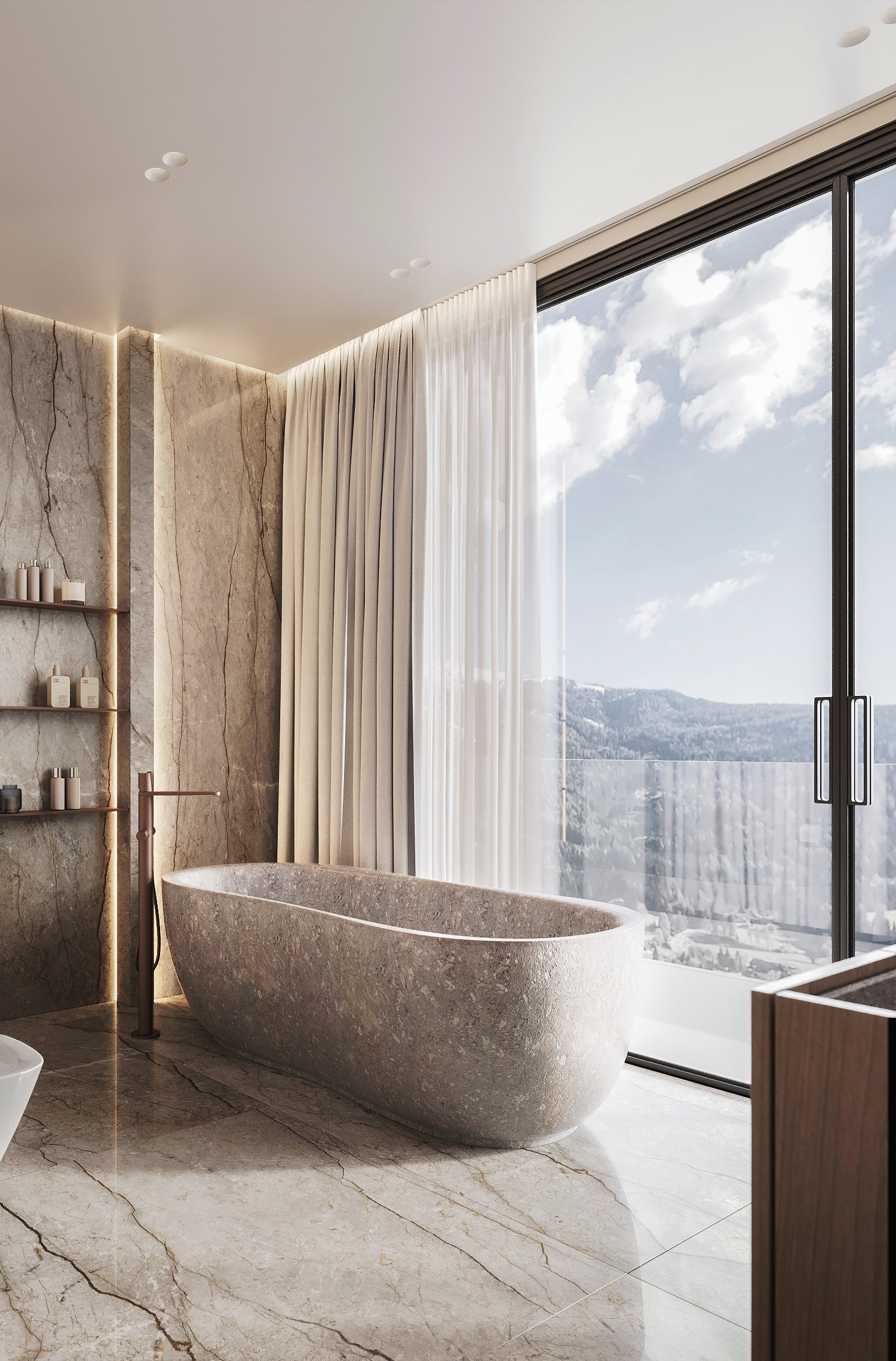 Концепция: Соединение контрастов: Дерзость форм (мраморная стена-артобъект, открытая ванная) и минимализм линий (чистые геометрические объемы) Театральность (игра света, круговой камин как центр композиции) и рациональность (эргономичное зонирование, скрытые системы хранения) Ручная работа (гипсовая лепнина, созданная на месте) и современные технологии (интегрированные инженерные решения)