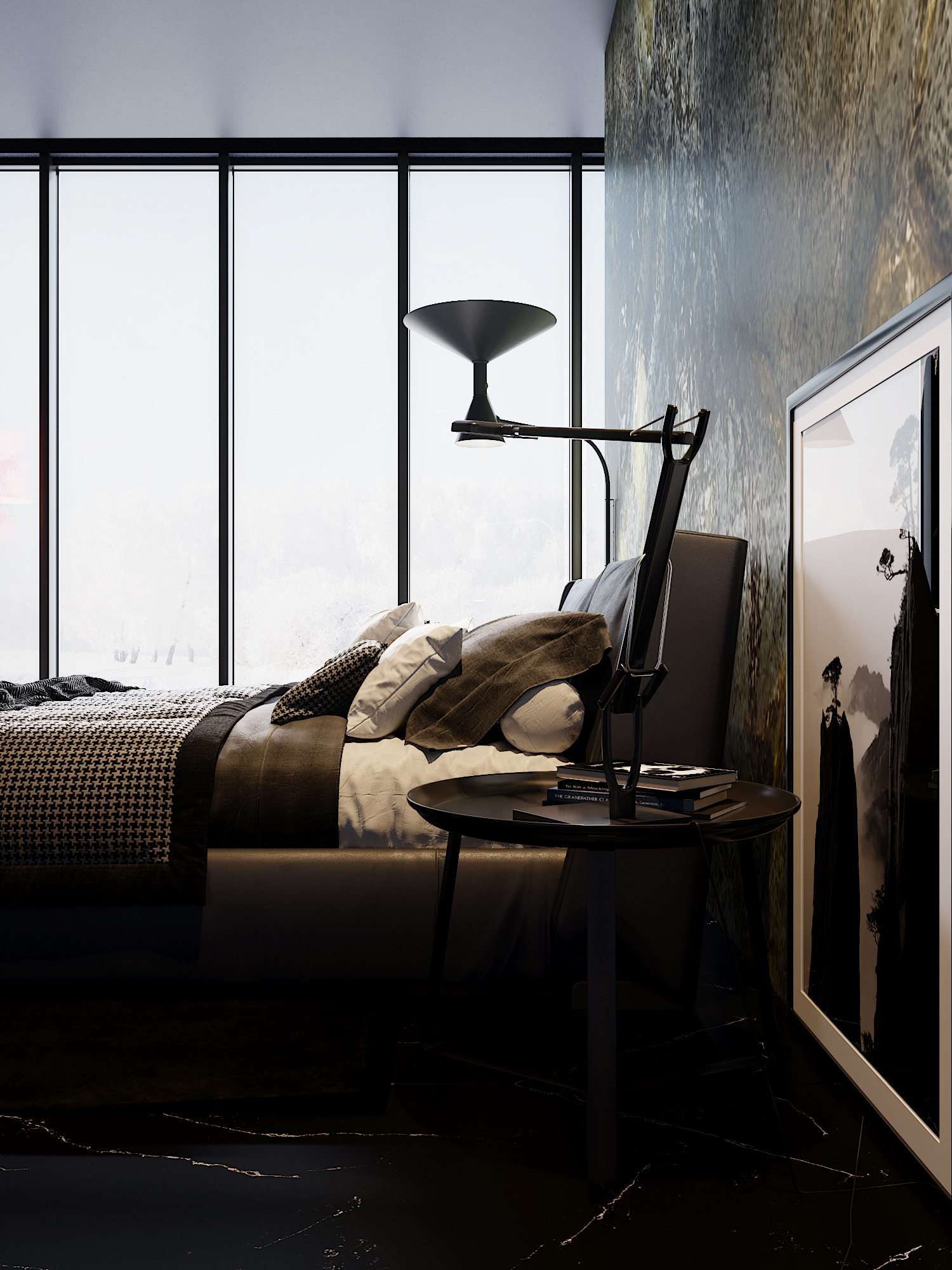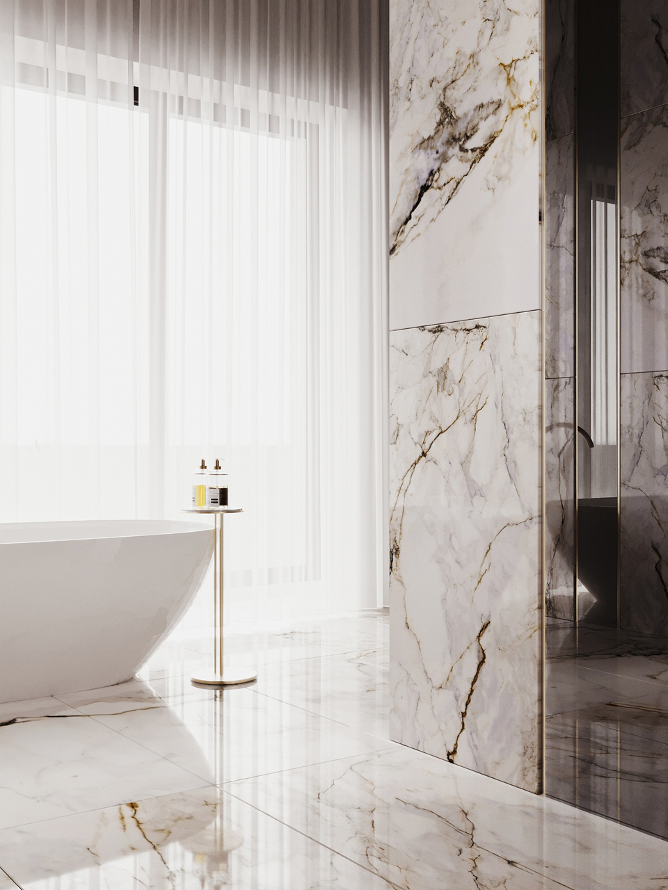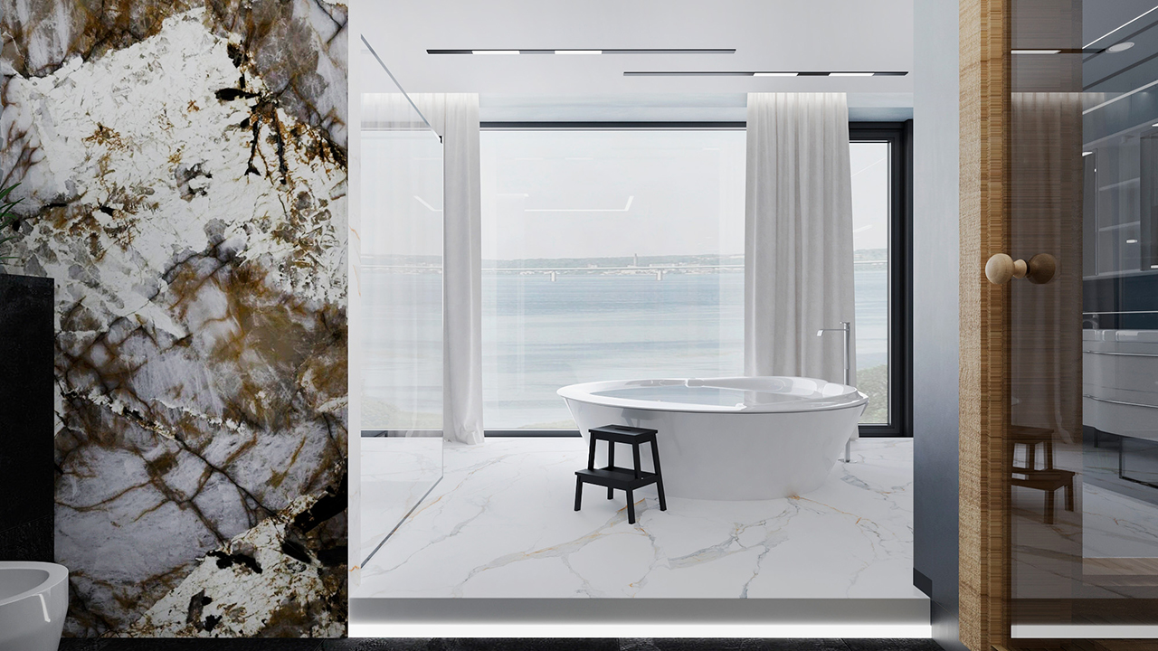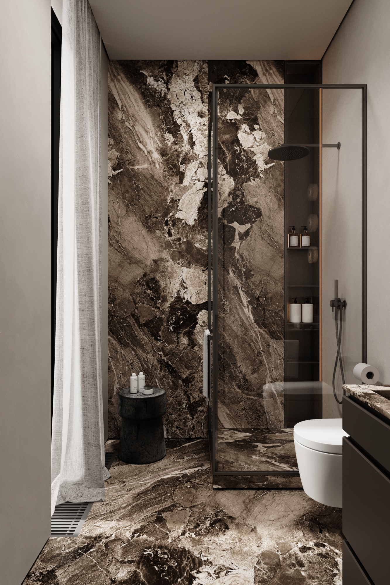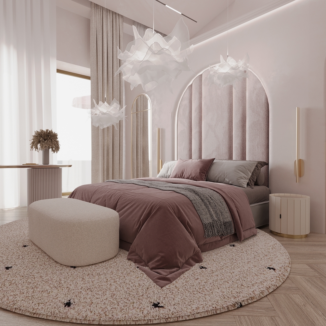 Концепция: Соединение контрастов: Дерзость форм (мраморная стена-артобъект, открытая ванная) и минимализм линий (чистые геометрические объемы) Театральность (игра света, круговой камин как центр композиции) и рациональность (эргономичное зонирование, скрытые системы хранения) Ручная работа (гипсовая лепнина, созданная на месте) и современные технологии (интегрированные инженерные решения)