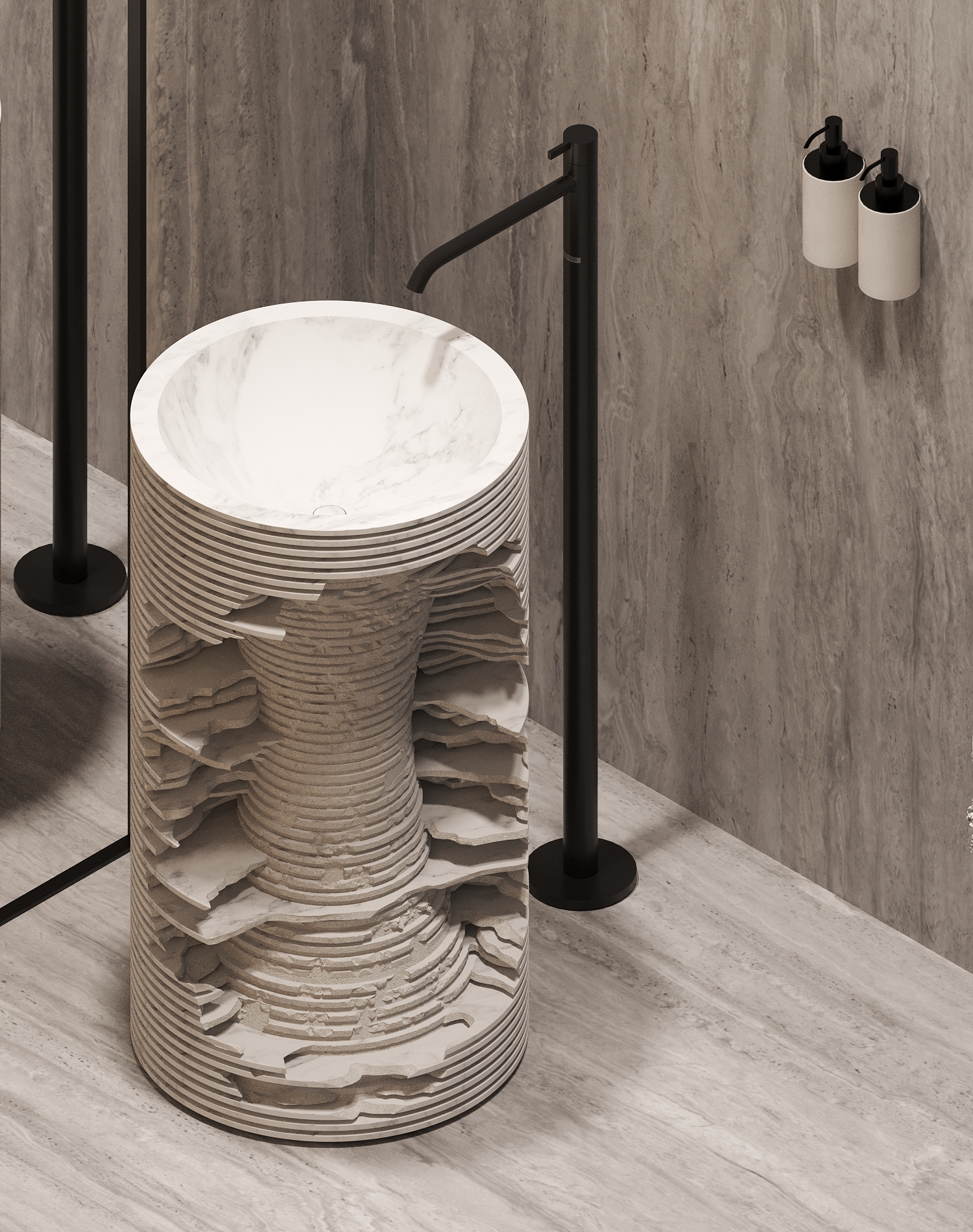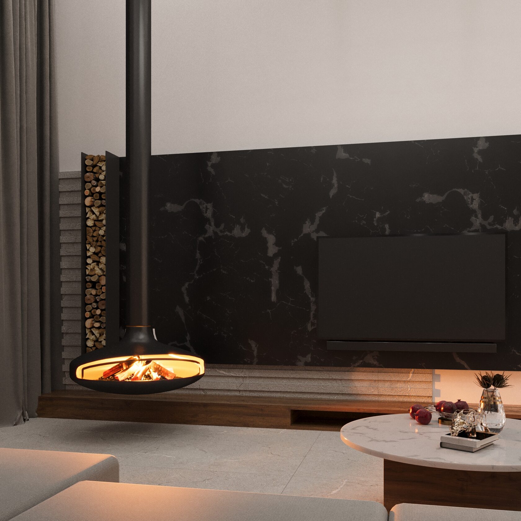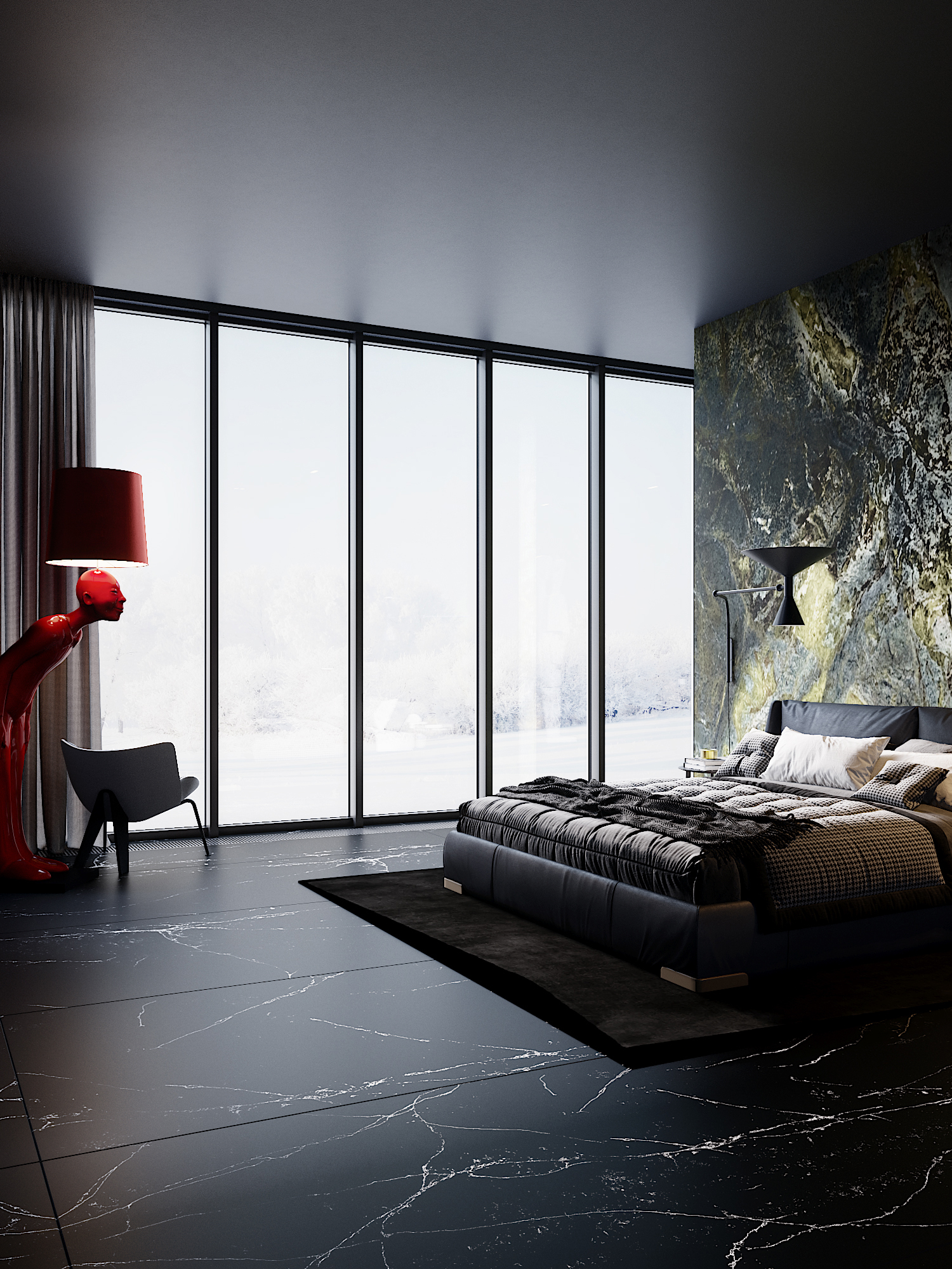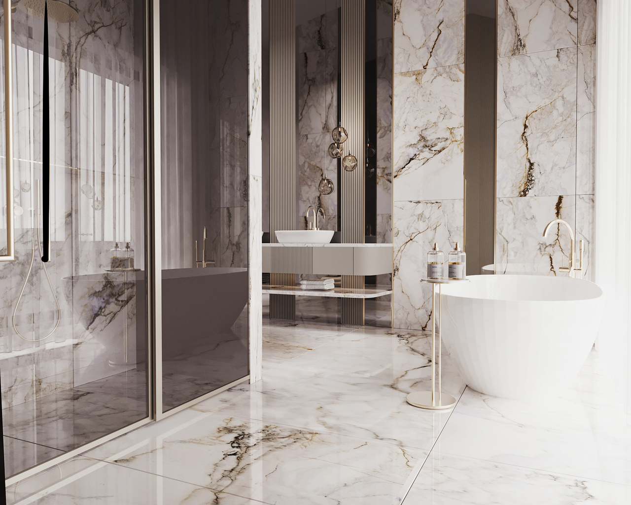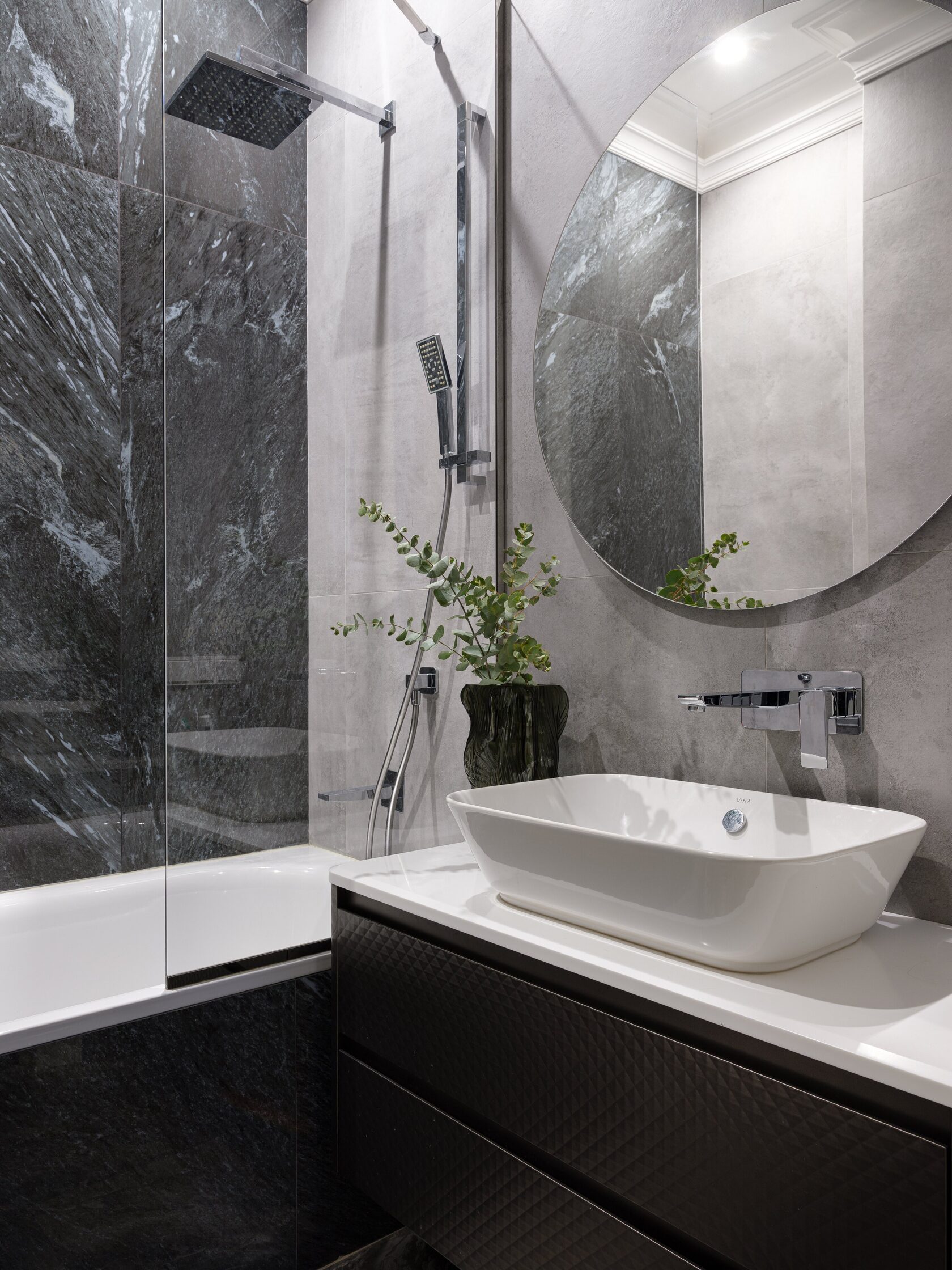 Концепция: Соединение контрастов: Дерзость форм (мраморная стена-артобъект, открытая ванная) и минимализм линий (чистые геометрические объемы) Театральность (игра света, круговой камин как центр композиции) и рациональность (эргономичное зонирование, скрытые системы хранения) Ручная работа (гипсовая лепнина, созданная на месте) и современные технологии (интегрированные инженерные решения)