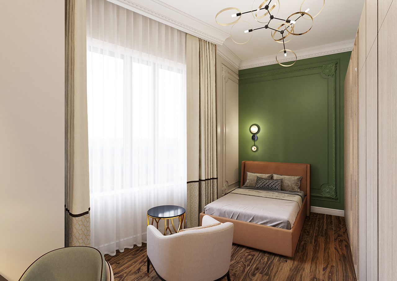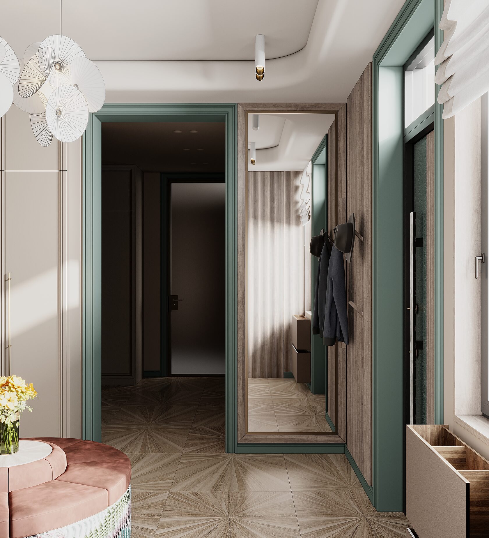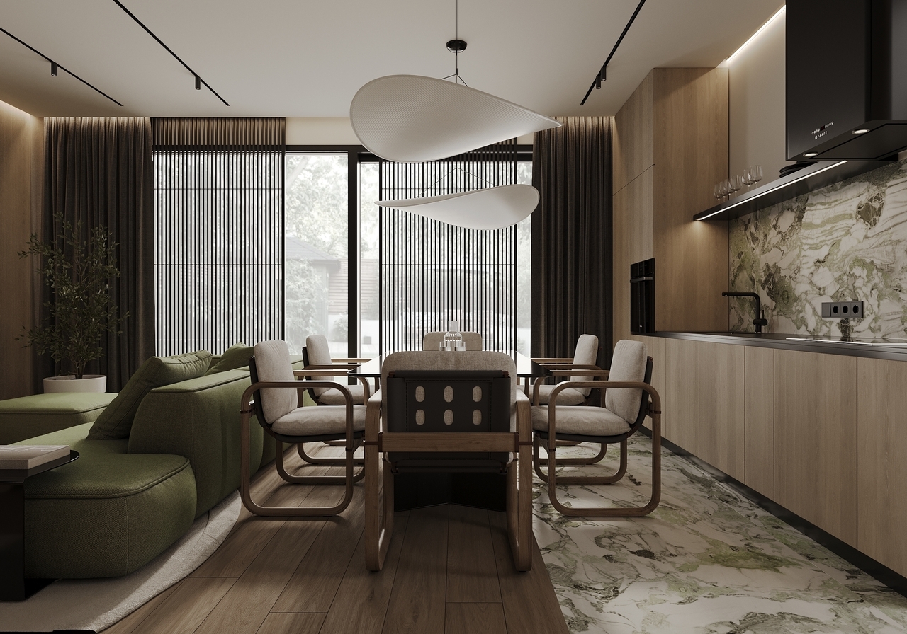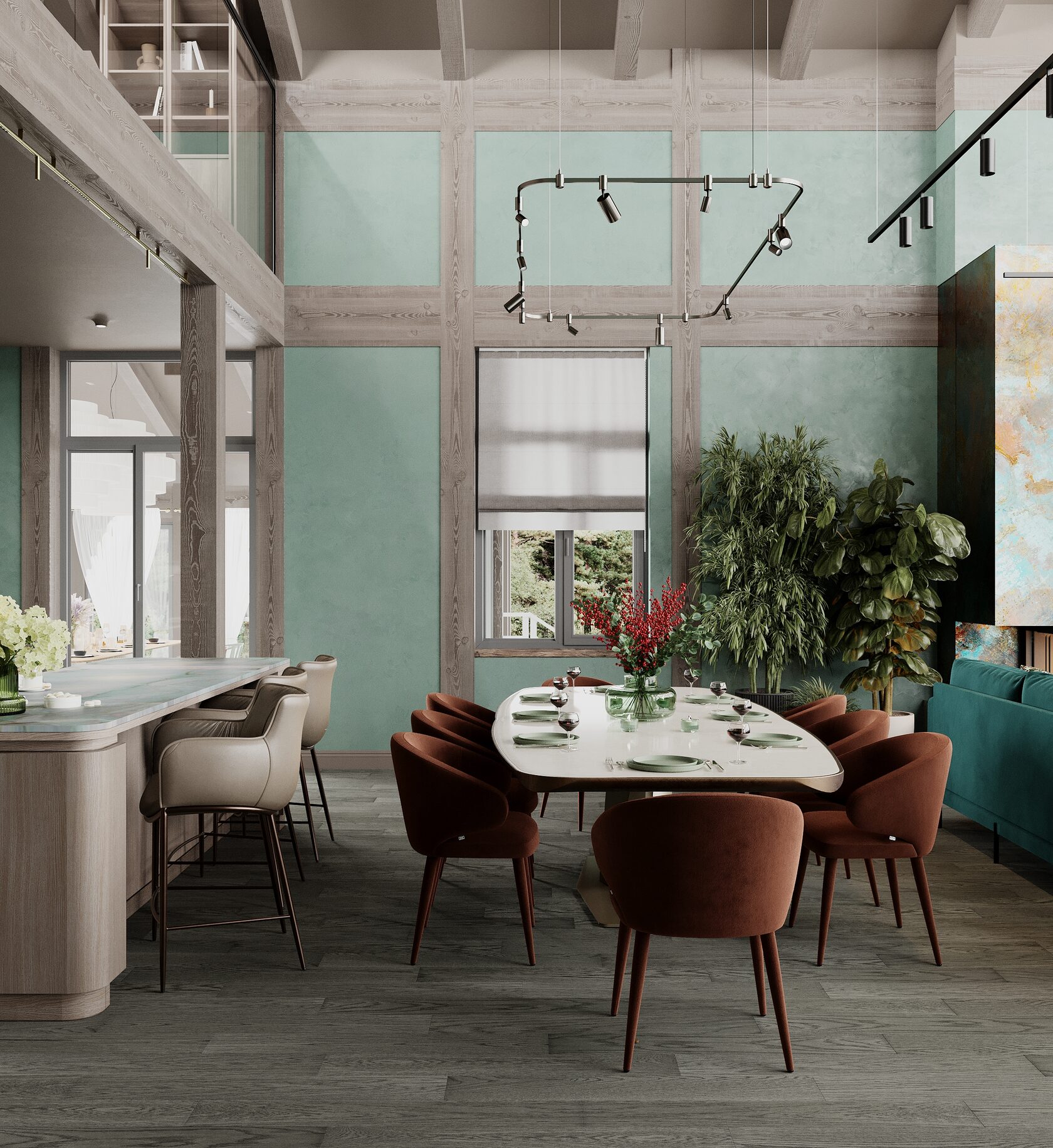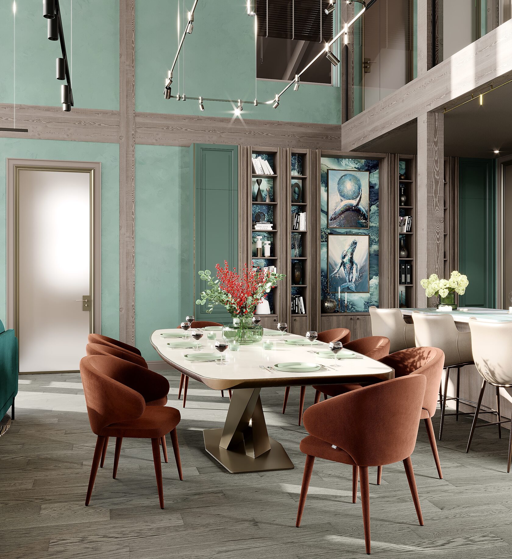 Концепция: Ключевая концепция заключалась в деликатной интеграции любимого изумрудного цвета заказчицы, который перестал быть просто акцентом, превратившись в неотъемлемую часть общей атмосферы. Эклектичный интерьер гармонично сочетает современные материалы с классическими формами, создавая притягательное пространство, соответствующее передовым тенденциям дизайна.