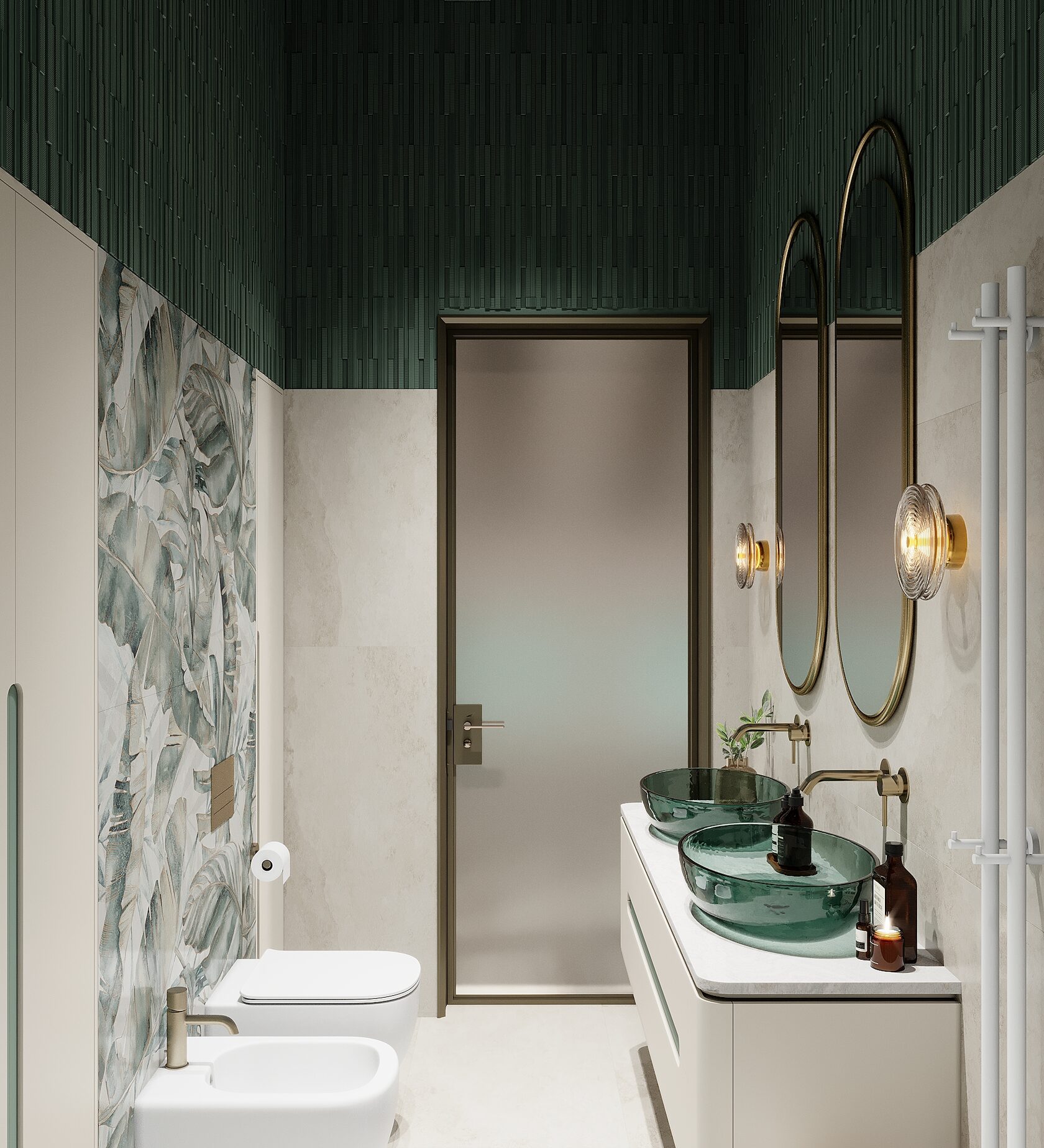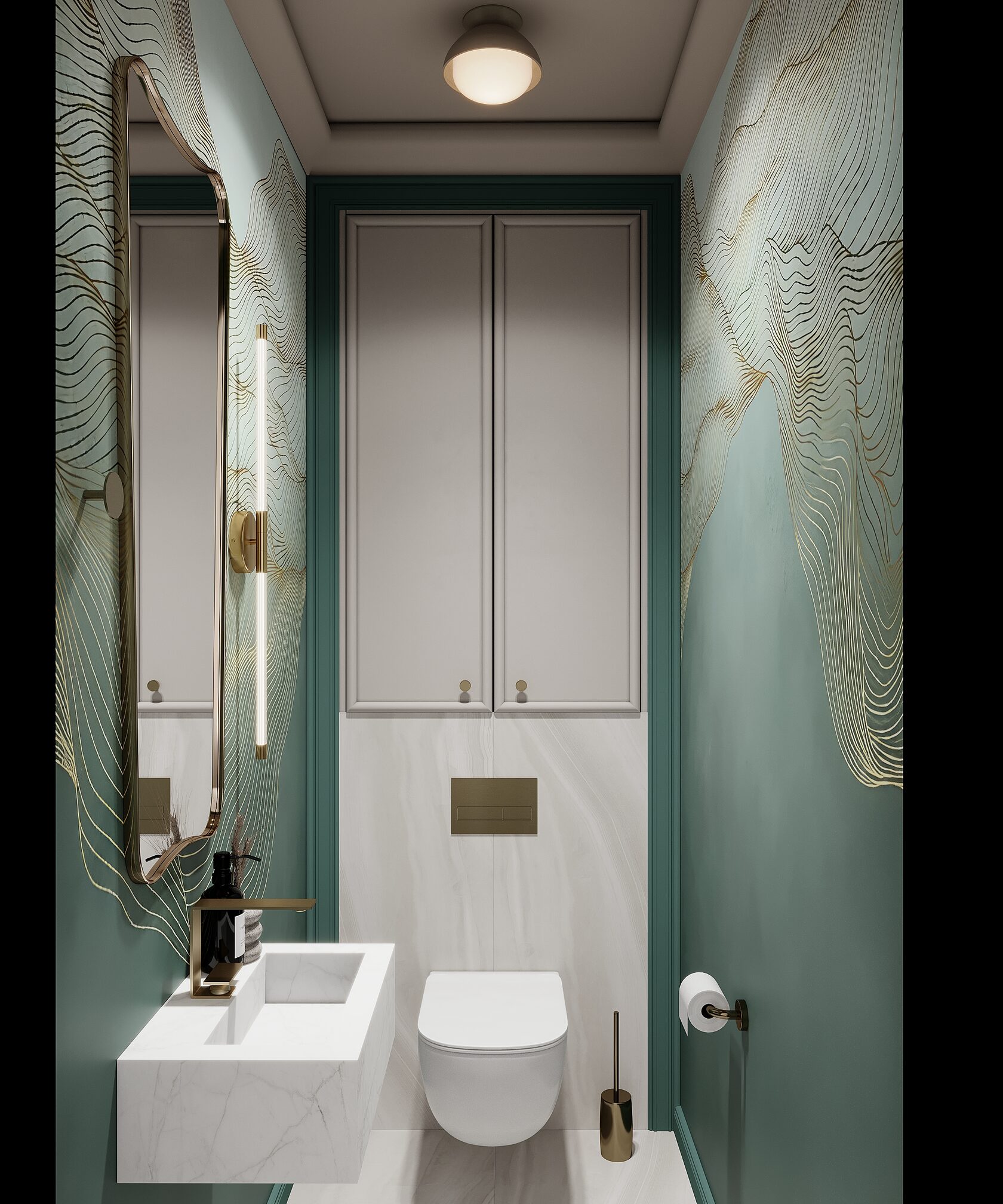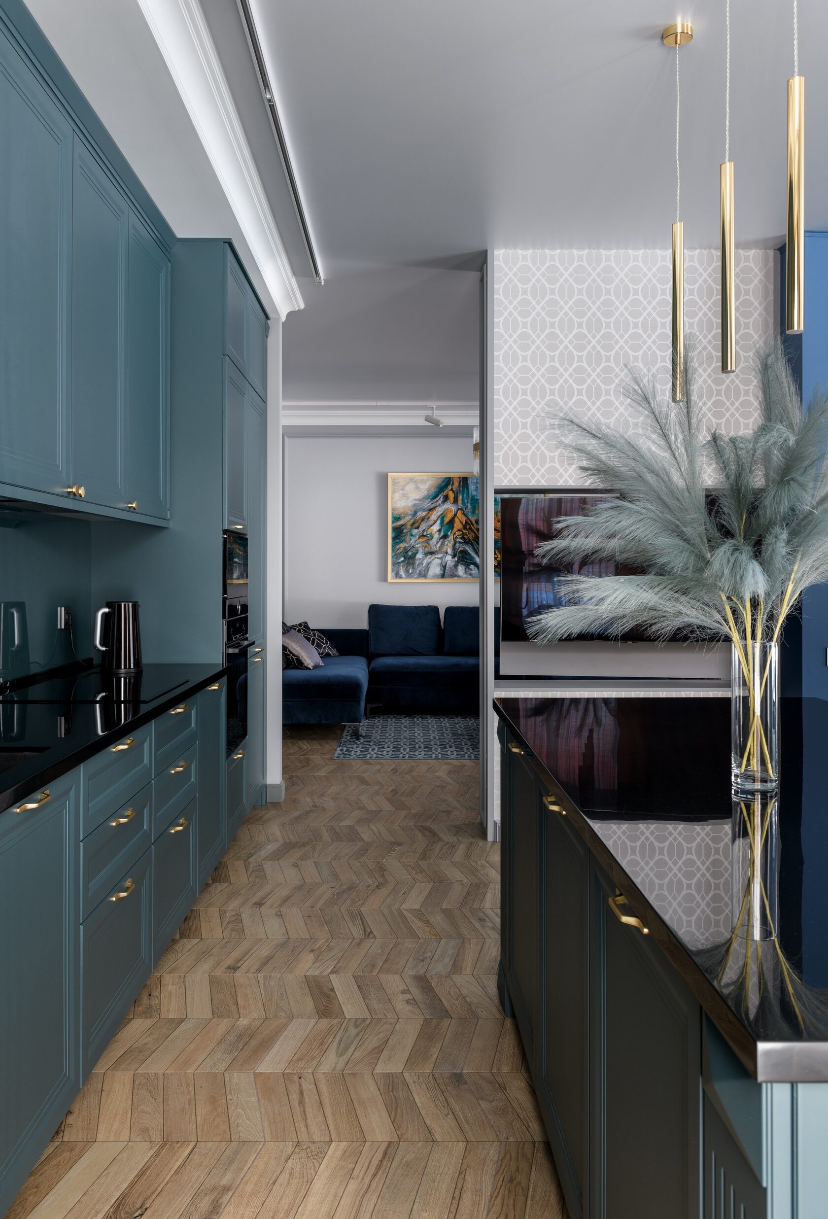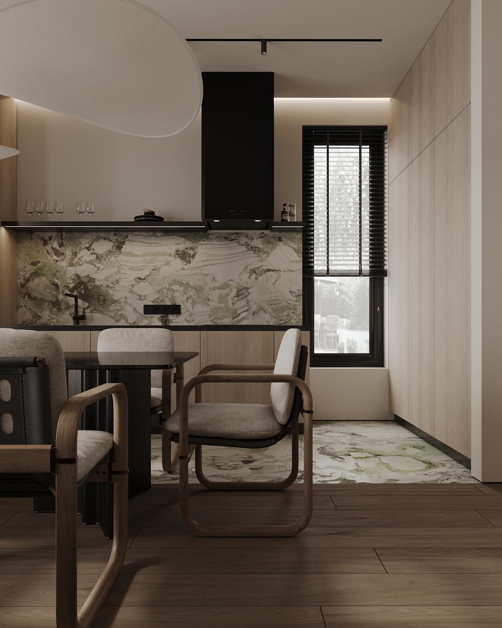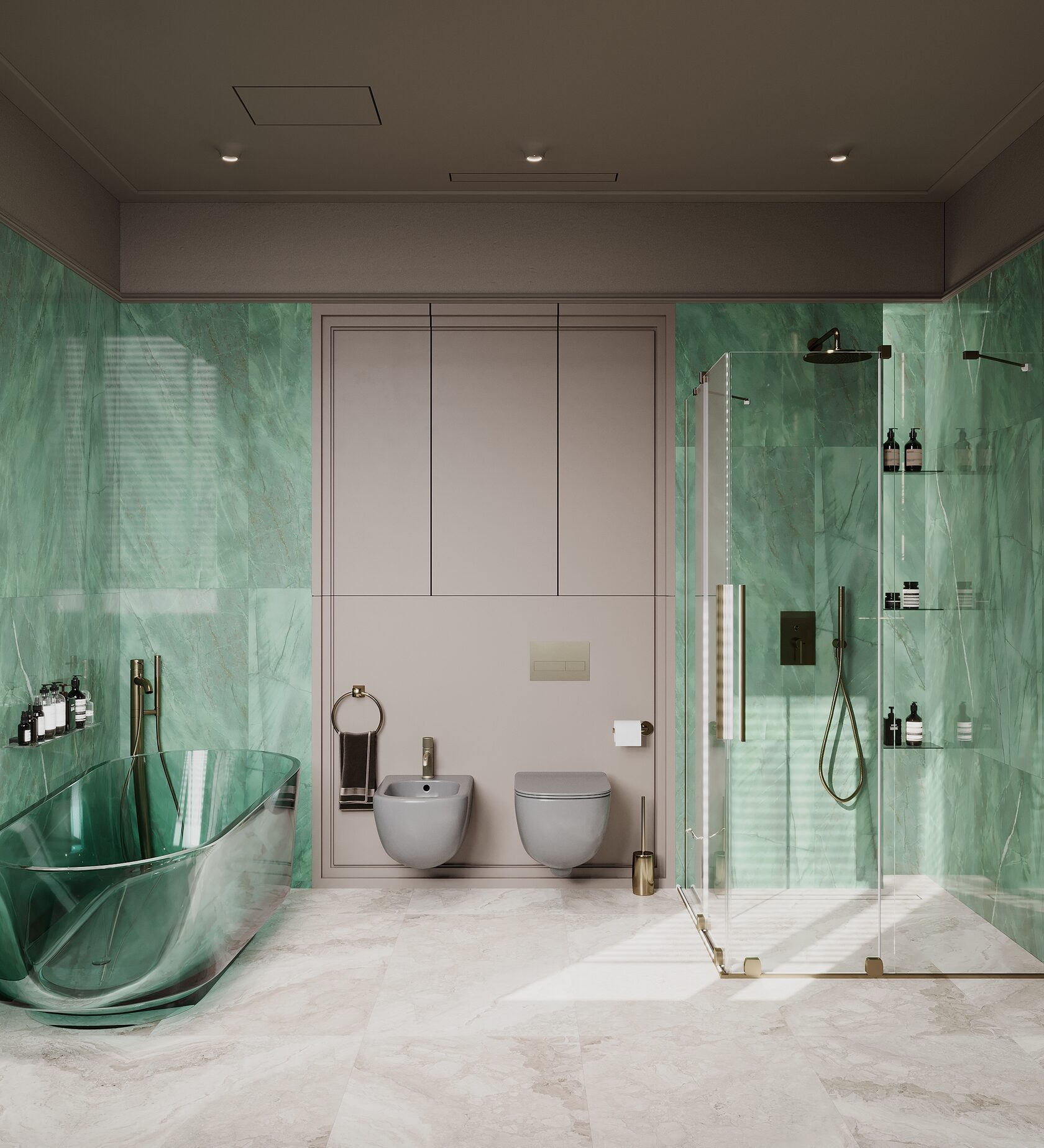 Концепция: Ключевая концепция заключалась в деликатной интеграции любимого изумрудного цвета заказчицы, который перестал быть просто акцентом, превратившись в неотъемлемую часть общей атмосферы. Эклектичный интерьер гармонично сочетает современные материалы с классическими формами, создавая притягательное пространство, соответствующее передовым тенденциям дизайна.