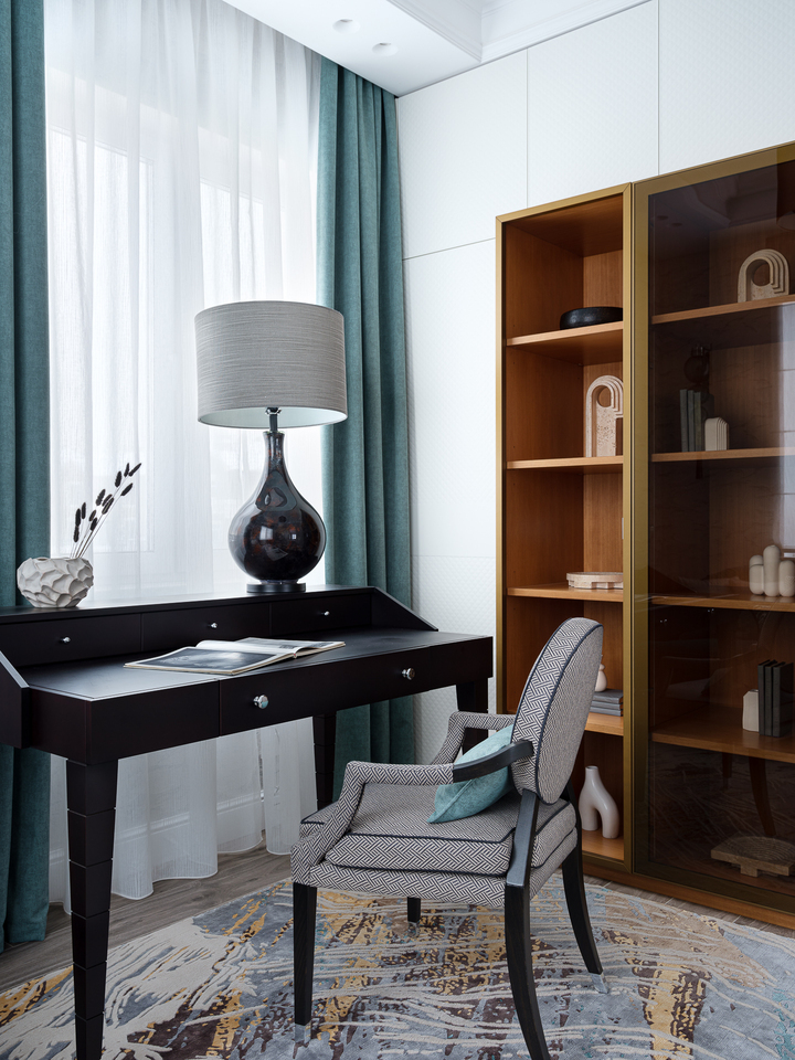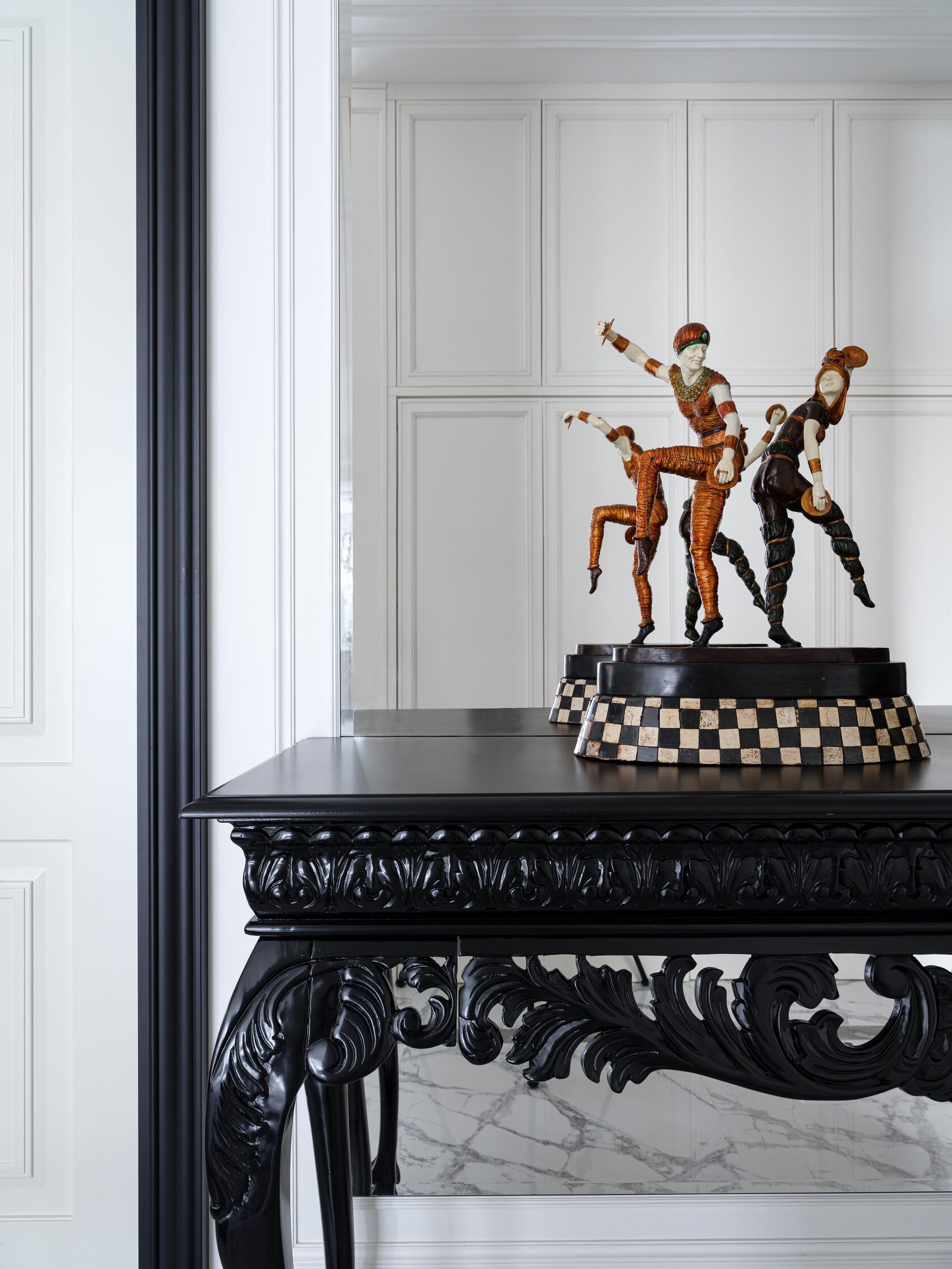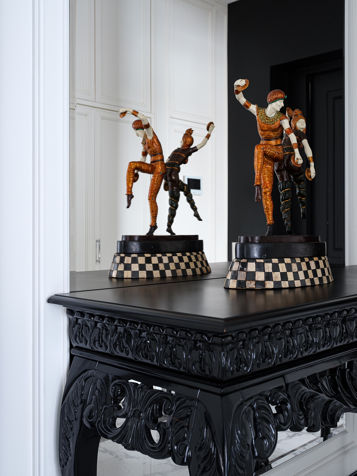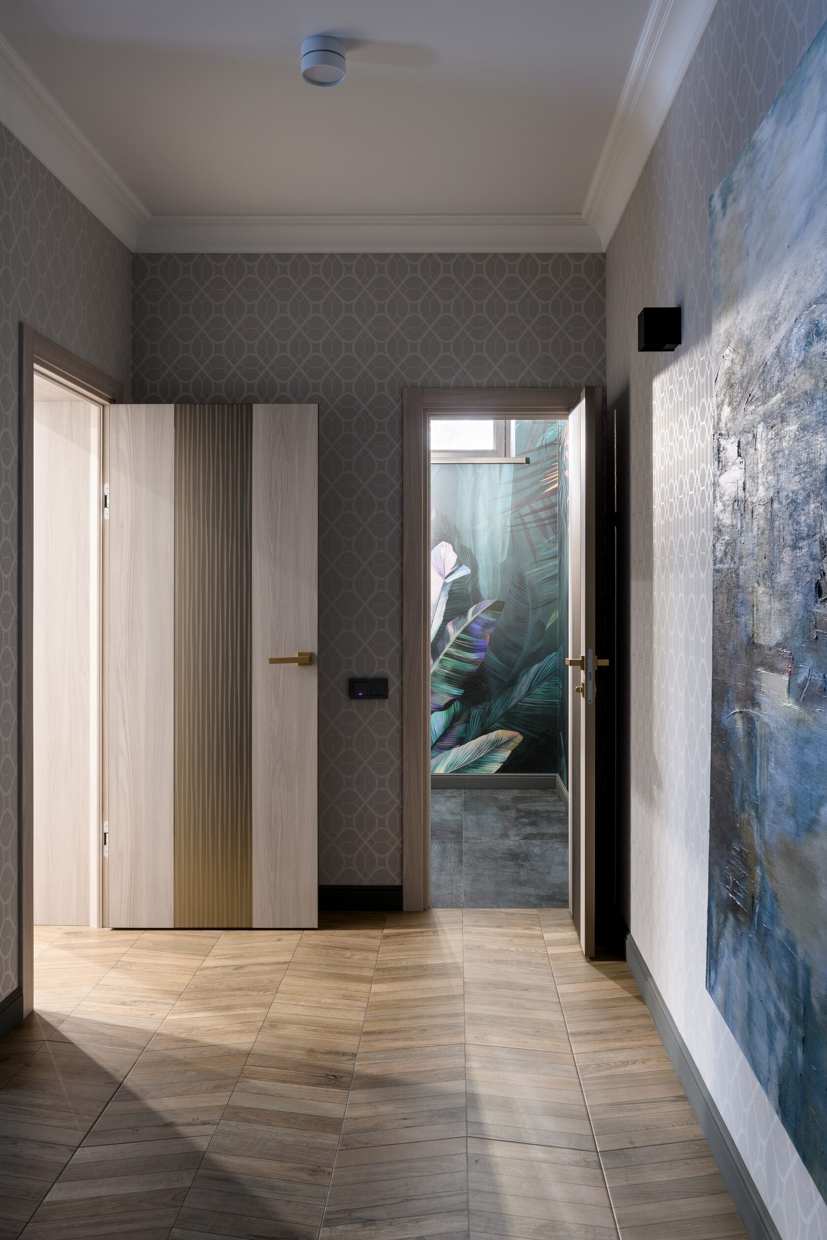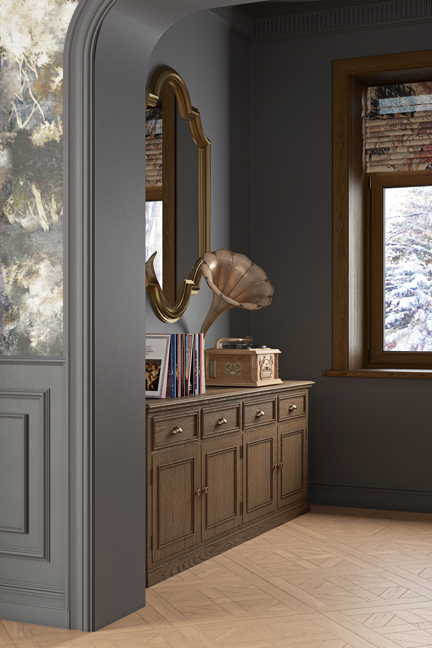 Декор: насыщенность, фактура, культурный код В отделке использованы премиальные материалы, художественные обои, резная мебель, текстиль ручной работы. В интерьере легко угадываются отсылки к японской эстетике, традиционной английской орнаментике и европейской классике. Особенно важную роль сыграла авторская мебель, изготовленная на заказ: от винного шкафа из антикварного стекла до уникальных стеллажей, арочных порталов и мягкой мебели с эксклюзивной обивкой.