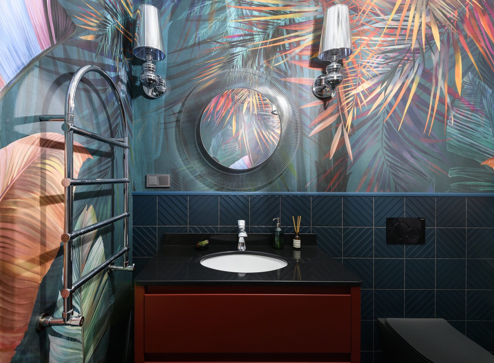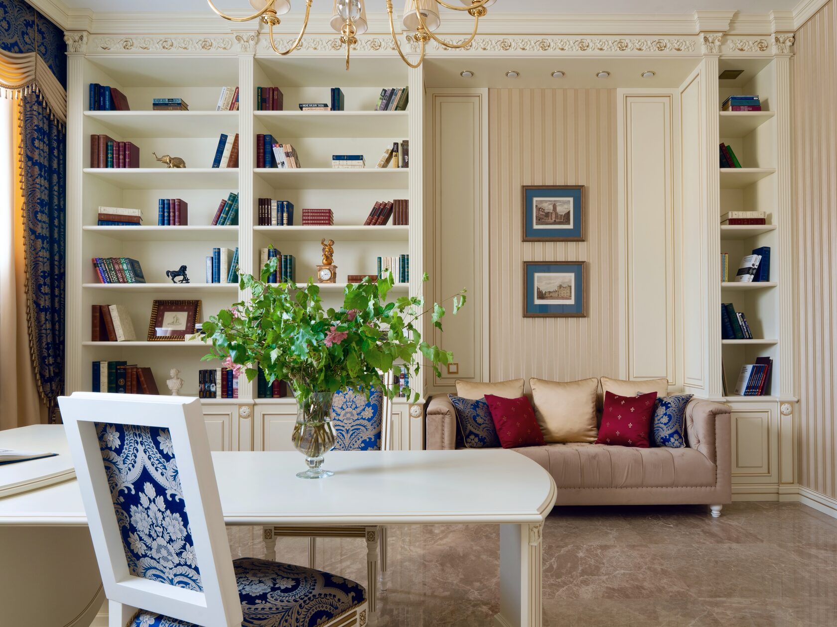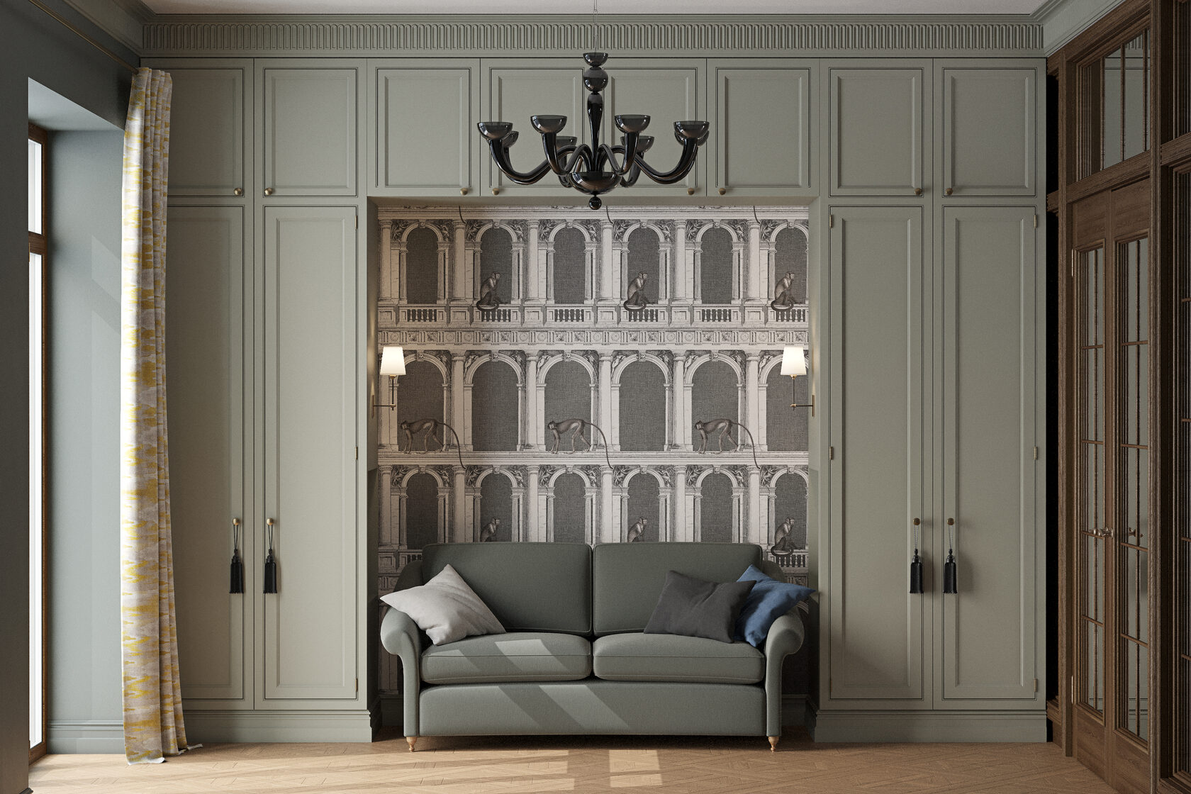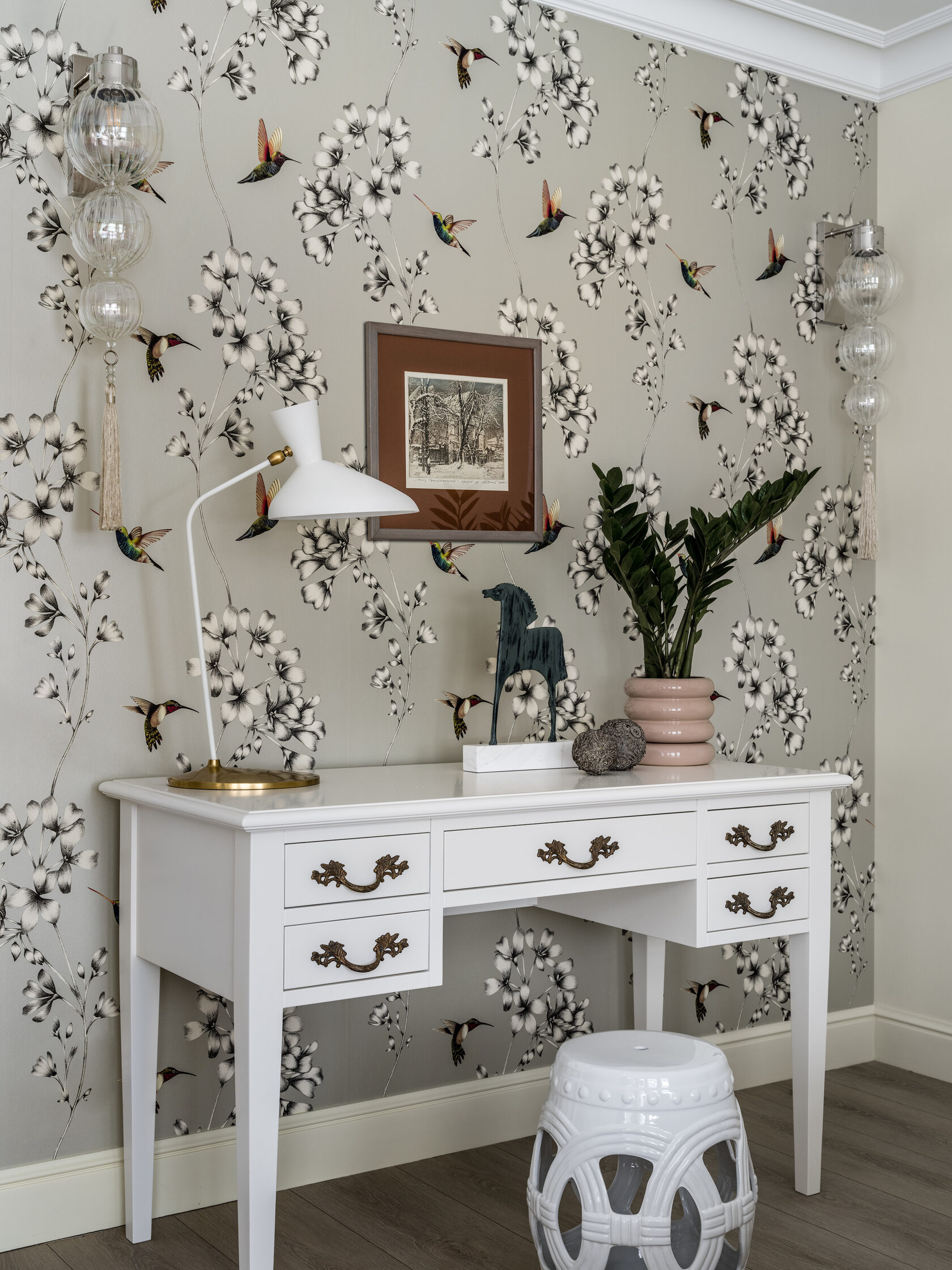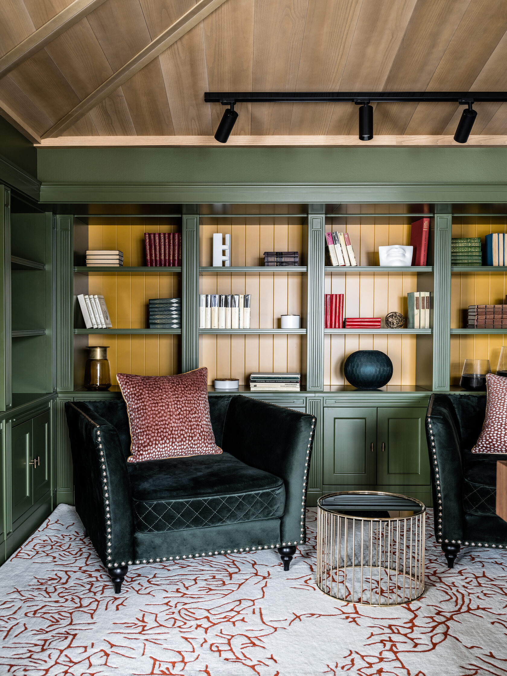 Декор: насыщенность, фактура, культурный код В отделке использованы премиальные материалы, художественные обои, резная мебель, текстиль ручной работы. В интерьере легко угадываются отсылки к японской эстетике, традиционной английской орнаментике и европейской классике. Особенно важную роль сыграла авторская мебель, изготовленная на заказ: от винного шкафа из антикварного стекла до уникальных стеллажей, арочных порталов и мягкой мебели с эксклюзивной обивкой.