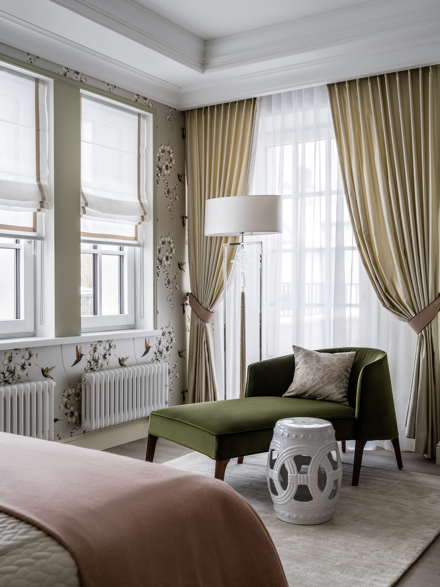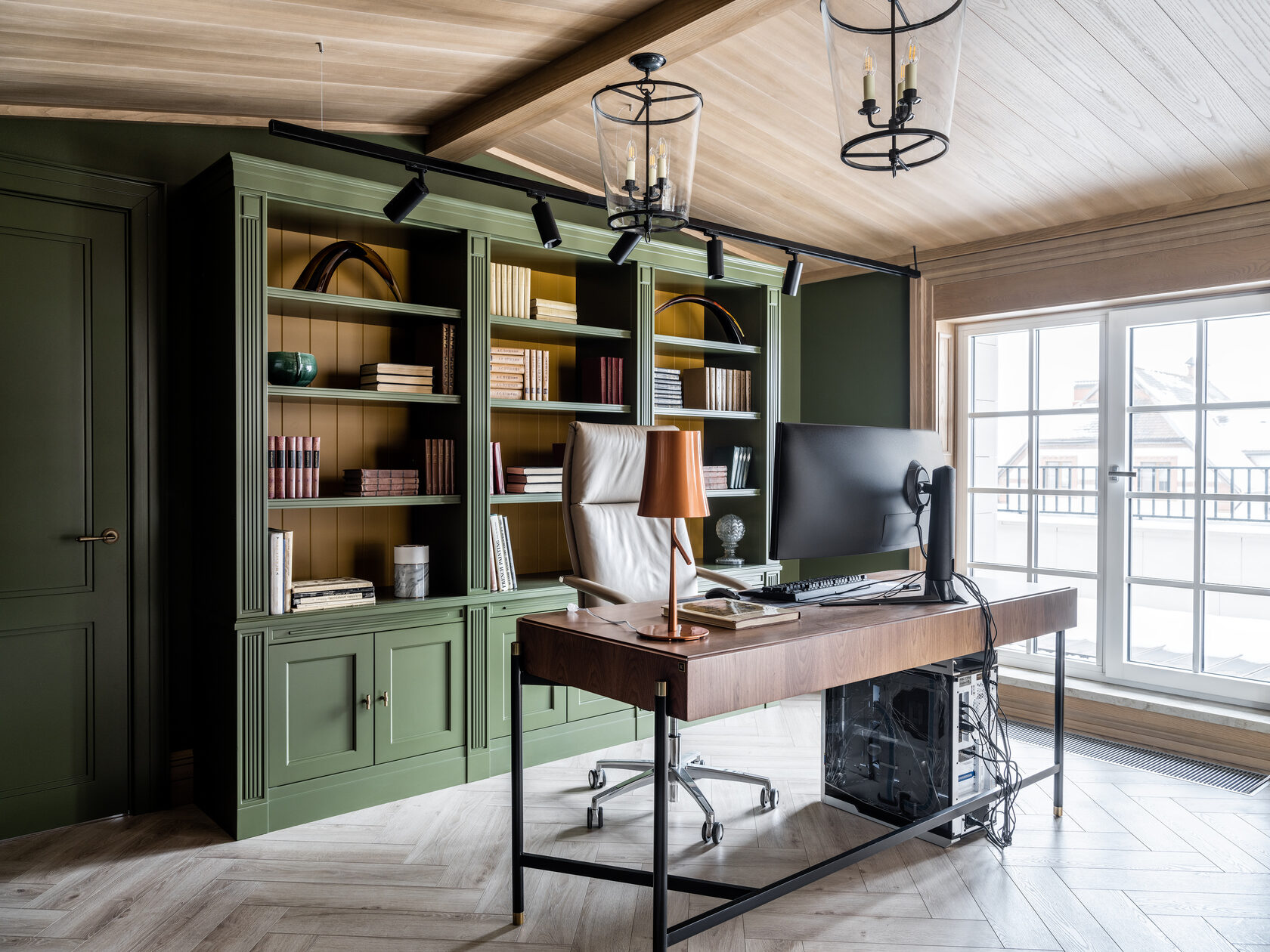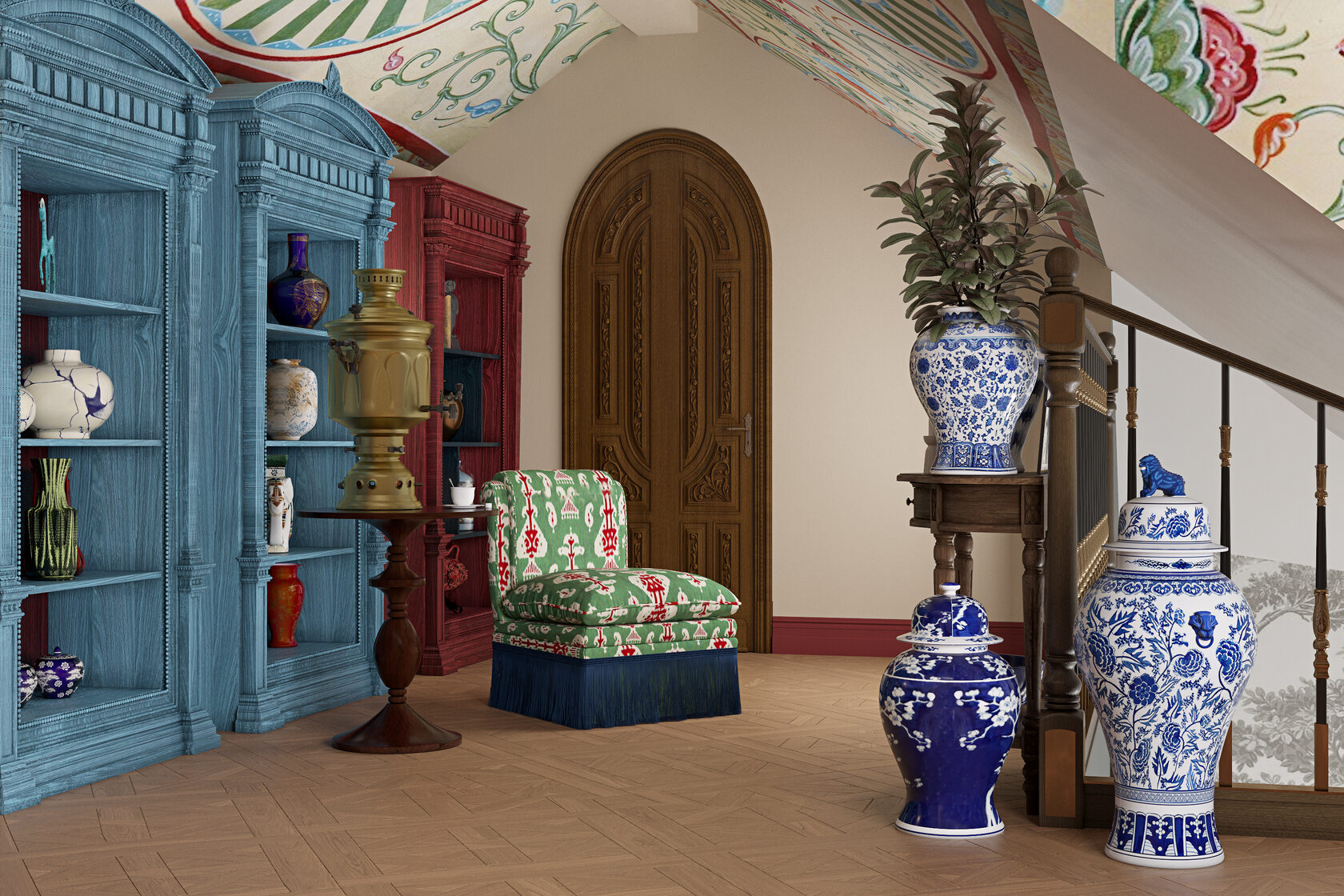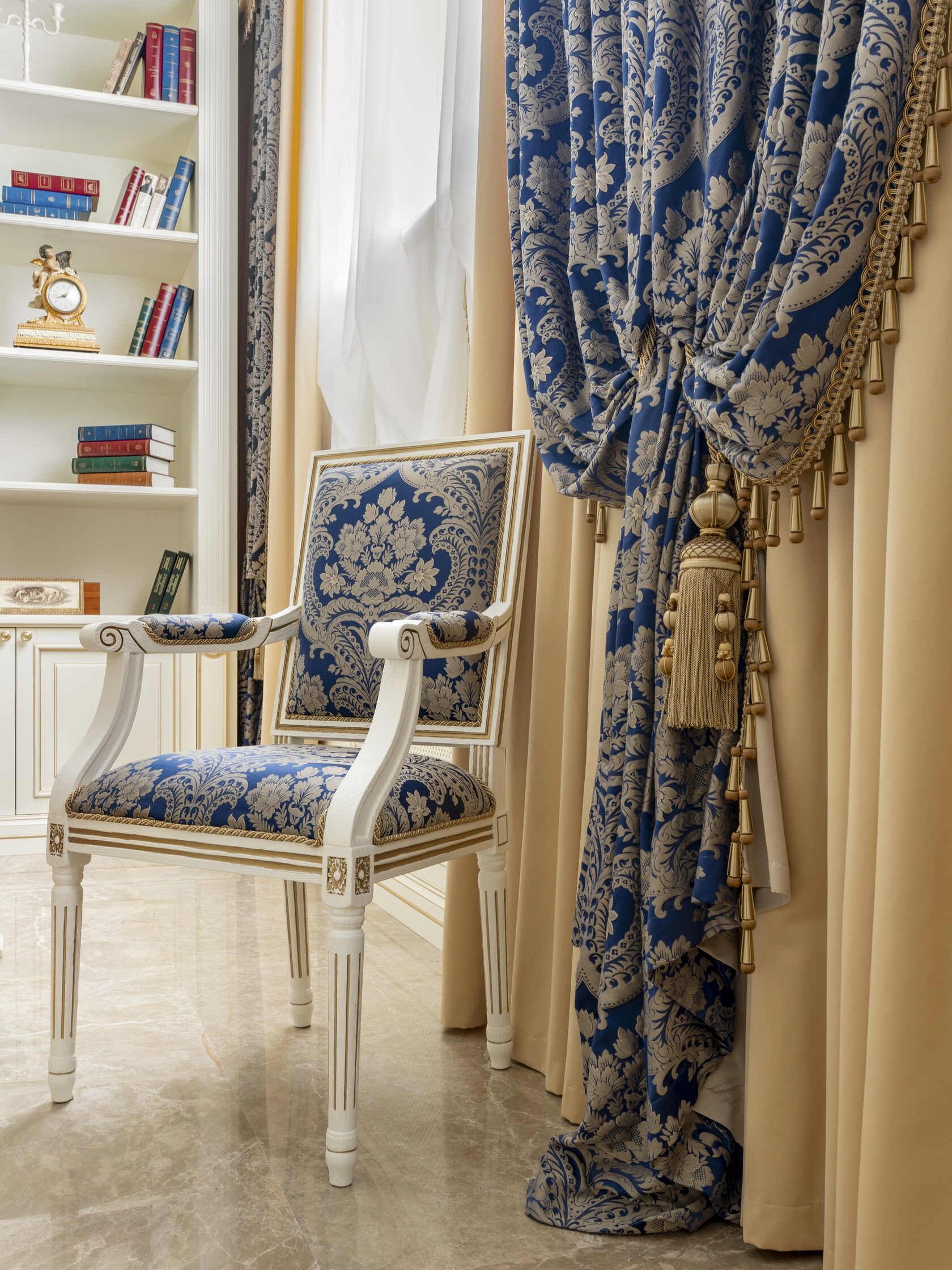 Декор: насыщенность, фактура, культурный код В отделке использованы премиальные материалы, художественные обои, резная мебель, текстиль ручной работы. В интерьере легко угадываются отсылки к японской эстетике, традиционной английской орнаментике и европейской классике. Особенно важную роль сыграла авторская мебель, изготовленная на заказ: от винного шкафа из антикварного стекла до уникальных стеллажей, арочных порталов и мягкой мебели с эксклюзивной обивкой.