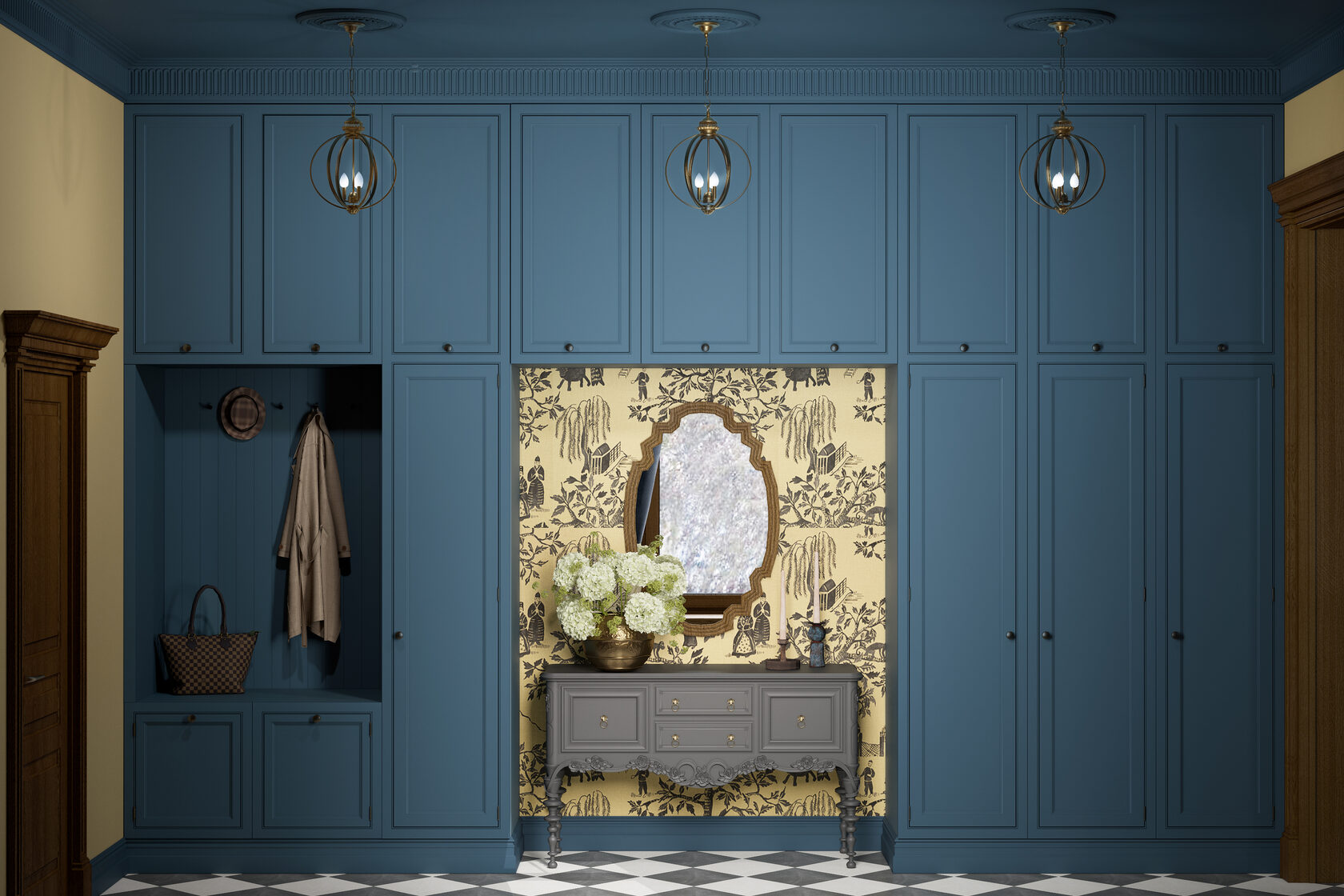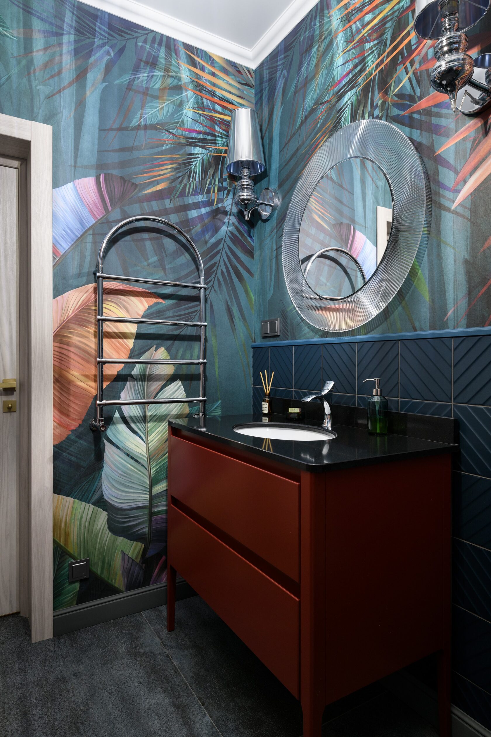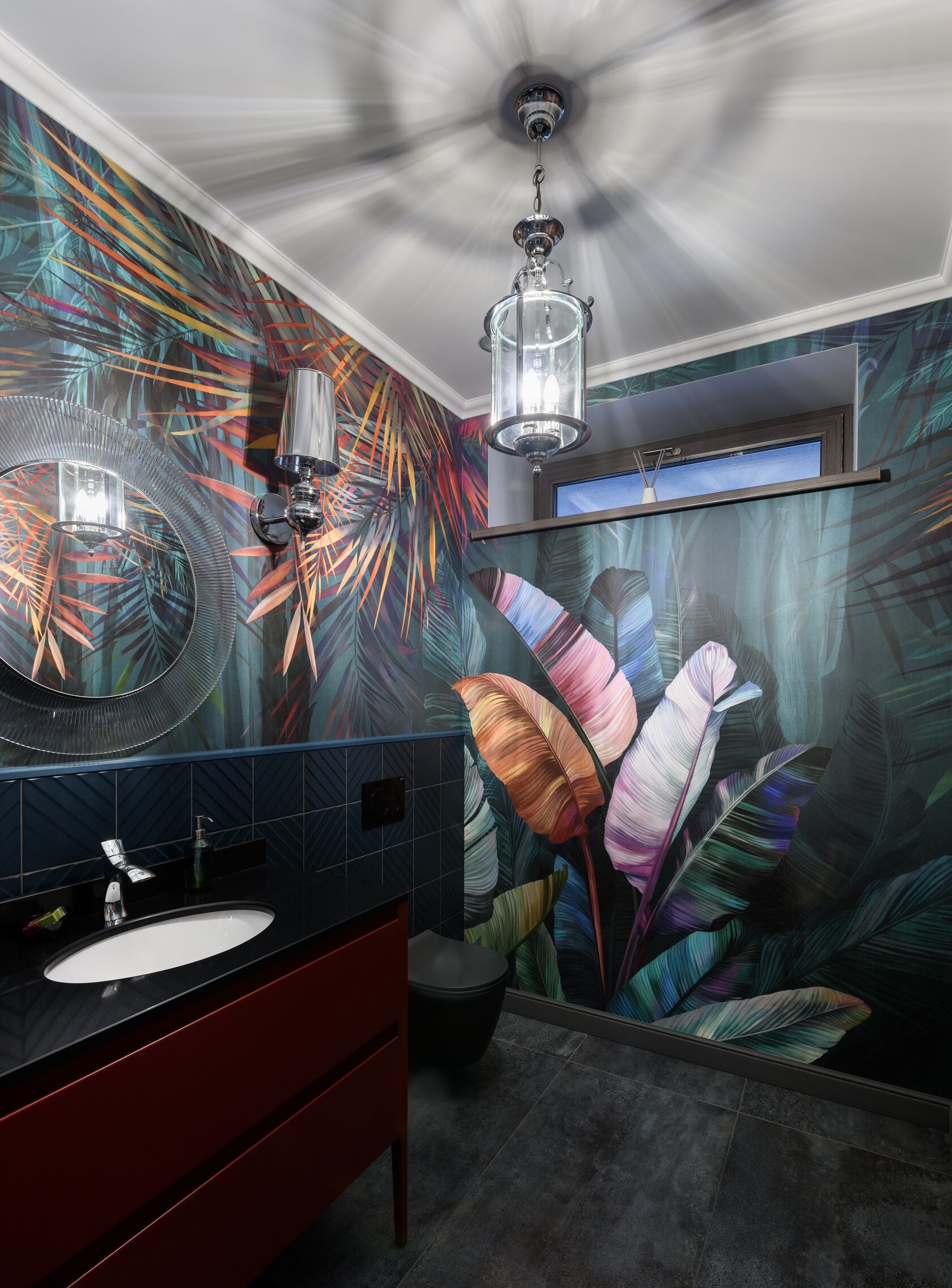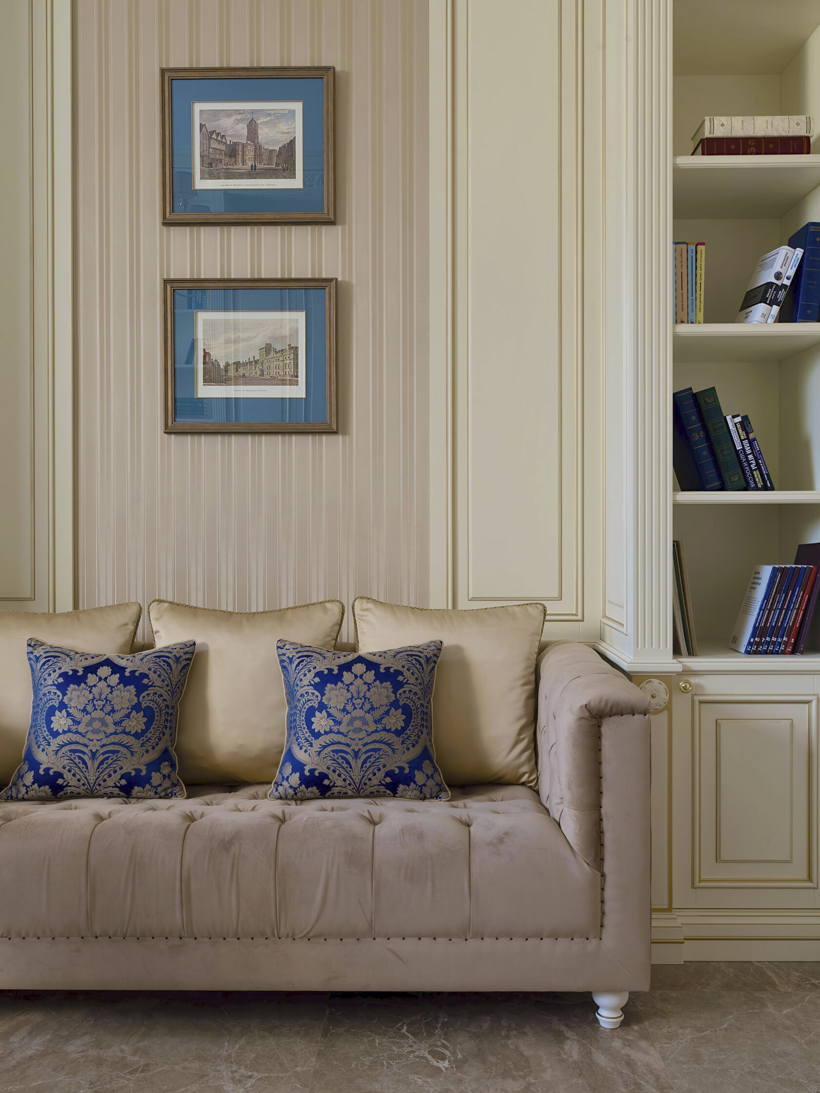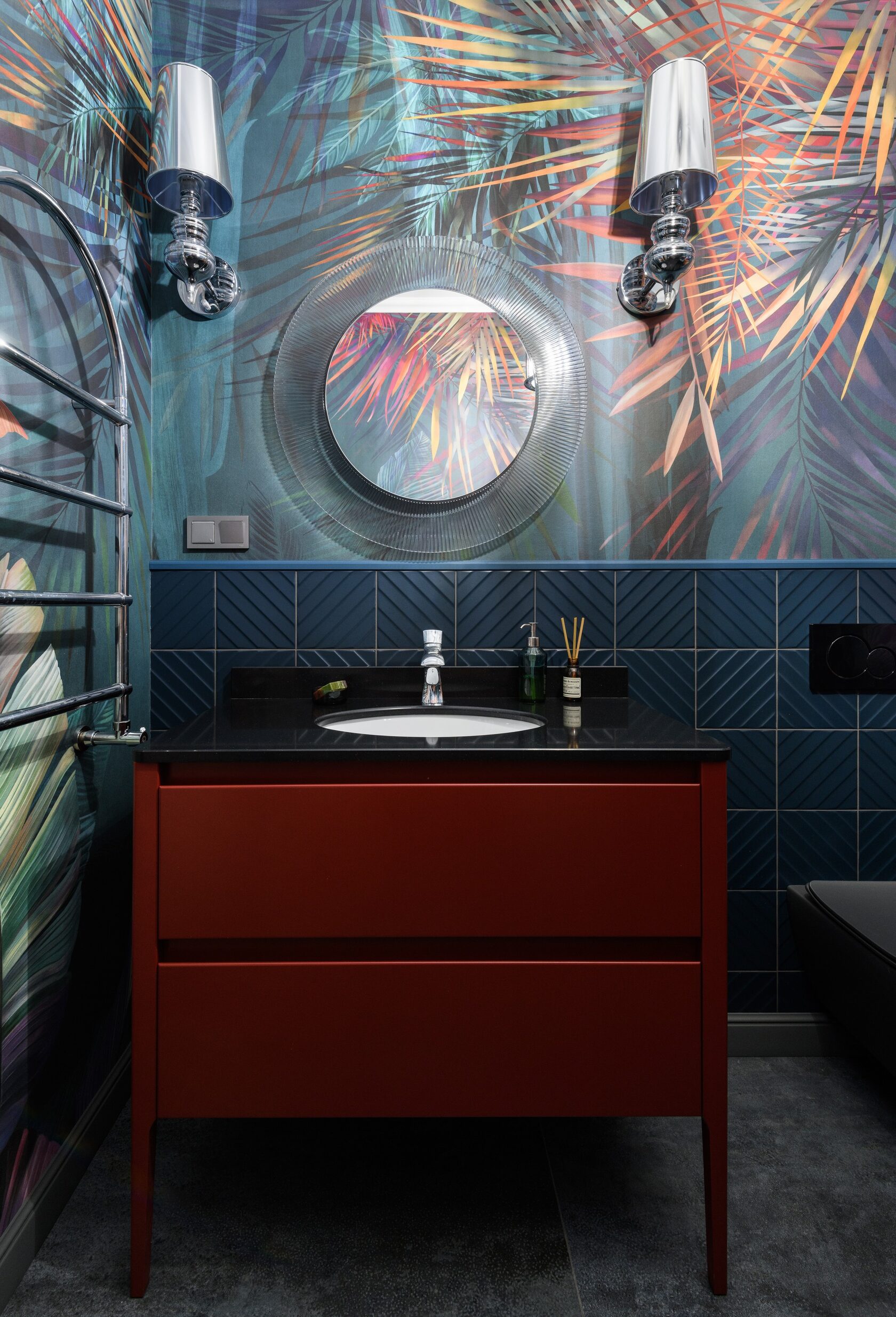 Декор: насыщенность, фактура, культурный код В отделке использованы премиальные материалы, художественные обои, резная мебель, текстиль ручной работы. В интерьере легко угадываются отсылки к японской эстетике, традиционной английской орнаментике и европейской классике. Особенно важную роль сыграла авторская мебель, изготовленная на заказ: от винного шкафа из антикварного стекла до уникальных стеллажей, арочных порталов и мягкой мебели с эксклюзивной обивкой.