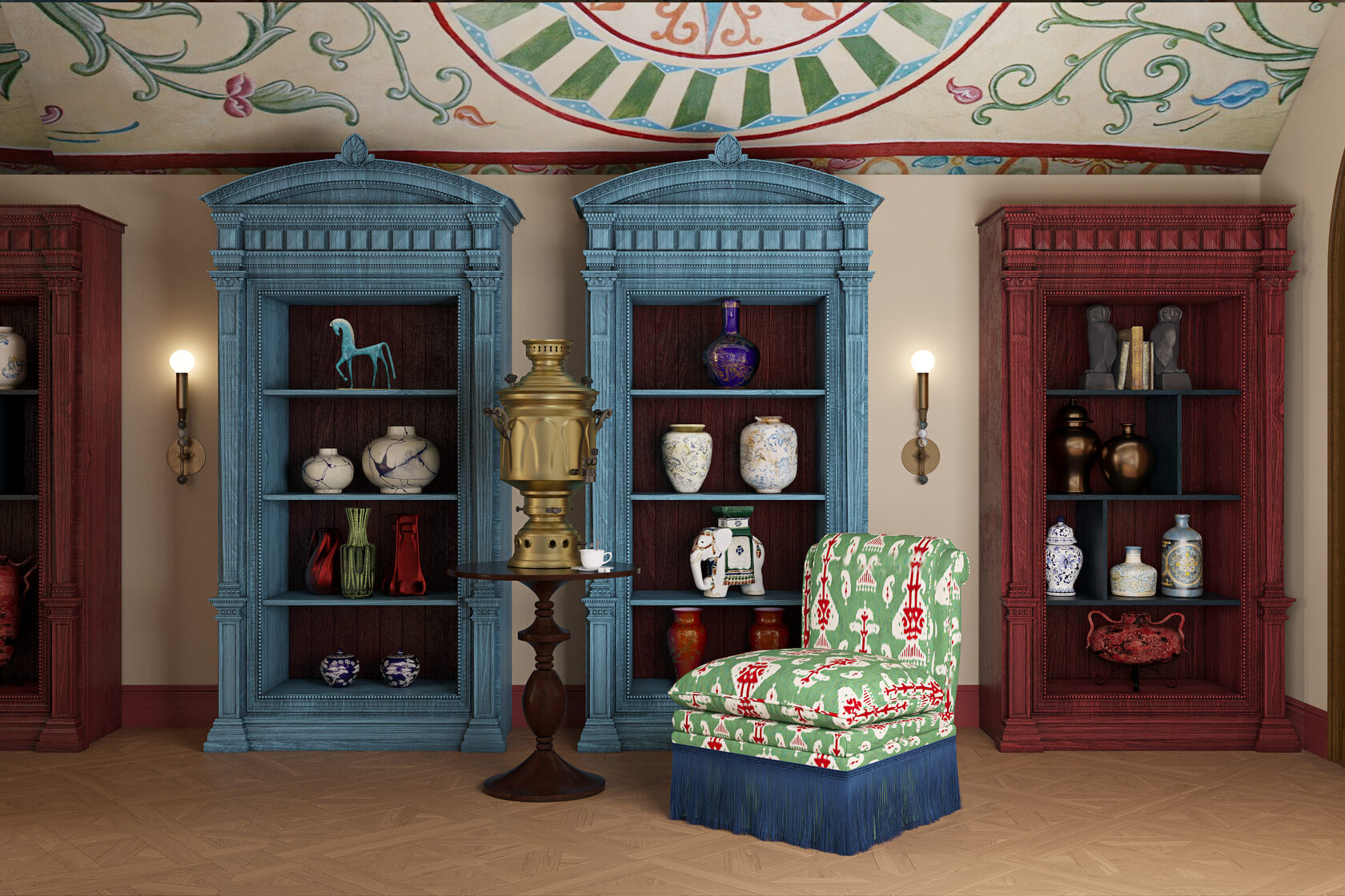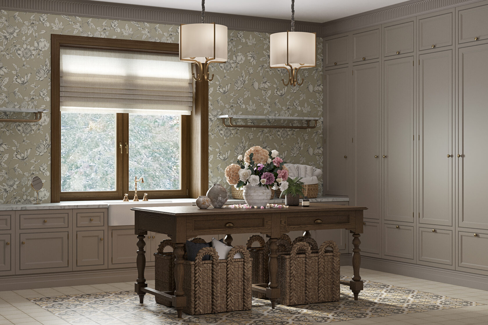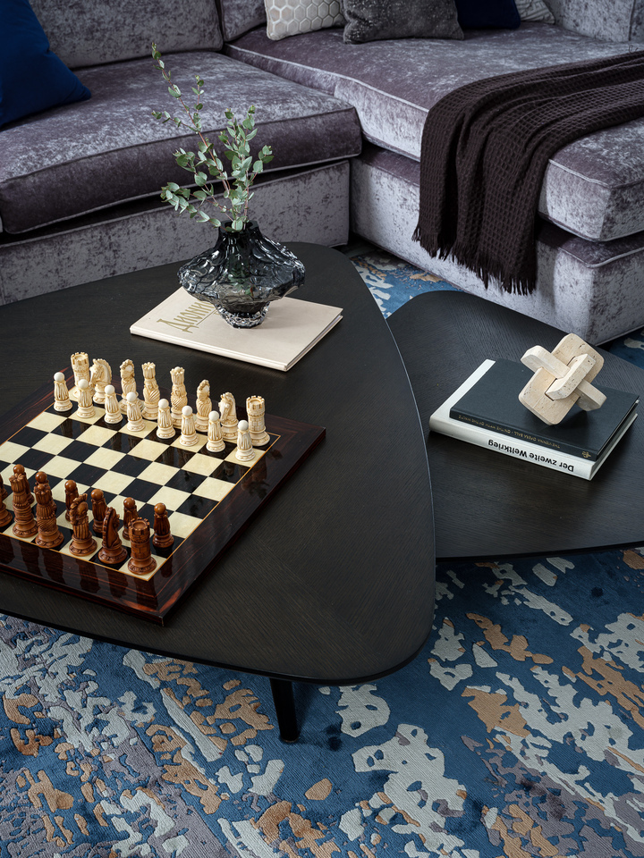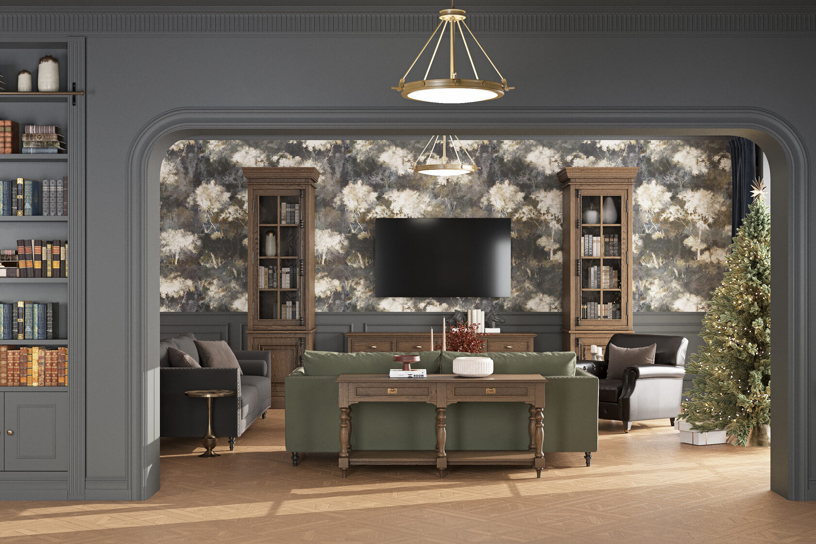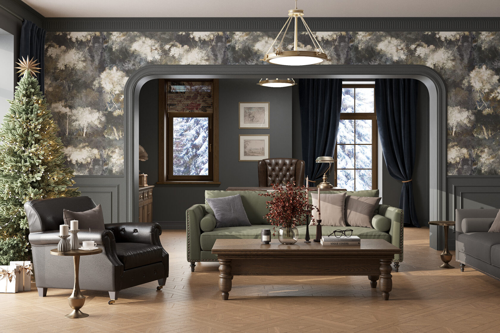 Декор: насыщенность, фактура, культурный код В отделке использованы премиальные материалы, художественные обои, резная мебель, текстиль ручной работы. В интерьере легко угадываются отсылки к японской эстетике, традиционной английской орнаментике и европейской классике. Особенно важную роль сыграла авторская мебель, изготовленная на заказ: от винного шкафа из антикварного стекла до уникальных стеллажей, арочных порталов и мягкой мебели с эксклюзивной обивкой.