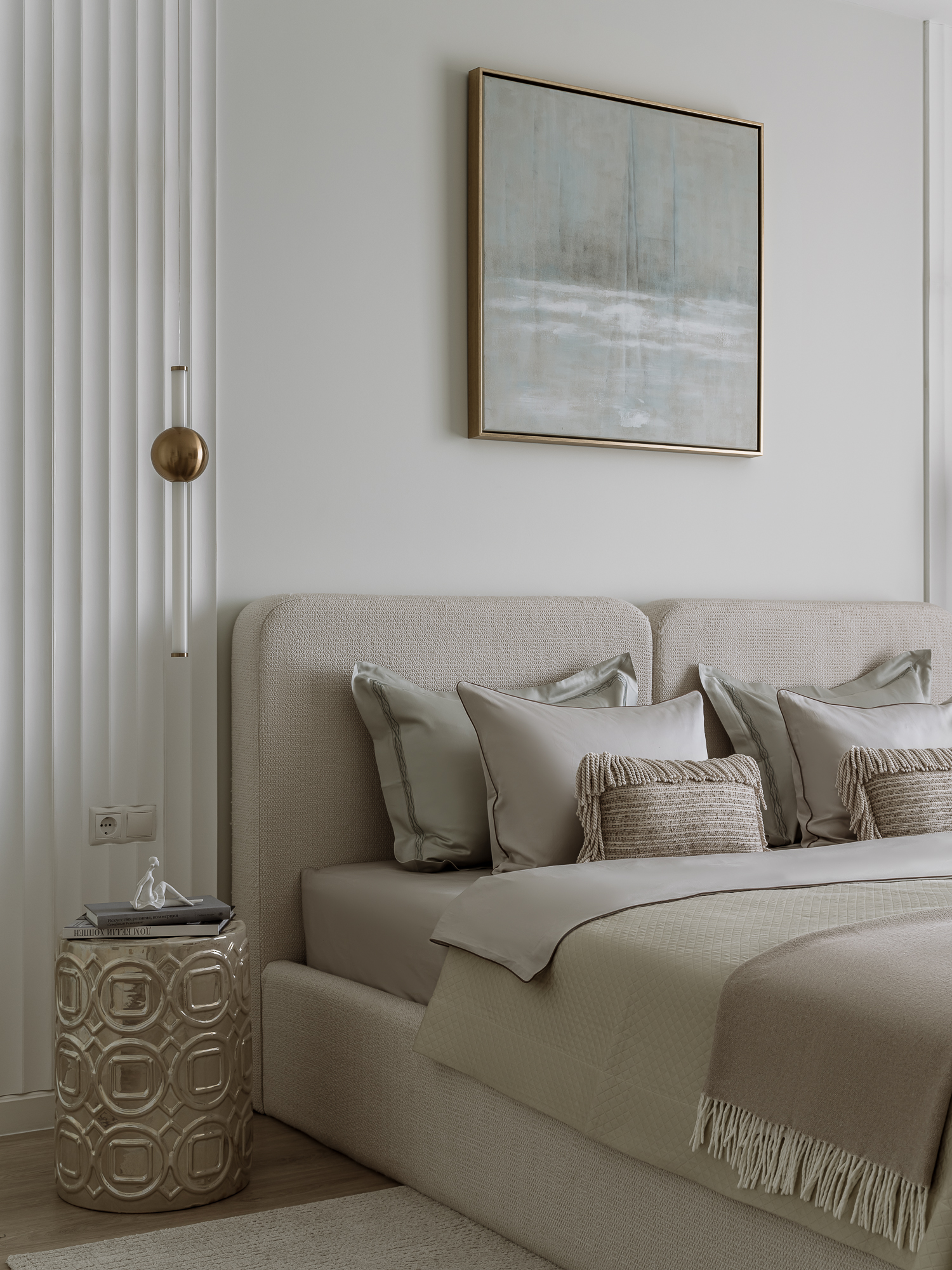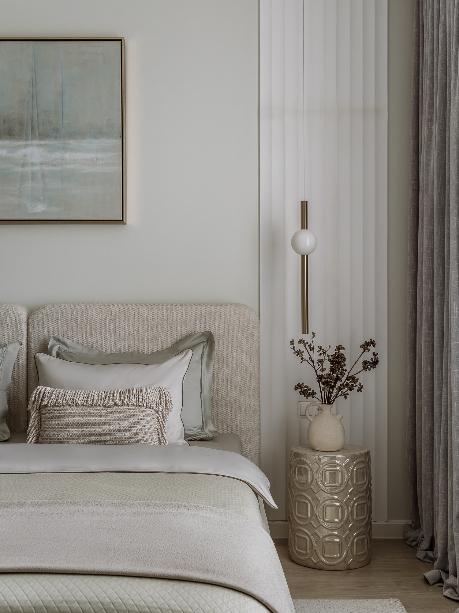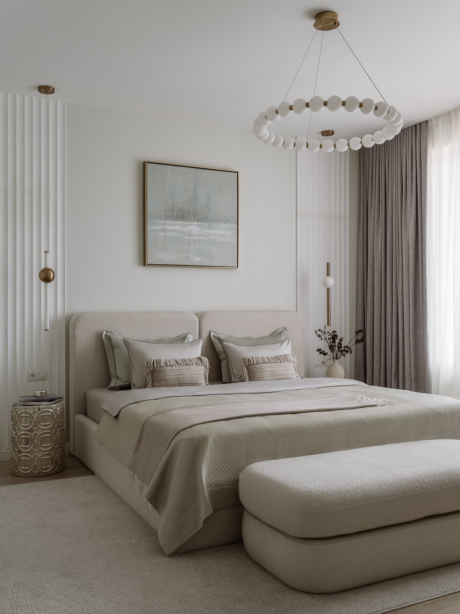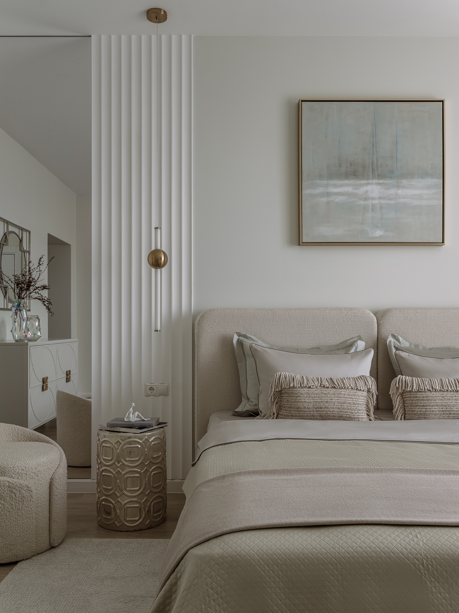 Концепция: В основе концепции лежит диалог полутонов и многообразие фактур, создающий ощущение легкости и свежести. Просторные комнаты наполнены мягким естественным светом благодаря большим окнам, дополненным полупрозрачными льняными шторами. Дымчато-мятный оттенок стен гармонично завершает образ, обеспечивая умиротворяющую и цельную эстетику.