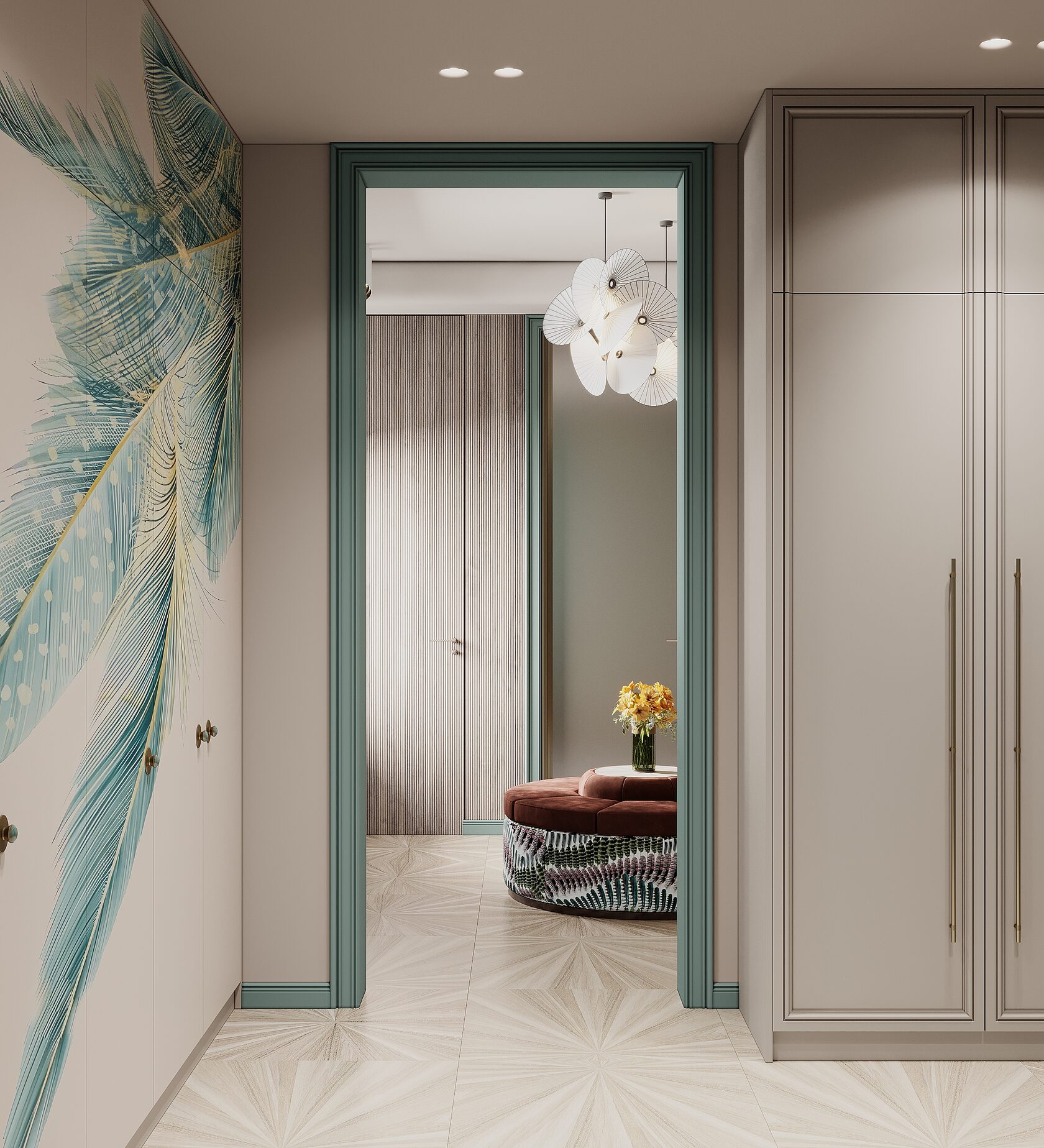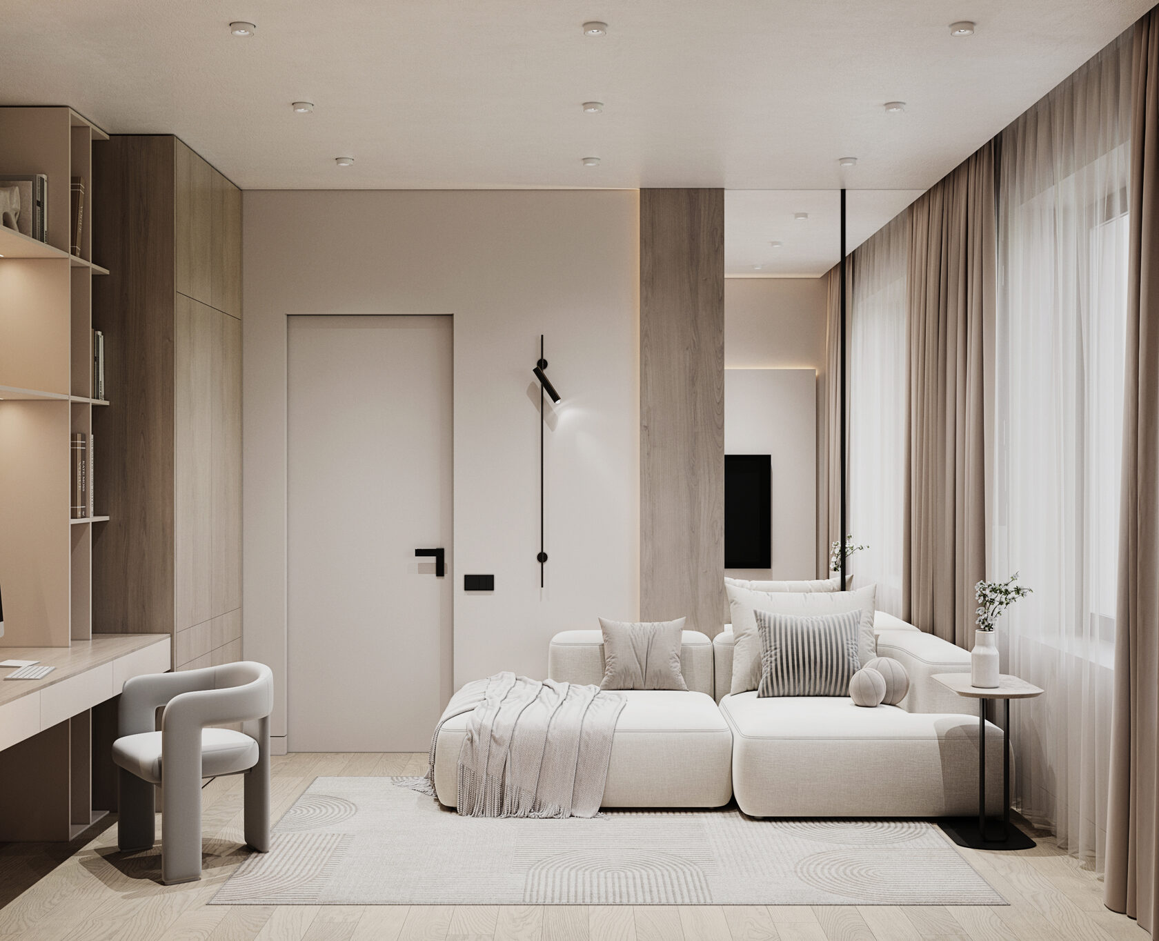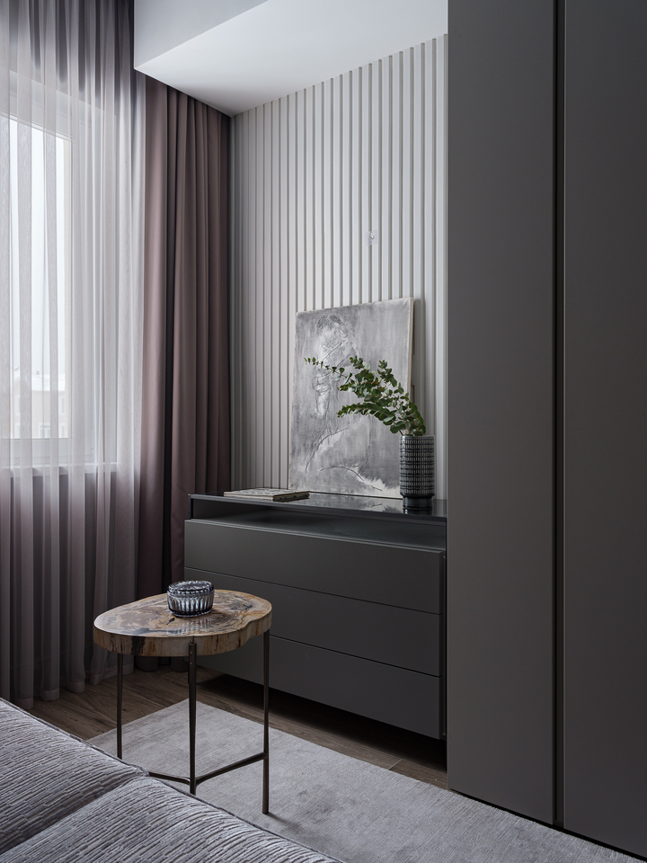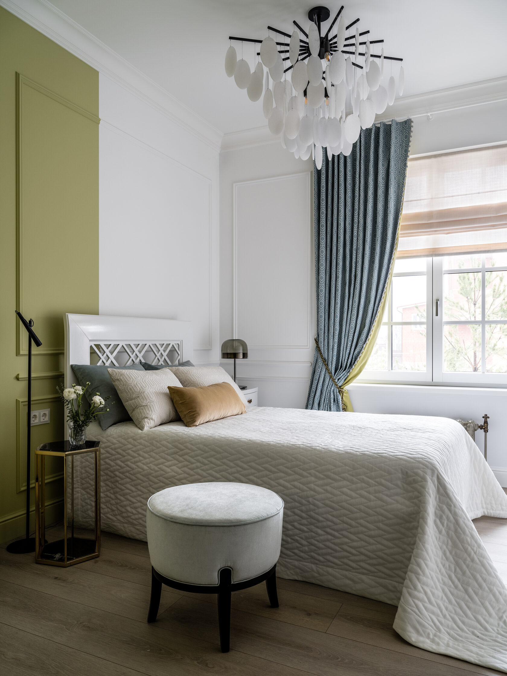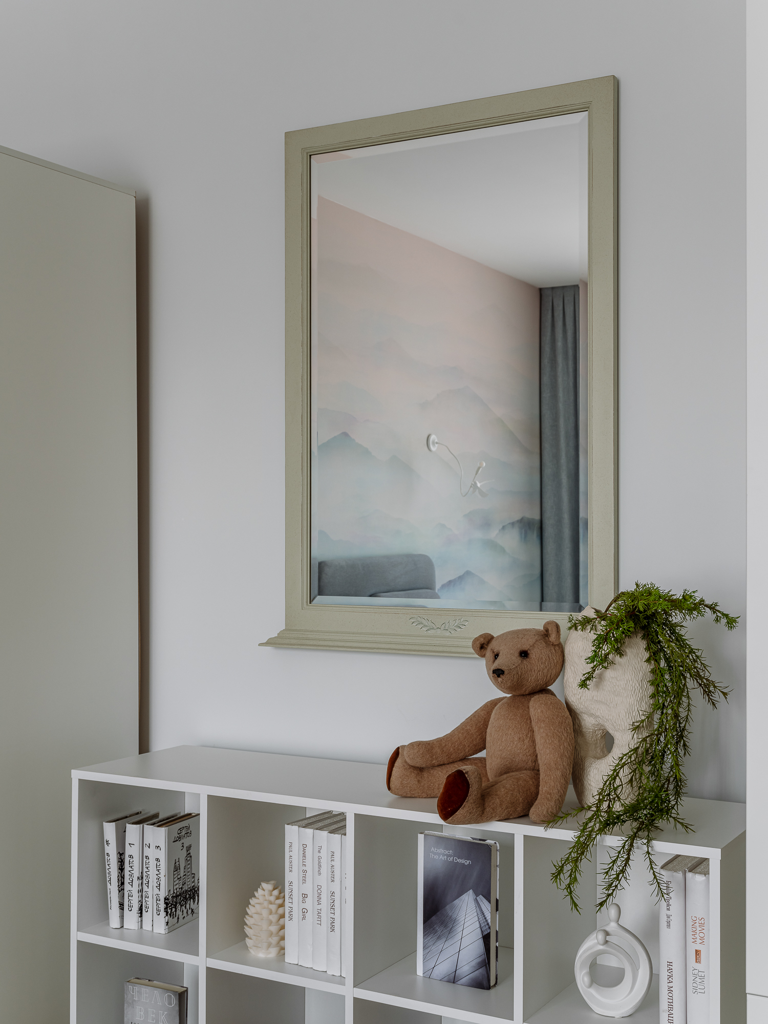Концепция: В основе концепции лежит диалог полутонов и многообразие фактур, создающий ощущение легкости и свежести. Просторные комнаты наполнены мягким естественным светом благодаря большим окнам, дополненным полупрозрачными льняными шторами. Дымчато-мятный оттенок стен гармонично завершает образ, обеспечивая умиротворяющую и цельную эстетику.