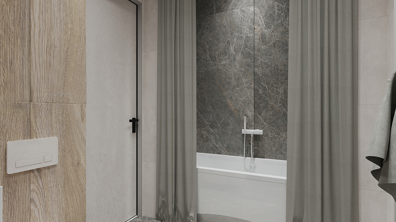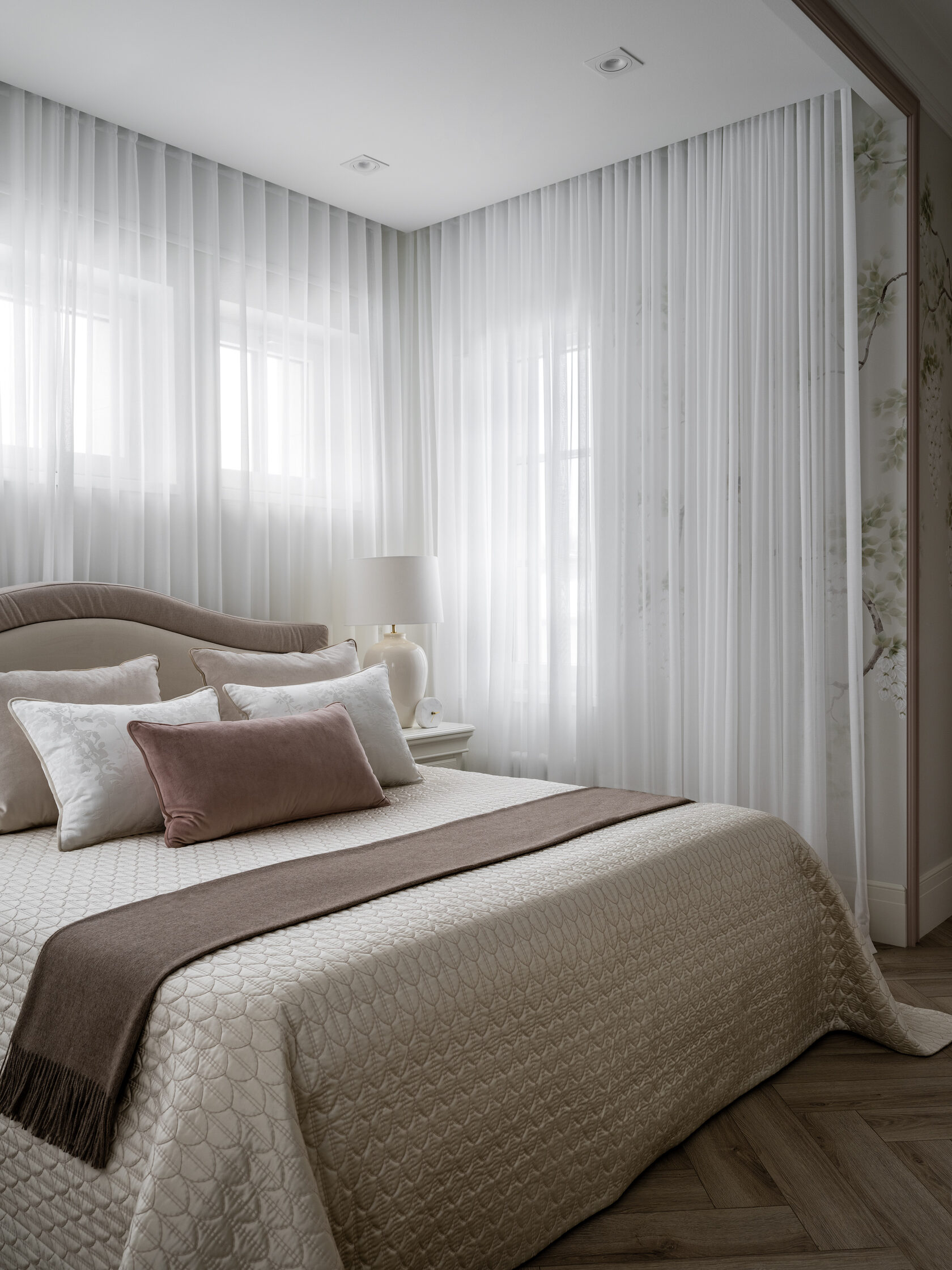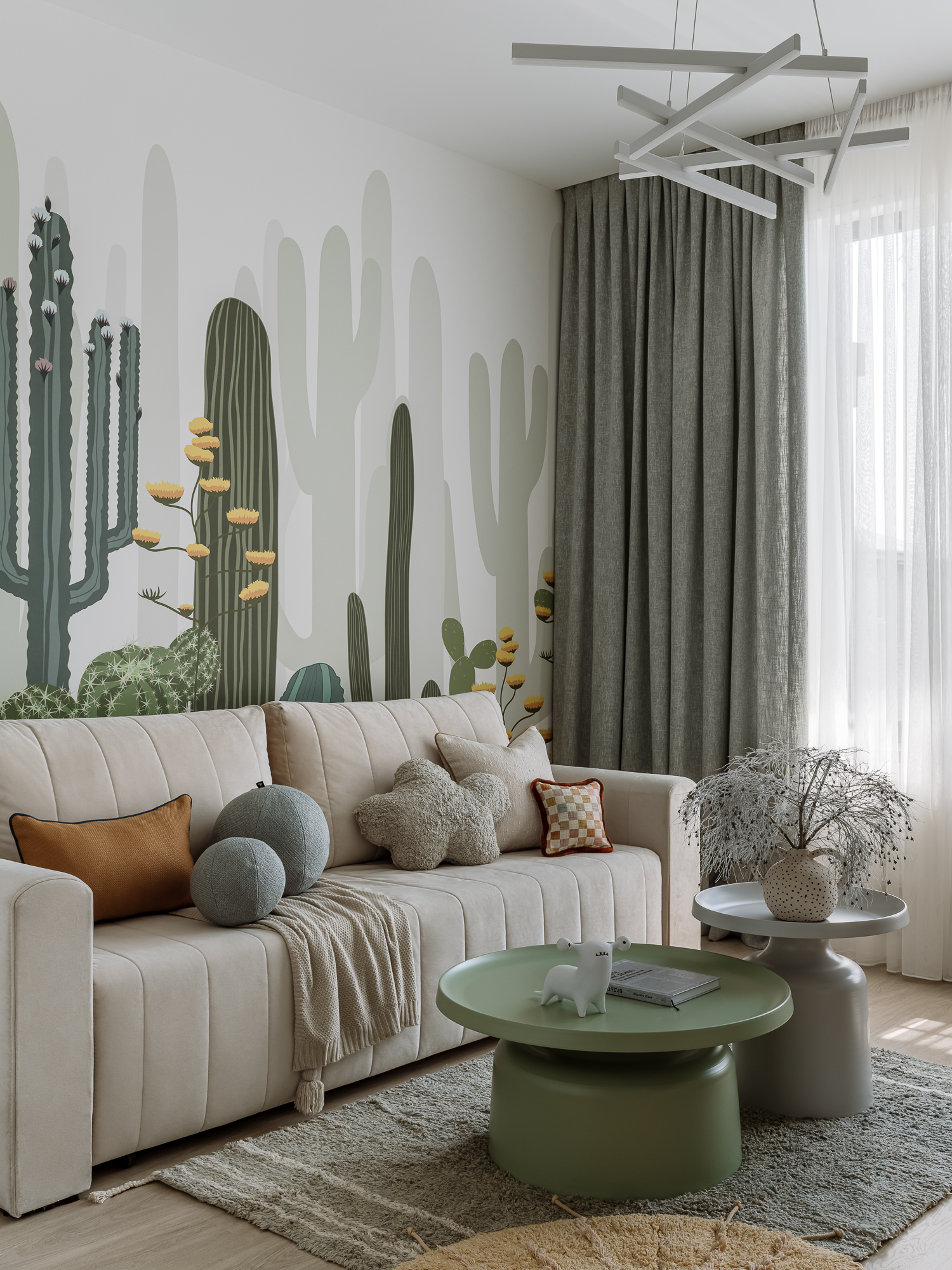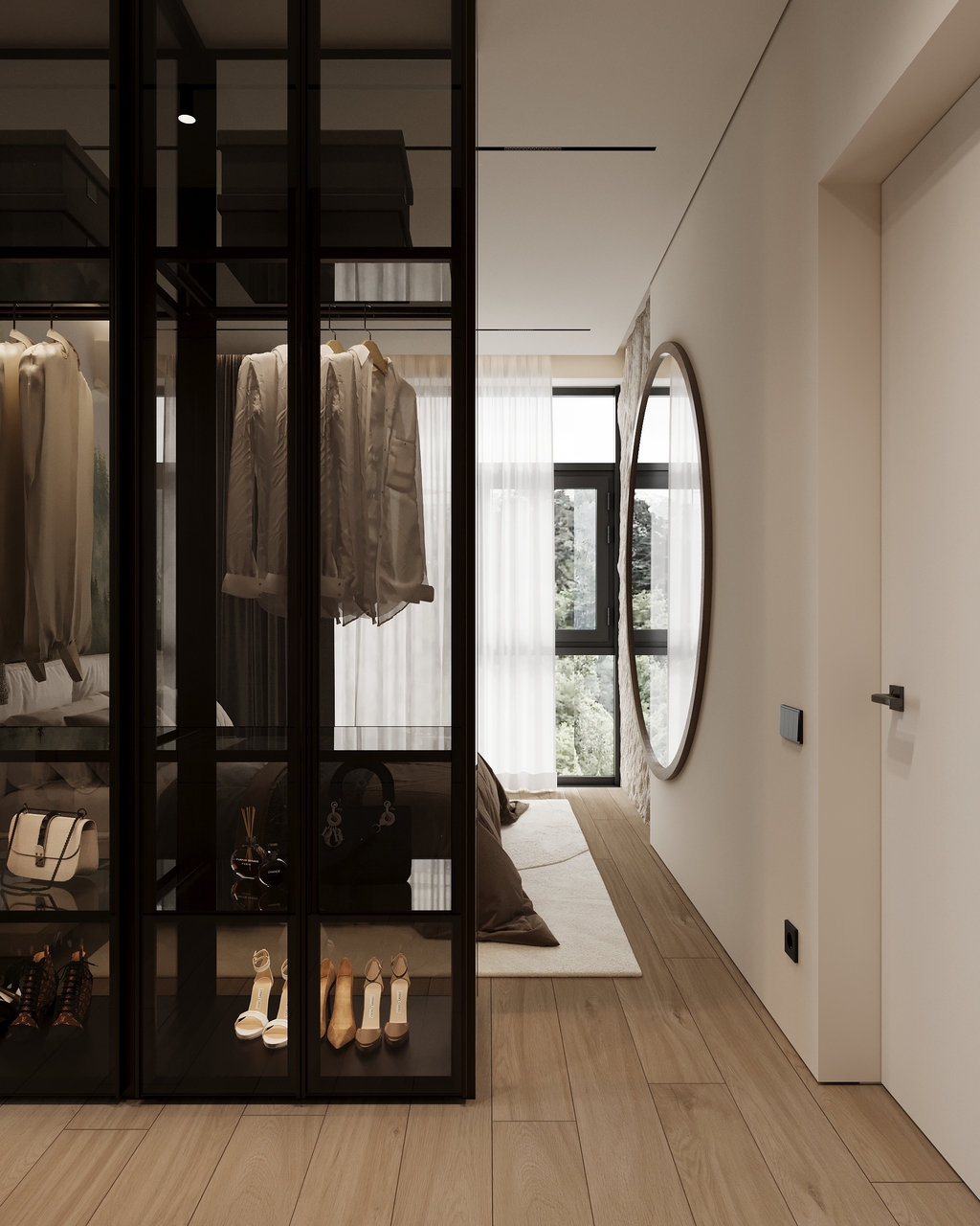 Концепция: В основе концепции лежит диалог полутонов и многообразие фактур, создающий ощущение легкости и свежести. Просторные комнаты наполнены мягким естественным светом благодаря большим окнам, дополненным полупрозрачными льняными шторами. Дымчато-мятный оттенок стен гармонично завершает образ, обеспечивая умиротворяющую и цельную эстетику.