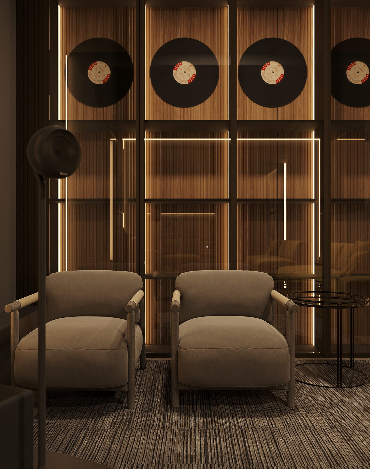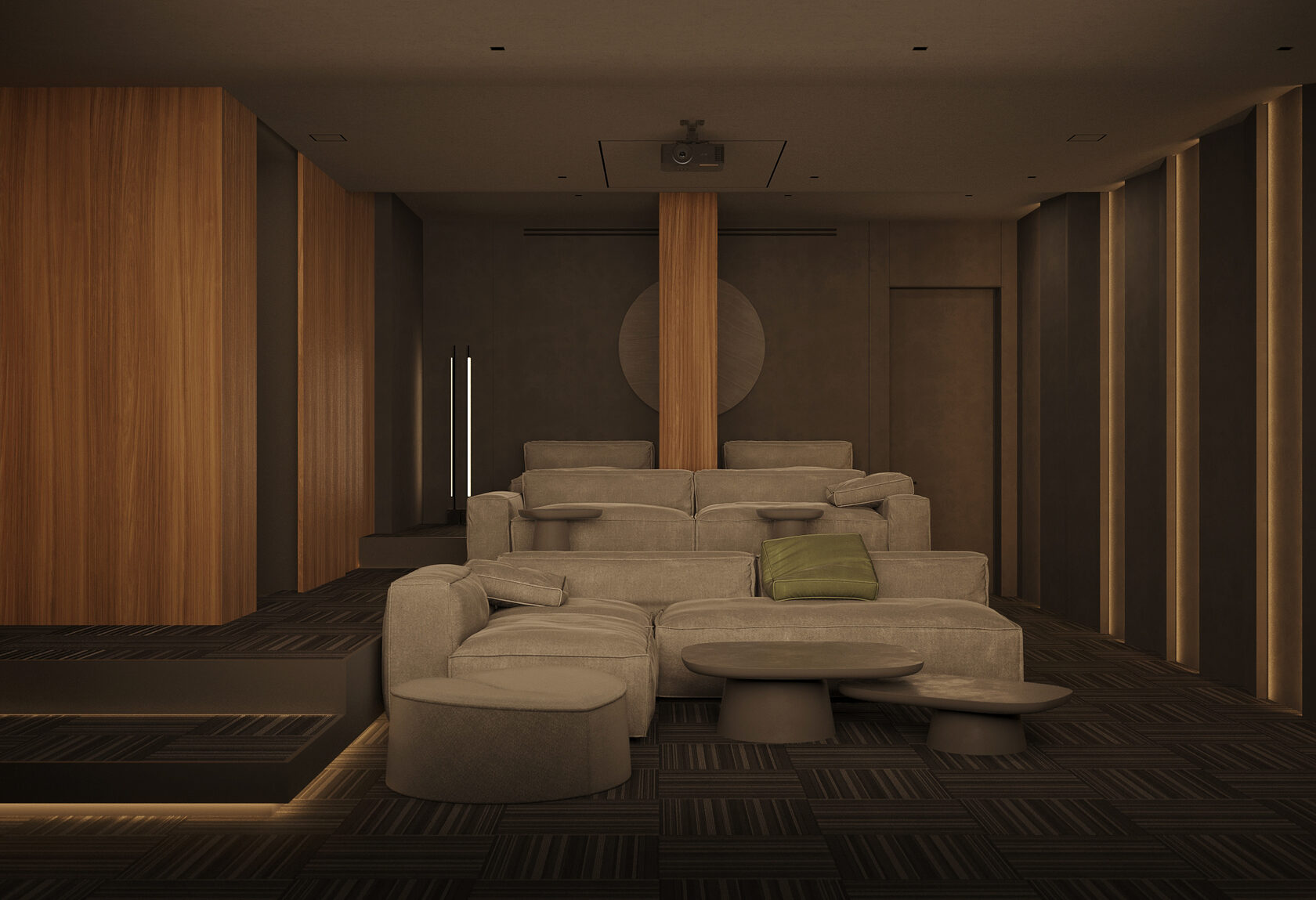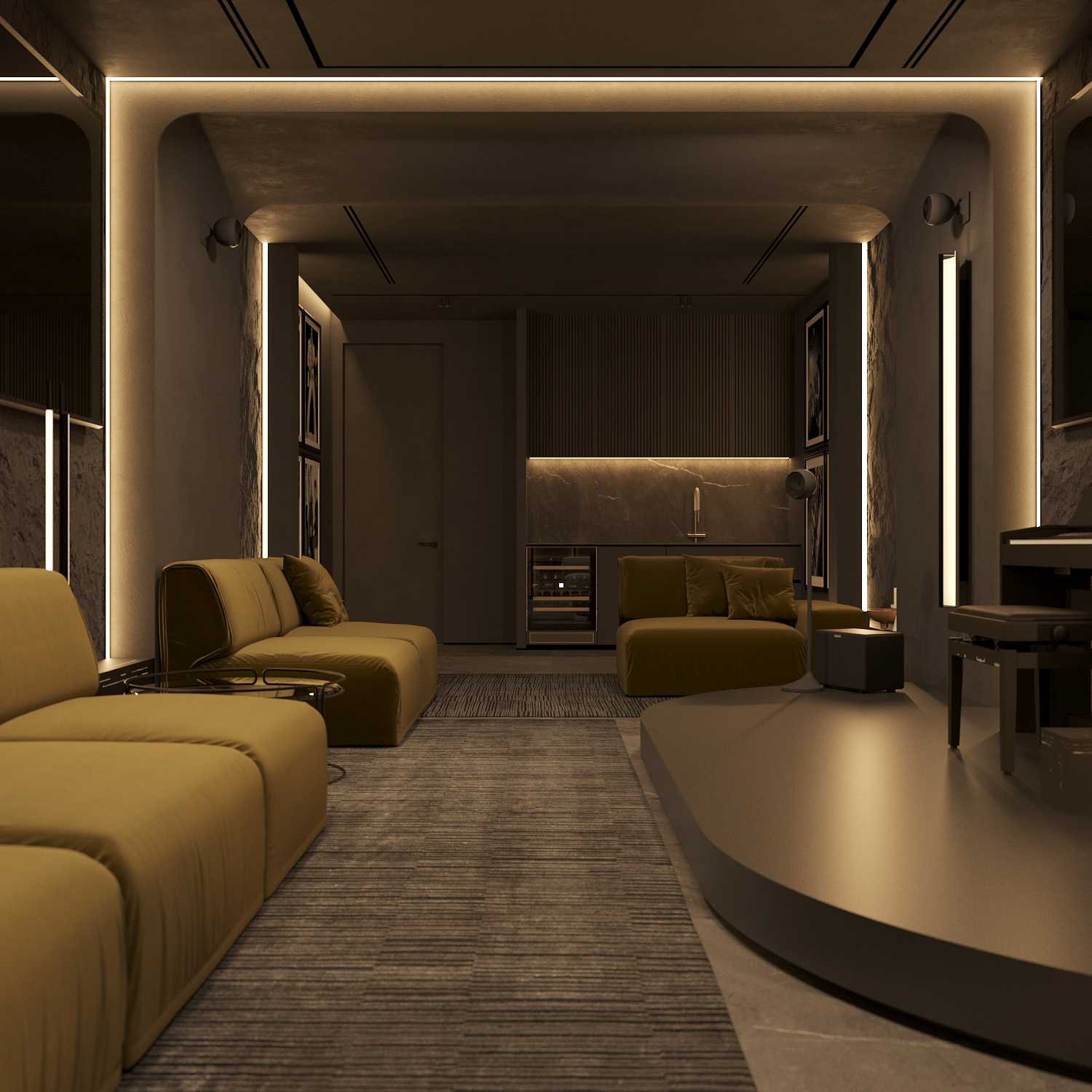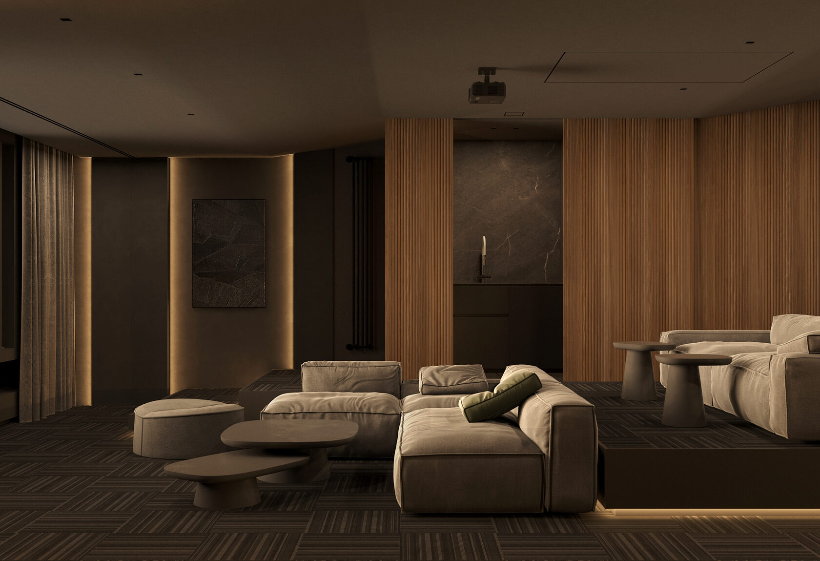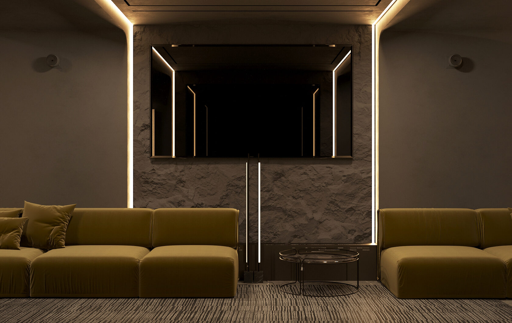 Концепция: Основная концепция проекта — превращение всего архитектурного пространства в сложный акустический инструмент. Это достигается за счет скрытого инжиниринга: интеграции специально рассчитанных звукопоглощающих панелей, бас-ловушек и диффузоров за фасадами стен и мебели. Каждый элемент интерьера тщательно настраивался для контроля реверберации и устранения паразитных отражений. Акустические системы полностью интегрированы в конструкции, создавая невидимое, но равномерное и мощное звуковое поле.
