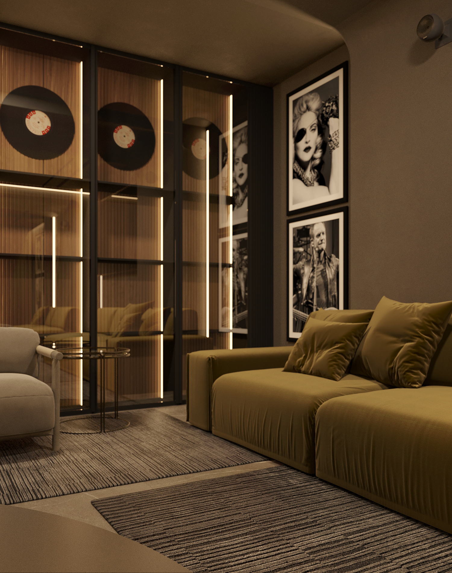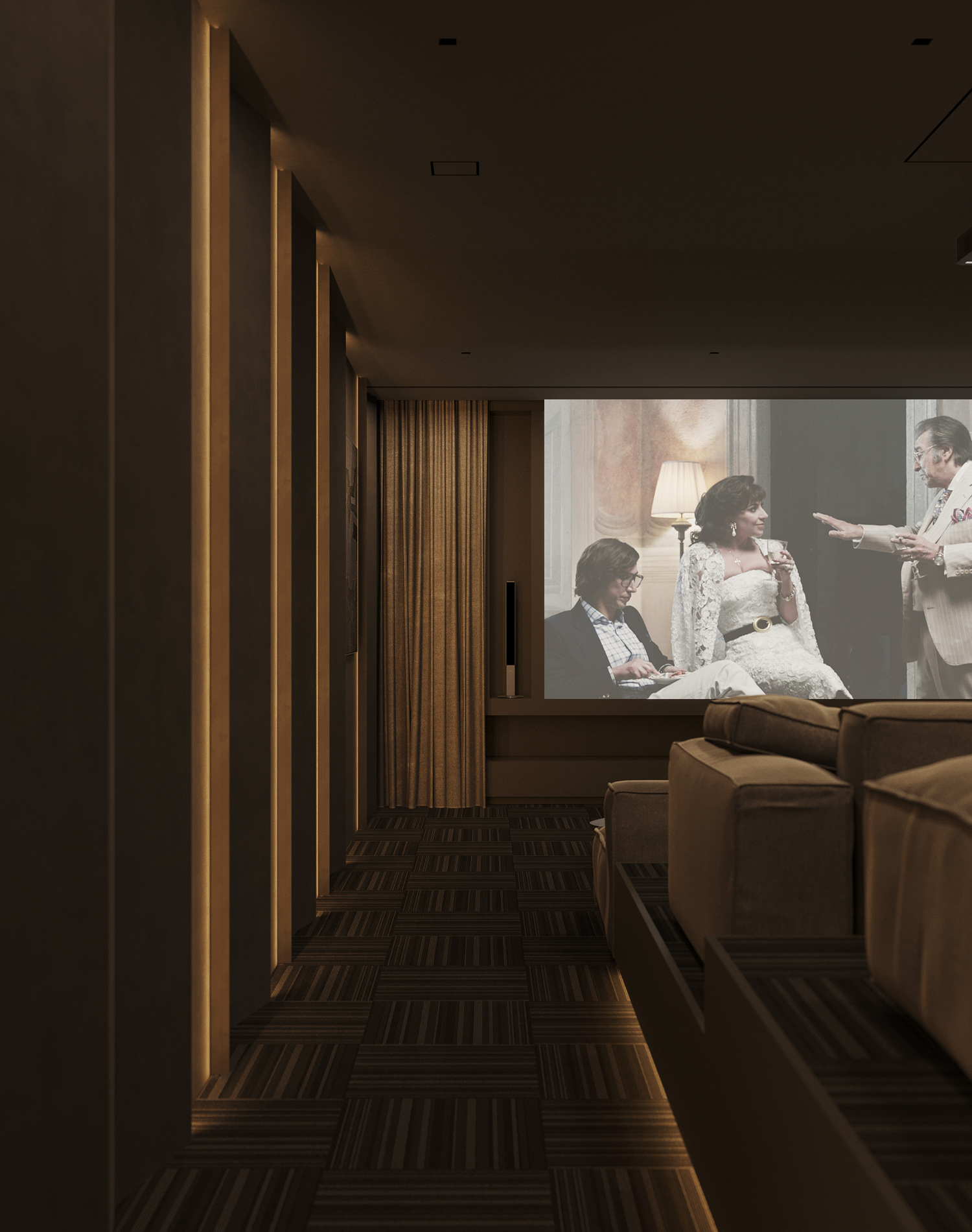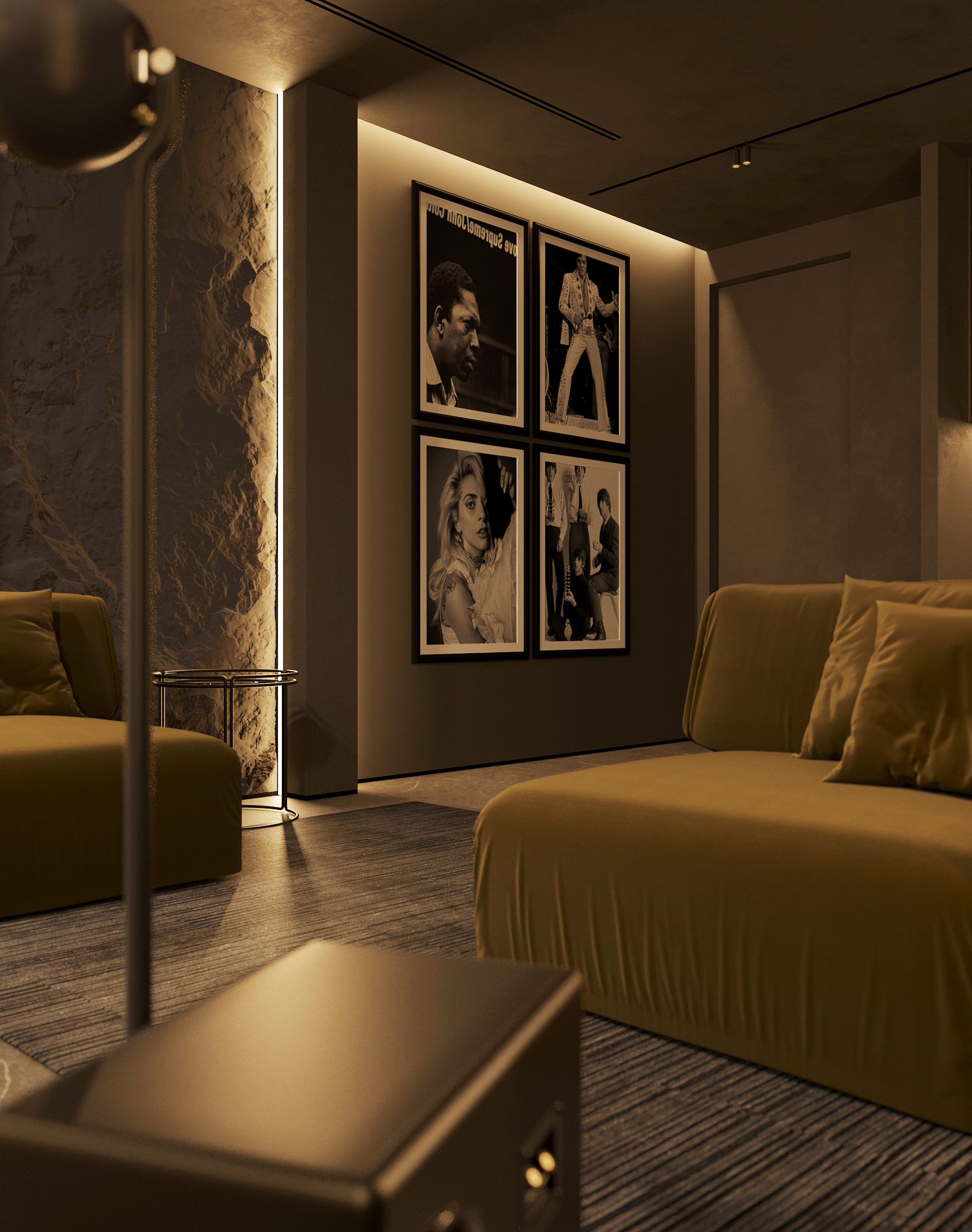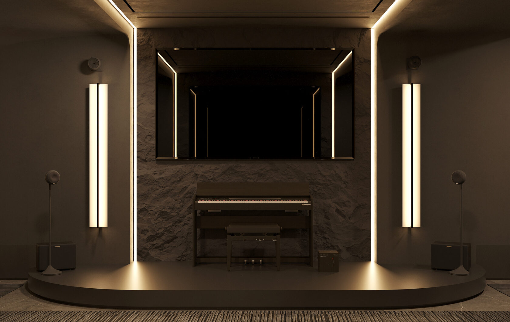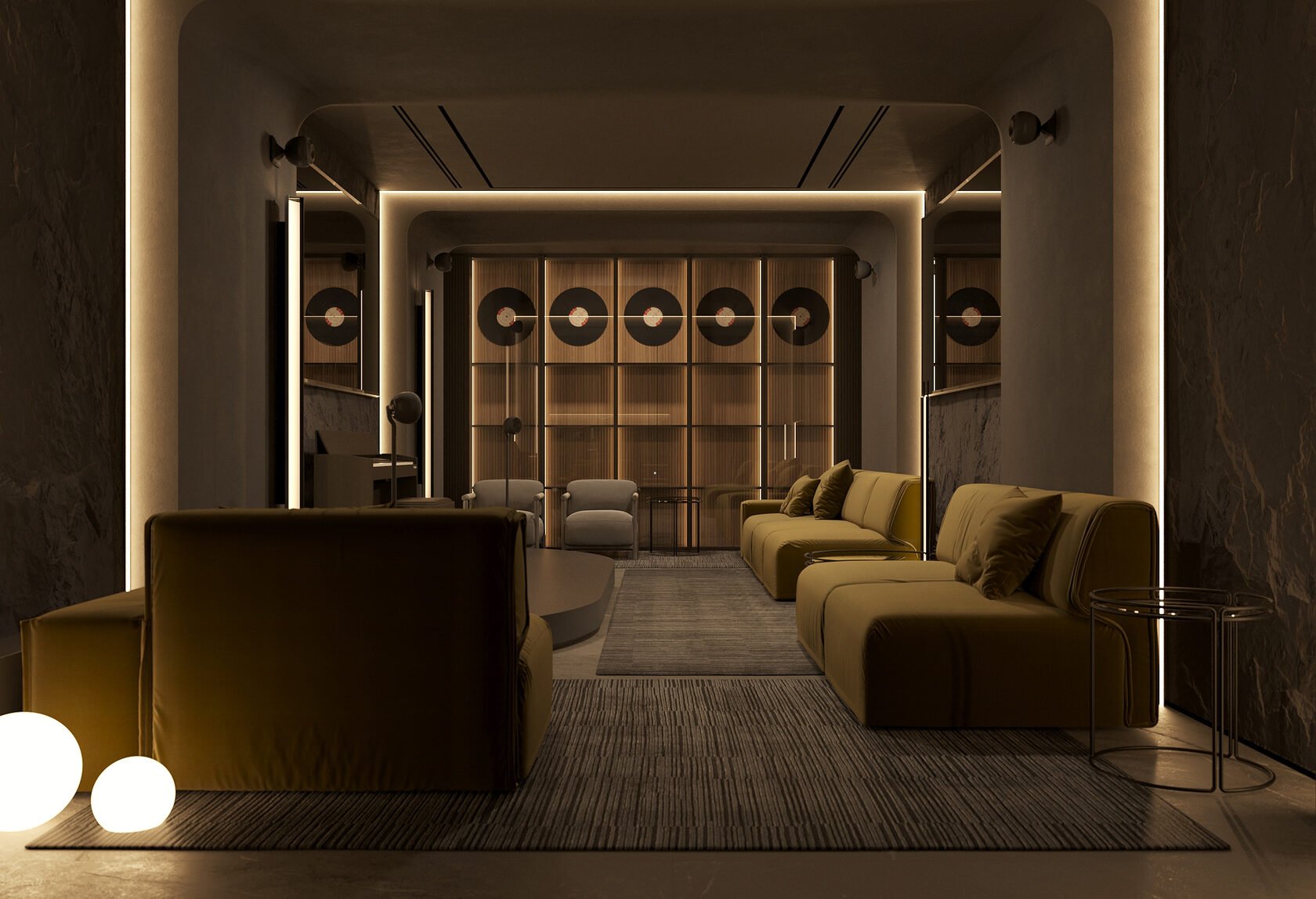 Концепция: Основная концепция проекта — превращение всего архитектурного пространства в сложный акустический инструмент. Это достигается за счет скрытого инжиниринга: интеграции специально рассчитанных звукопоглощающих панелей, бас-ловушек и диффузоров за фасадами стен и мебели. Каждый элемент интерьера тщательно настраивался для контроля реверберации и устранения паразитных отражений. Акустические системы полностью интегрированы в конструкции, создавая невидимое, но равномерное и мощное звуковое поле.