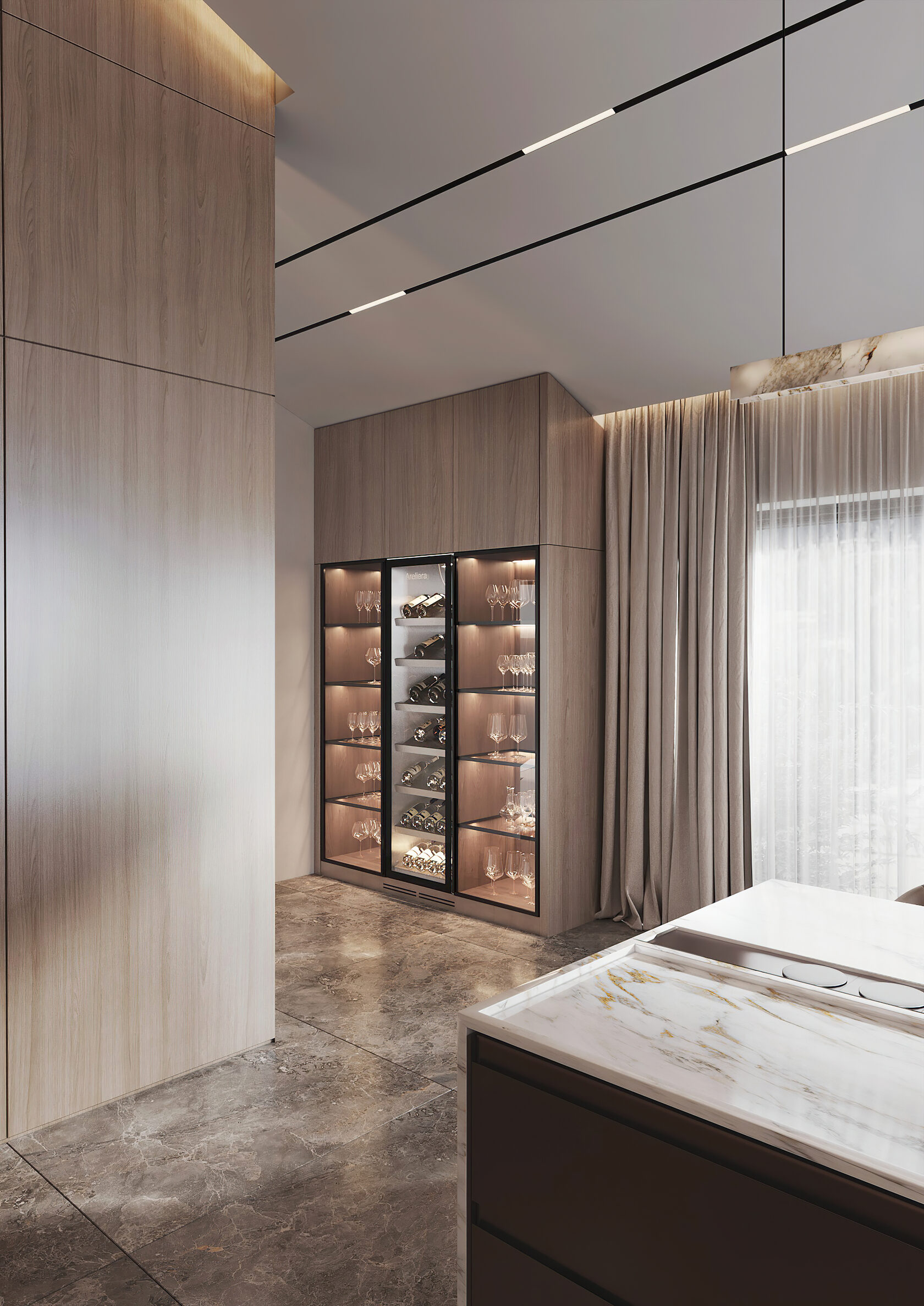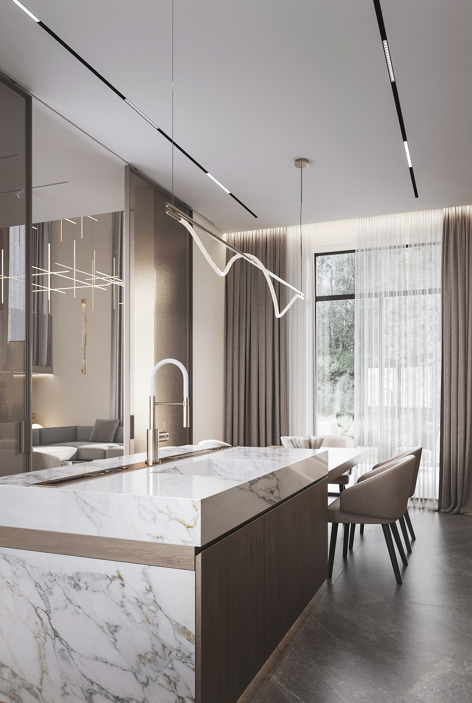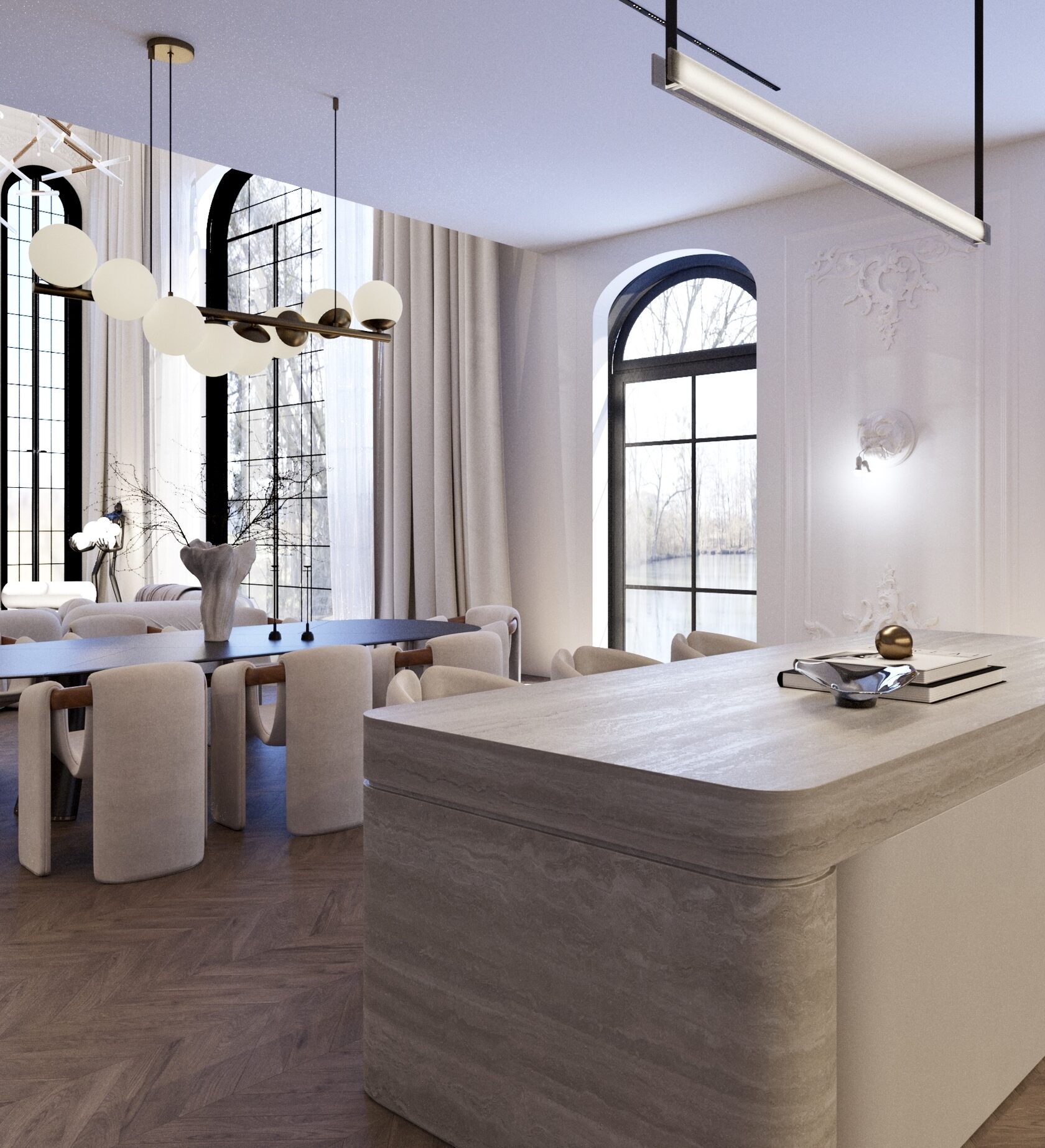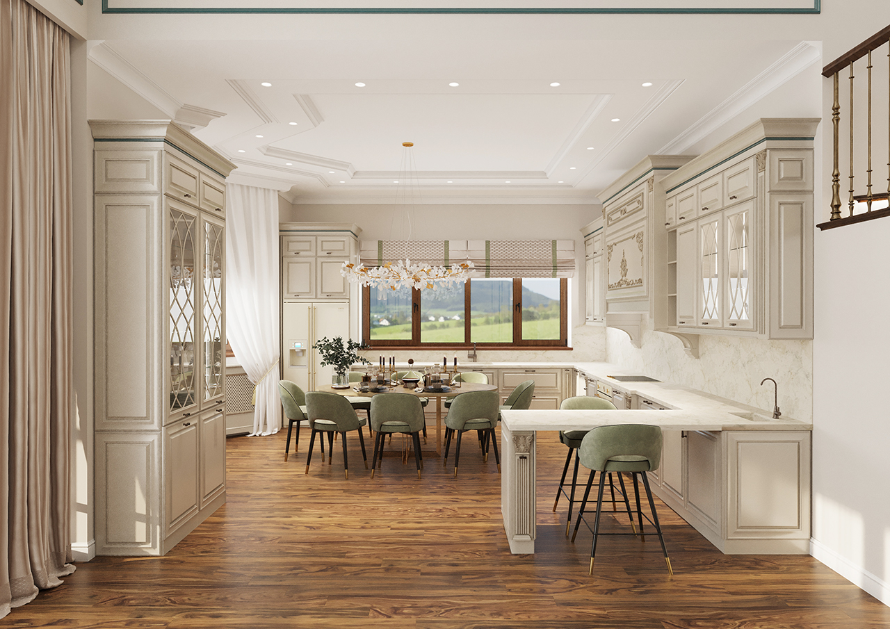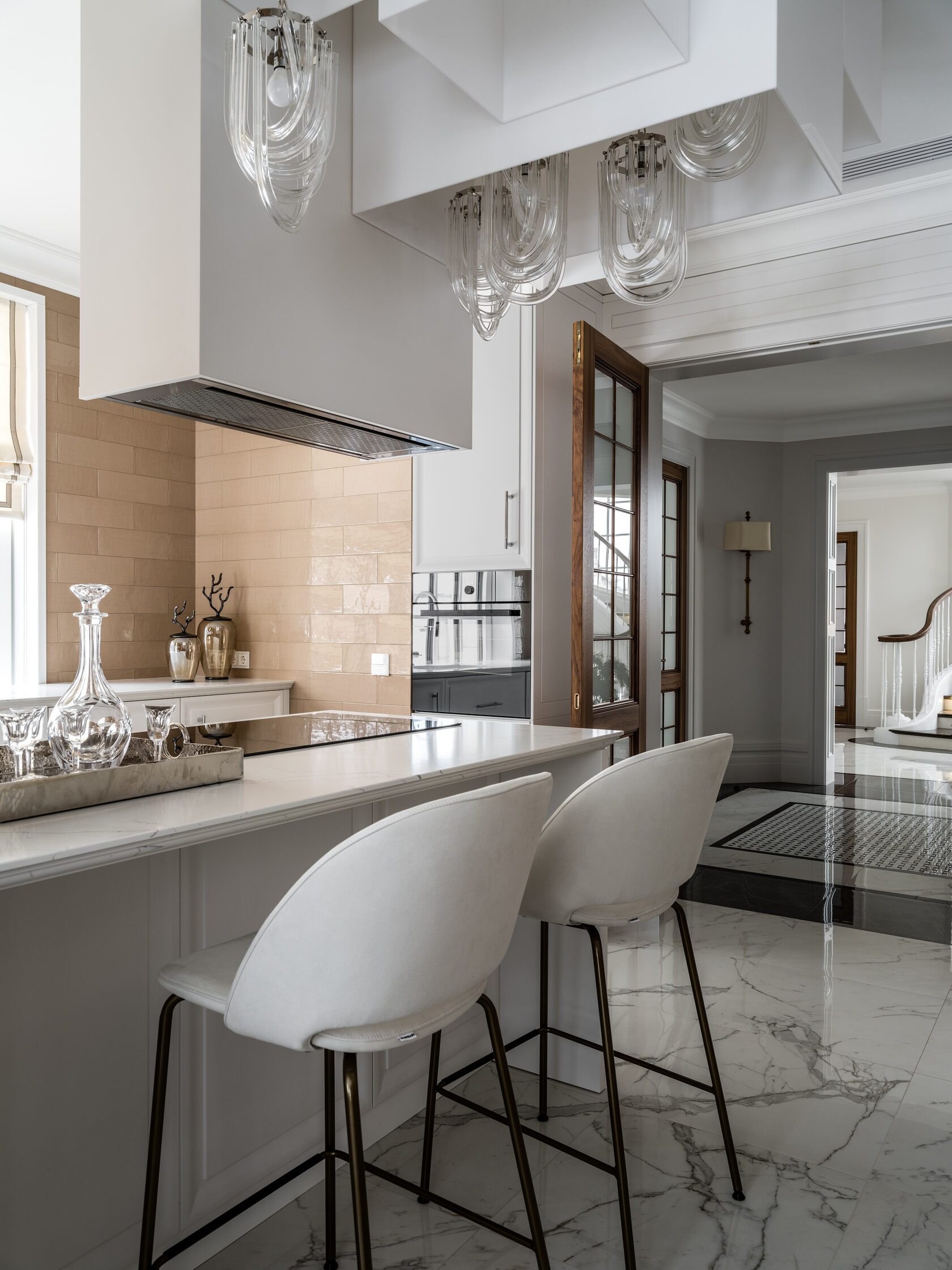 Концепция: В основе концепции лежит создание атмосферы уютного семейного гнезда с акцентом на классический стиль, дополненный изящными элементами шинуазри. Особое внимание уделено деталям декора и освещению. Центральным элементом интерьера стали уникальные светящиеся столешницы из кварца. Интегрированная подсветка не только раскрывает природную красоту камня, но и создаёт мягкое, обволакивающее вечернее освещение, трансформируя пространство и настраивая на искренние семейные беседы.