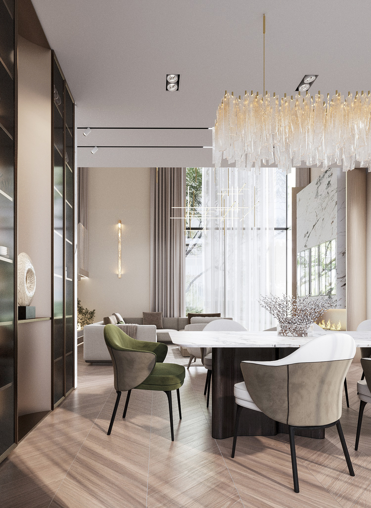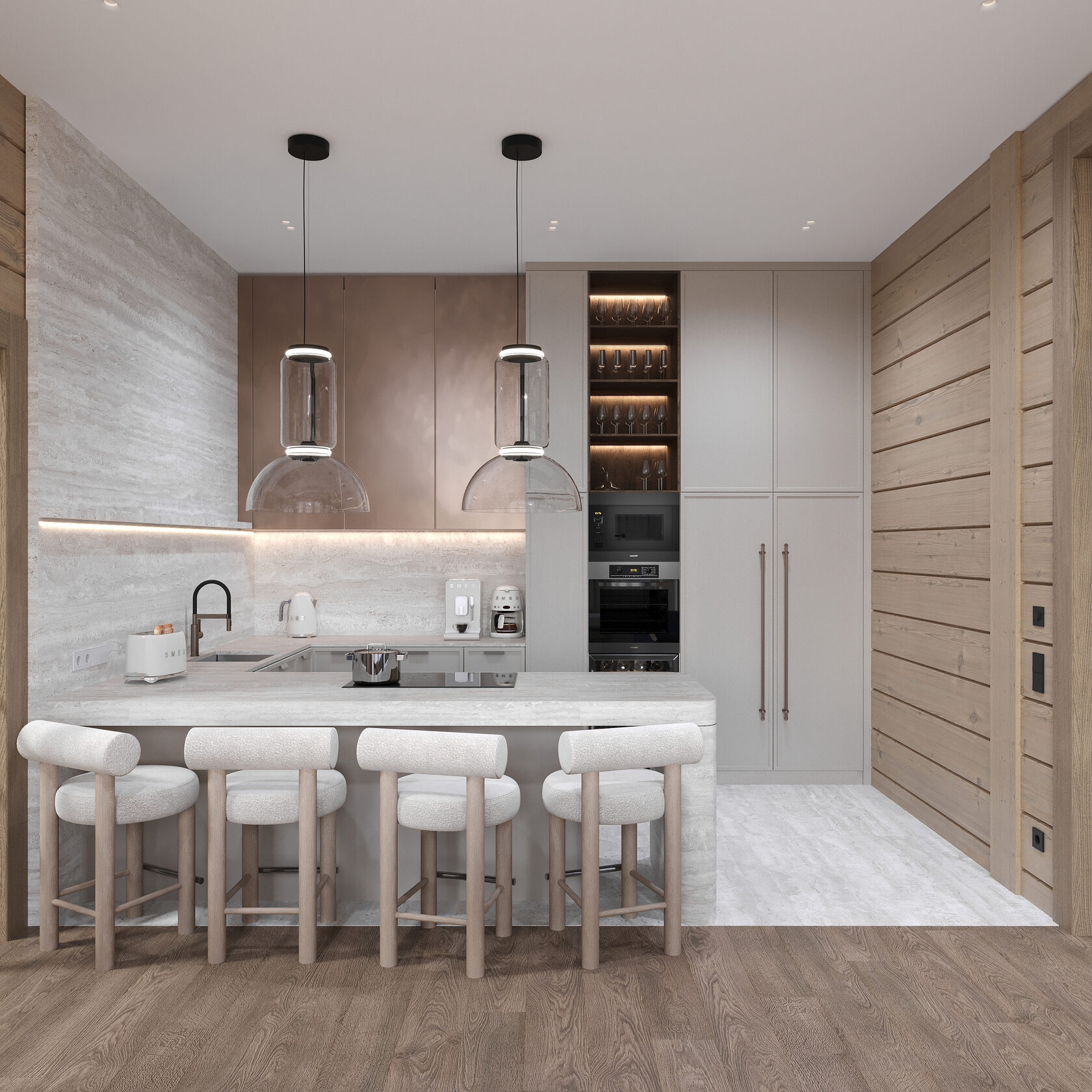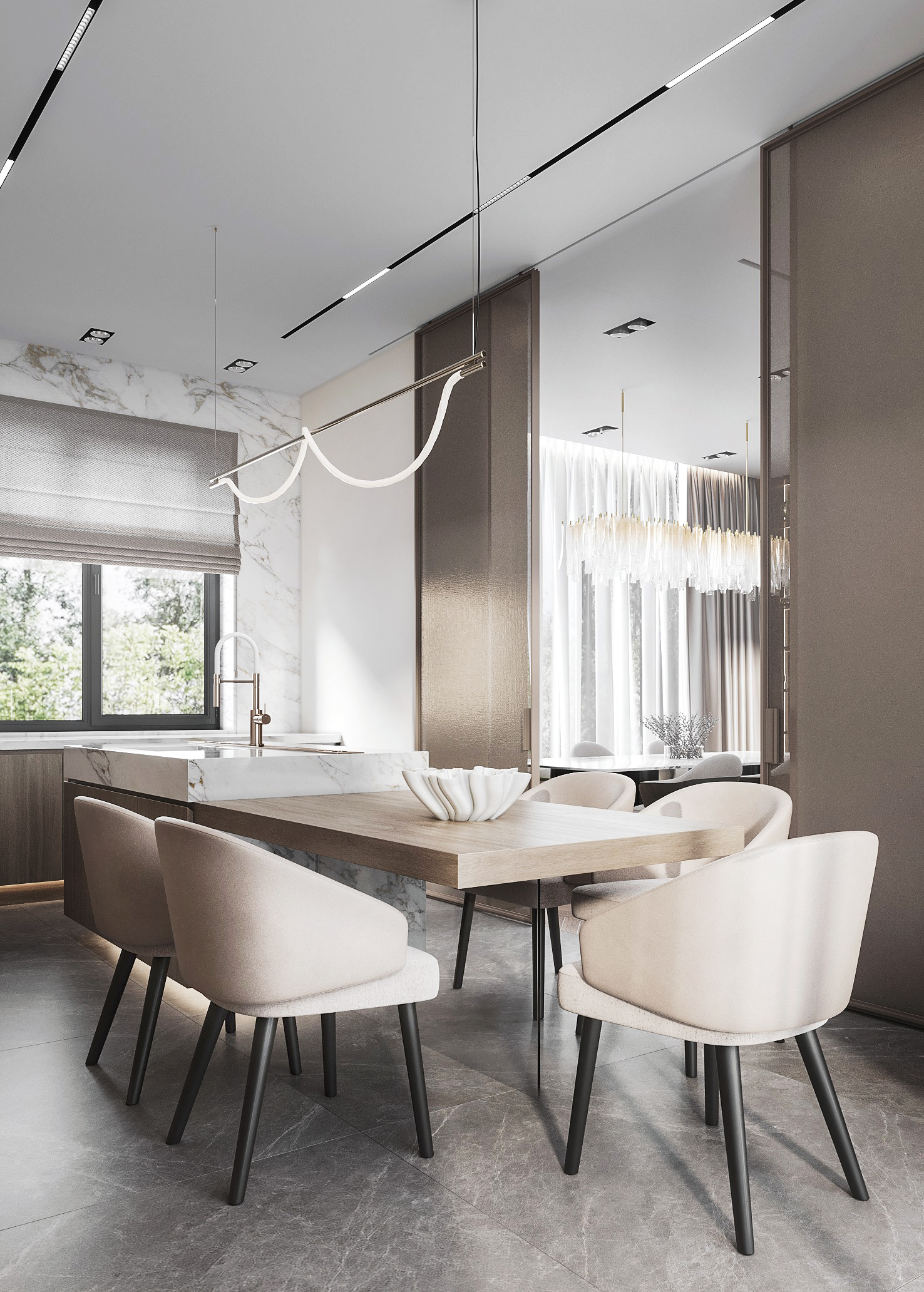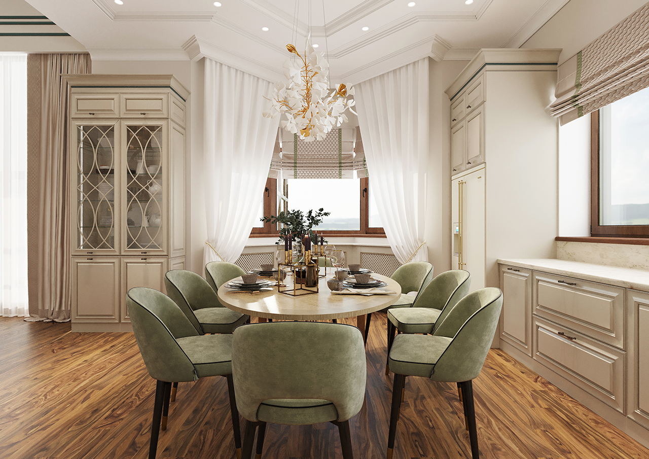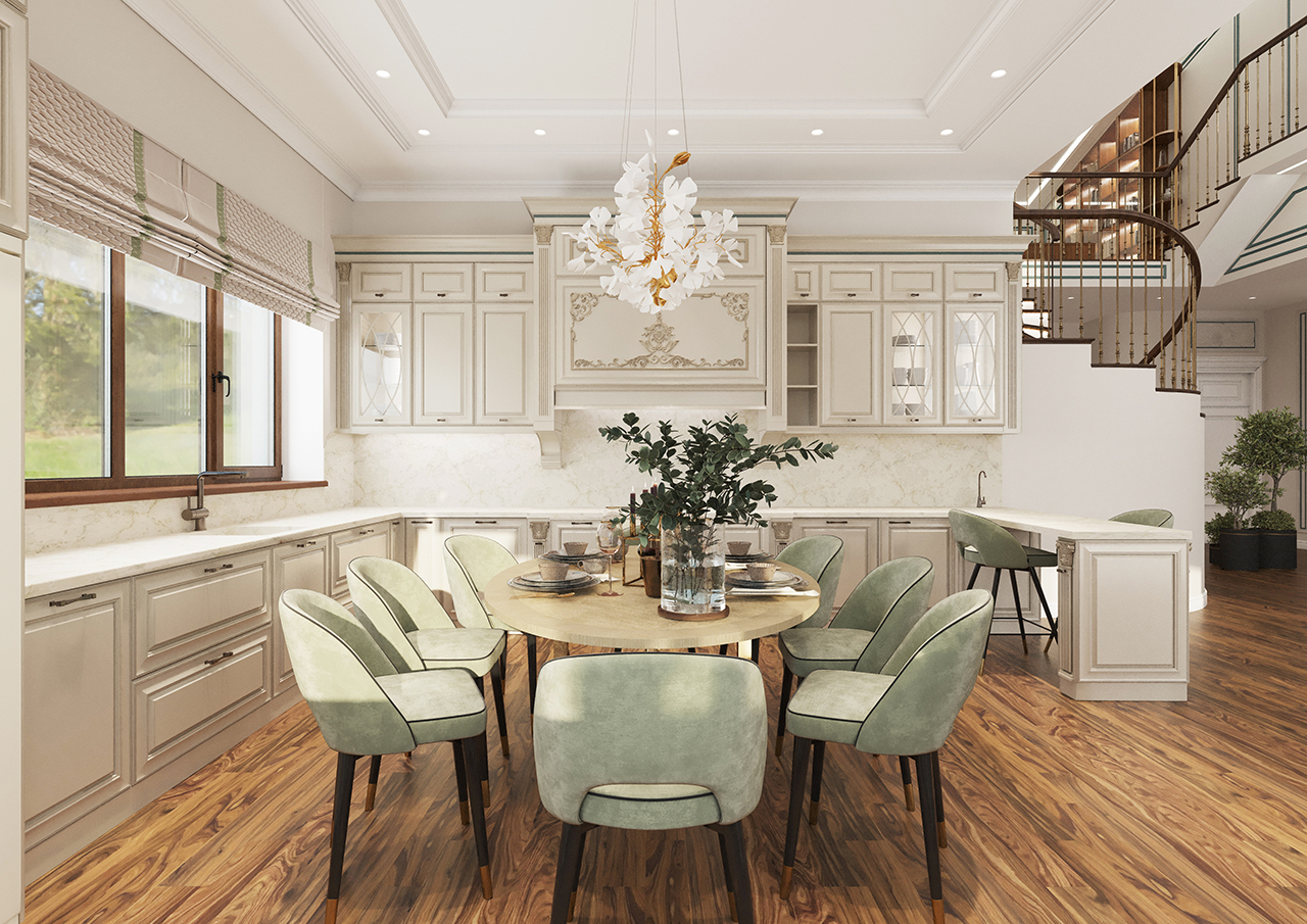 Концепция: В основе концепции лежит создание атмосферы уютного семейного гнезда с акцентом на классический стиль, дополненный изящными элементами шинуазри. Особое внимание уделено деталям декора и освещению. Центральным элементом интерьера стали уникальные светящиеся столешницы из кварца. Интегрированная подсветка не только раскрывает природную красоту камня, но и создаёт мягкое, обволакивающее вечернее освещение, трансформируя пространство и настраивая на искренние семейные беседы.