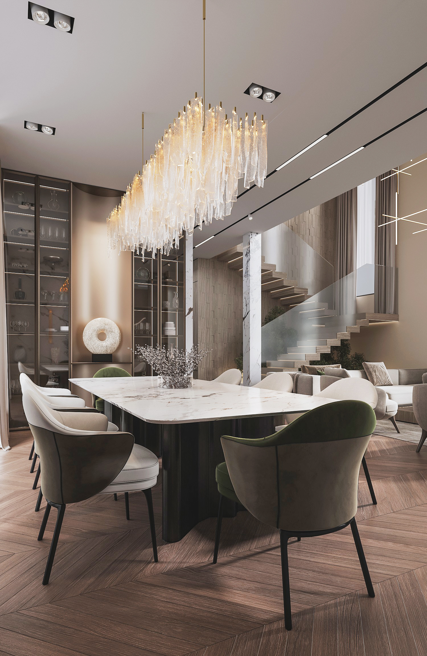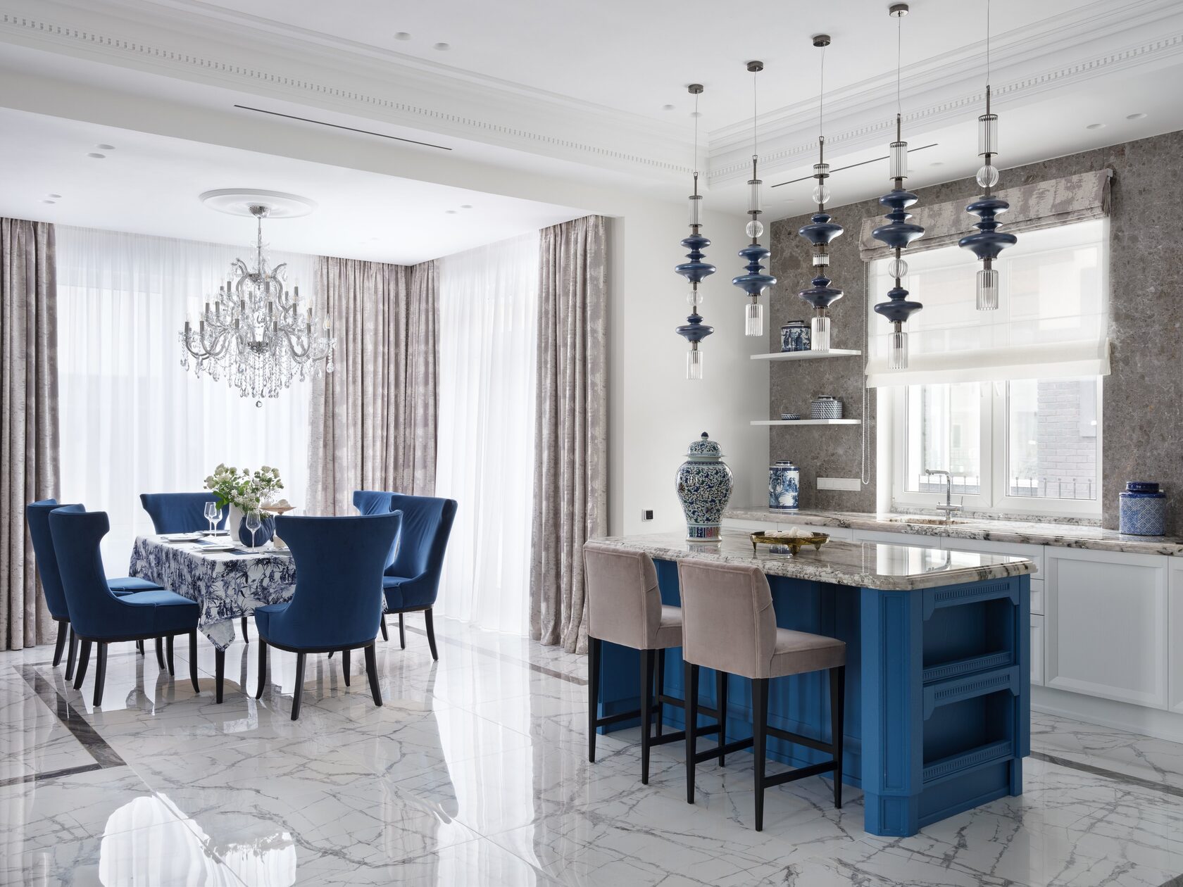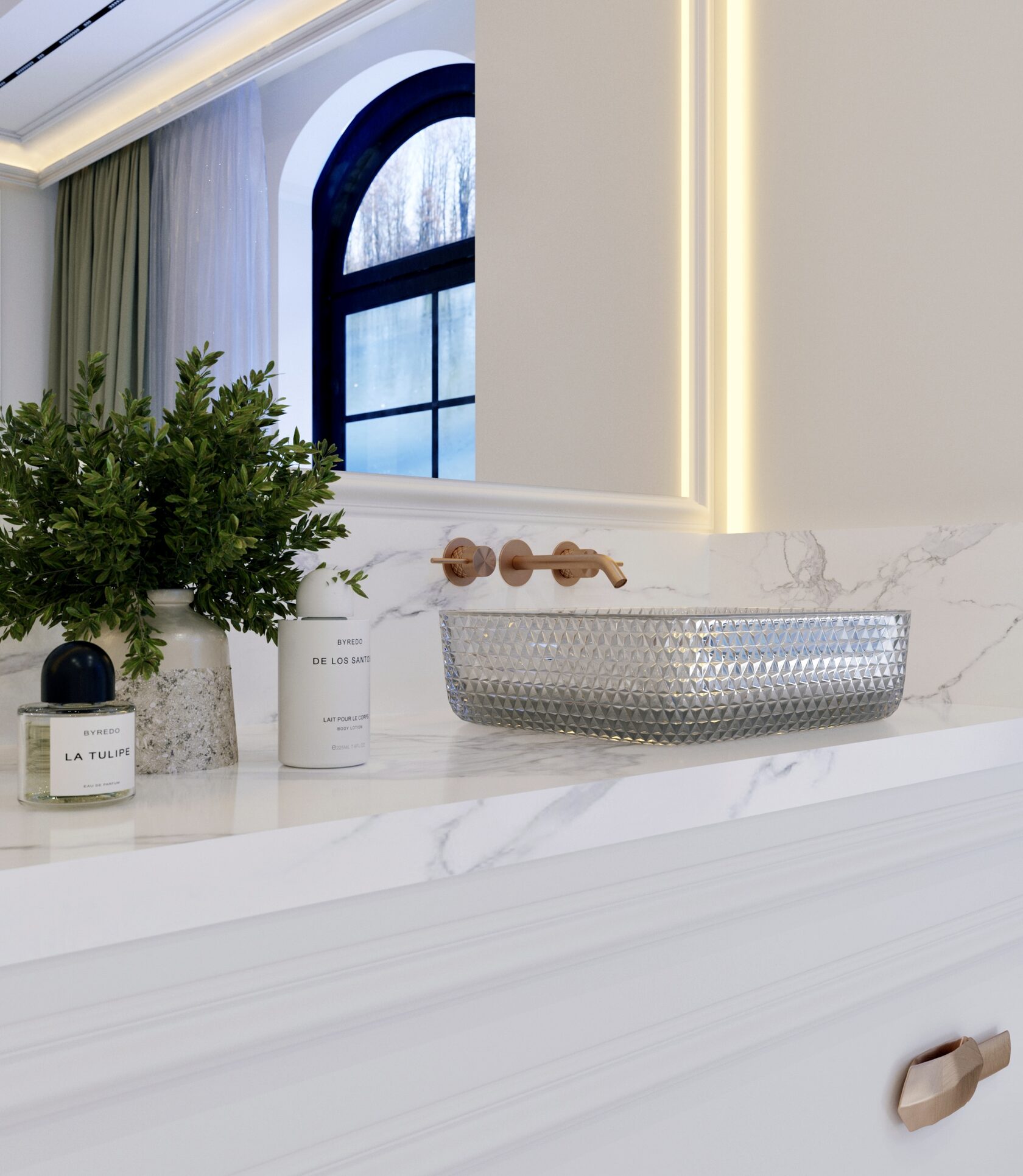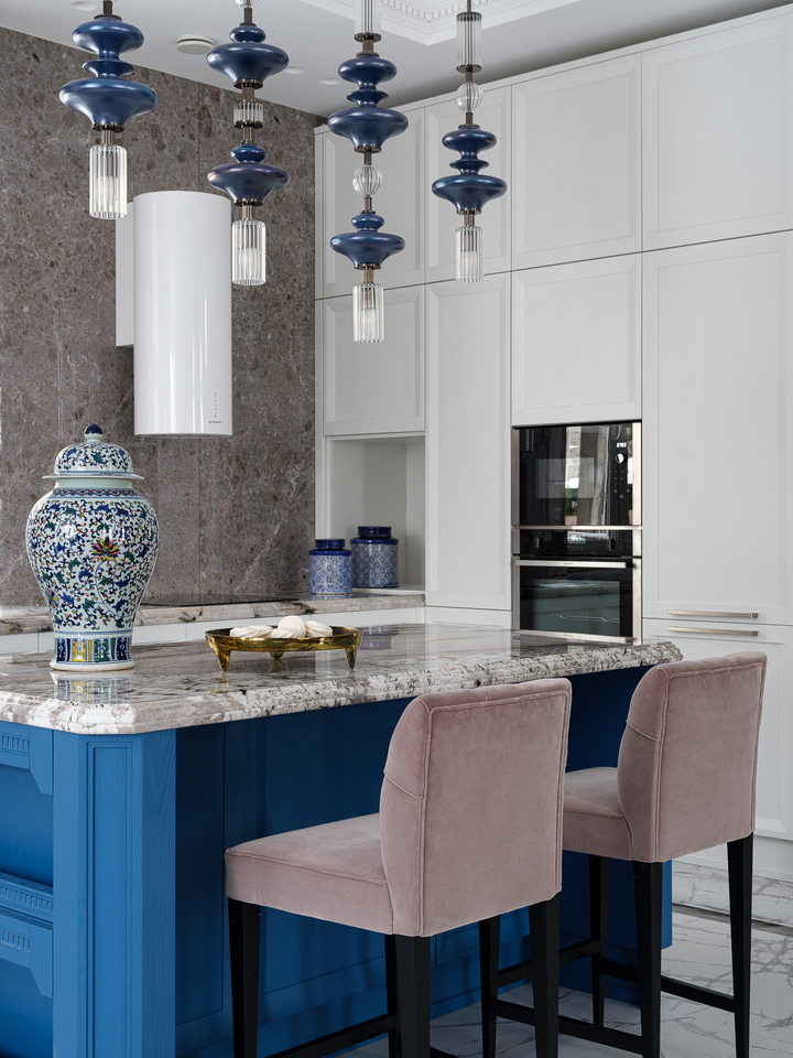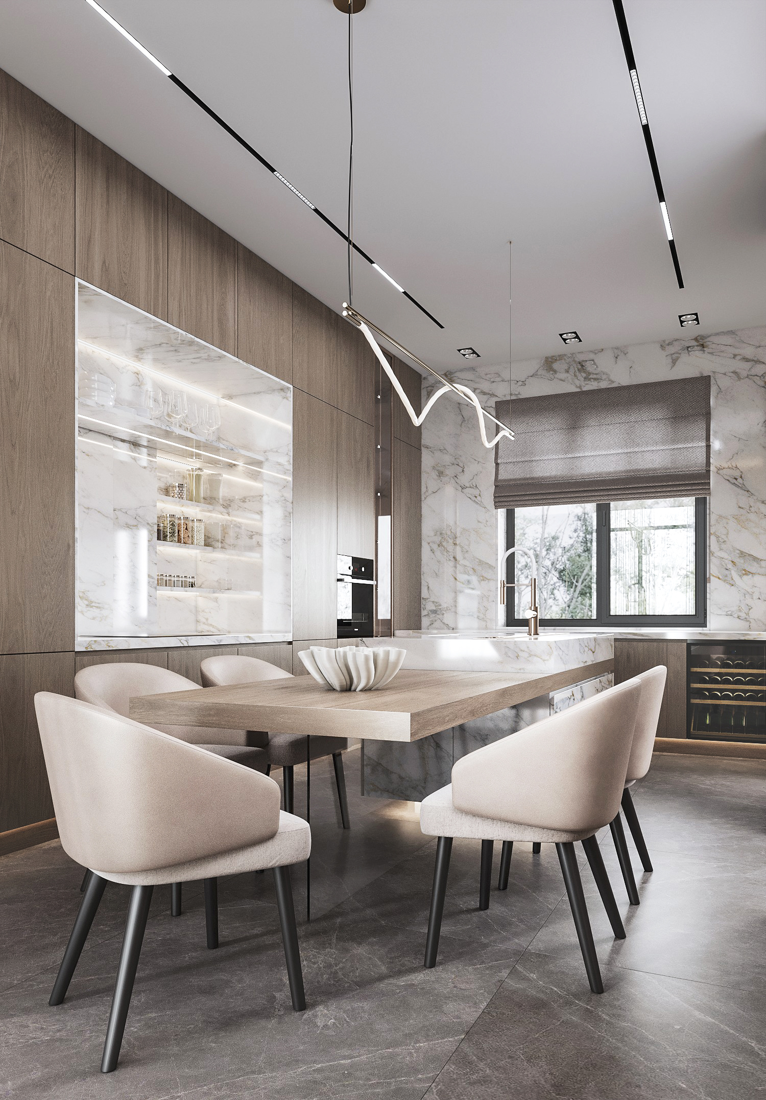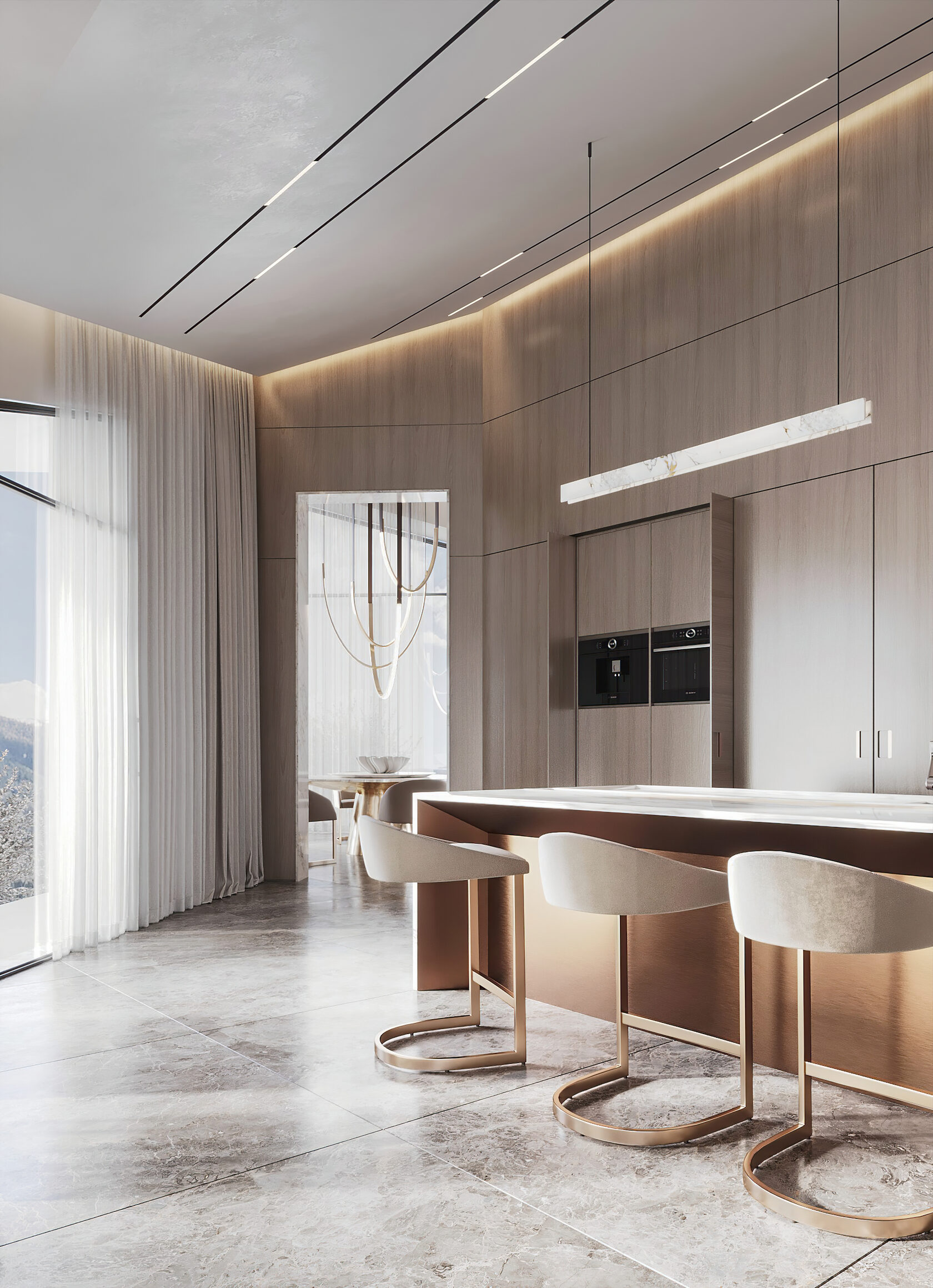 Концепция: В основе концепции лежит создание атмосферы уютного семейного гнезда с акцентом на классический стиль, дополненный изящными элементами шинуазри. Особое внимание уделено деталям декора и освещению. Центральным элементом интерьера стали уникальные светящиеся столешницы из кварца. Интегрированная подсветка не только раскрывает природную красоту камня, но и создаёт мягкое, обволакивающее вечернее освещение, трансформируя пространство и настраивая на искренние семейные беседы.
