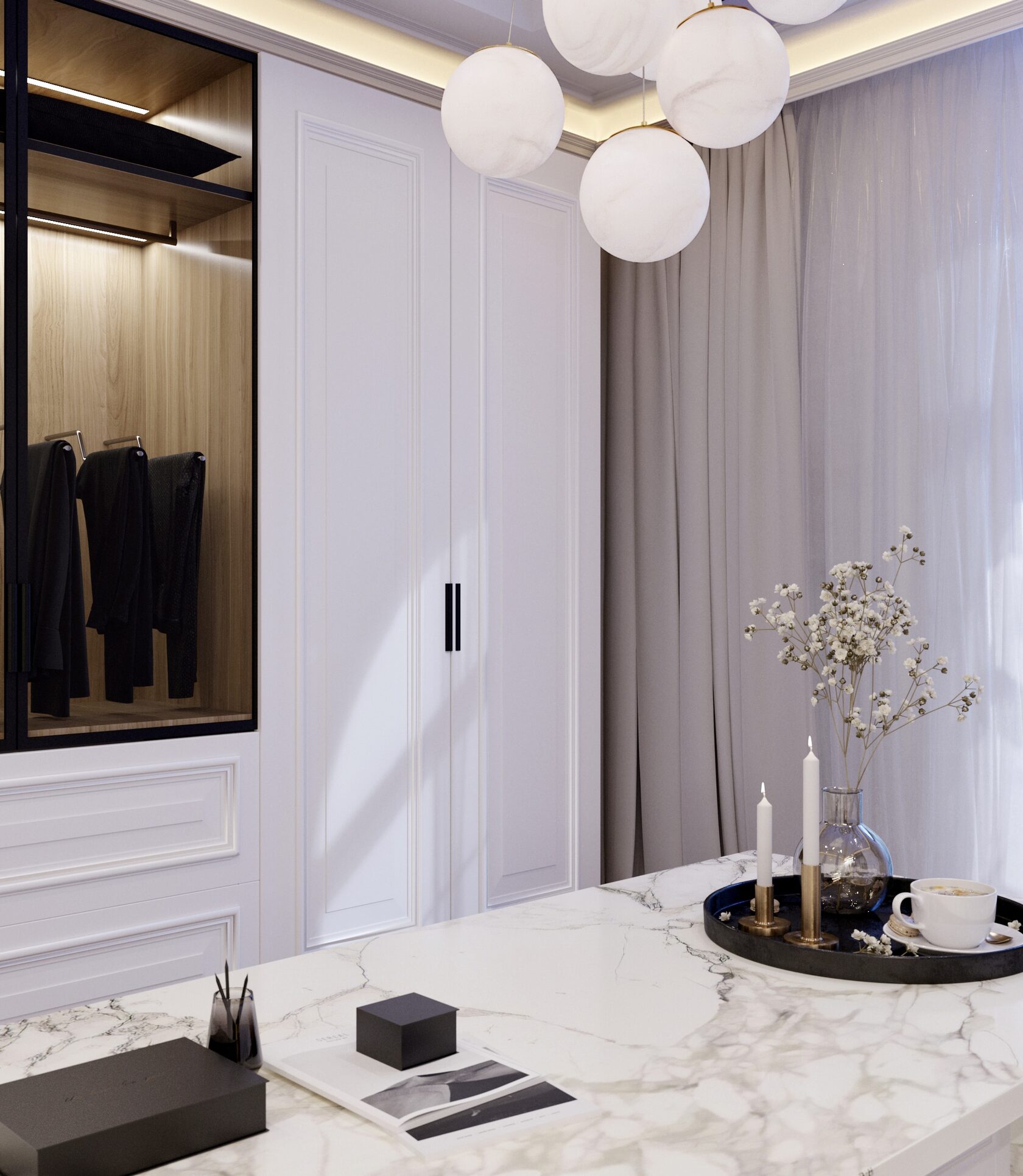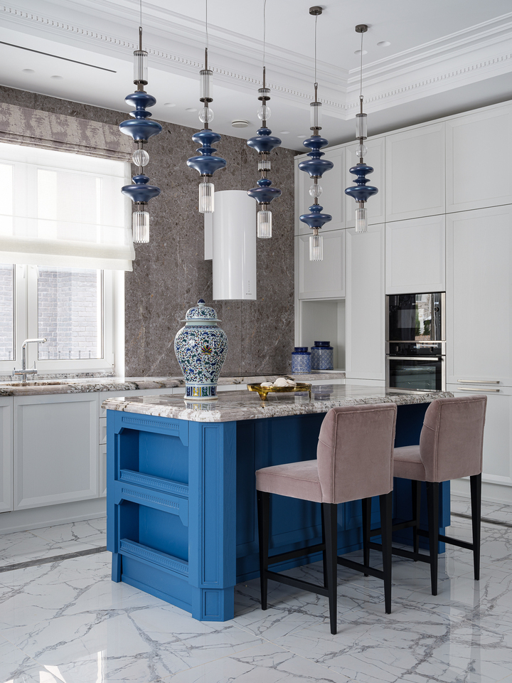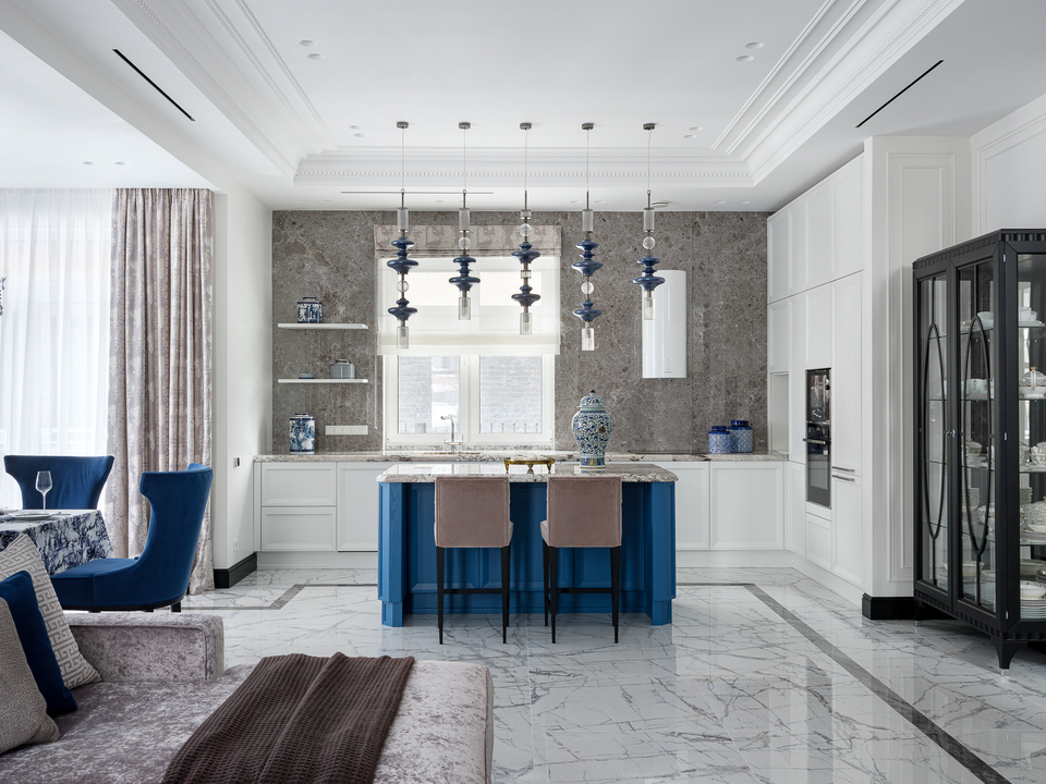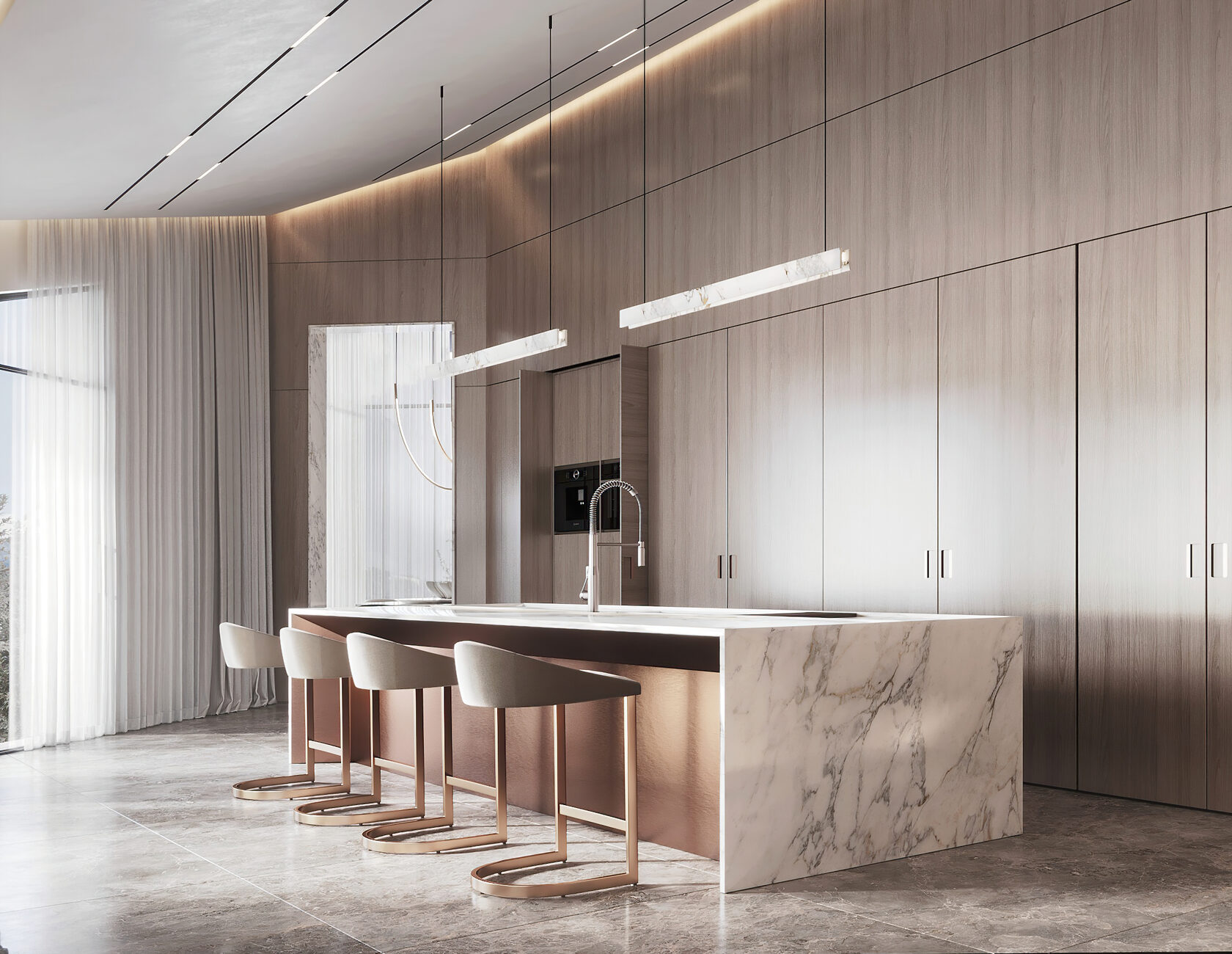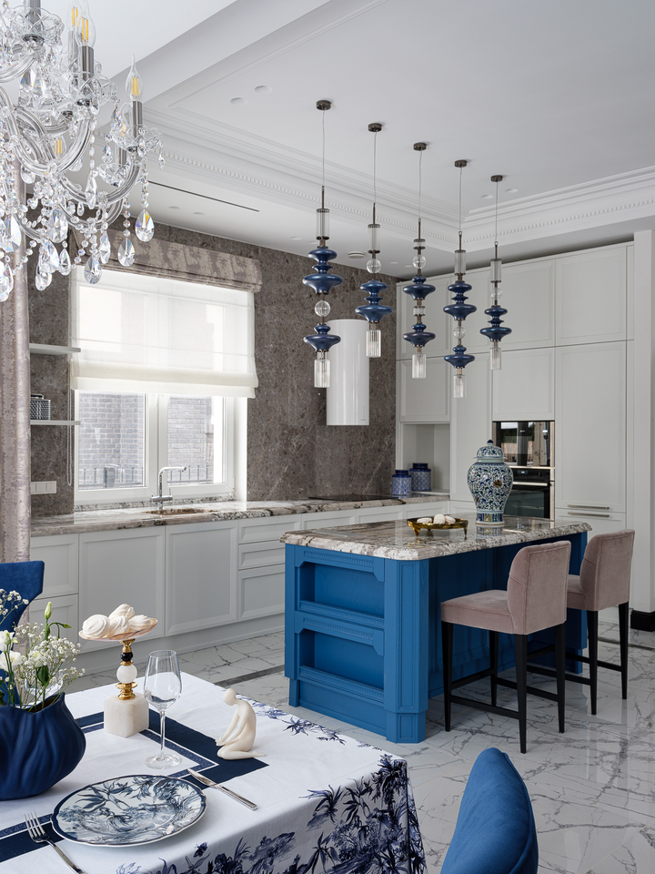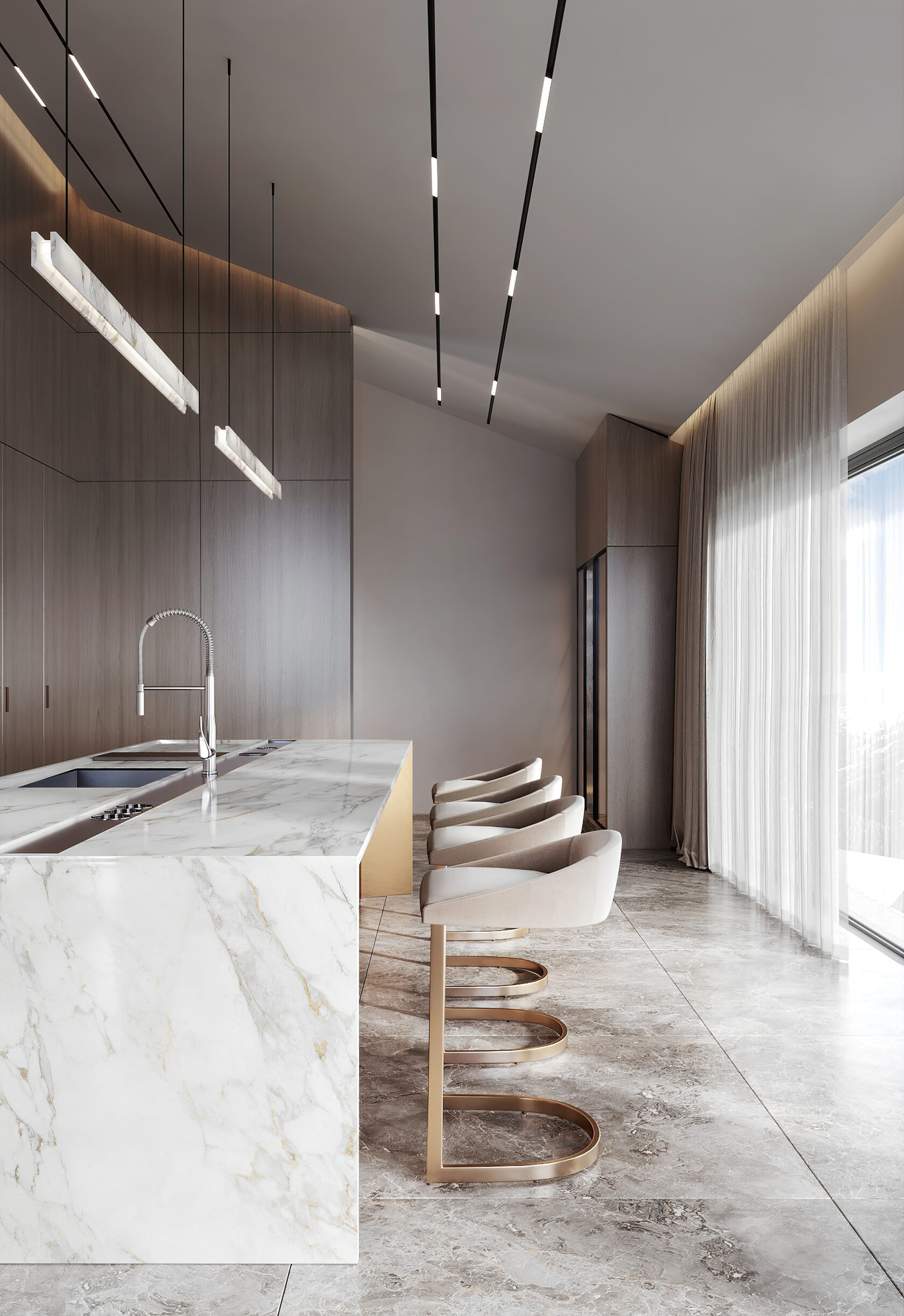 Концепция: В основе концепции лежит создание атмосферы уютного семейного гнезда с акцентом на классический стиль, дополненный изящными элементами шинуазри. Особое внимание уделено деталям декора и освещению. Центральным элементом интерьера стали уникальные светящиеся столешницы из кварца. Интегрированная подсветка не только раскрывает природную красоту камня, но и создаёт мягкое, обволакивающее вечернее освещение, трансформируя пространство и настраивая на искренние семейные беседы.