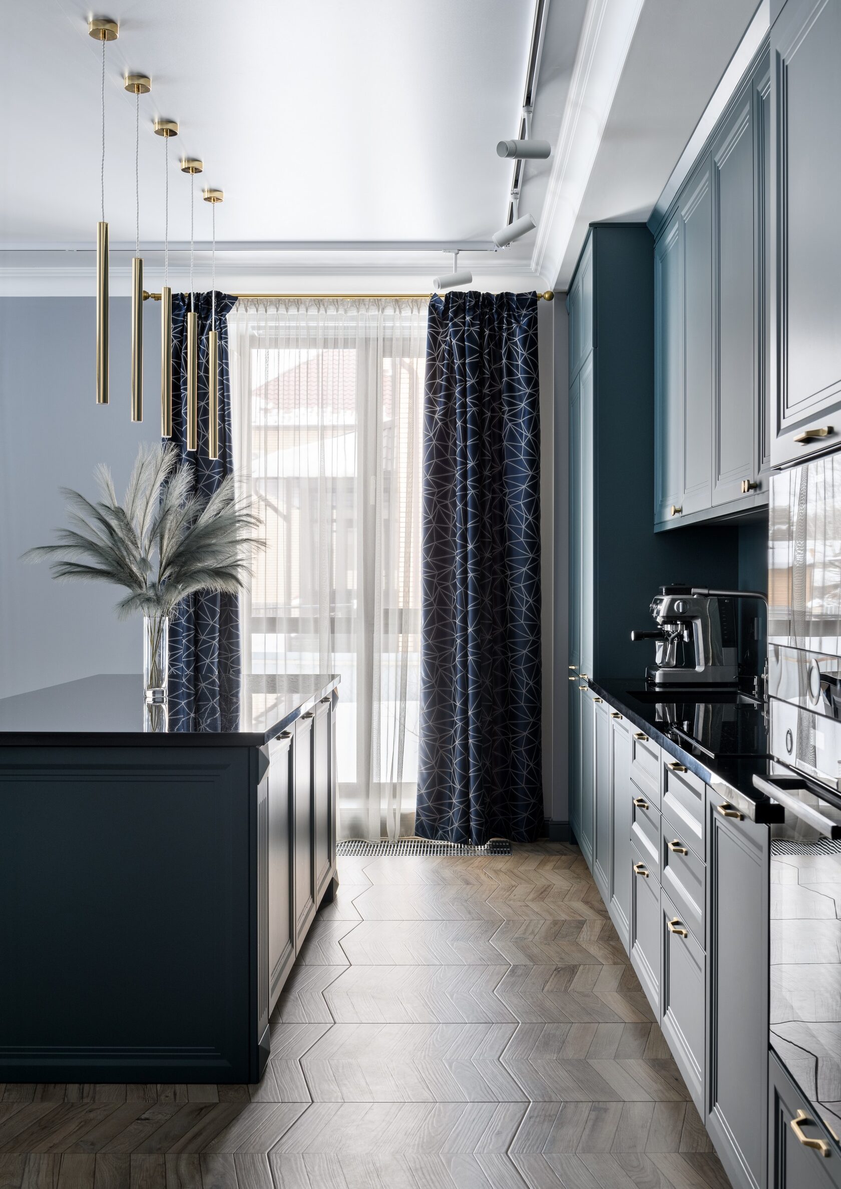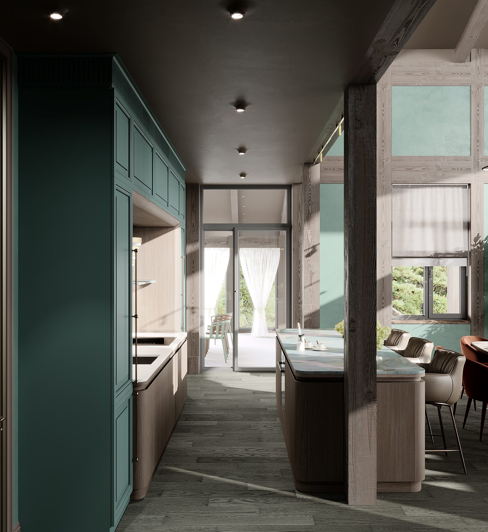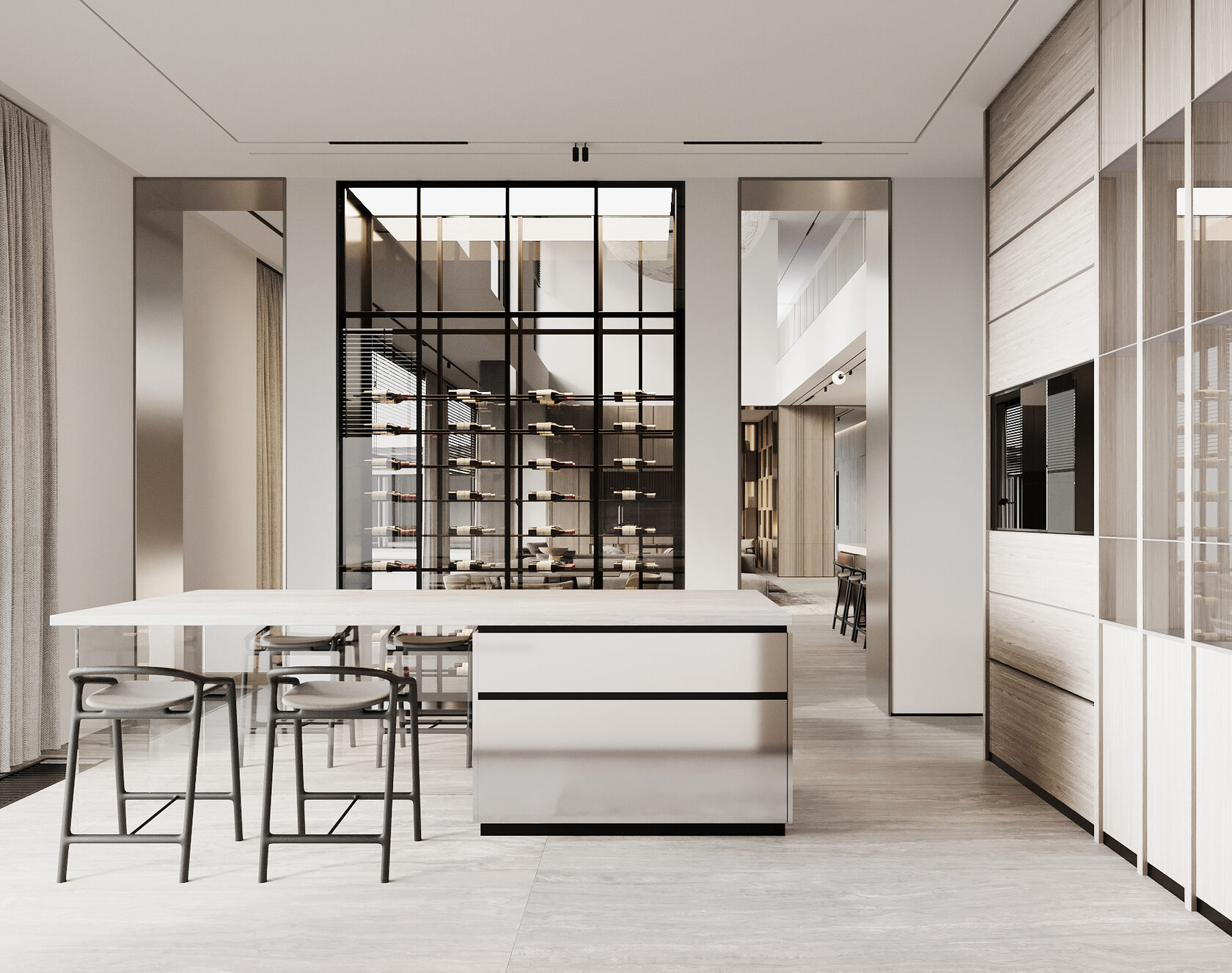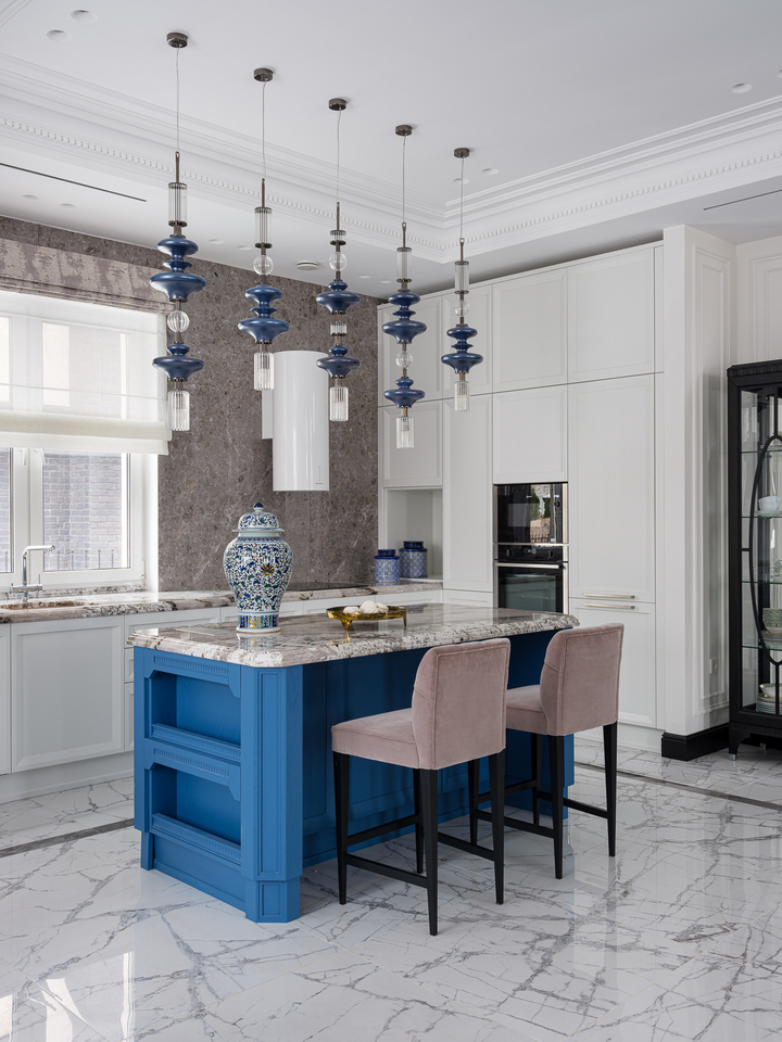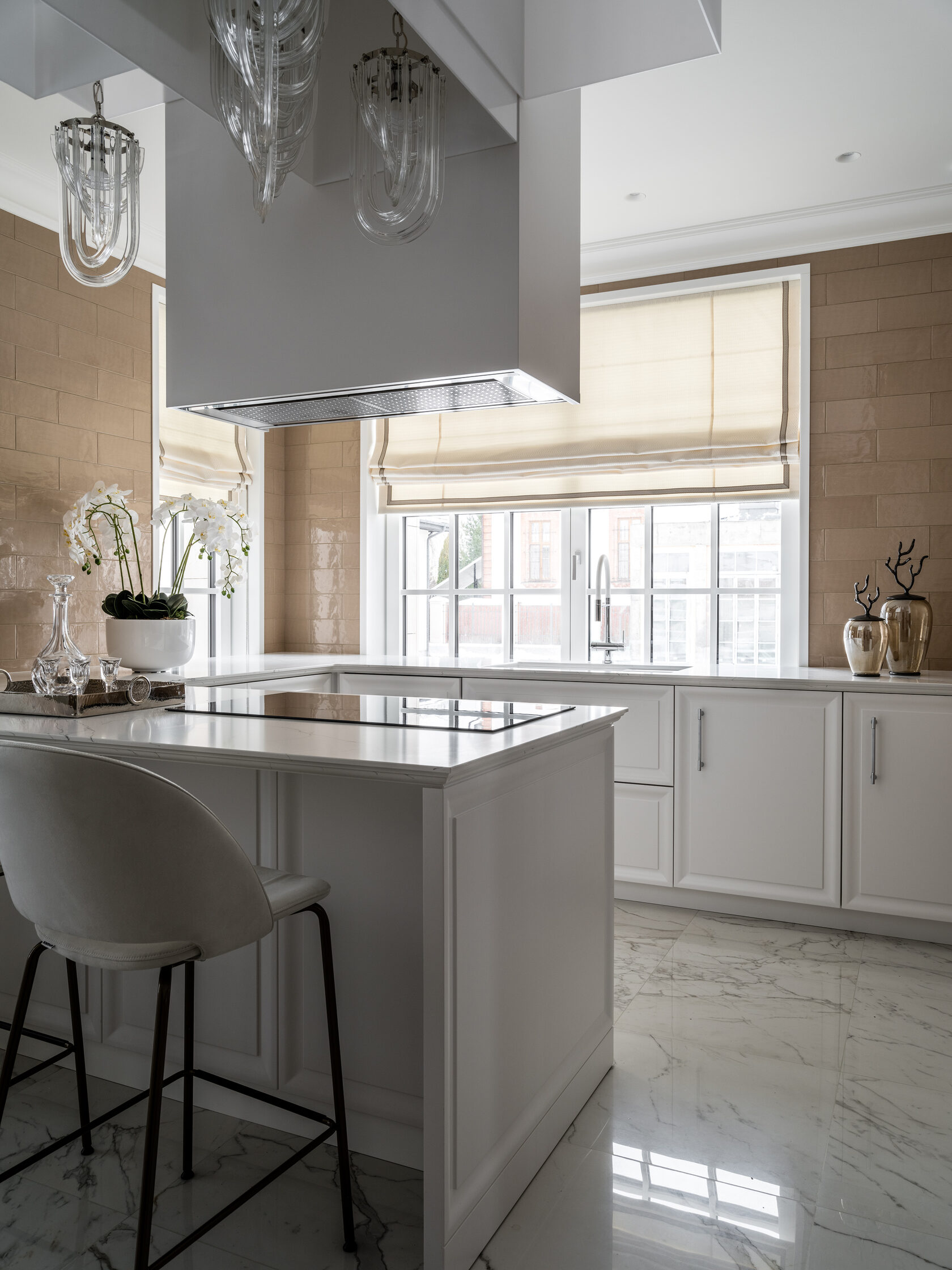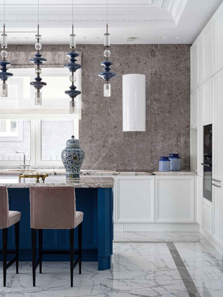 Концепция: В основе концепции лежит создание атмосферы уютного семейного гнезда с акцентом на классический стиль, дополненный изящными элементами шинуазри. Особое внимание уделено деталям декора и освещению. Центральным элементом интерьера стали уникальные светящиеся столешницы из кварца. Интегрированная подсветка не только раскрывает природную красоту камня, но и создаёт мягкое, обволакивающее вечернее освещение, трансформируя пространство и настраивая на искренние семейные беседы.